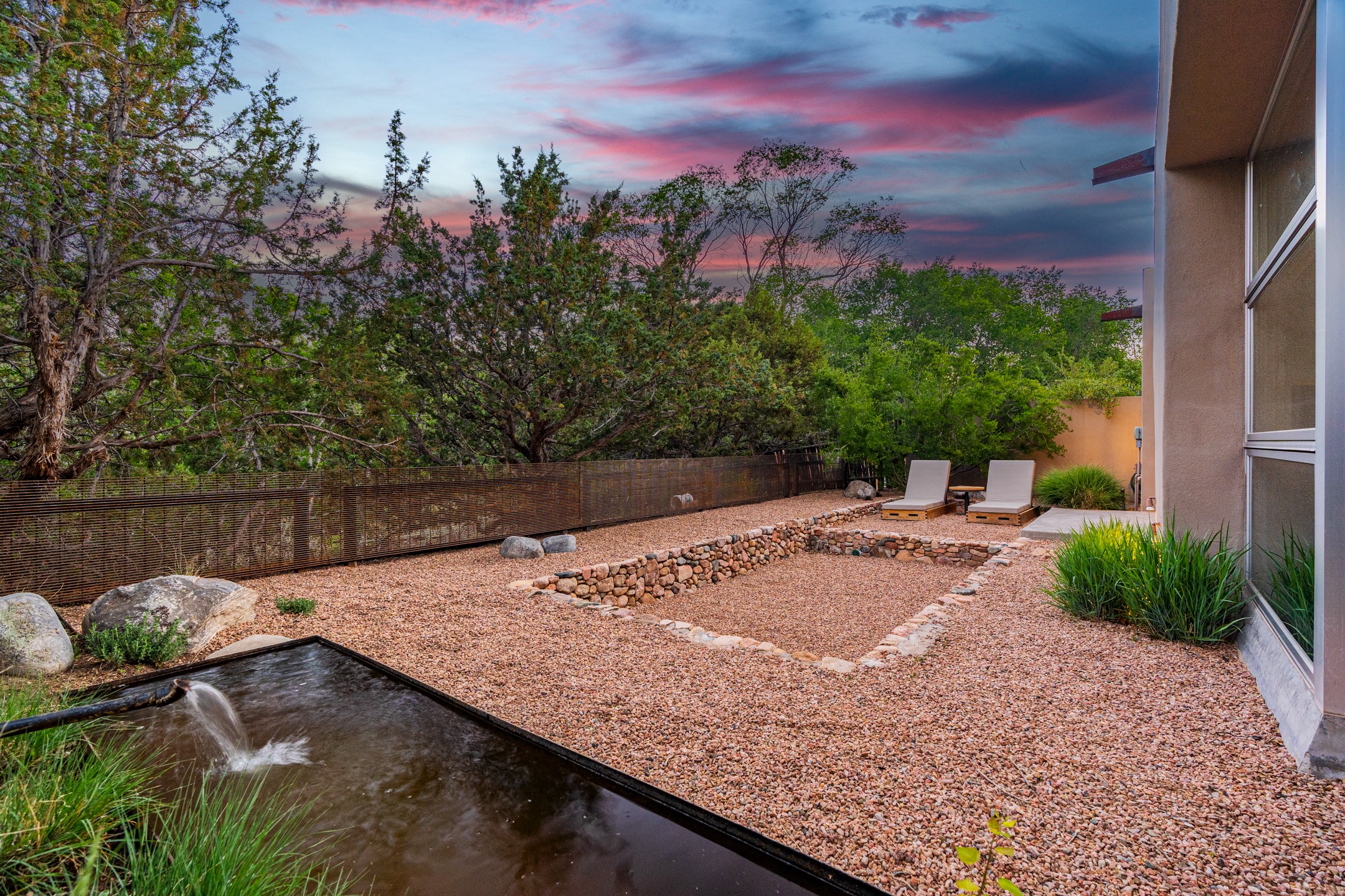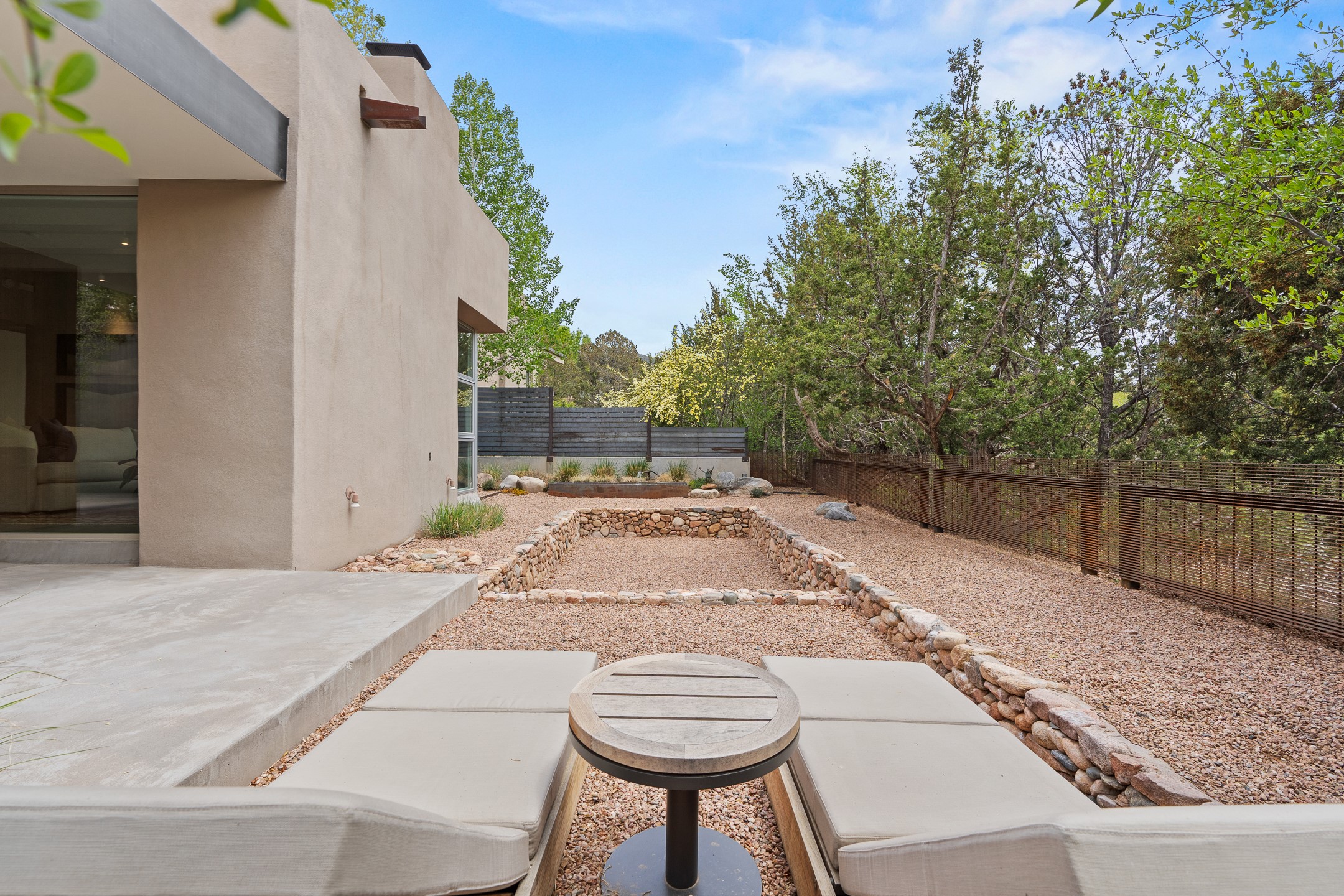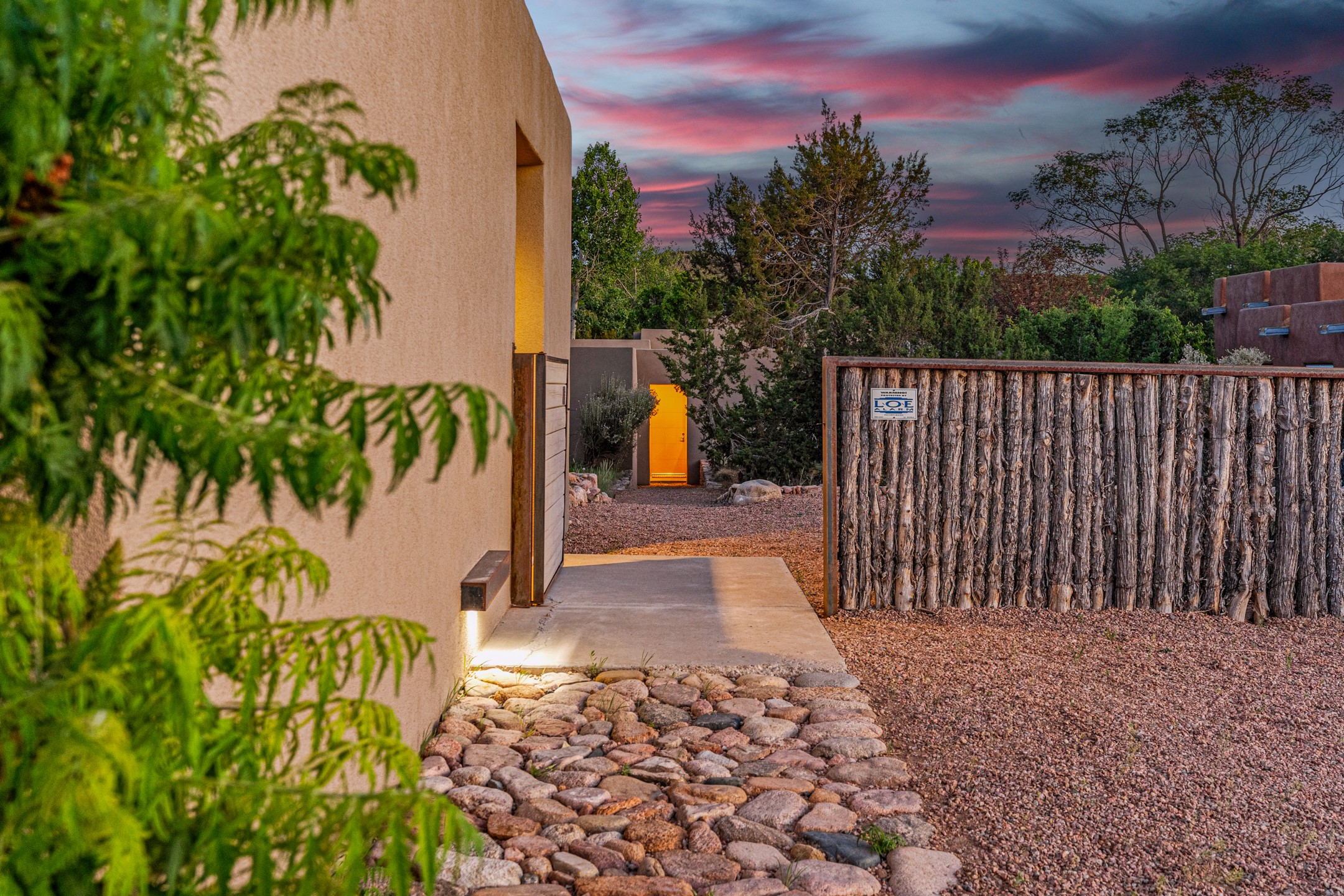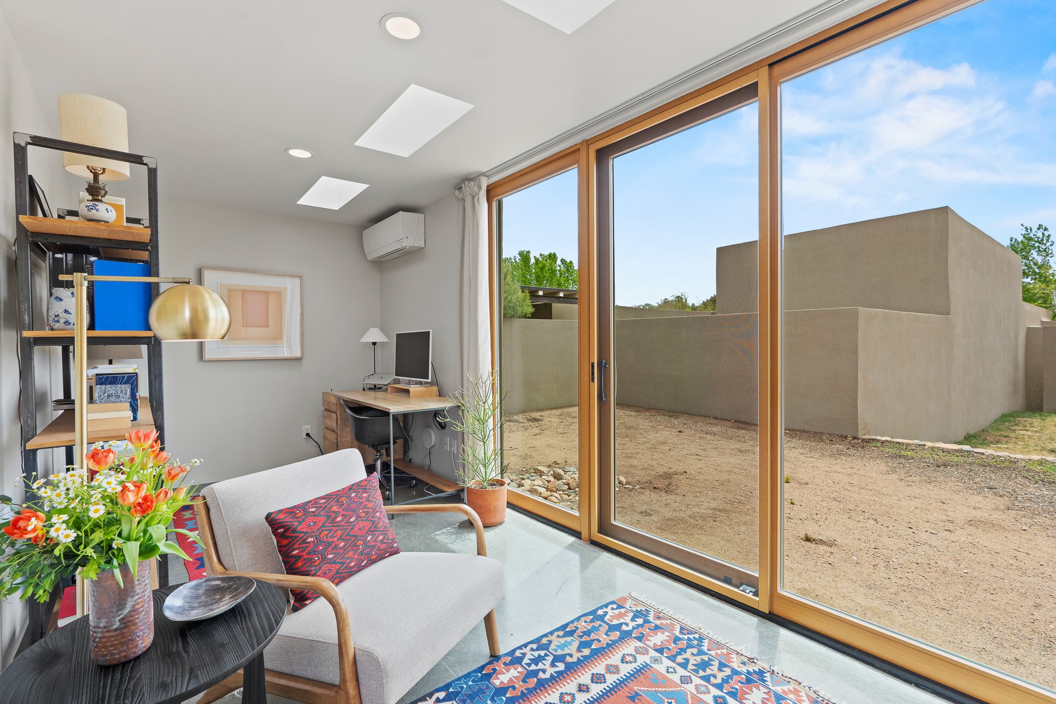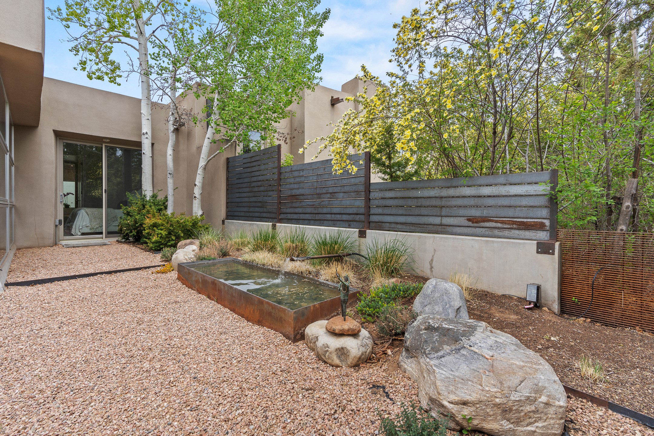Welcome to the "Pearl House"--a stunning contemporary residence designed by acclaimed architect Trey Jordan as his personal home. This exceptional property seamlessly fuses bold architectural design with modern comforts and relaxed livability. Over the past three years, it has undergone extensive renovations featuring top-of-the-line appliances, fixtures, and finishes. Set on a private 0.29-acre lot with sweeping views of Picacho and Atalaya Peaks, the property includes a main residence with 2-bedrooms and 2-baths, plus a 2-car garage. Attached to the garage is a recently renovated heated studio/office space, along with a storage room and workshop area, offering versatile functionality for creative or active lifestyles. The outdoor spaces are equally impressive, with a tranquil dining area complete with a fireplace and a fountain--perfect for entertaining or quiet reflection. Nature lovers will appreciate the nearby Santa Fe River Trail and the renowned Dale Ball Trail System, offering miles of scenic hiking and biking. Included in the sale are approved plans for a second residence, part of the original vision for the property, designed by Trey Jordan, providing an exciting opportunity for future expansion. Ideally located within walking distance of historic Canyon Road and minutes from the cultural, culinary, and artistic attractions of downtown Santa Fe, Pearl House is a rare architectural gem in an unparalleled setting.