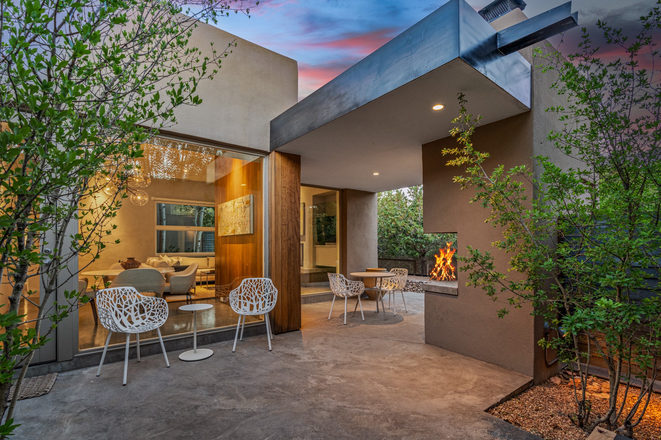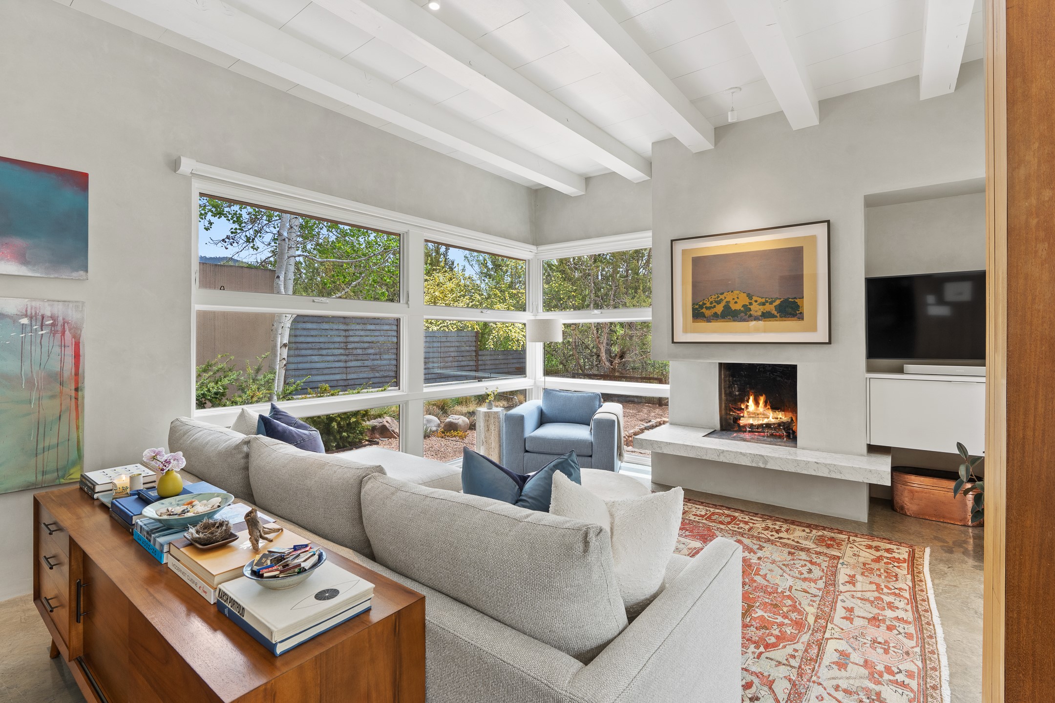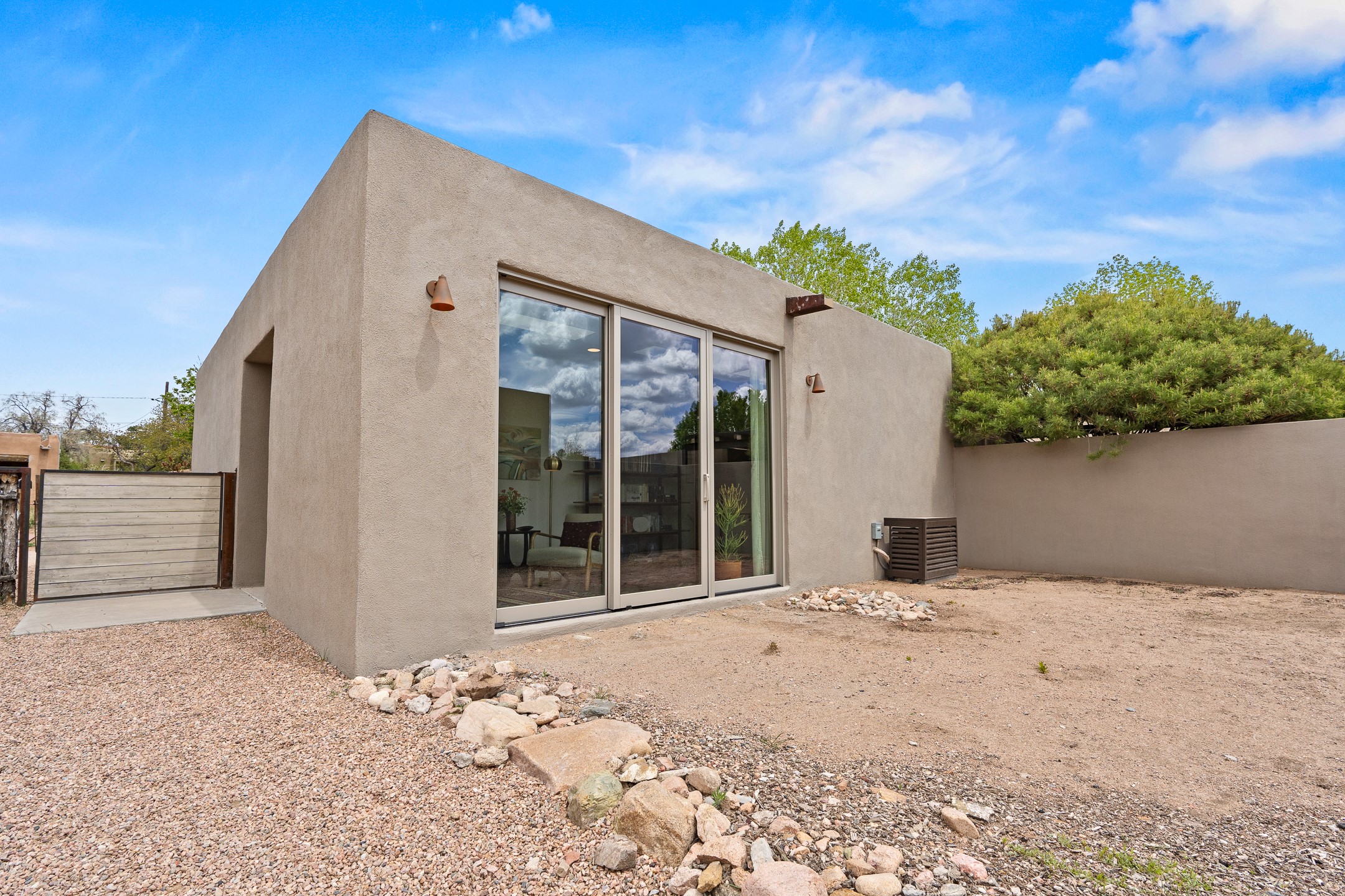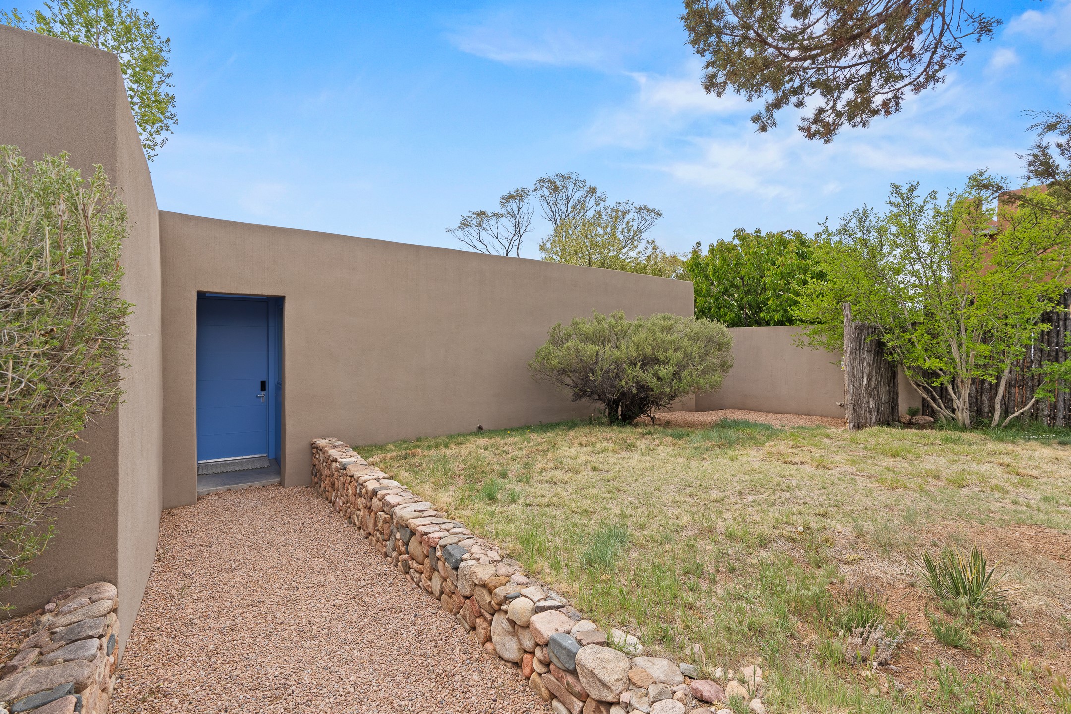Welcome to the "Pearl House"--a stunning contemporary residence designed by acclaimed architect Trey Jordan as his personal home. This exceptional property seamlessly fuses bold architectural design with modern comforts and relaxed livability. Over the past three years, it has undergone extensive renovations featuring top-of-the-line appliances, fixtures, and finishes. Set on a private 0.29-acre lot with sweeping views of Picacho and Atalaya Peaks, the property includes a main residence with 2-bedrooms and 2-baths, plus a 2-car garage. Attached to the garage is a recently renovated heated studio/office space, along with a storage room and workshop area, offering versatile functionality for creative or active lifestyles. The outdoor spaces are equally impressive, with a tranquil dining area complete with a fireplace and a fountain--perfect for entertaining or quiet reflection. Nature lovers will appreciate the nearby Santa Fe River Trail and the renowned Dale Ball Trail System, offering miles of scenic hiking and biking. Included in the sale are approved plans for a second residence, part of the original vision for the property, designed by Trey Jordan, providing an exciting opportunity for future expansion. Ideally located within walking distance of historic Canyon Road and minutes from the cultural, culinary, and artistic attractions of downtown Santa Fe, Pearl House is a rare architectural gem in an unparalleled setting.