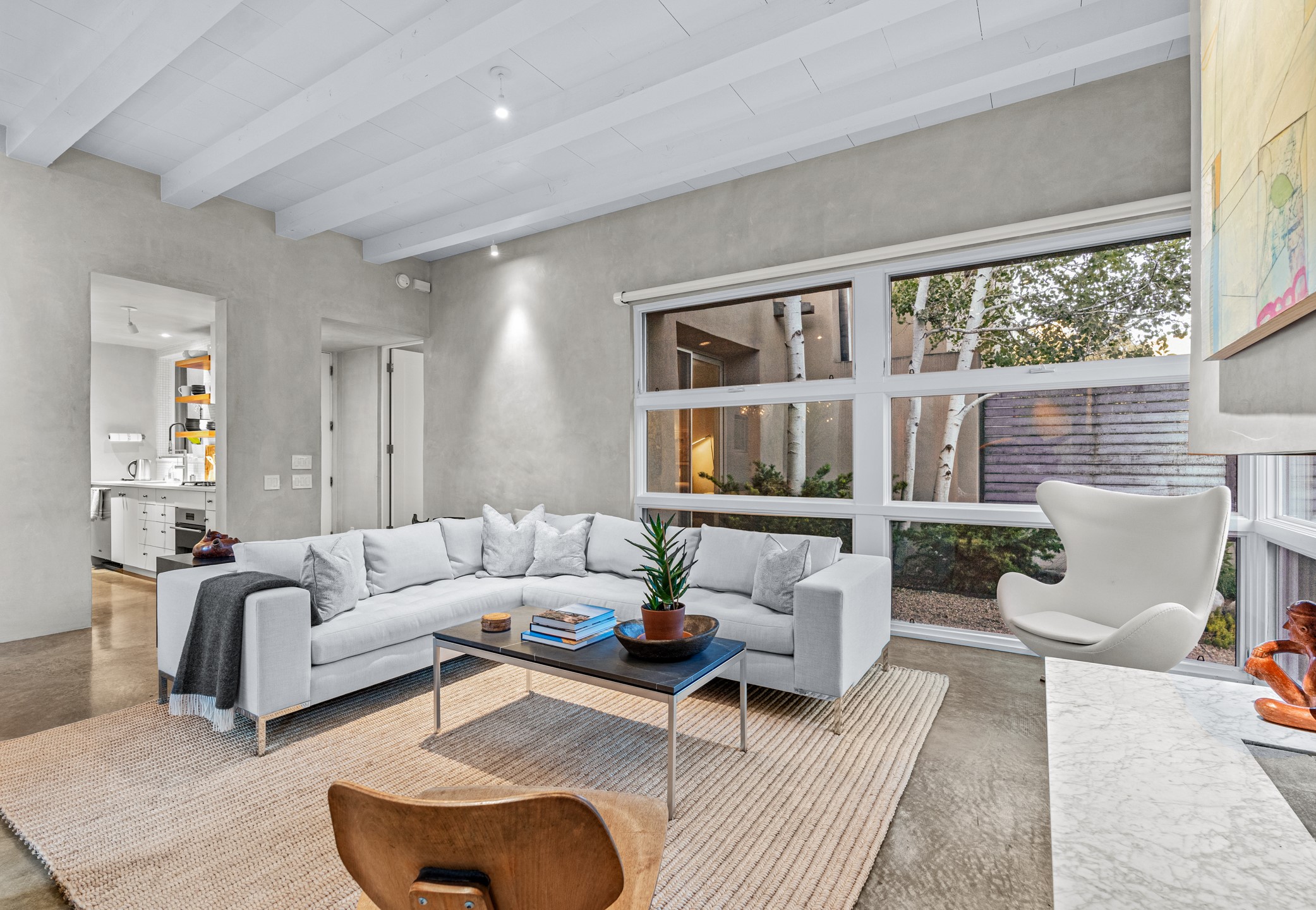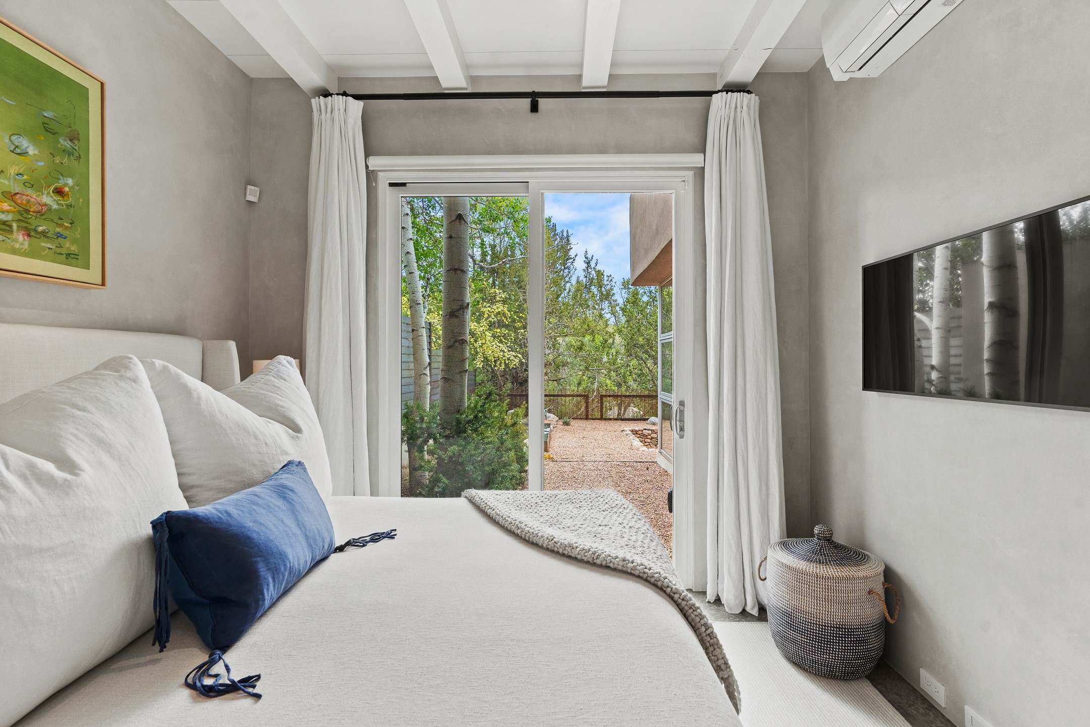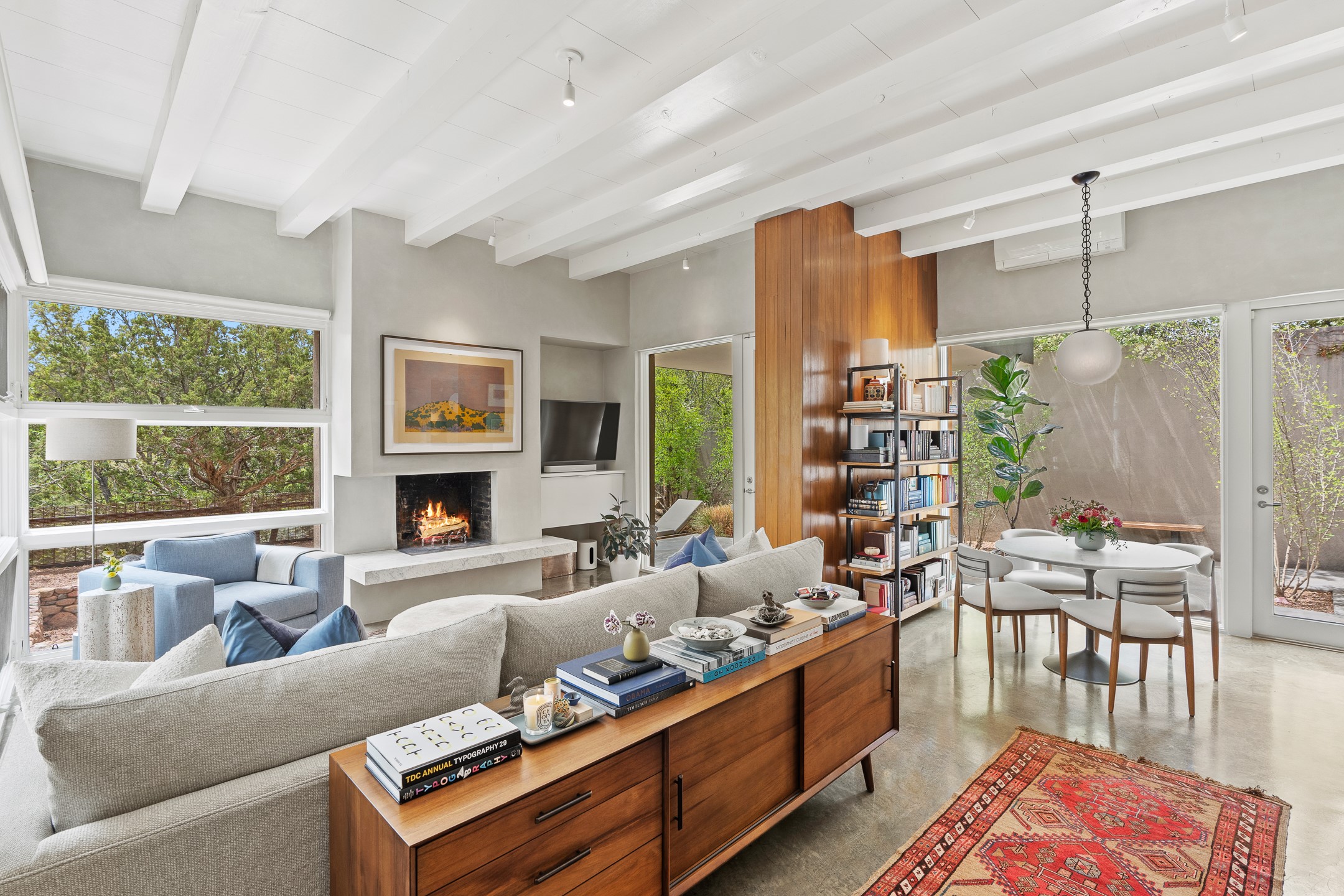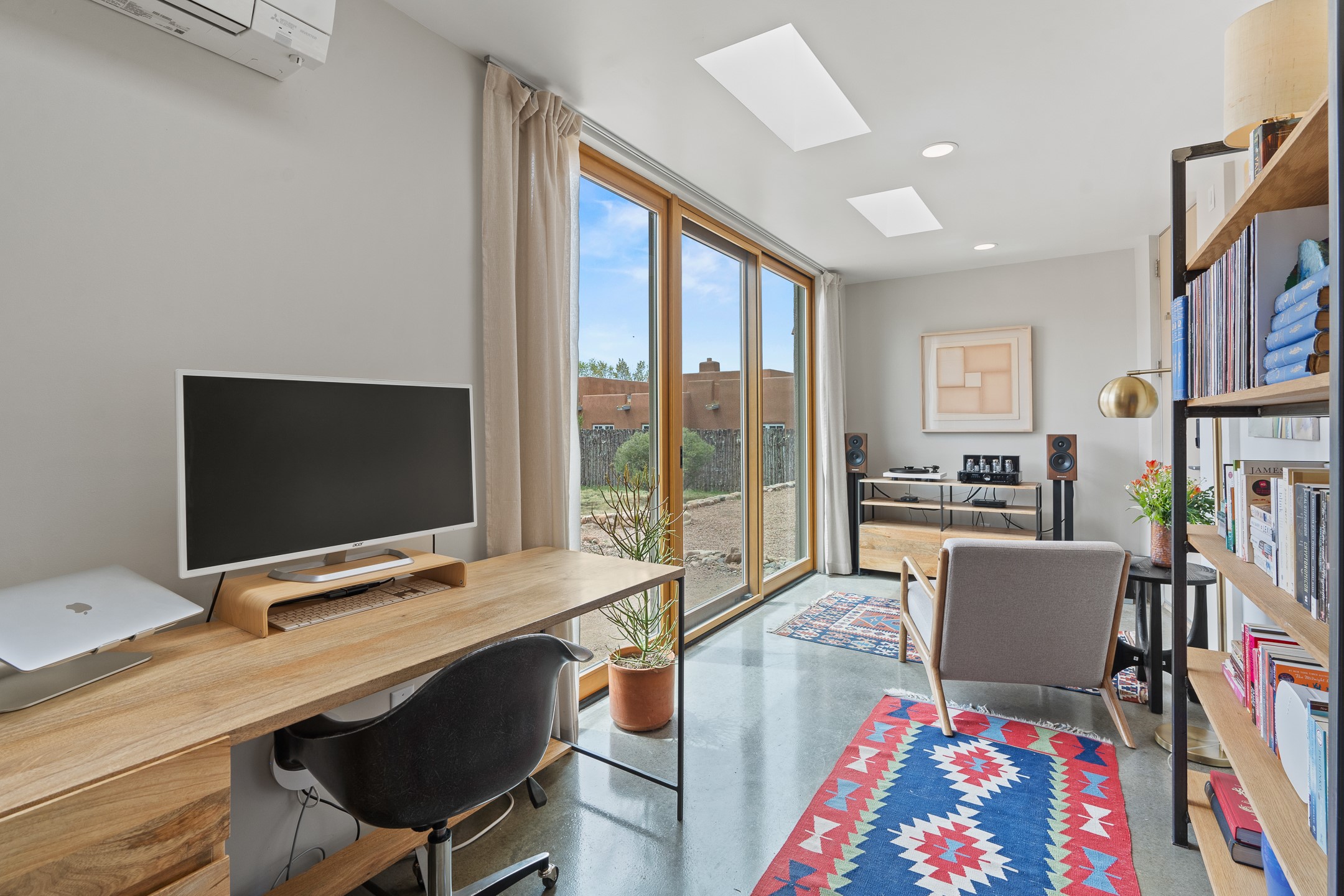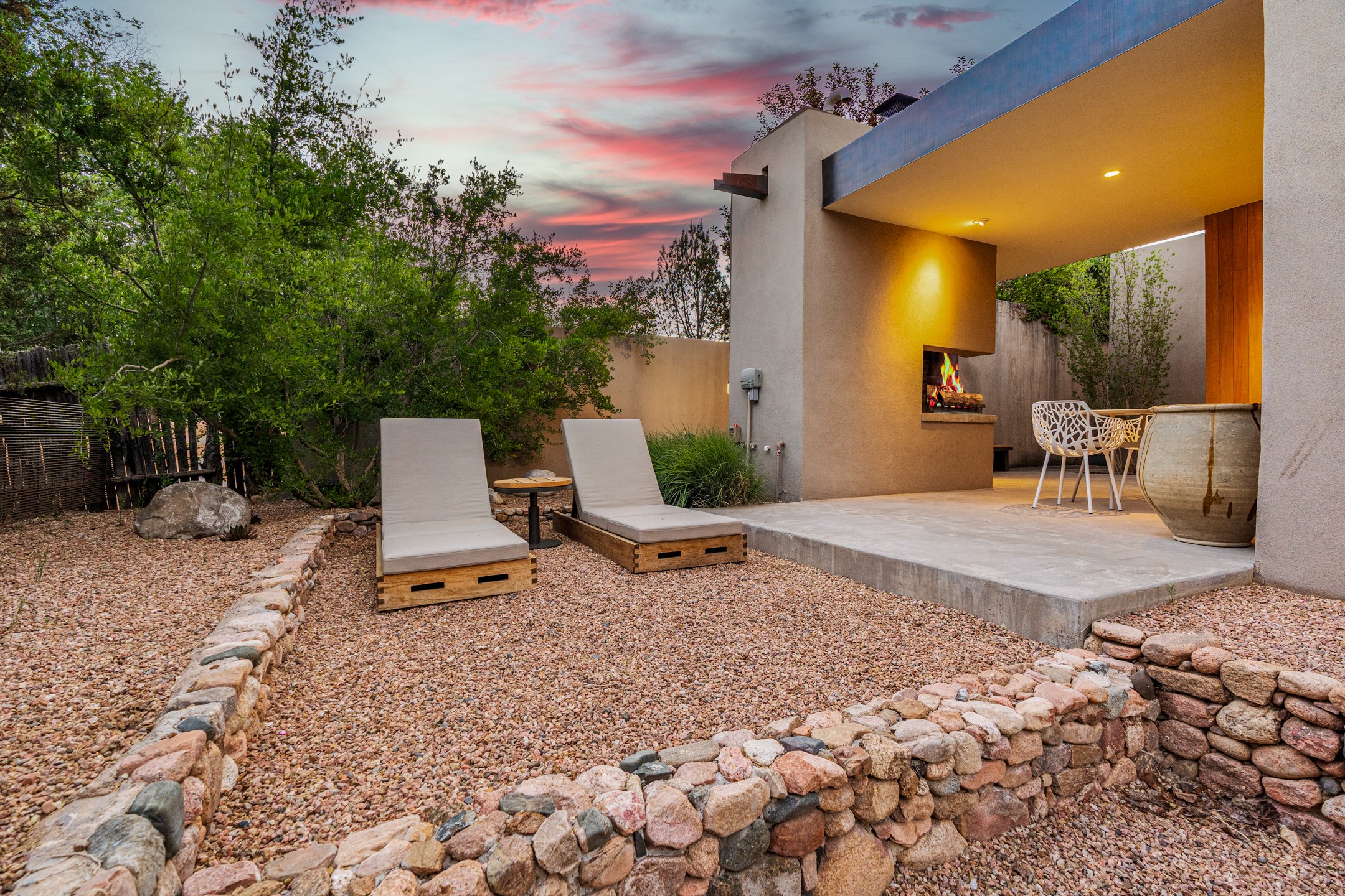 Welcome to the "Pearl House"--a stunning contemporary residence designed by acclaimed architect Trey Jordan as his personal home. This exceptional property seamlessly fuses bold architectural design with modern comforts and relaxed livability. Over the past three years, it has undergone extensive renovations featuring top-of-the-line appliances, fixtures, and finishes. Set on a private 0.29-acre lot with sweeping views of Picacho and Atalaya Peaks, the property includes a main residence with 2-bedrooms and 2-baths, plus a 2-car garage. Attached to the garage is a recently renovated heated studio/office space, along with a storage room and workshop area, offering versatile functionality for creative or active lifestyles. The outdoor spaces are equally impressive, with a tranquil dining area complete with a fireplace and a fountain--perfect for entertaining or quiet reflection. Nature lovers will appreciate the nearby Santa Fe River Trail and the renowned Dale Ball Trail System, offering miles of scenic hiking and biking. Included in the sale are approved plans for a second residence, part of the original vision for the property, designed by Trey Jordan, providing an exciting opportunity for future expansion. Ideally located within walking distance of historic Canyon Road and minutes from the cultural, culinary, and artistic attractions of downtown Santa Fe, Pearl House is a rare architectural gem in an unparalleled setting.