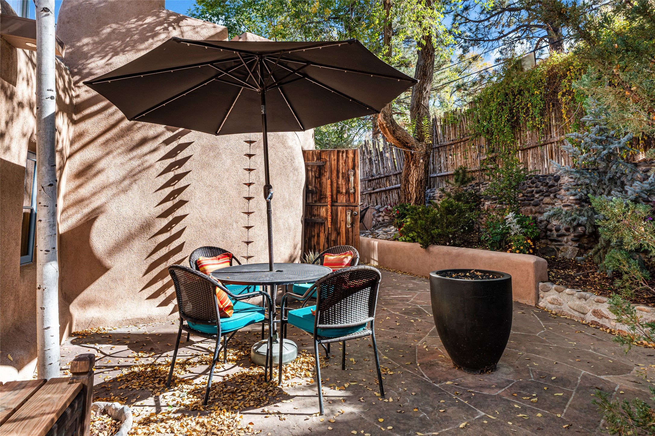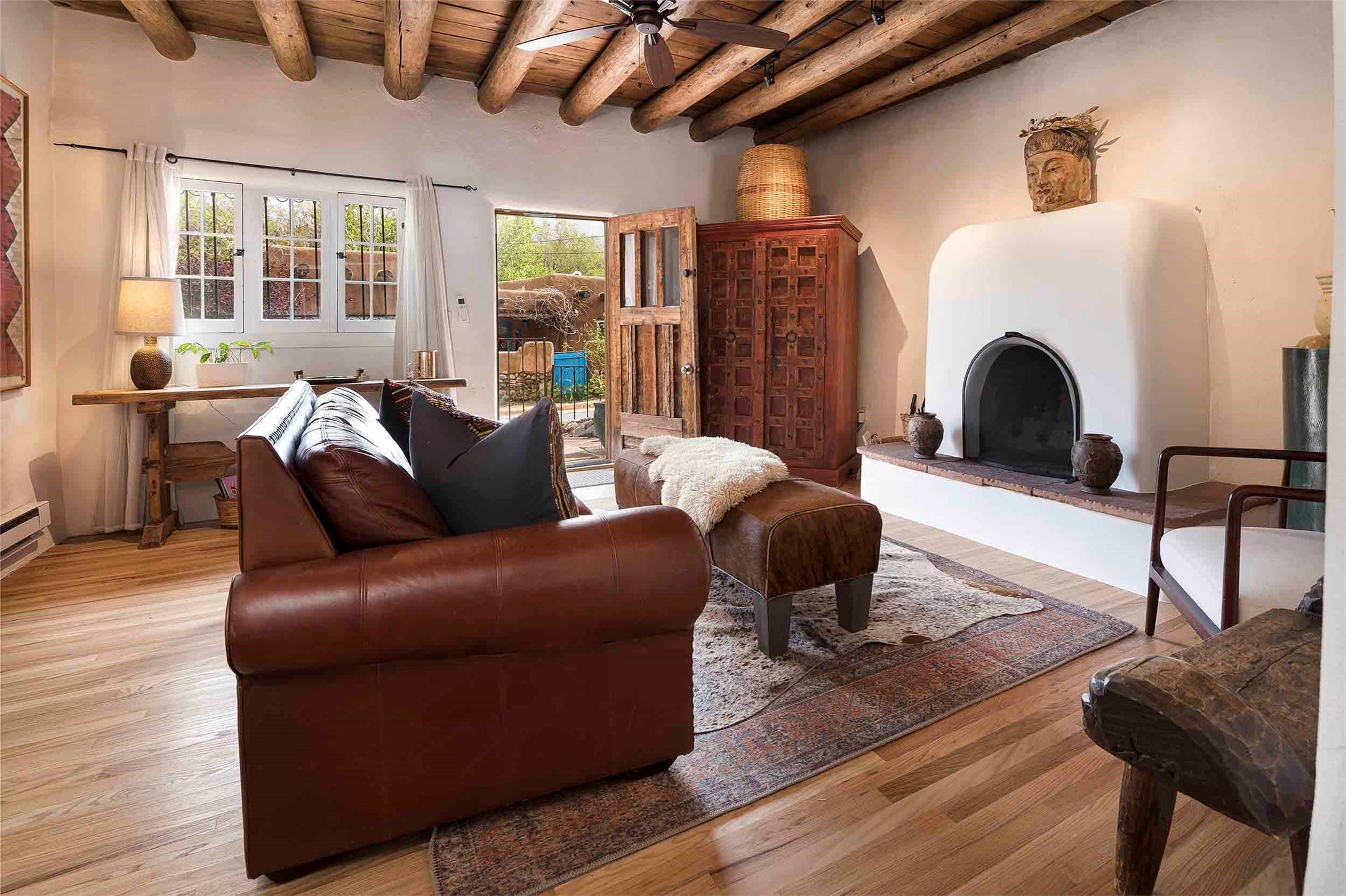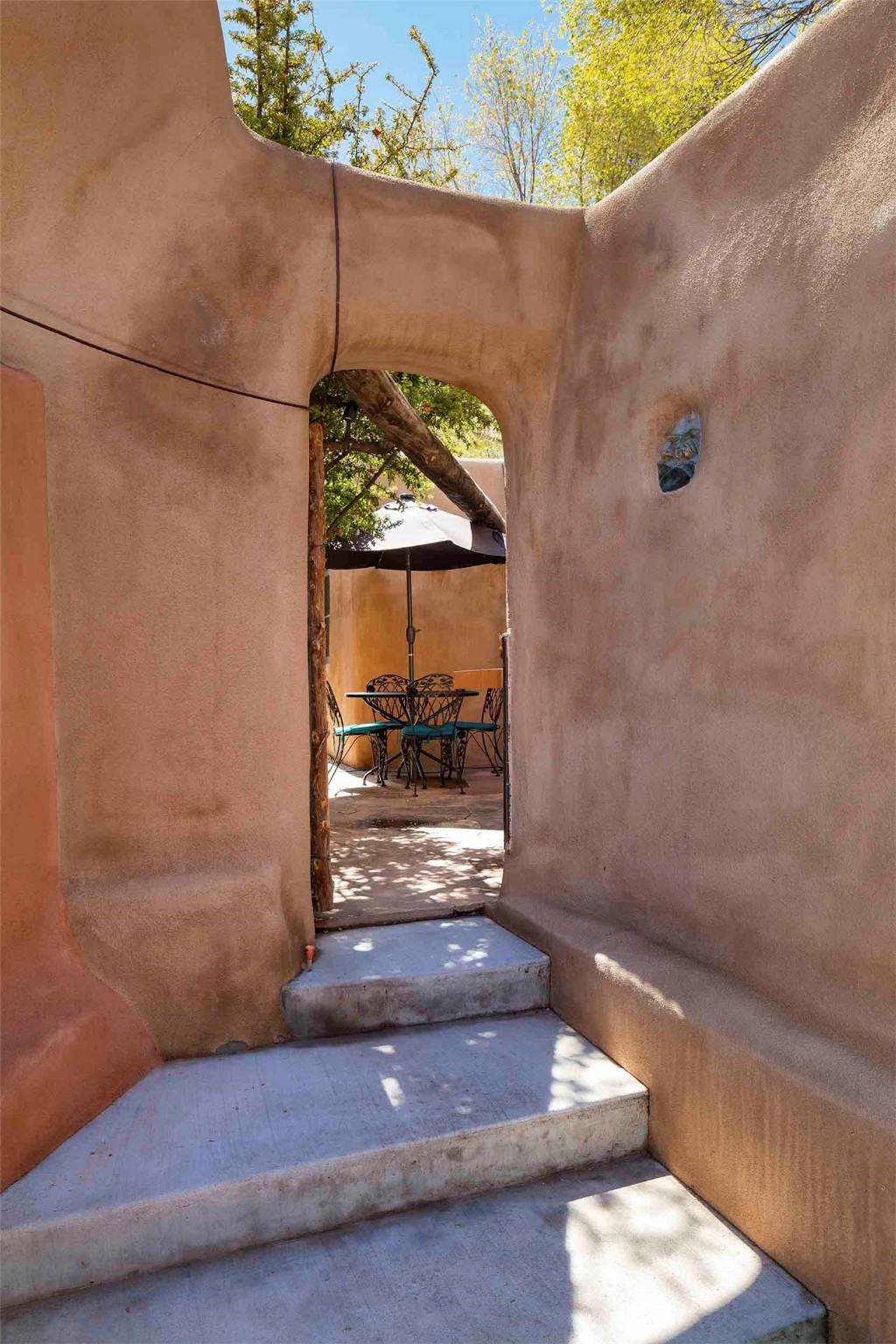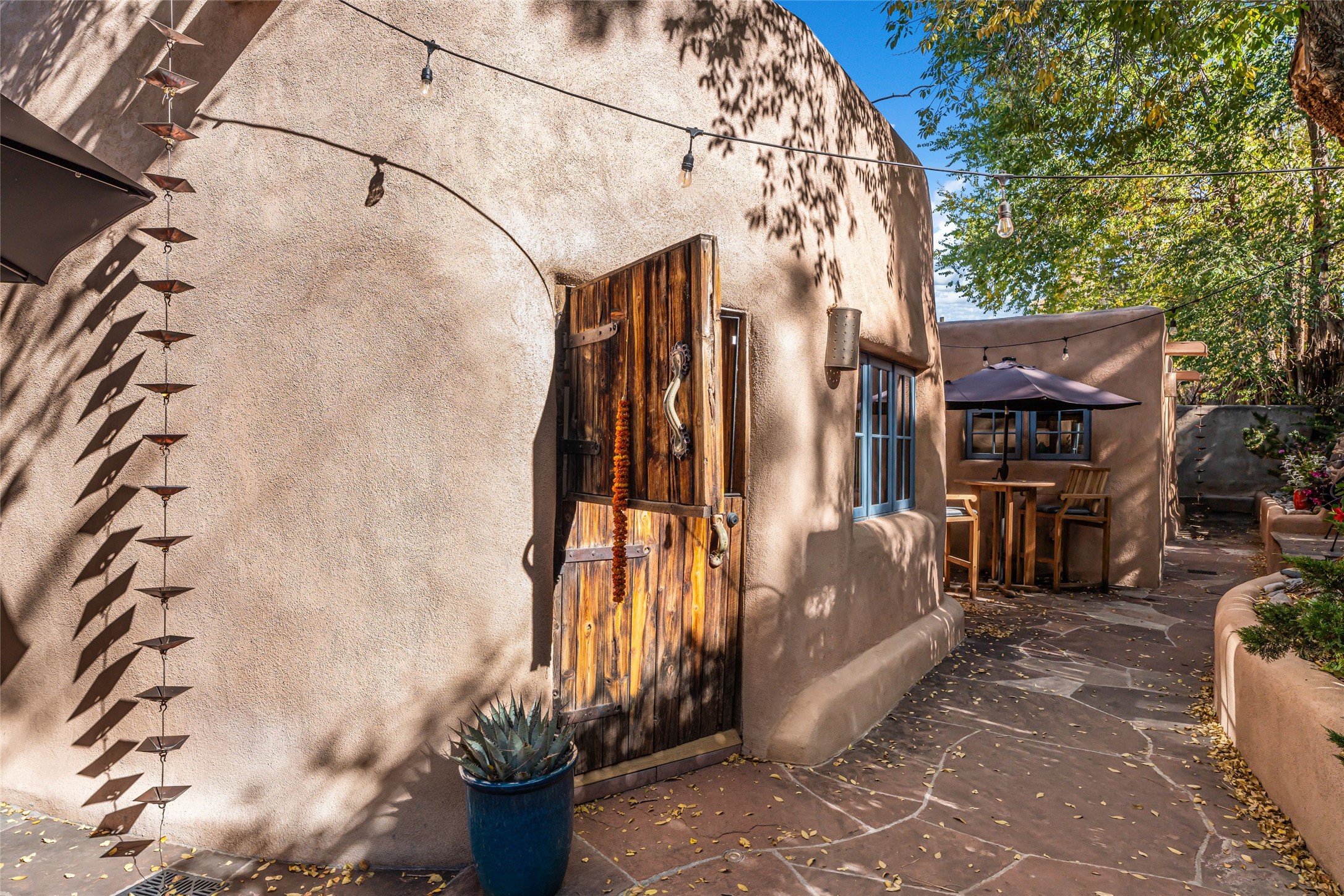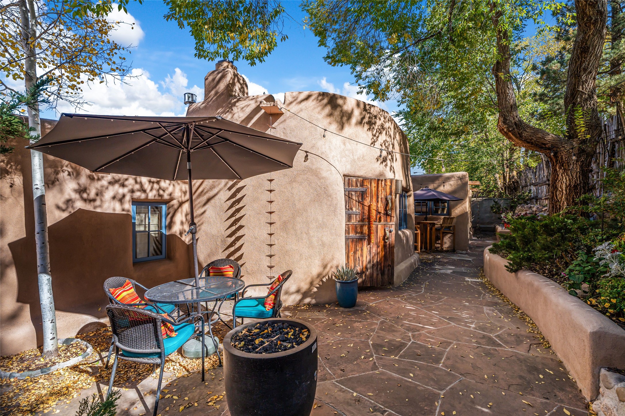 The history of Canyon Road is alive in the artisanal character of these two, Santa Fe classics. This successful Short Term Rental, set on a double lot, offers parking and storage in a desirable setting close to Patrick Smith Park. Each unique residence has been remodeled to a modern standard of comfort yet retains the imprint of its storied past. The back house, said to have started as a stable and tack shop in the early 1800s, has an Acequia Madre address and a dedicated parking spot at the top of a wooden staircase. A flagstone path and patio, with space for dining, a hot tub and a manageable dash of greenery, borders the home. The ceramic artwork of artist and former owner, Patricia Hoback, adds delightful dimension to both properties. The front house, rumored to have been a dance hall in the late 1800s, was Hoback's gallery. Between the two structures is a sheltered patio for alfresco meals and outdoor leisure, a Hoback artwork winking down from the wall. Enjoy the two dwellings for yourself, rent one for offset income, or rent both for maximum investment return. Buyers seeking history, authentic quality, and flexibility in the walkable heart of the Historic Eastside need look no further than this charismatic duet.