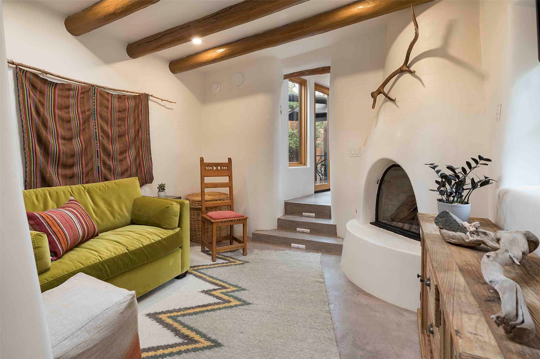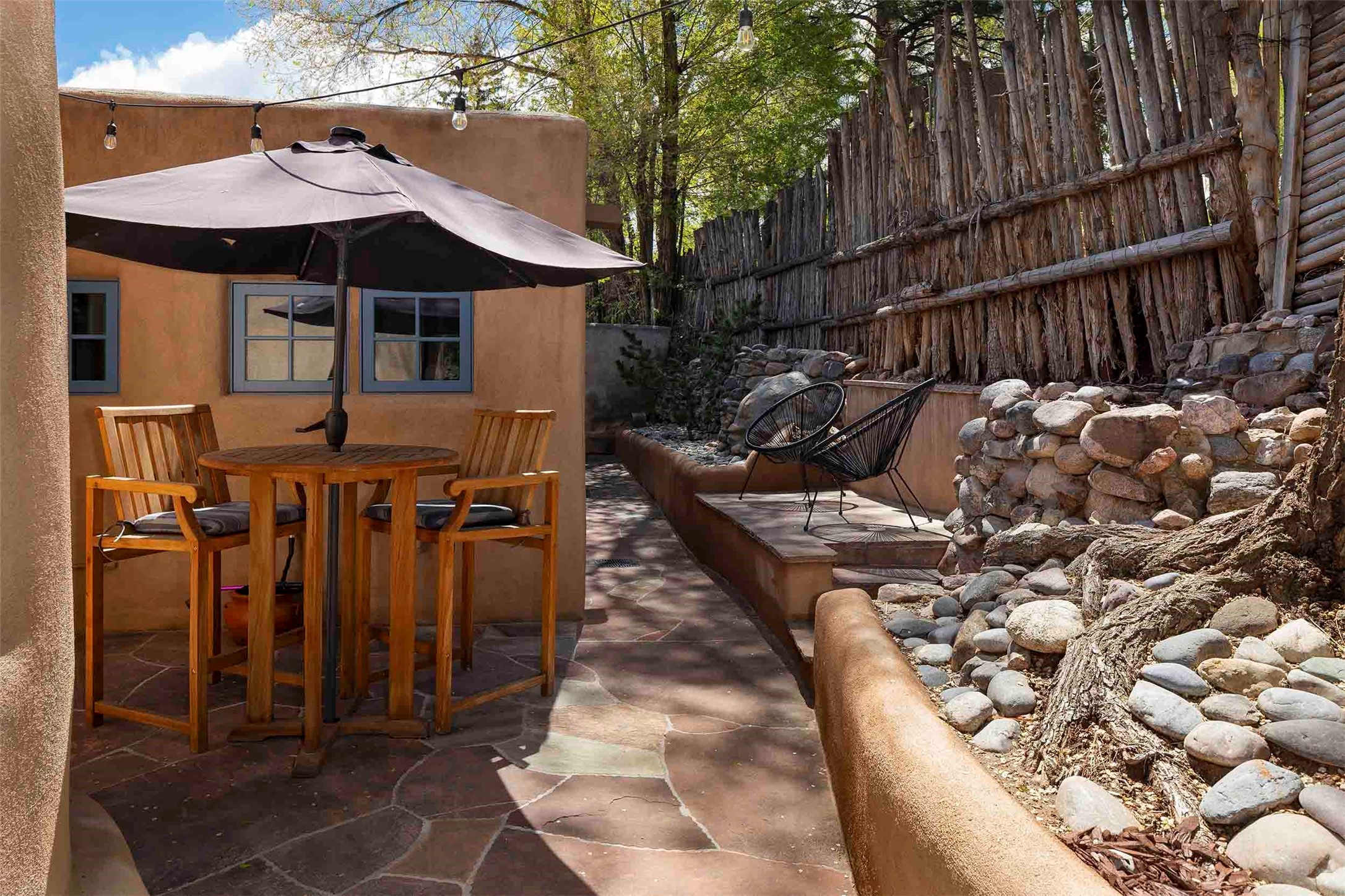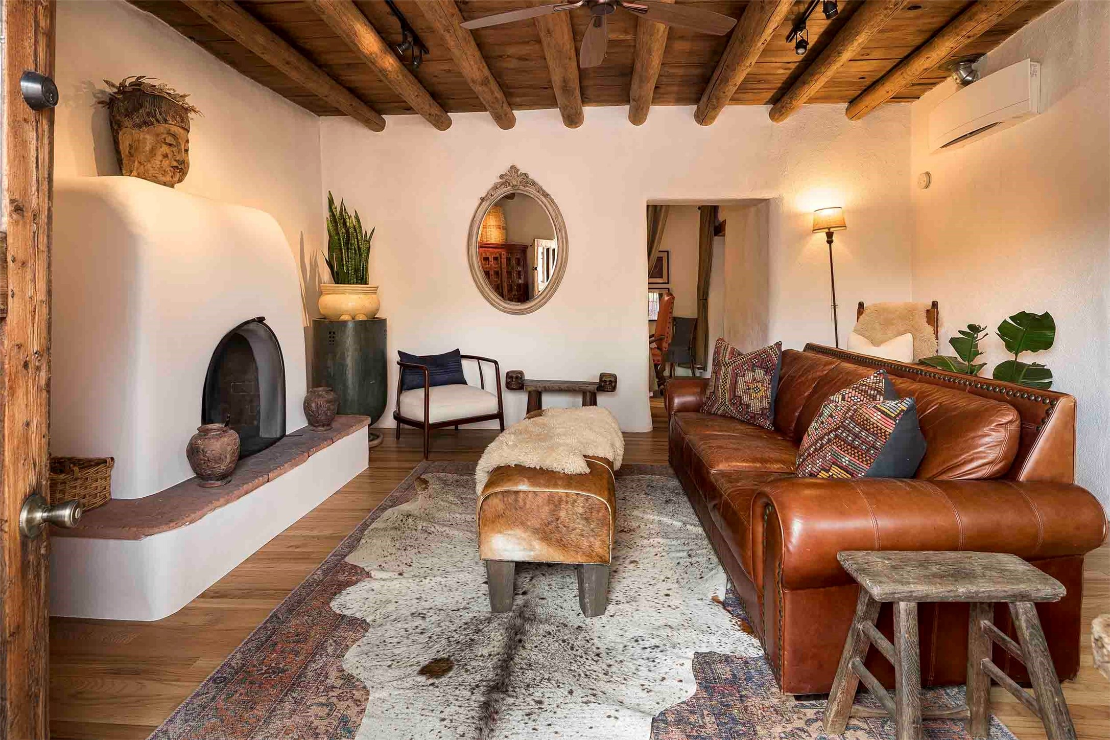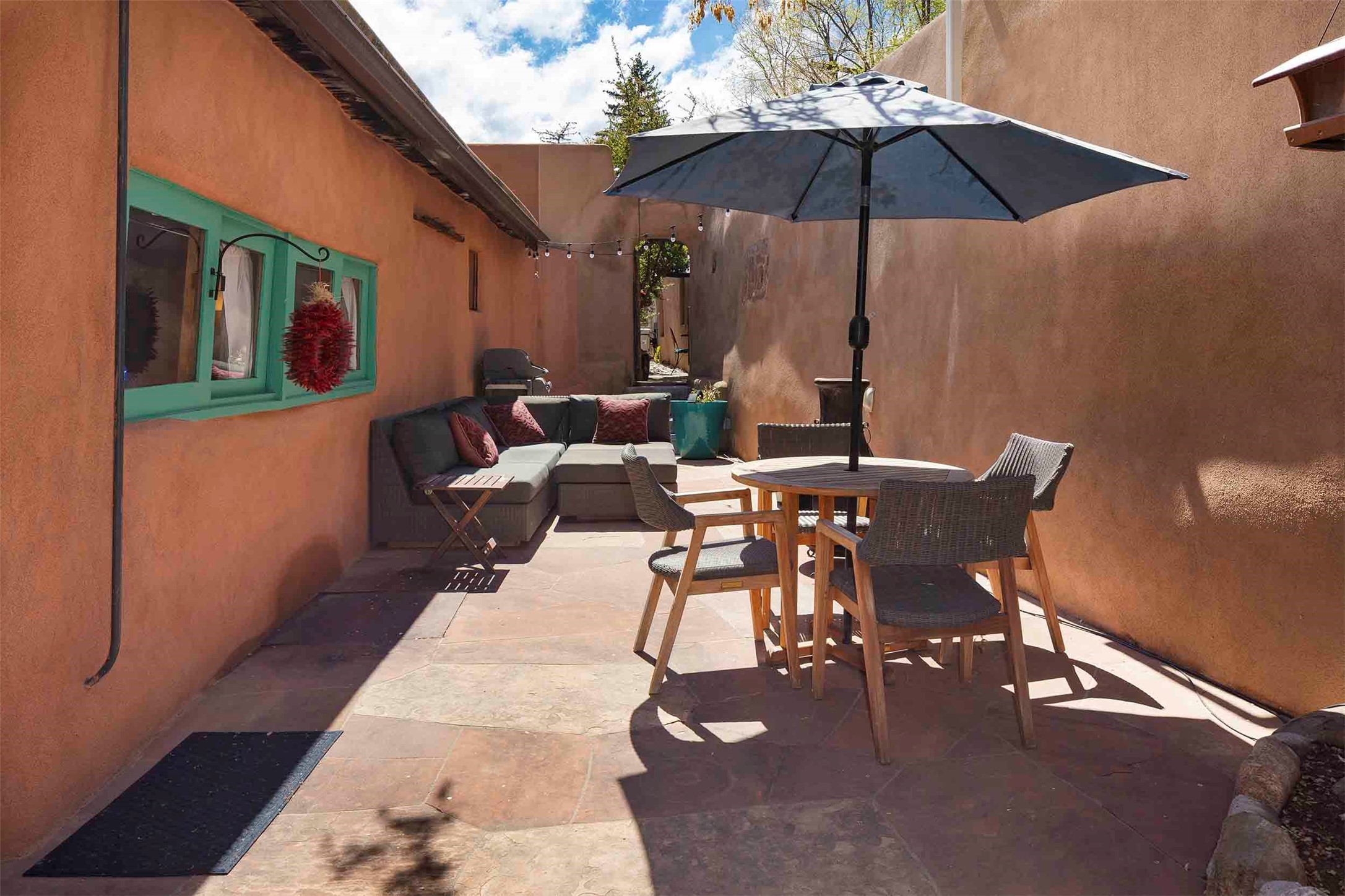 The history of Canyon Road is alive in the artisanal character of these two, Santa Fe classics. This successful Short Term Rental, set on a double lot, offers parking and storage in a desirable setting close to Patrick Smith Park. Each unique residence has been remodeled to a modern standard of comfort yet retains the imprint of its storied past. The back house, said to have started as a stable and tack shop in the early 1800s, has an Acequia Madre address and a dedicated parking spot at the top of a wooden staircase. A flagstone path and patio, with space for dining, a hot tub and a manageable dash of greenery, borders the home. The ceramic artwork of artist and former owner, Patricia Hoback, adds delightful dimension to both properties. The front house, rumored to have been a dance hall in the late 1800s, was Hoback's gallery. Between the two structures is a sheltered patio for alfresco meals and outdoor leisure, a Hoback artwork winking down from the wall. Enjoy the two dwellings for yourself, rent one for offset income, or rent both for maximum investment return. Buyers seeking history, authentic quality, and flexibility in the walkable heart of the Historic Eastside need look no further than this charismatic duet.