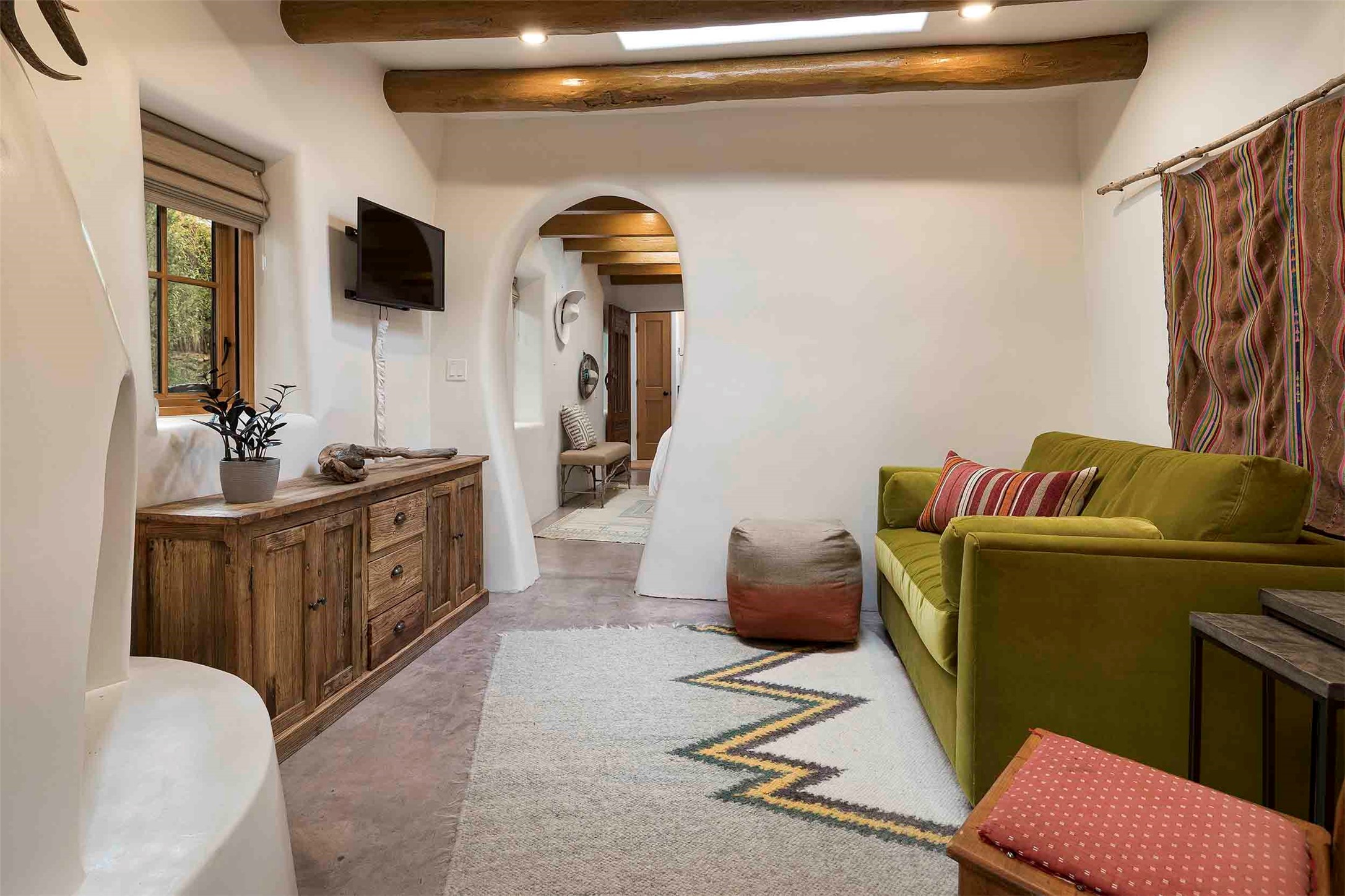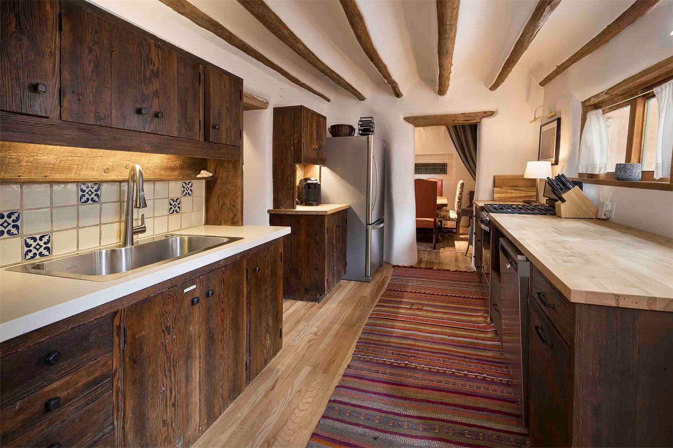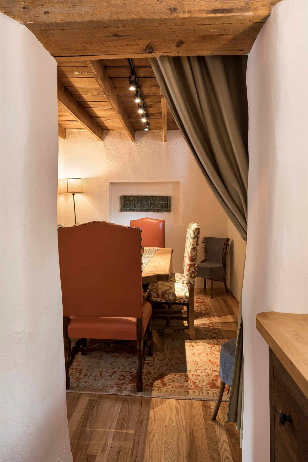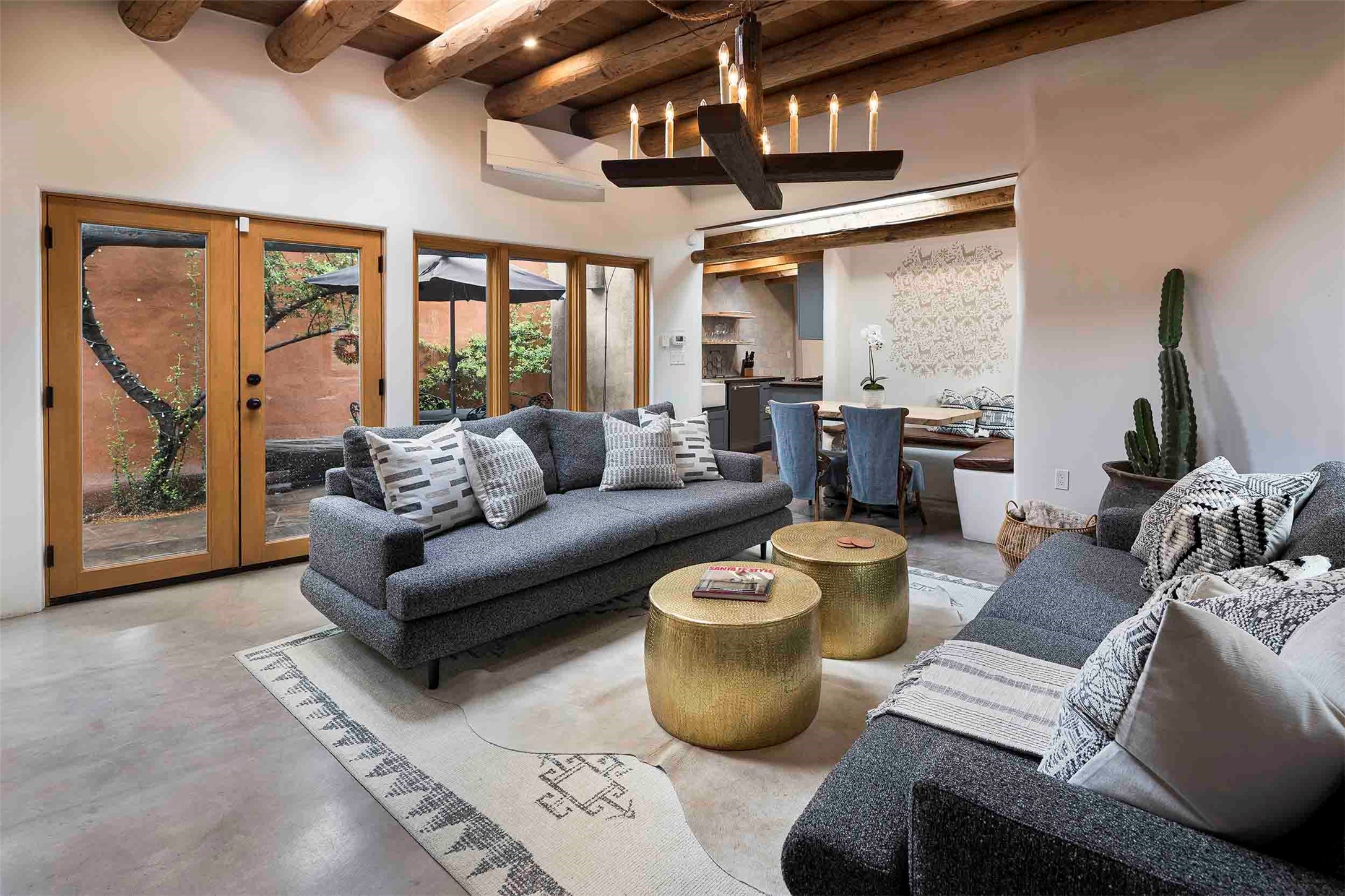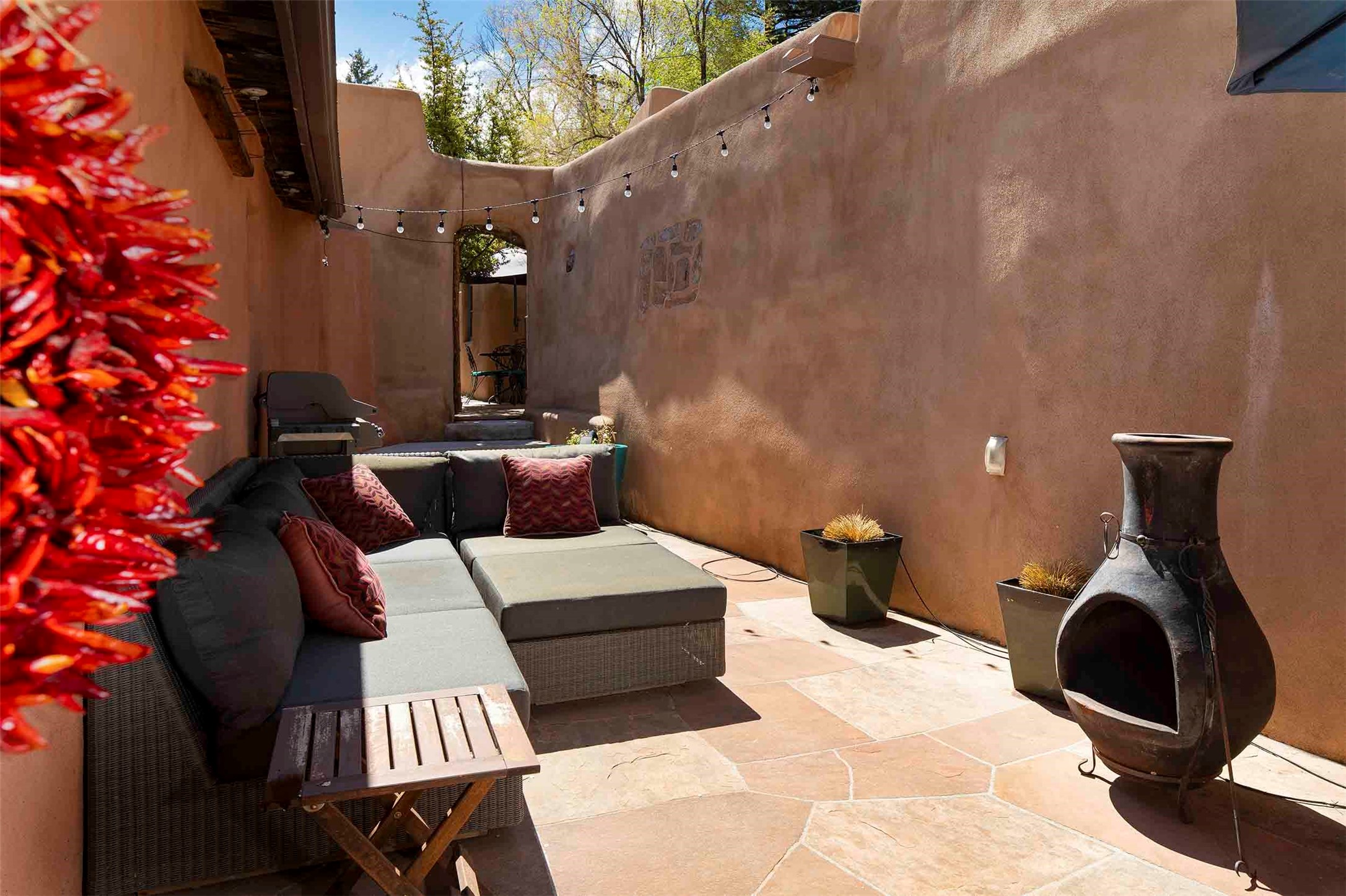 The history of Canyon Road is alive in the artisanal character of these two, Santa Fe classics. This successful Short Term Rental, set on a double lot, offers parking and storage in a desirable setting close to Patrick Smith Park. Each unique residence has been remodeled to a modern standard of comfort yet retains the imprint of its storied past. The back house, said to have started as a stable and tack shop in the early 1800s, has an Acequia Madre address and a dedicated parking spot at the top of a wooden staircase. A flagstone path and patio, with space for dining, a hot tub and a manageable dash of greenery, borders the home. The ceramic artwork of artist and former owner, Patricia Hoback, adds delightful dimension to both properties. The front house, rumored to have been a dance hall in the late 1800s, was Hoback's gallery. Between the two structures is a sheltered patio for alfresco meals and outdoor leisure, a Hoback artwork winking down from the wall. Enjoy the two dwellings for yourself, rent one for offset income, or rent both for maximum investment return. Buyers seeking history, authentic quality, and flexibility in the walkable heart of the Historic Eastside need look no further than this charismatic duet.