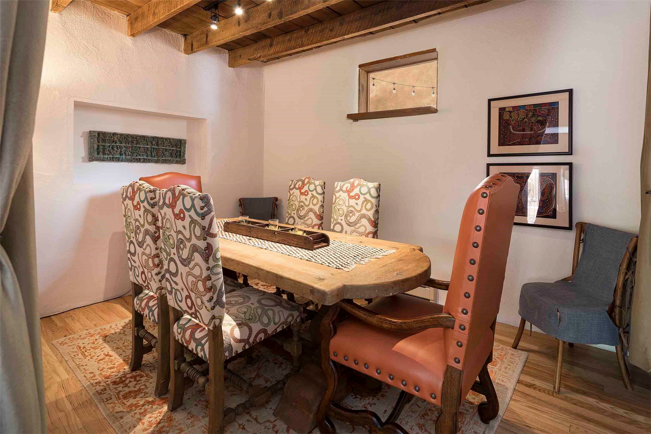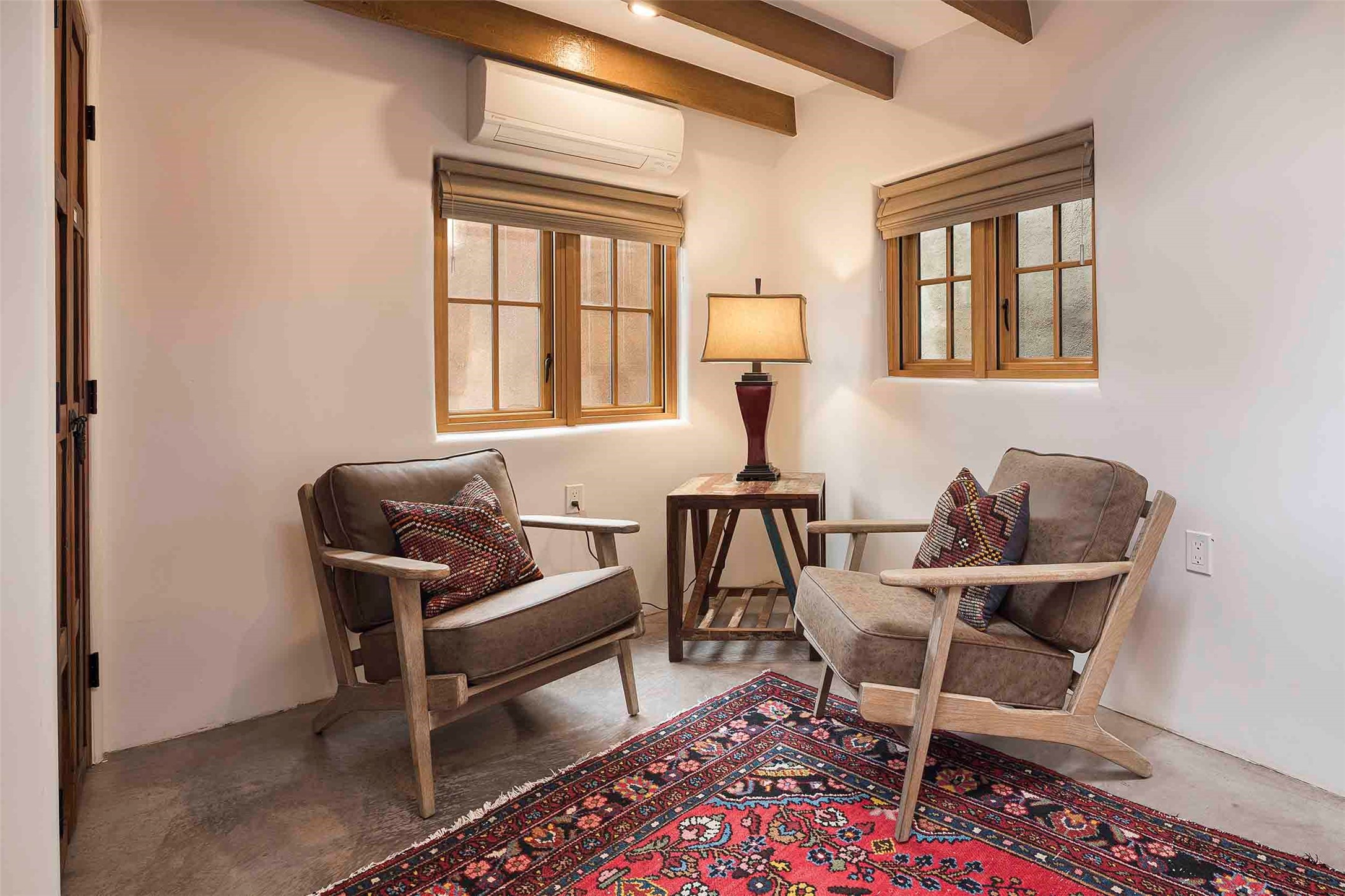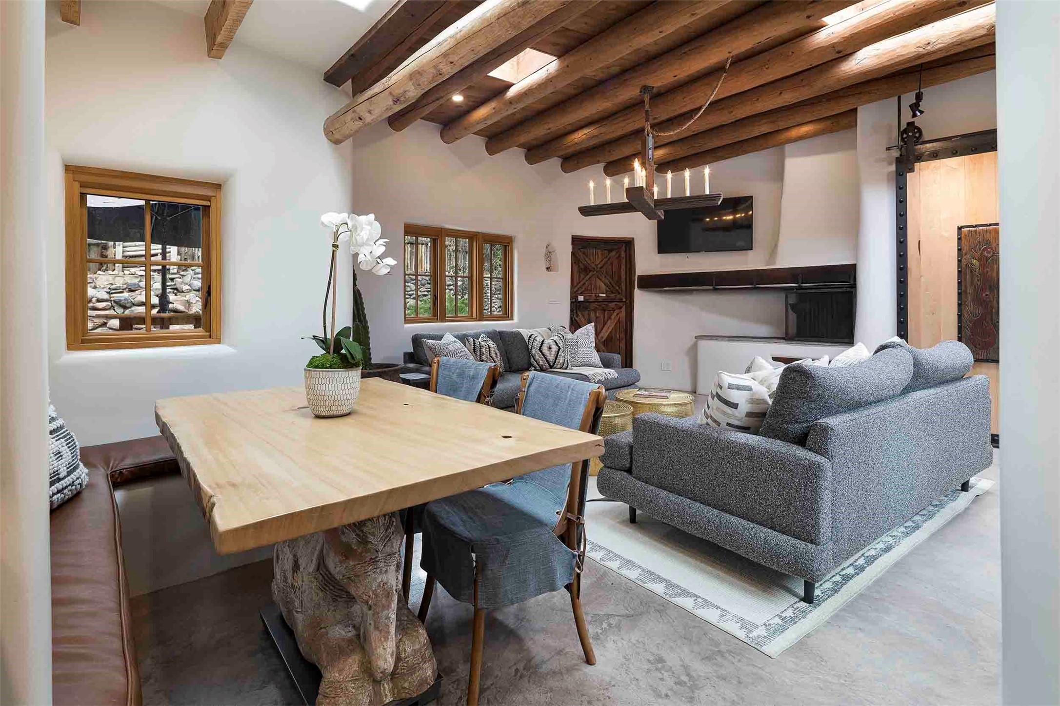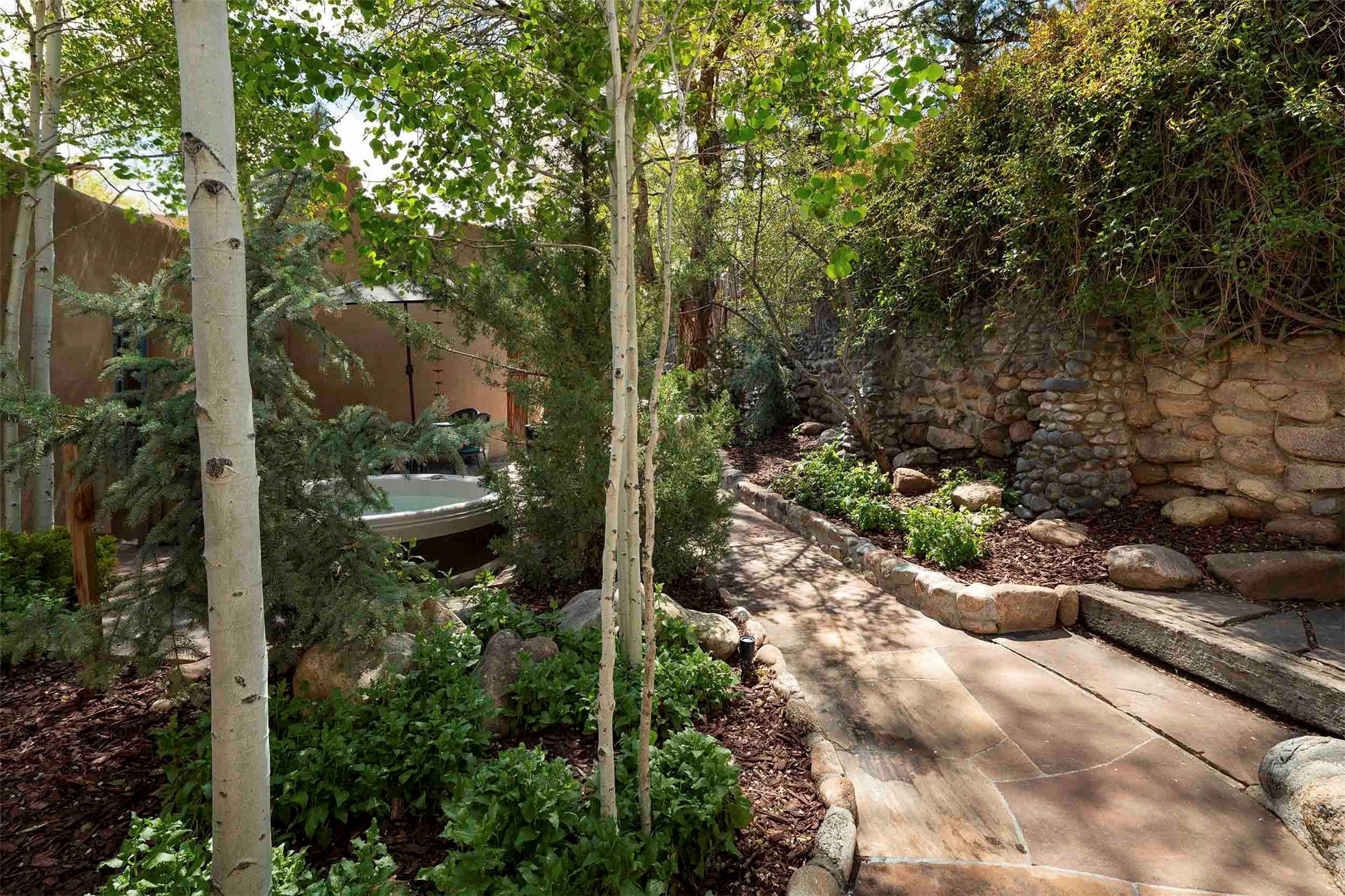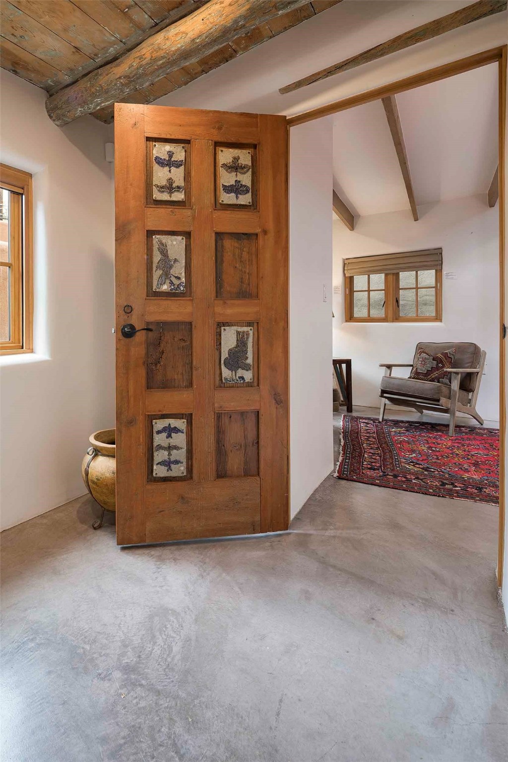 The history of Canyon Road is alive in the artisanal character of these two, Santa Fe classics. This successful Short Term Rental, set on a double lot, offers parking and storage in a desirable setting close to Patrick Smith Park. Each unique residence has been remodeled to a modern standard of comfort yet retains the imprint of its storied past. The back house, said to have started as a stable and tack shop in the early 1800s, has an Acequia Madre address and a dedicated parking spot at the top of a wooden staircase. A flagstone path and patio, with space for dining, a hot tub and a manageable dash of greenery, borders the home. The ceramic artwork of artist and former owner, Patricia Hoback, adds delightful dimension to both properties. The front house, rumored to have been a dance hall in the late 1800s, was Hoback's gallery. Between the two structures is a sheltered patio for alfresco meals and outdoor leisure, a Hoback artwork winking down from the wall. Enjoy the two dwellings for yourself, rent one for offset income, or rent both for maximum investment return. Buyers seeking history, authentic quality, and flexibility in the walkable heart of the Historic Eastside need look no further than this charismatic duet.