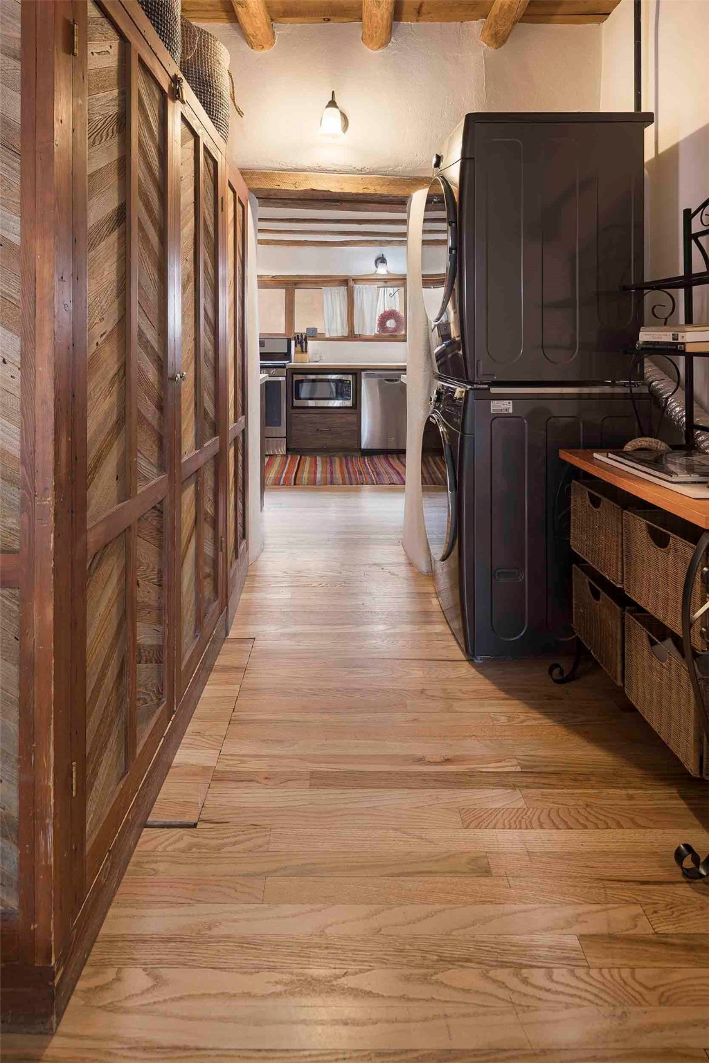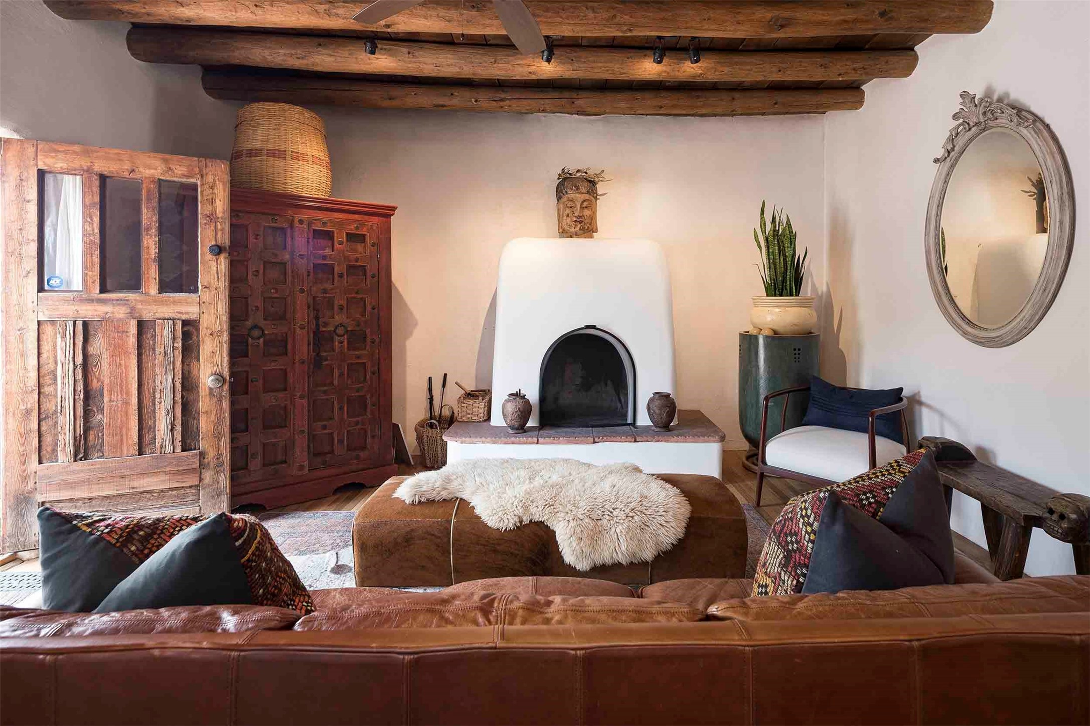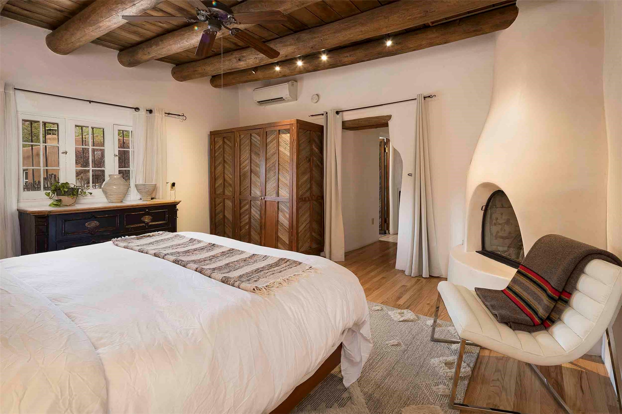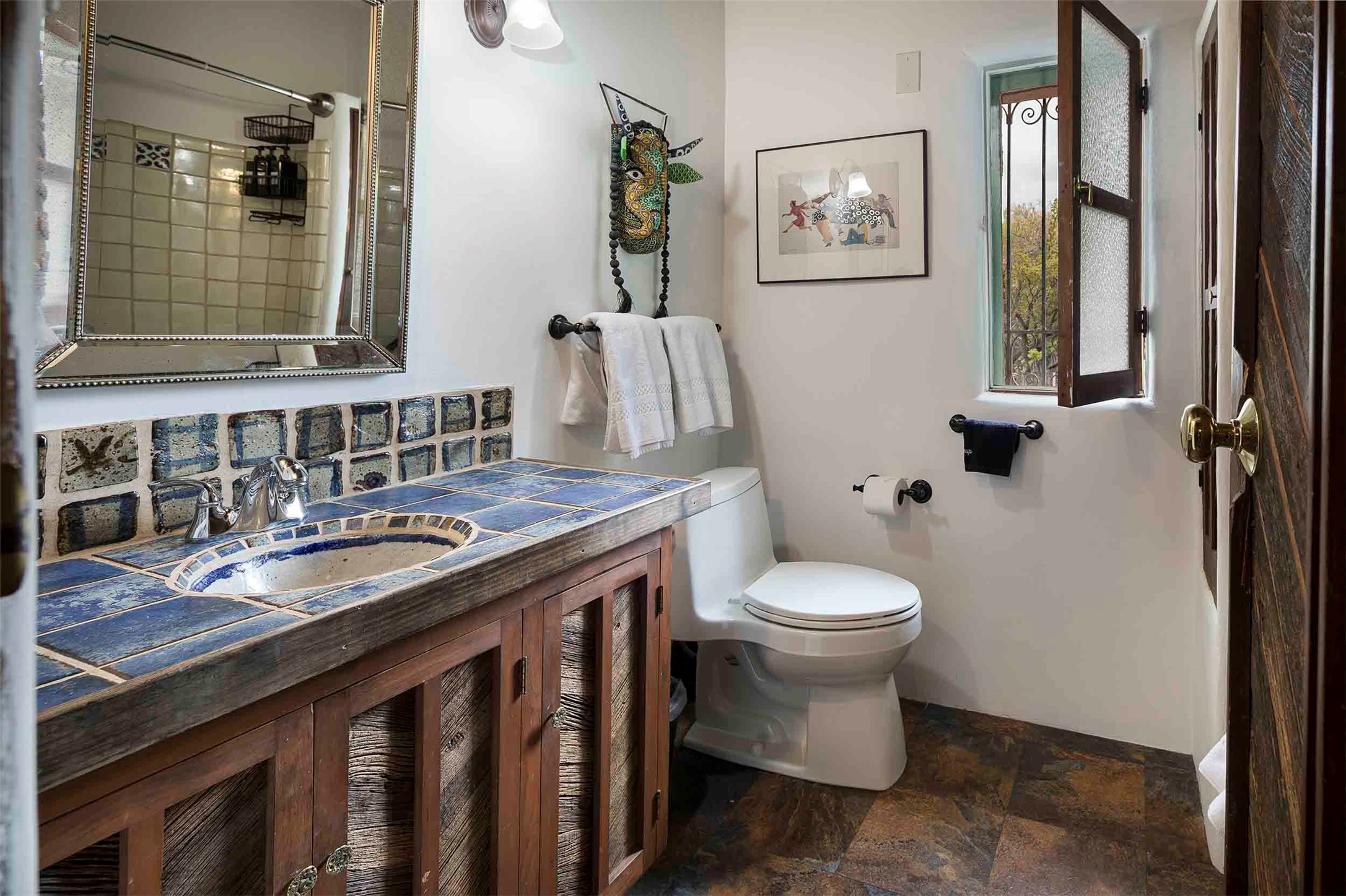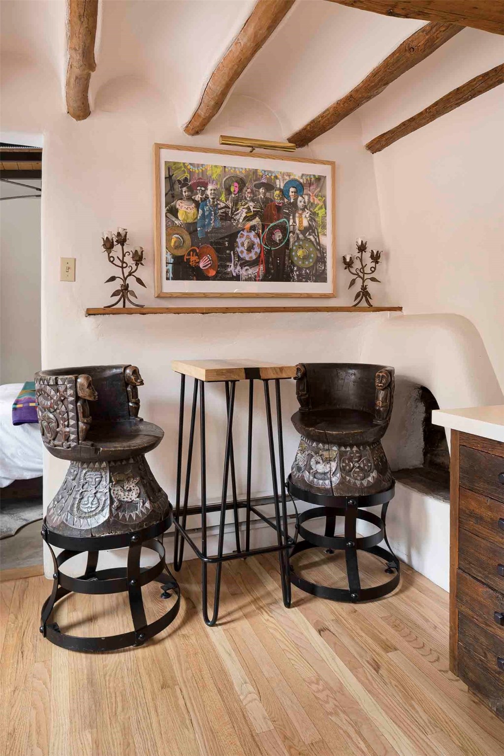 The history of Canyon Road is alive in the artisanal character of these two, Santa Fe classics. This successful Short Term Rental, set on a double lot, offers parking and storage in a desirable setting close to Patrick Smith Park. Each unique residence has been remodeled to a modern standard of comfort yet retains the imprint of its storied past. The back house, said to have started as a stable and tack shop in the early 1800s, has an Acequia Madre address and a dedicated parking spot at the top of a wooden staircase. A flagstone path and patio, with space for dining, a hot tub and a manageable dash of greenery, borders the home. The ceramic artwork of artist and former owner, Patricia Hoback, adds delightful dimension to both properties. The front house, rumored to have been a dance hall in the late 1800s, was Hoback's gallery. Between the two structures is a sheltered patio for alfresco meals and outdoor leisure, a Hoback artwork winking down from the wall. Enjoy the two dwellings for yourself, rent one for offset income, or rent both for maximum investment return. Buyers seeking history, authentic quality, and flexibility in the walkable heart of the Historic Eastside need look no further than this charismatic duet.