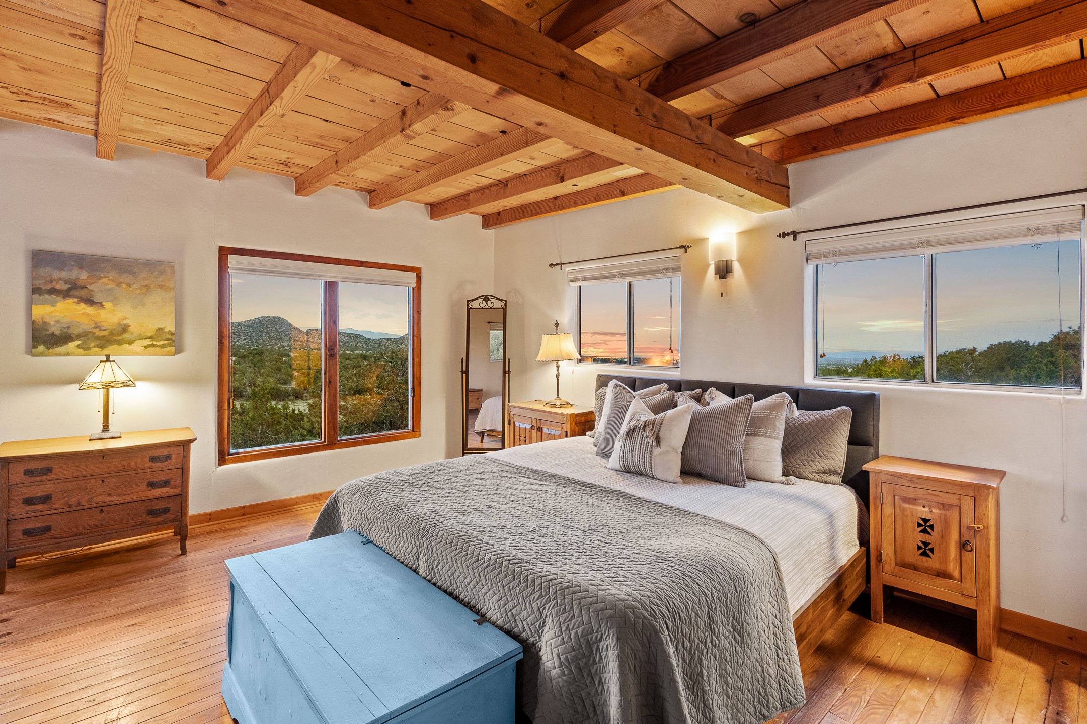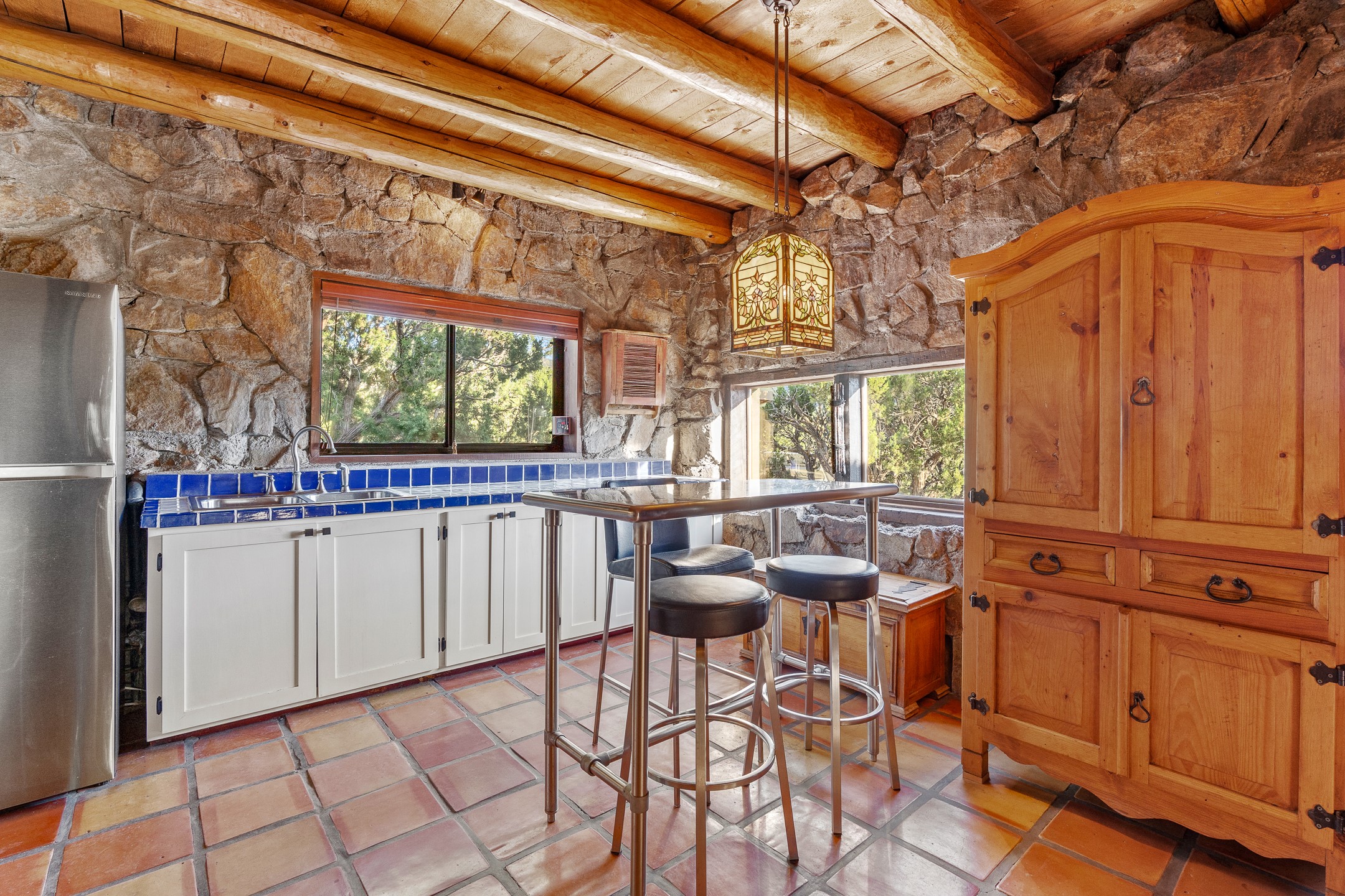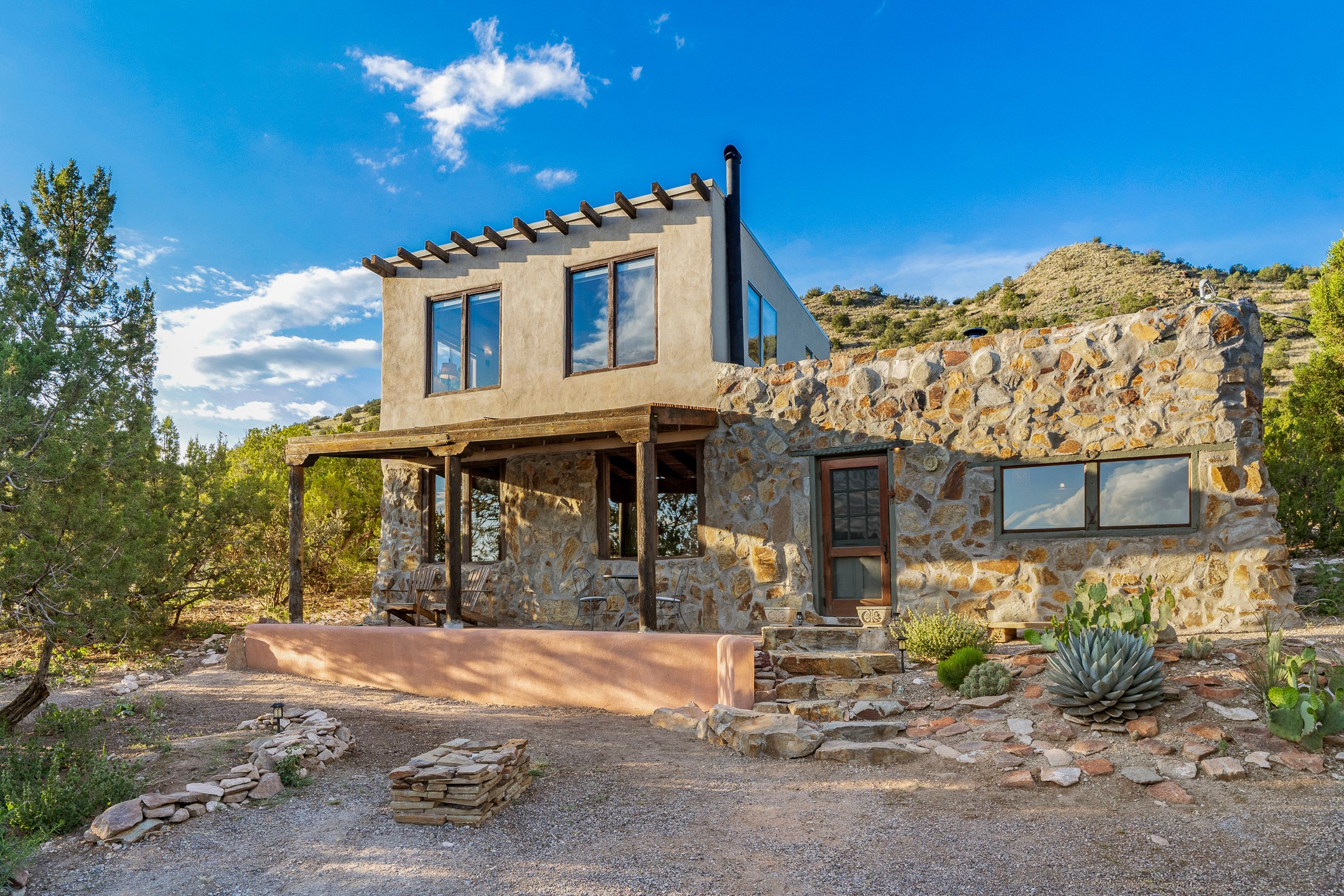 Experience sustainable Off-Grid living in a truly unique and artistically designed home. A One bedroom, one full bath Artist retreat in Madrid, New Mexico with solidly built craftsmanship. Every detail speaks to inspiration and integrity--from the hand-poured, etched entry threshold, the turquoise inlay to the artisan stone walls, hand-hewn vigas, and thick reclaimed timber beam window ledges. A mosaic tile inlay graces the foot of the richly grained hardwood staircase, and a striking stone-clad fireplace anchors the living space with warmth and enduring character. Designed for comfort and sustainability, this home offers a holistic lifestyle in a truly inspiring setting. The spacious bedroom opens to sweeping, unobstructed views set at the base of Cerro Chato and facing the majestic Ortiz Mountains. This solar-powered sanctuary offers privacy and breathtaking mountain vistas on over 10 rolling acres--just 3 minutes from the historic Turquoise Trail, under two miles from the Cultural Hub and Historic mining village of Madrid, and a short drive to Santa Fe. Live off-grid with confidence thanks to an upgraded solar system, backup generator, owned propane tank, private well 85-95 feet deep with 10-12 gallons per minute, new Norwesco 350 gallon well holding tank for the well water that fills in 40 minutes, new septic system and new leach field 2025 (infiltrator model wm-11-03-100, a newly built portal -2025, and 2021 roof. A bright, versatile outbuilding houses the solar batteries and offers additional space for storage, an office, or a creative studio. Bring your chickens, mini goats or a burro; the property includes a single stall, feed shed, and ample room for expansion. Whether you're hiking, stargazing, or simply soaking in the beauty of the high desert, this land invites deep connection with nature. For anyone dreaming of an Off-grid lifestyle- whether you're a homesteader, hobby farmer, or simply seeking peace and regeneration. Experience a rare blend of tranquility, creativity, and connection to the land--just moments from the vibrant arts, culture, and dining of Madrid and Santa Fe.
