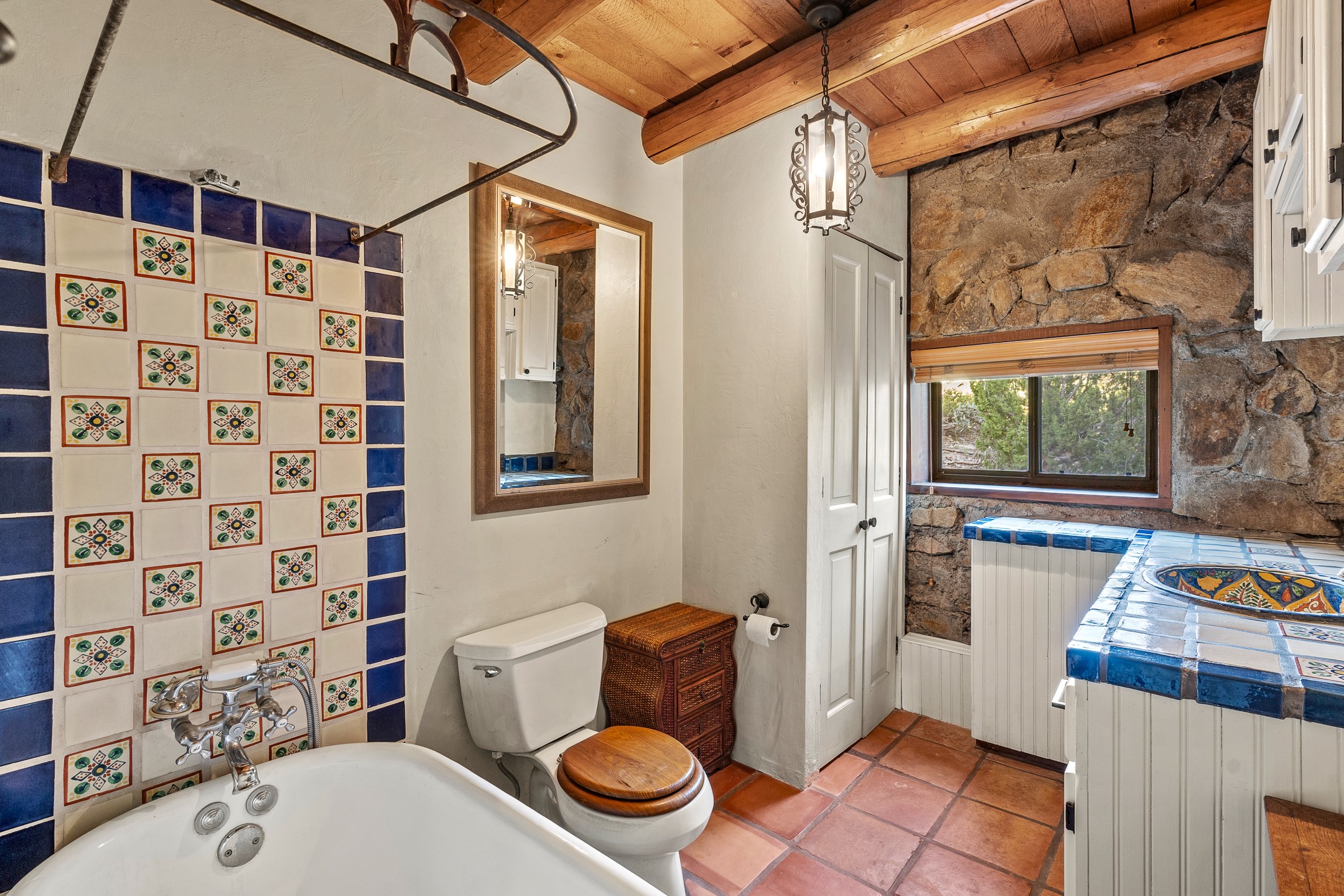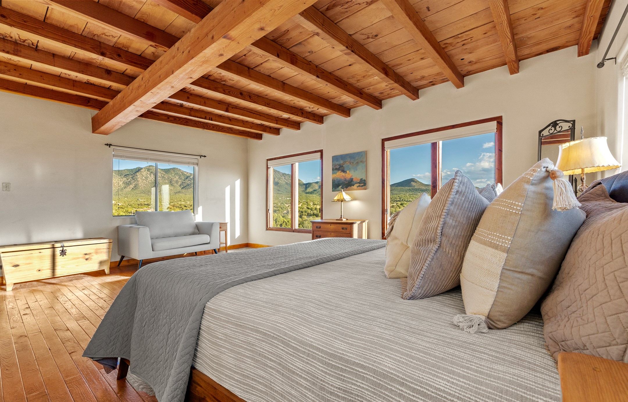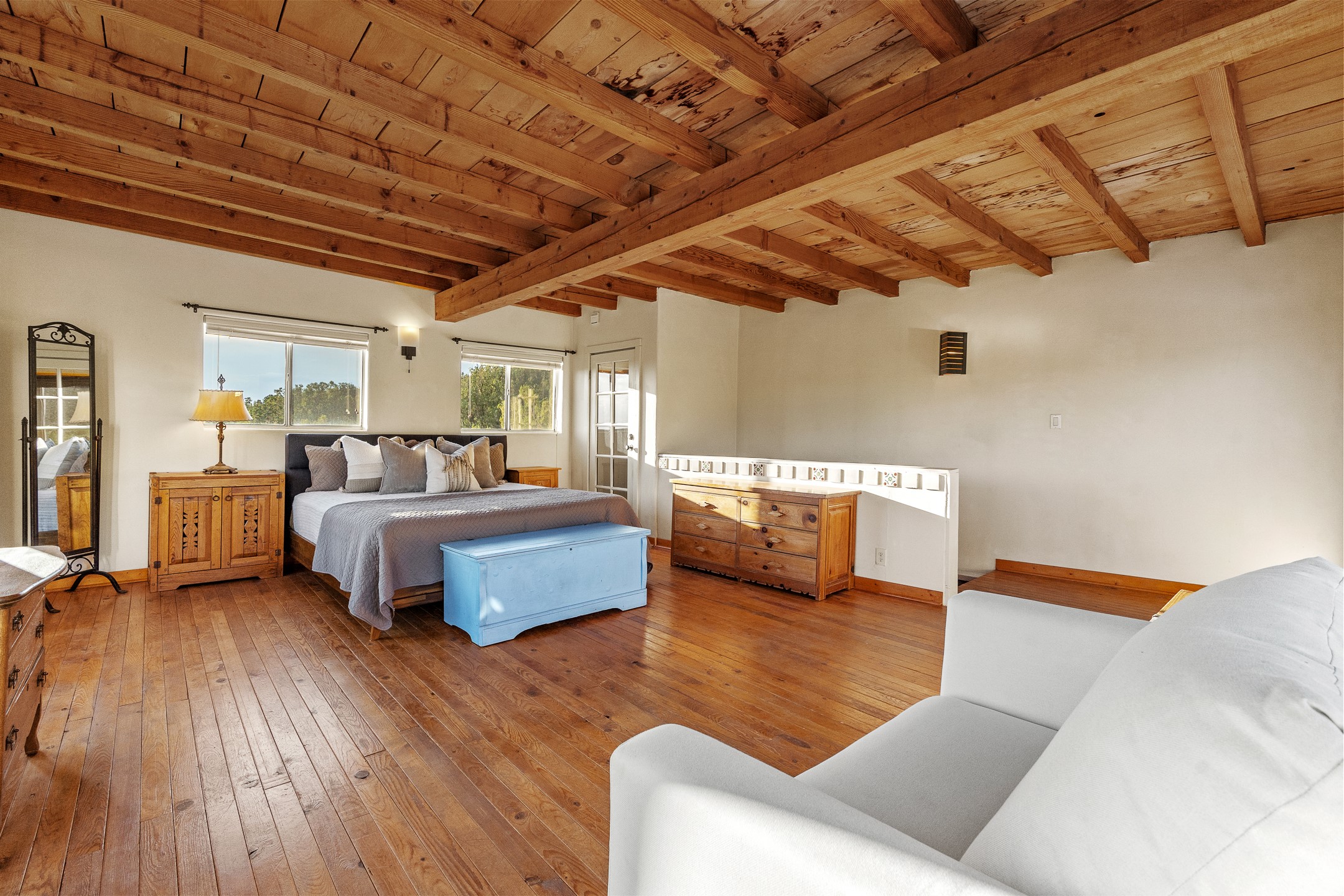 Experience sustainable Off-Grid living in a truly unique and artistically designed home. A One bedroom, one full bath Artist retreat in Madrid, New Mexico with solidly built craftsmanship. Every detail speaks to inspiration and integrity--from the hand-poured, etched entry threshold, the turquoise inlay to the artisan stone walls, hand-hewn vigas, and thick reclaimed timber beam window ledges. A mosaic tile inlay graces the foot of the richly grained hardwood staircase, and a striking stone-clad fireplace anchors the living space with warmth and enduring character. Designed for comfort and sustainability, this home offers a holistic lifestyle in a truly inspiring setting. The spacious bedroom opens to sweeping, unobstructed views set at the base of Cerro Chato and facing the majestic Ortiz Mountains. This solar-powered sanctuary offers privacy and breathtaking mountain vistas on over 10 rolling acres--just 3 minutes from the historic Turquoise Trail, under two miles from the Cultural Hub and Historic mining village of Madrid, and a short drive to Santa Fe. Live off-grid with confidence thanks to an upgraded solar system, backup generator, owned propane tank, private well 85-95 feet deep with 10-12 gallons per minute, new Norwesco 350 gallon well holding tank for the well water that fills in 40 minutes, new septic system and new leach field 2025 (infiltrator model wm-11-03-100, a newly built portal -2025, and 2021 roof. A bright, versatile outbuilding houses the solar batteries and offers additional space for storage, an office, or a creative studio. Bring your chickens, mini goats or a burro; the property includes a single stall, feed shed, and ample room for expansion. Whether you're hiking, stargazing, or simply soaking in the beauty of the high desert, this land invites deep connection with nature. For anyone dreaming of an Off-grid lifestyle- whether you're a homesteader, hobby farmer, or simply seeking peace and regeneration. Experience a rare blend of tranquility, creativity, and connection to the land--just moments from the vibrant arts, culture, and dining of Madrid and Santa Fe.