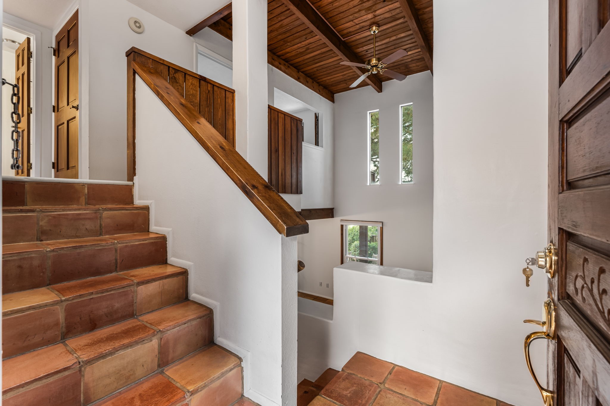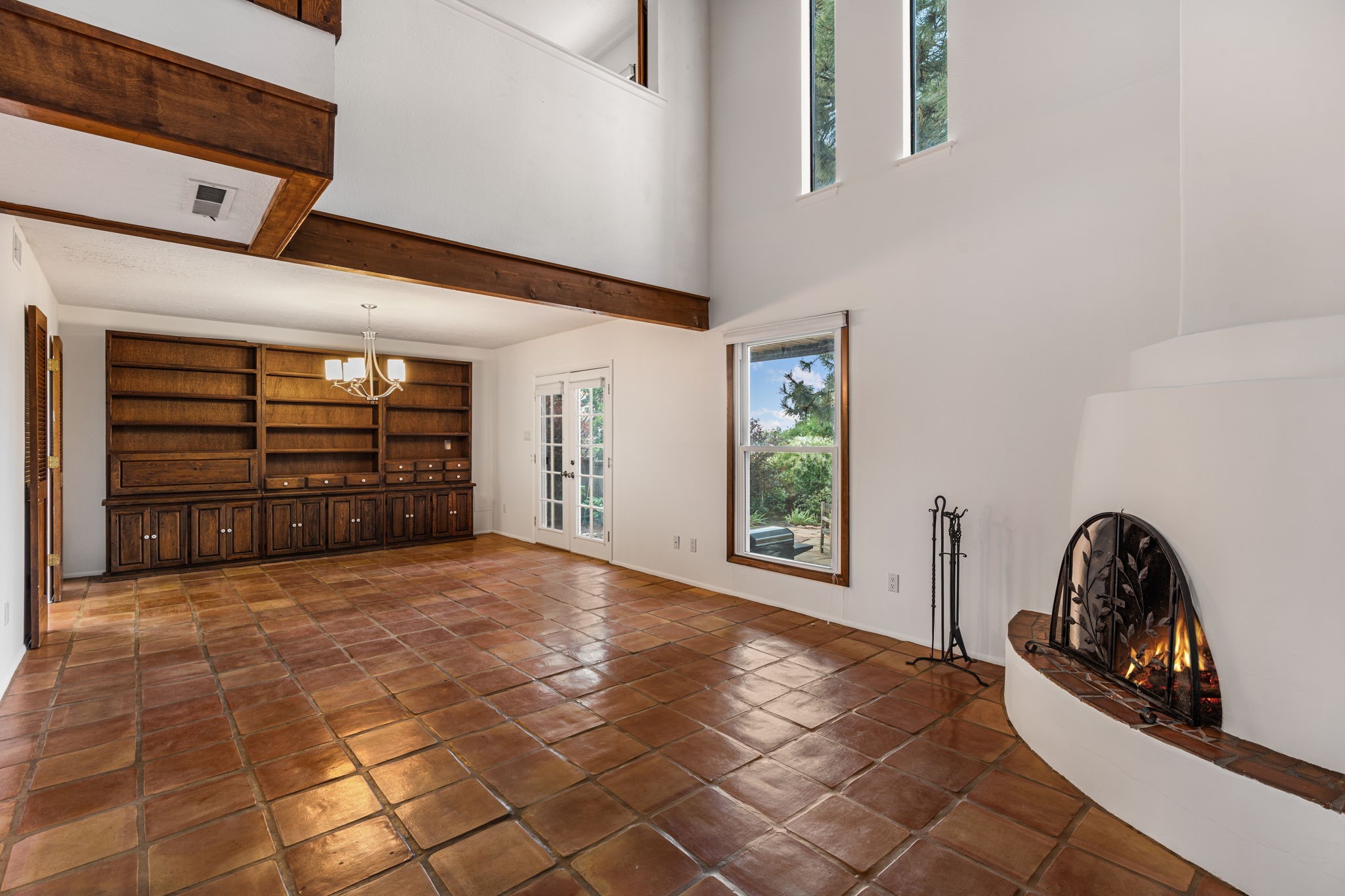 This stylish, freshly painted 3 bed, 2 bath tri-level home in the sought-after Park Plazas community blends Southwestern charm with modern updates.The spacious downstairs level invites you in with a tiled living room featuring striking two-story ceilings, interesting architectural detail and a dramatic Kiva fireplace--the perfect focal point for cozy gatherings. The open-concept dining area flows seamlessly into the well-appointed kitchen and provides direct access to a serene, shaded portal and flagstone patio, nestled beneath a majestic ponderosa pine. It's the ideal spot for al fresco dining or morning coffee, surrounded by the tranquility of a fully fenced backyard.This level also includes a bedroom, laundry area, and a convenient half bath, perfect for guests or multi-generational living.Upstairs, you'll find two generously sized bedrooms and a full bathroom with ample storage. The primary suite is a true retreat, opening to a sunny, recently rebuilt Trex deck--designed for low maintenance and long-lasting durability--where you can unwind while soaking in breathtaking sunset views of the Jemez and Sandia Mountains.With a newer roof (3 years old) and fresh stucco (2 years old), this home is move-in ready and built to last. A two-car garage adds practicality, while community amenities--including miles of walking trails, an off-leash dog park, tennis courts, a community garden, and more--elevate everyday living.Ideally located just minutes from shopping, dining, and all the cultural richness Santa Fe has to offer, this home is a rare find at a fantastic price. Don't miss your chance to own a slice of Southwestern paradise!