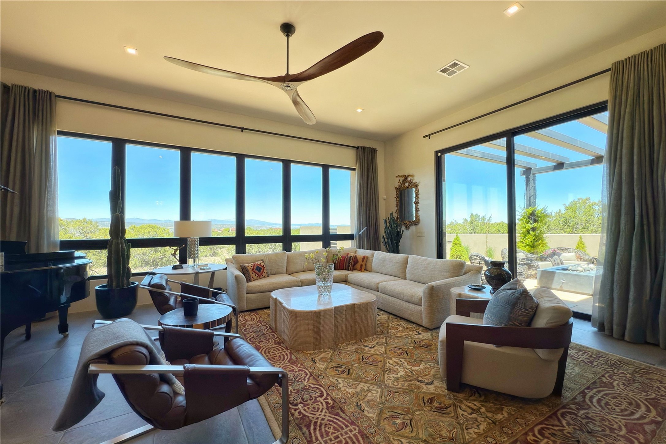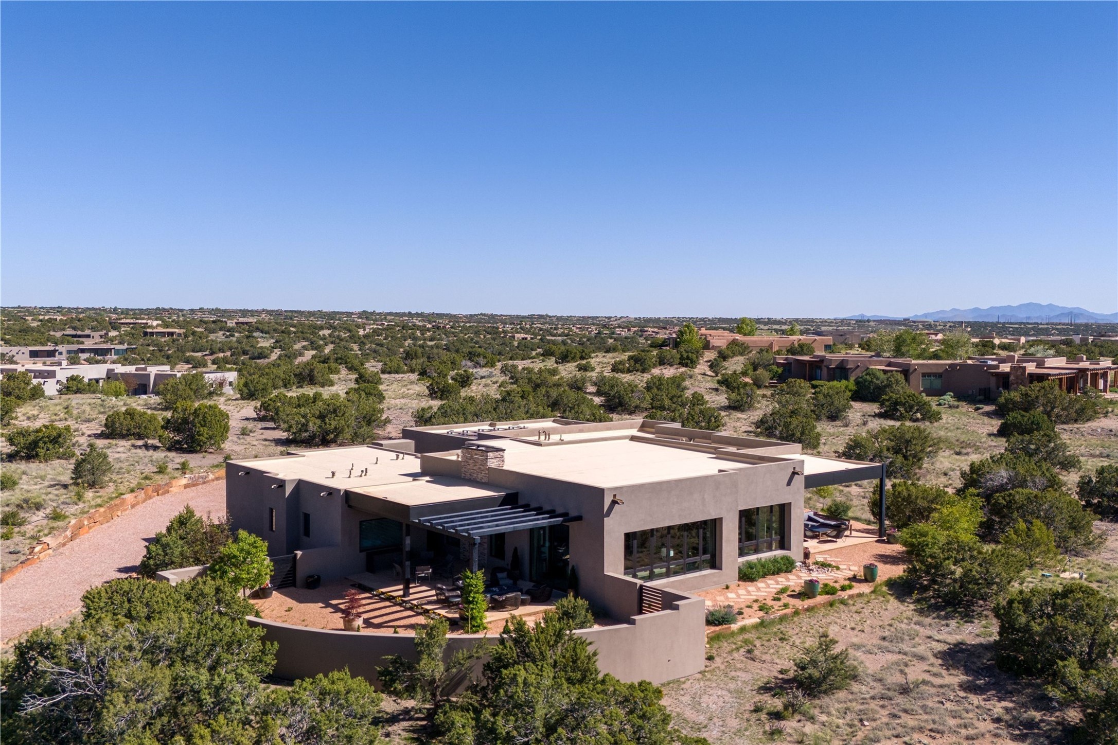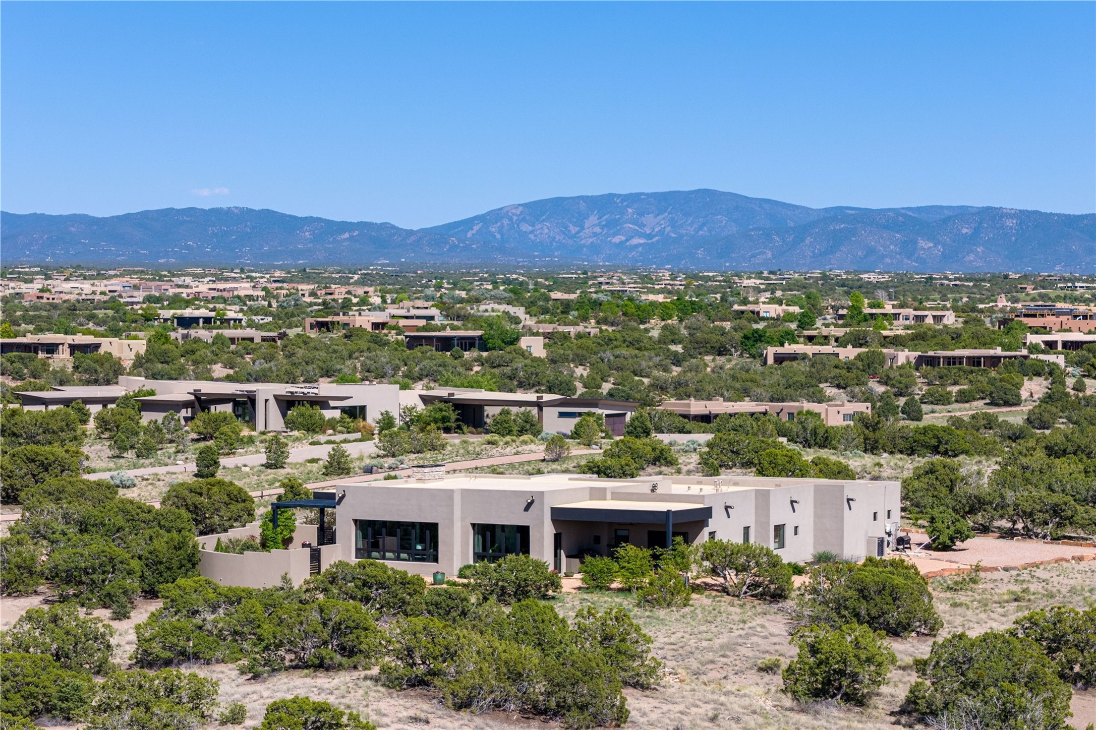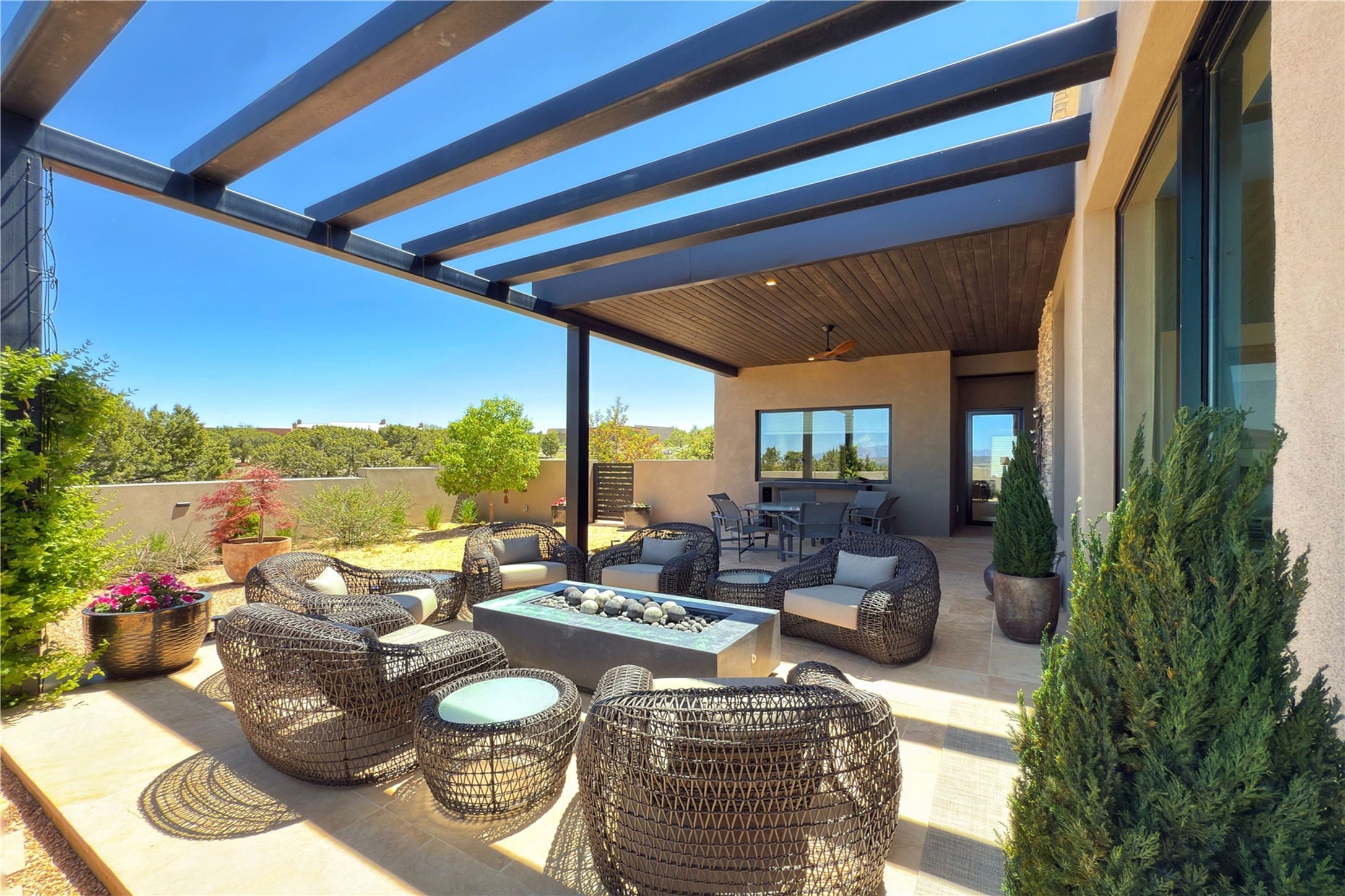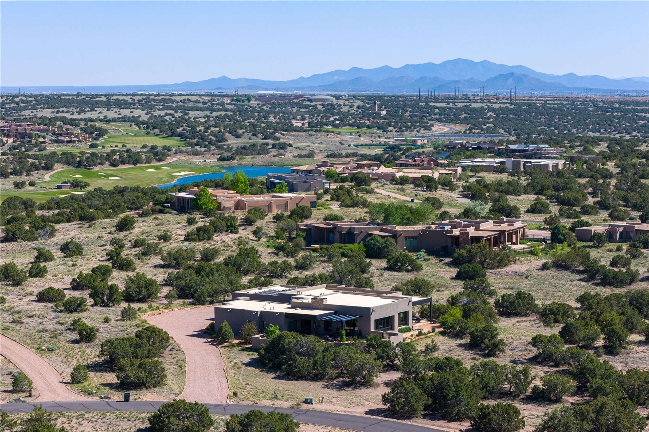 Contemporary Elegance with Designer TouchesA stunning contemporary residence thoughtfully curated celebrates Jemez mountain views and Santa Fe sunsets. This architectural gem offers high-end finishes, designer details, and expansive indoor-outdoor living in desirable Las Campanas.This home welcomes you with a zen-like garden and water feature. Step through the large pivoting wooden door and be greeted by a great room concept with soaring ceilings and abundant natural light. A contemporary glass chandelier adds dramatic flair and elegance.Living room features a floor to ceiling tiled fireplace, and flows seamlessly into the dining, kitchen and giant sunroom- converted from an outdoor portal to create year round living space. The gourmet kitchen is a designer's and chef's dream, featuring a massive island, black quartz counters, top-tier appliances, steam oven and large wine fridge. The butlers pantry makes entertainment a breeze and the walnut cabinetry is exquisite.Relax in a serene primary suite occupying in its own wing with southwest sunlight and a private portal. The primary bath is truly opulent,with quartz countertops, a steam shower with decorative tile and stone, and a deep soaking tub with views. Enjoy his-and-hers closets, and direct access to the laundry room.A guest wing includes an office and two guest suites with California closets, and gorgeous tiled baths.The powder room is a showstopper, with a vintage Venetian glass chandelier.Outdoor living is elevated with two large portals, expertly designed to maximize views, complete with a stone Montana fire pit. Outdoor metal sculptures convey with the property, adding artistic appeal to the serene surroundings.Solar panels and two EV charging plugs in the garage complete the functional ease of living here. This exceptional property also includes first right of refusal on the adjacent lot. Sellers' Las Campanas golf equity membership is available for purchase as well.
