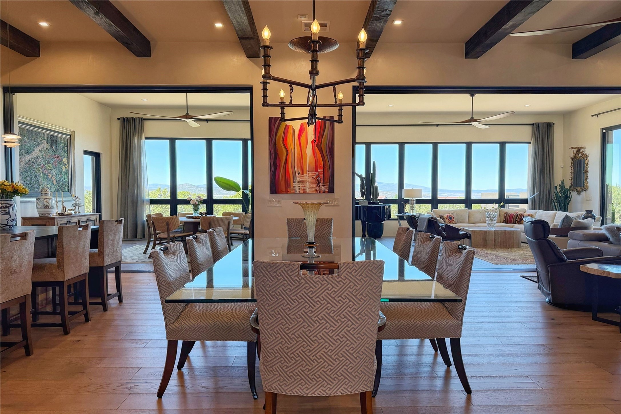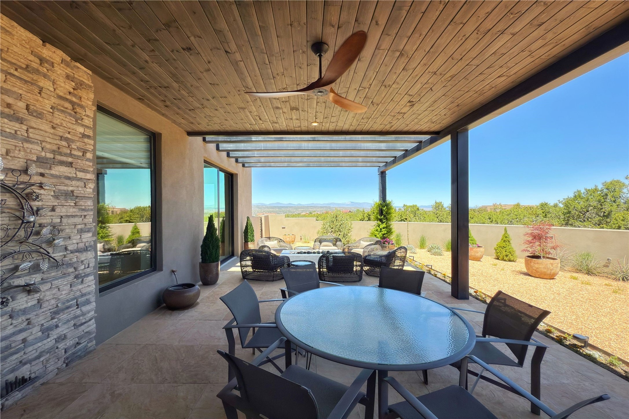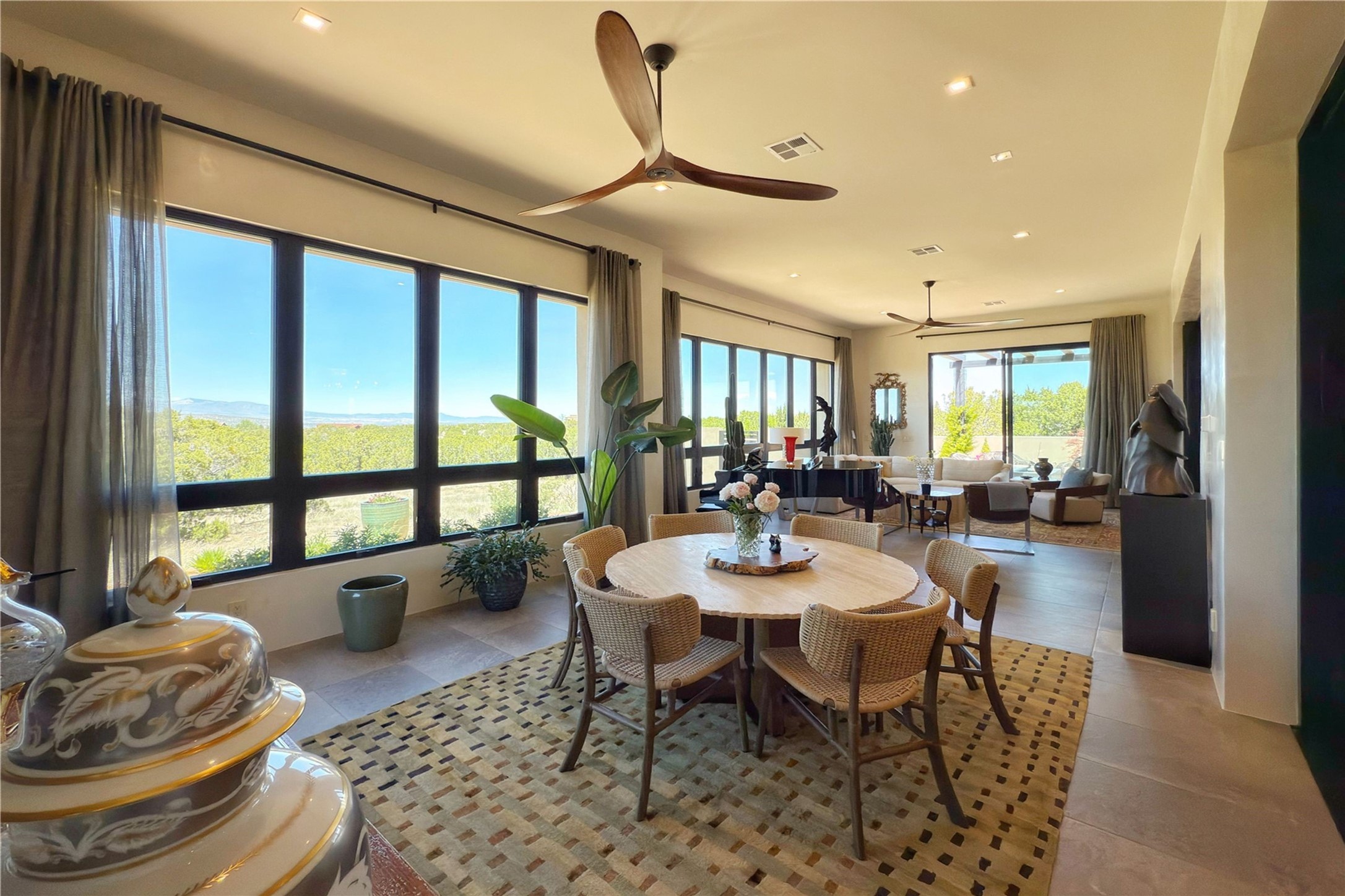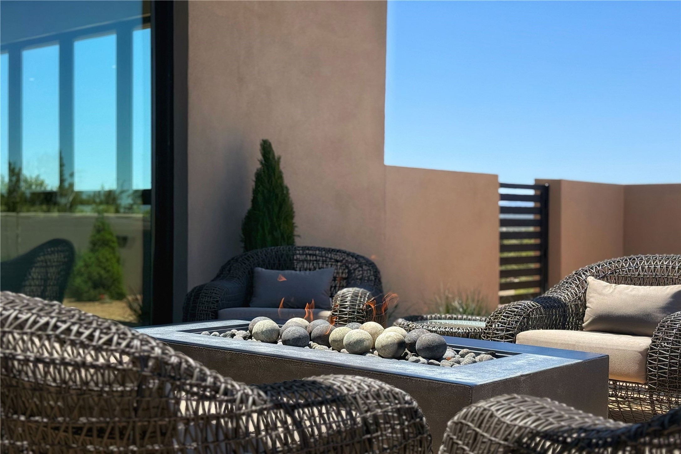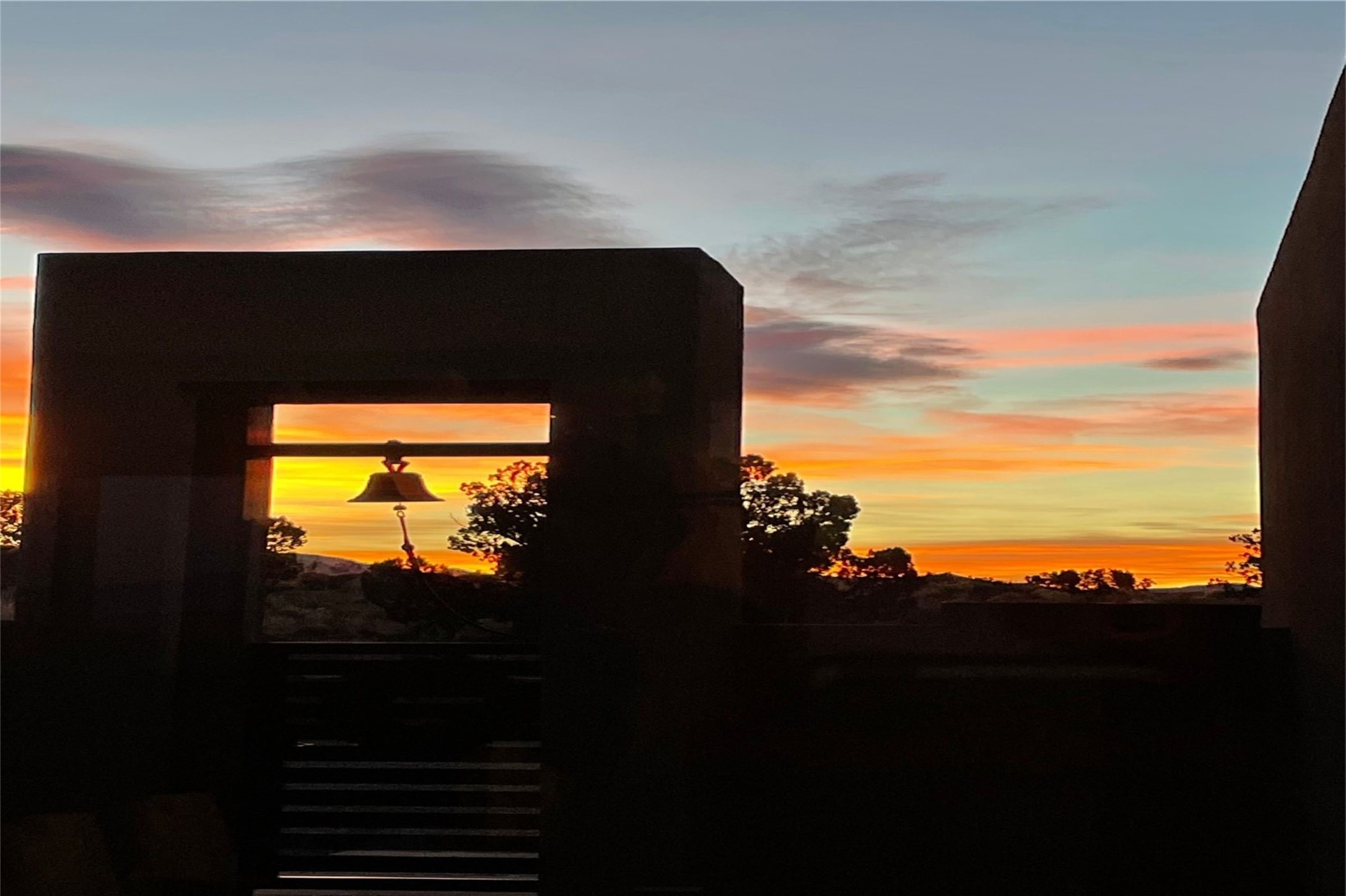 Contemporary Elegance with Designer TouchesA stunning contemporary residence thoughtfully curated celebrates Jemez mountain views and Santa Fe sunsets. This architectural gem offers high-end finishes, designer details, and expansive indoor-outdoor living in desirable Las Campanas.This home welcomes you with a zen-like garden and water feature. Step through the large pivoting wooden door and be greeted by a great room concept with soaring ceilings and abundant natural light. A contemporary glass chandelier adds dramatic flair and elegance.Living room features a floor to ceiling tiled fireplace, and flows seamlessly into the dining, kitchen and giant sunroom- converted from an outdoor portal to create year round living space. The gourmet kitchen is a designer's and chef's dream, featuring a massive island, black quartz counters, top-tier appliances, steam oven and large wine fridge. The butlers pantry makes entertainment a breeze and the walnut cabinetry is exquisite.Relax in a serene primary suite occupying in its own wing with southwest sunlight and a private portal. The primary bath is truly opulent,with quartz countertops, a steam shower with decorative tile and stone, and a deep soaking tub with views. Enjoy his-and-hers closets, and direct access to the laundry room.A guest wing includes an office and two guest suites with California closets, and gorgeous tiled baths.The powder room is a showstopper, with a vintage Venetian glass chandelier.Outdoor living is elevated with two large portals, expertly designed to maximize views, complete with a stone Montana fire pit. Outdoor metal sculptures convey with the property, adding artistic appeal to the serene surroundings.Solar panels and two EV charging plugs in the garage complete the functional ease of living here. This exceptional property also includes first right of refusal on the adjacent lot. Sellers' Las Campanas golf equity membership is available for purchase as well.