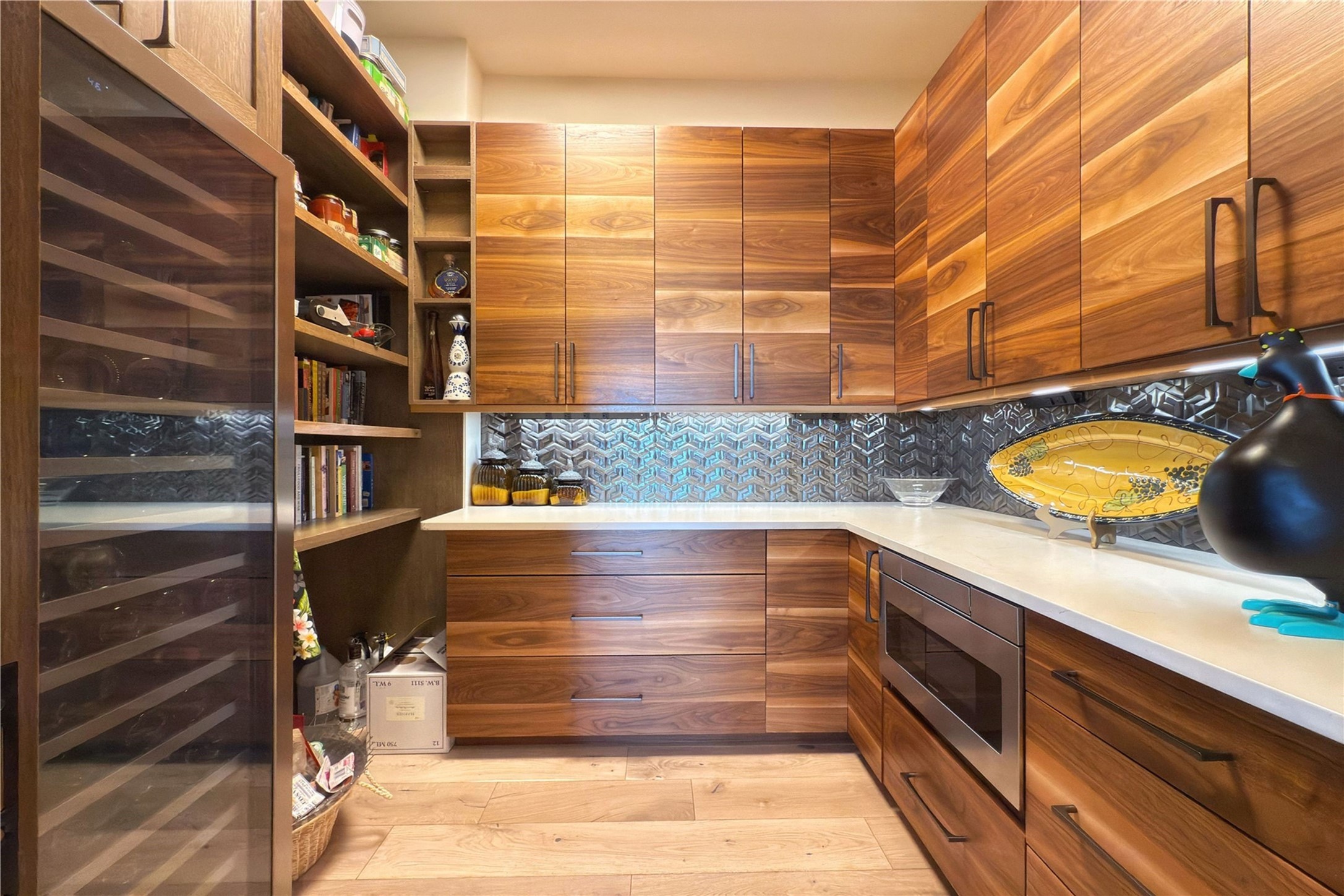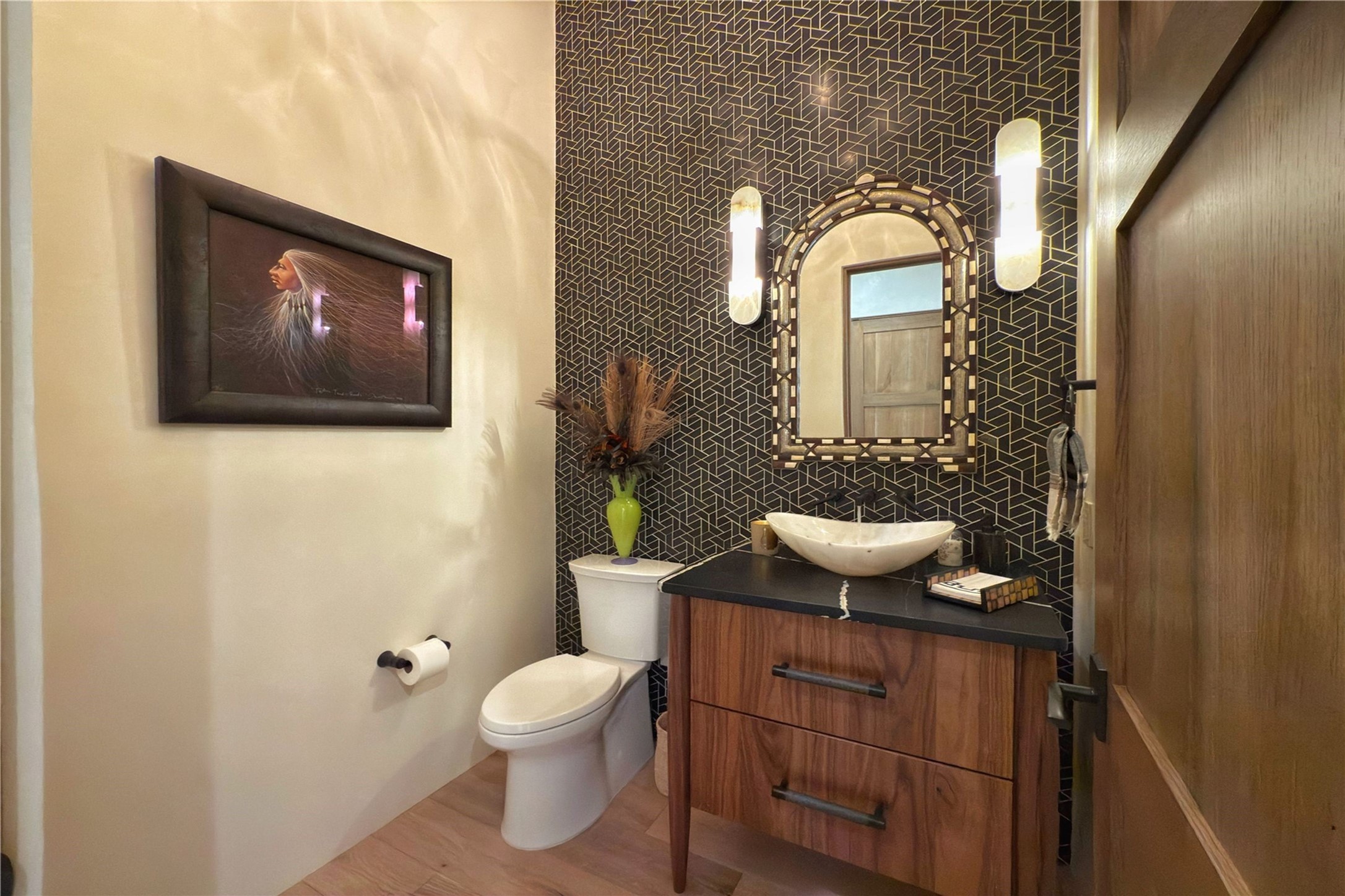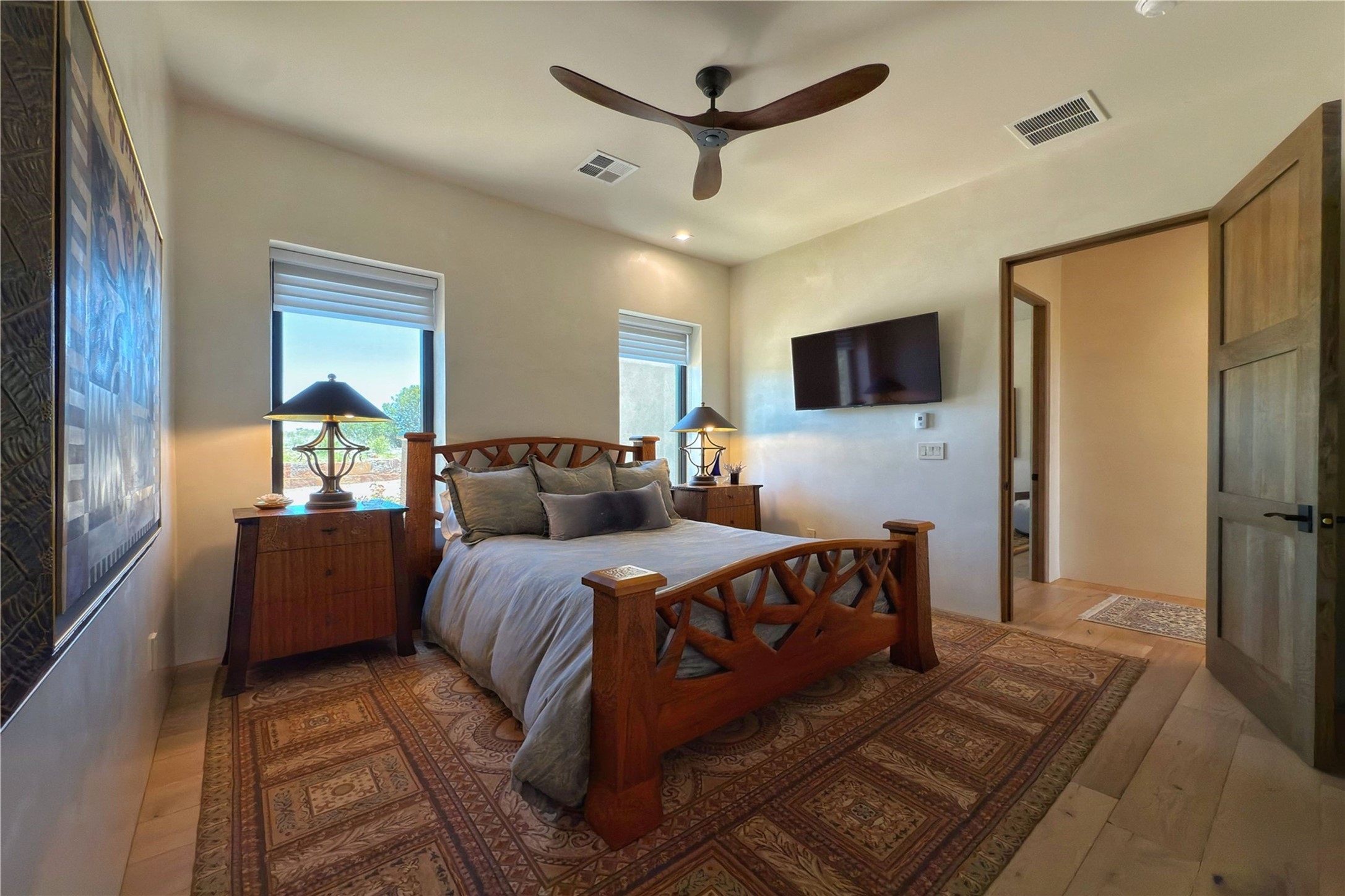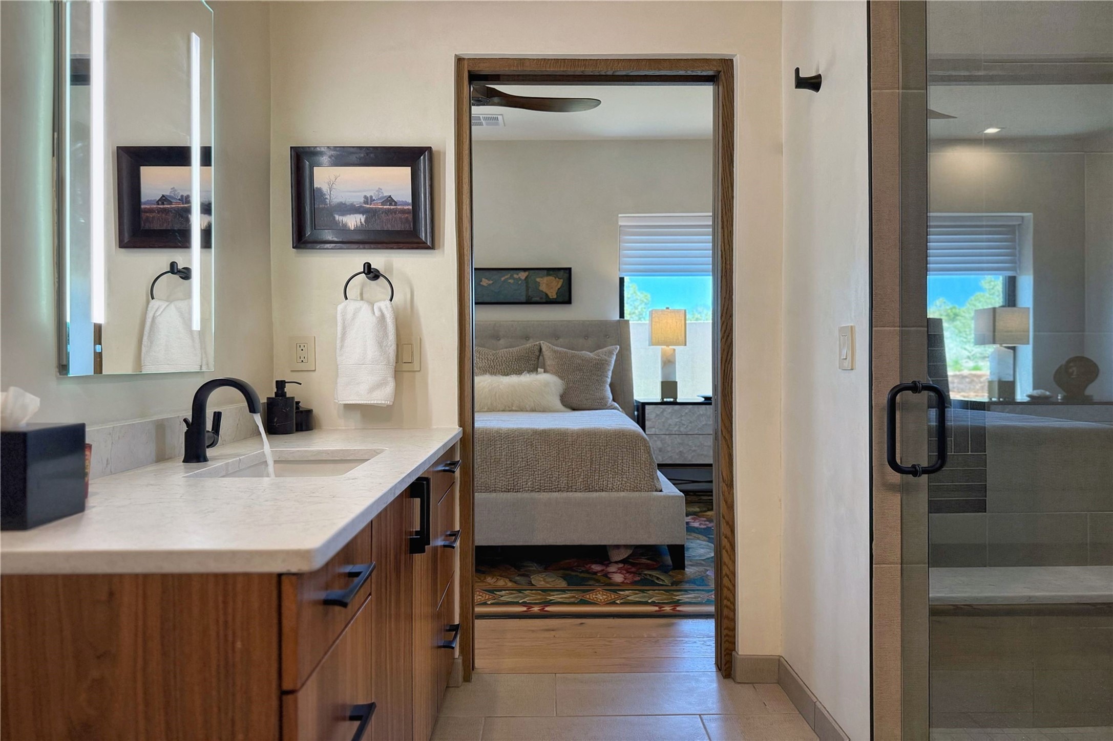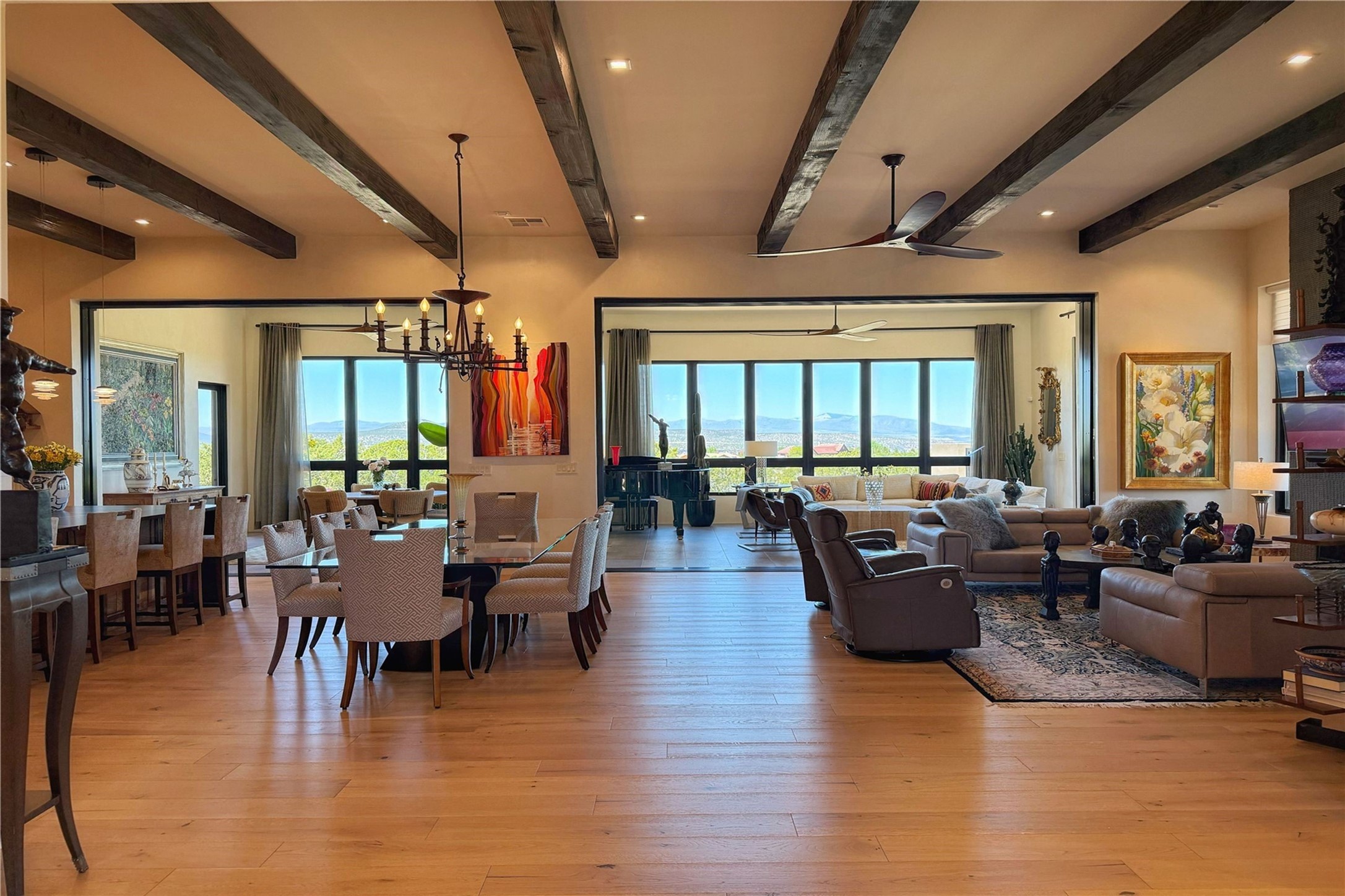 Contemporary Elegance with Designer TouchesA stunning contemporary residence thoughtfully curated celebrates Jemez mountain views and Santa Fe sunsets. This architectural gem offers high-end finishes, designer details, and expansive indoor-outdoor living in desirable Las Campanas.This home welcomes you with a zen-like garden and water feature. Step through the large pivoting wooden door and be greeted by a great room concept with soaring ceilings and abundant natural light. A contemporary glass chandelier adds dramatic flair and elegance.Living room features a floor to ceiling tiled fireplace, and flows seamlessly into the dining, kitchen and giant sunroom- converted from an outdoor portal to create year round living space. The gourmet kitchen is a designer's and chef's dream, featuring a massive island, black quartz counters, top-tier appliances, steam oven and large wine fridge. The butlers pantry makes entertainment a breeze and the walnut cabinetry is exquisite.Relax in a serene primary suite occupying in its own wing with southwest sunlight and a private portal. The primary bath is truly opulent,with quartz countertops, a steam shower with decorative tile and stone, and a deep soaking tub with views. Enjoy his-and-hers closets, and direct access to the laundry room.A guest wing includes an office and two guest suites with California closets, and gorgeous tiled baths.The powder room is a showstopper, with a vintage Venetian glass chandelier.Outdoor living is elevated with two large portals, expertly designed to maximize views, complete with a stone Montana fire pit. Outdoor metal sculptures convey with the property, adding artistic appeal to the serene surroundings.Solar panels and two EV charging plugs in the garage complete the functional ease of living here. This exceptional property also includes first right of refusal on the adjacent lot. Sellers' Las Campanas golf equity membership is available for purchase as well.