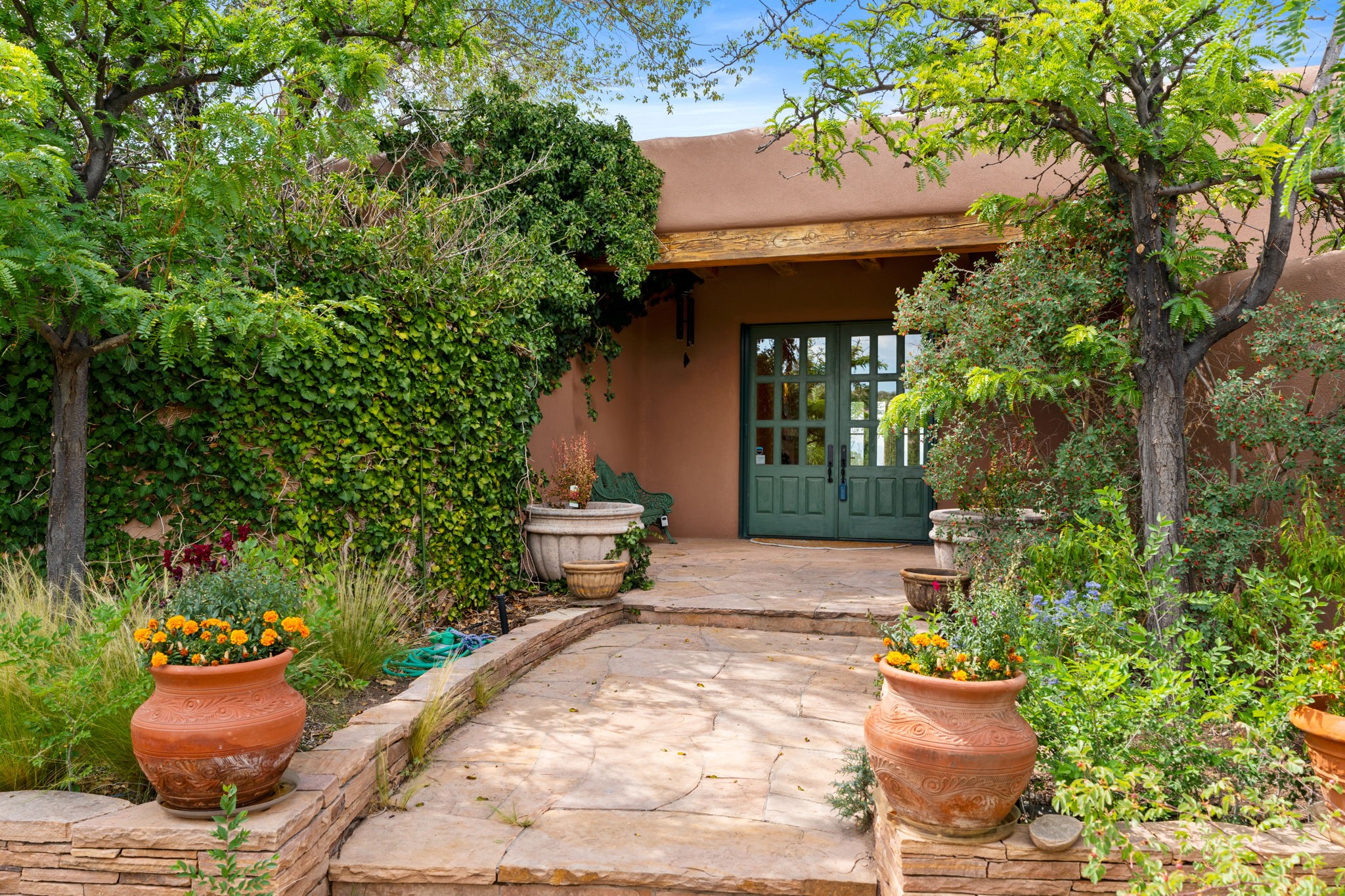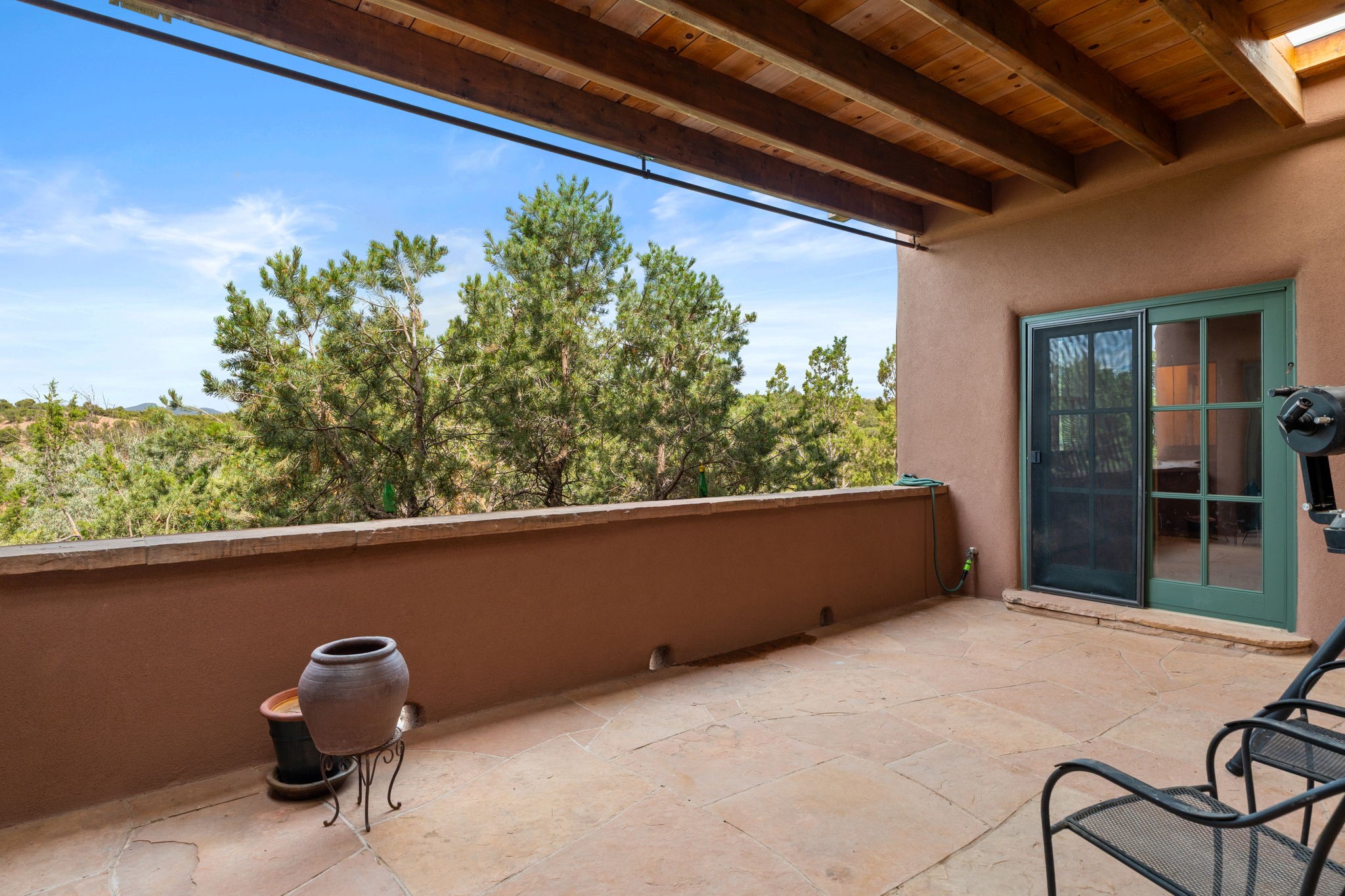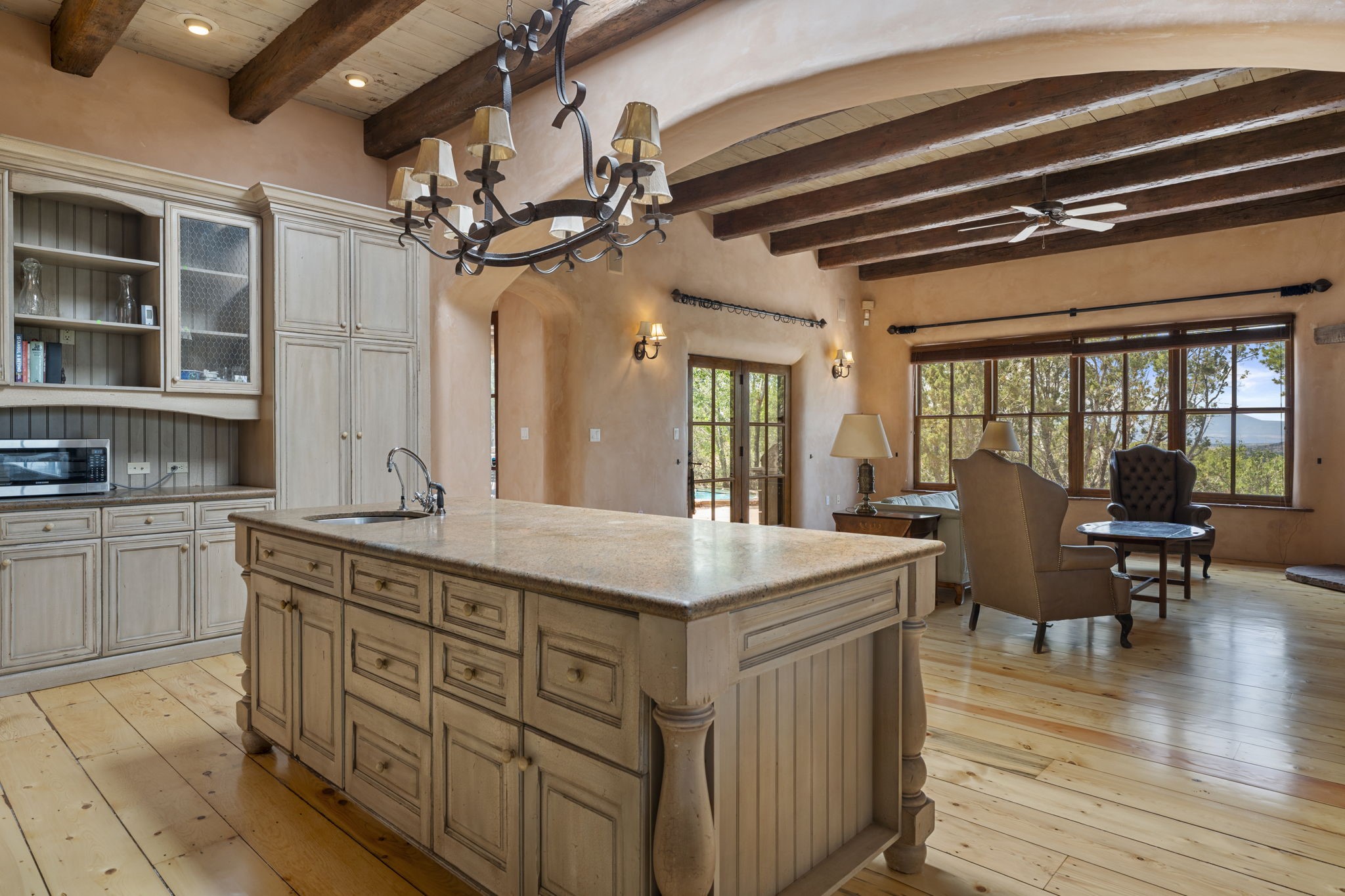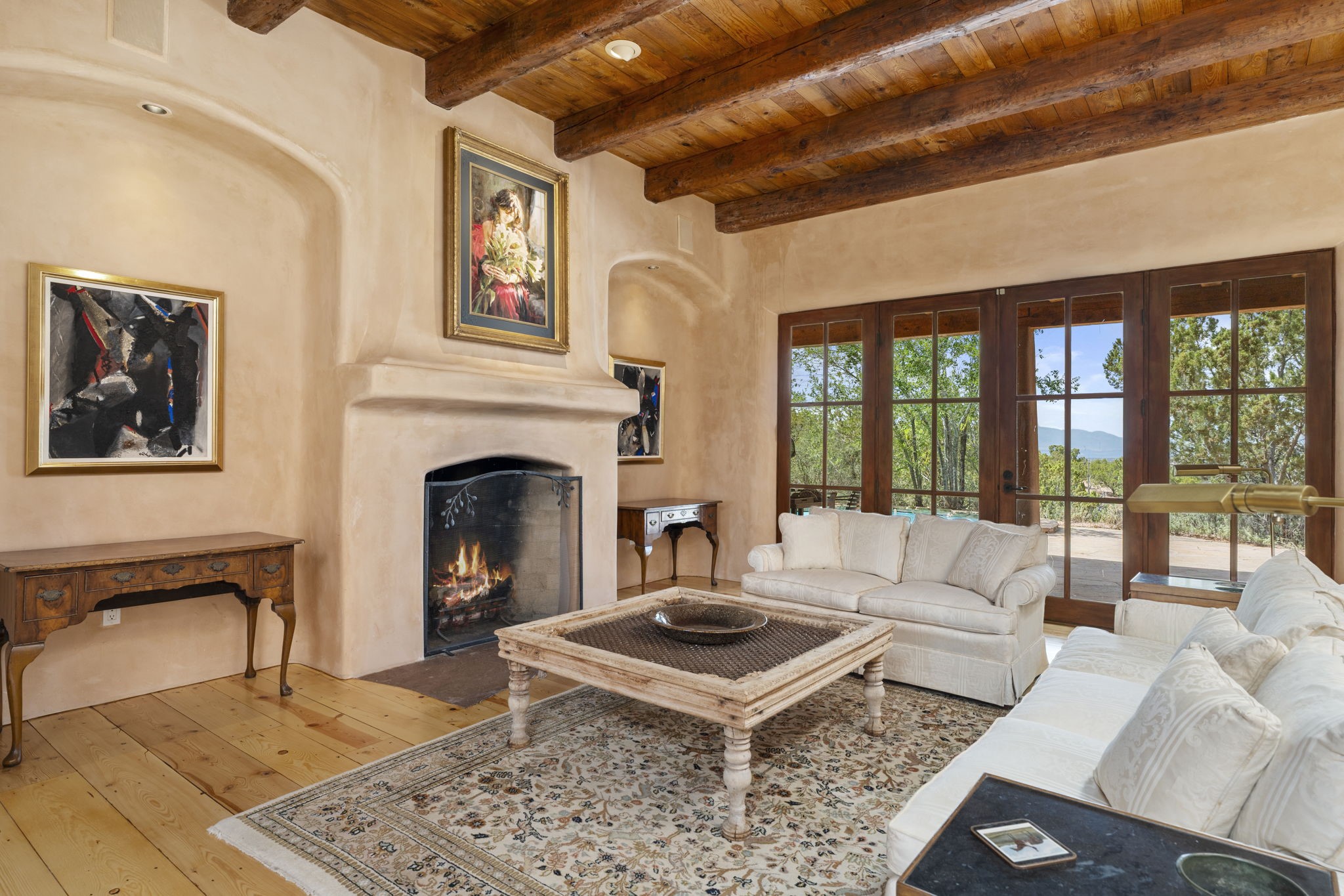 What kind of story are you ready for?? Santa Fe style meets European Country Estate! This 4 bedroom, 4 bathroom, high-quality Rastra construction features soaring ceilings, hand carved vigas, and far-reaching mountain views. Walking into the grand entrance, you are greeted by voluminous curved walls, golden-soft natural light, wide-plank pine floors, and a stately fireplace, which set the stage for an elegant Santa Fe lifestyle. The open concept French country kitchen faces a spacious den with views framed by large picture windows, and features an oversized island topped with granite. There is plenty of counter space for cooking and for entertaining guests. High-end appliances include a large Sub-Zero refrigerator, a six-burner Viking range, and a Bosch dishwasher. Additionally, this home's temperature-controlled wine cave accommodates 1500-2000 bottles for the serious aficionado. Relax in front of one of five fireplaces, and enjoy a large, formal dining room with views that will sweep guests off their feet! Or, linger over a morning cup of coffee on the grand portal overlooking the koi pond and the Jemez mountains. The lavish primary suite is on the main level and will have you living in luxury with a large deep, soaking tub, a private cedar-lined sauna, and a steam shower. There are several rooms downstairs (including a bathroom) which could be used as a mother-in-law suite, offices, or an artist studio. Complete with a TPO roof, an oversized two-car garage, and beautiful landscaping on drip irrigation, this is a timeless space you'll never want to leave. Rastra construction and owned solar panels create an extremely energy efficient environment, with almost non-existent electric bills. New stucco was done in 2025. Enjoy proximity to the club at Las Campanas, but without the high HOA fees. Don't miss this chance to live your dream Santa Fe lifestyle!