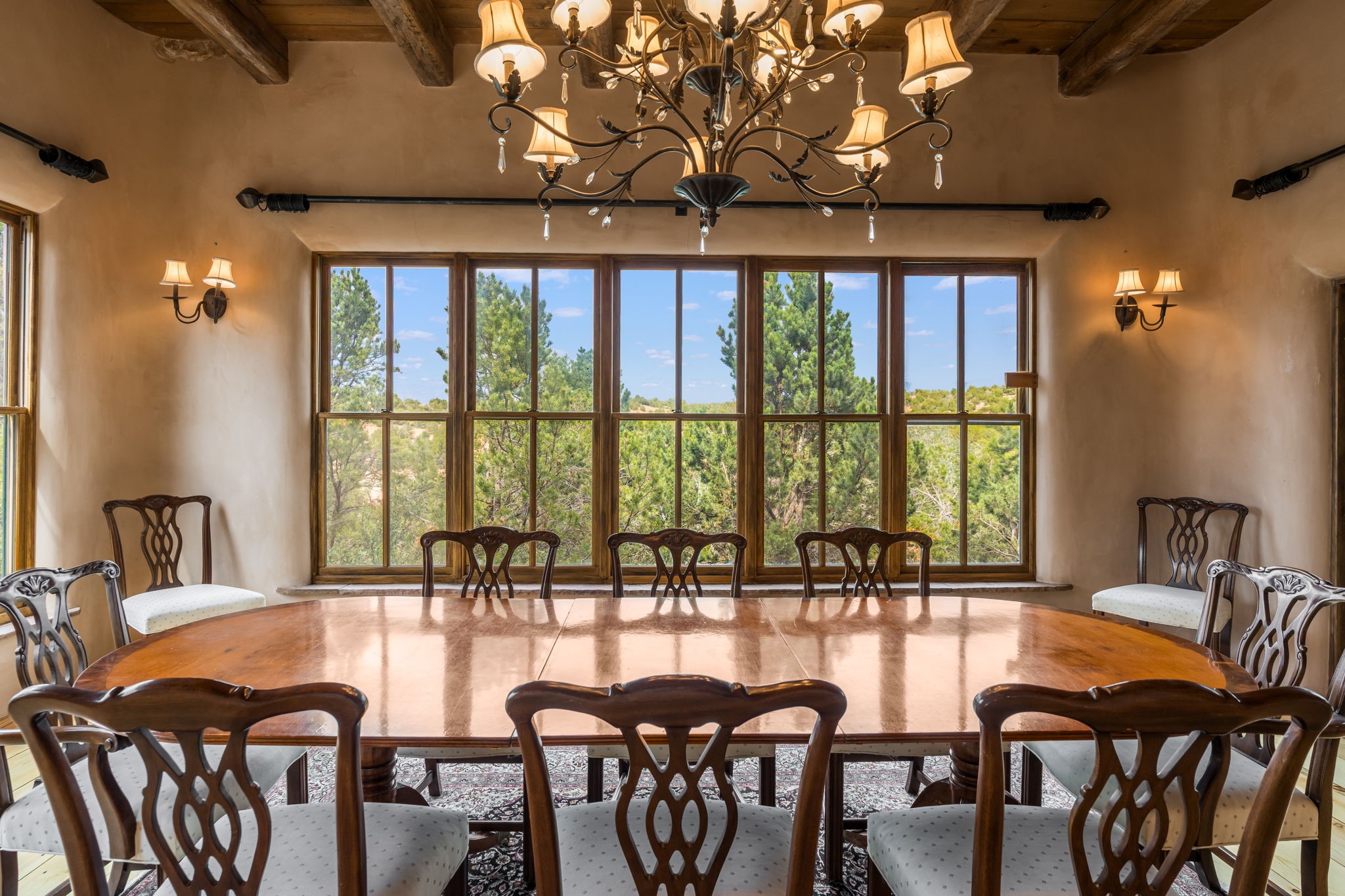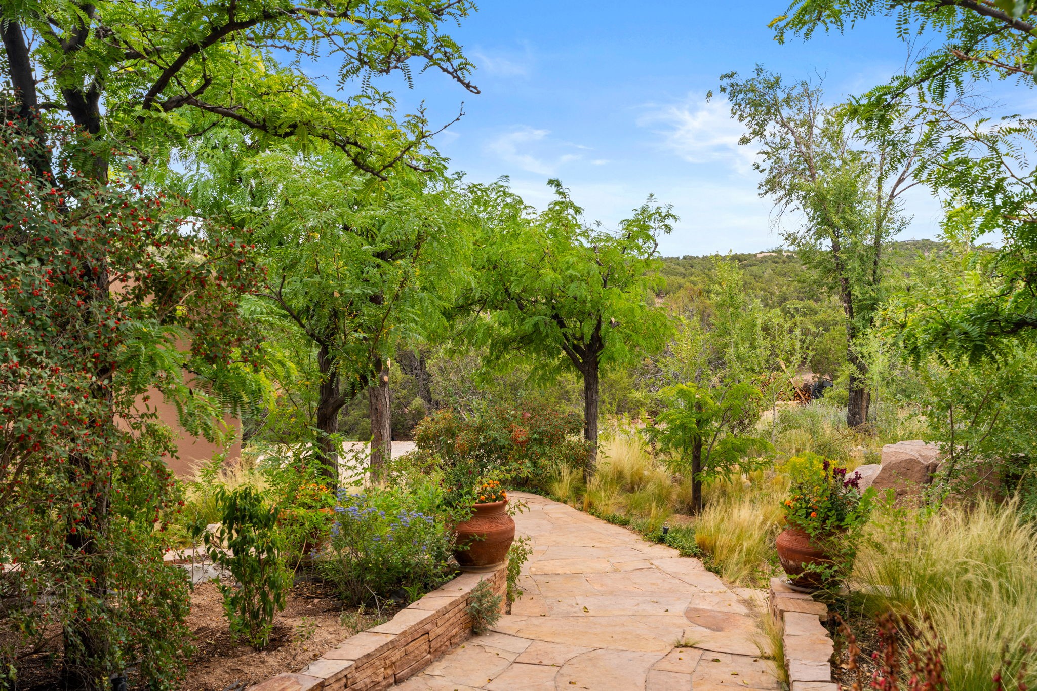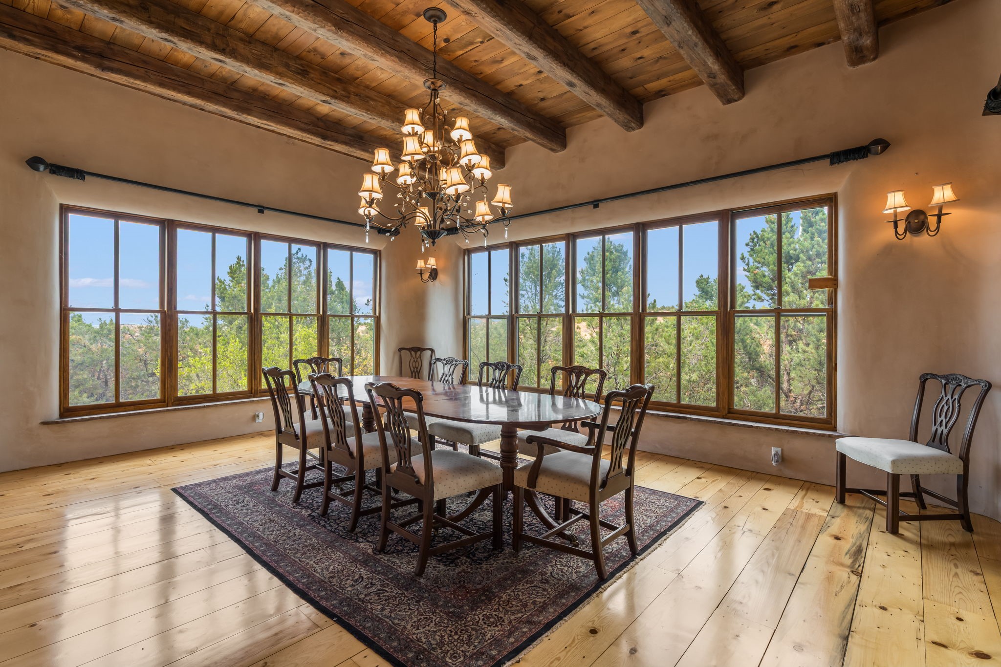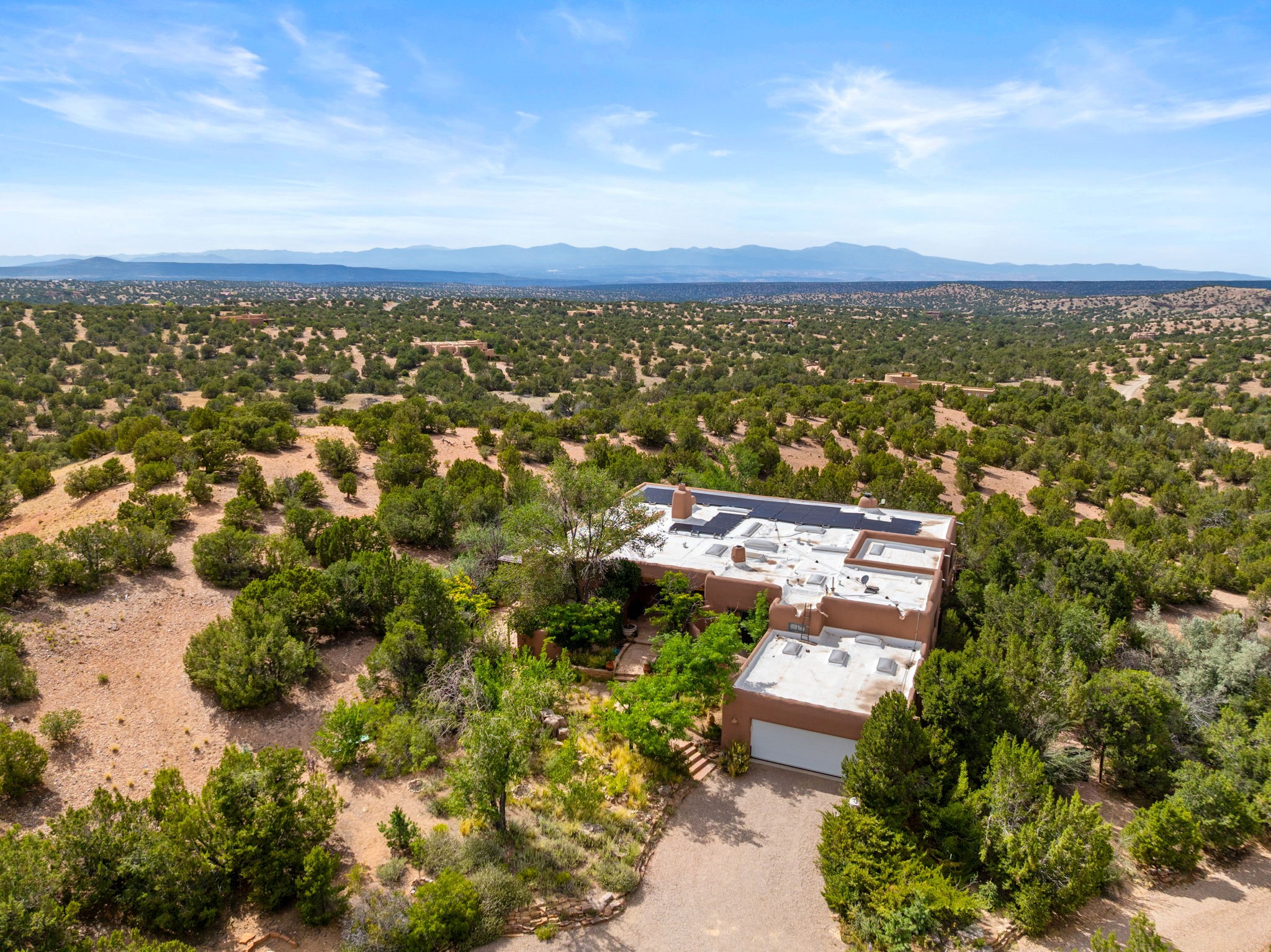 What kind of story are you ready for?? Santa Fe style meets European Country Estate! This 4 bedroom, 4 bathroom, high-quality Rastra construction features soaring ceilings, hand carved vigas, and far-reaching mountain views. Walking into the grand entrance, you are greeted by voluminous curved walls, golden-soft natural light, wide-plank pine floors, and a stately fireplace, which set the stage for an elegant Santa Fe lifestyle. The open concept French country kitchen faces a spacious den with views framed by large picture windows, and features an oversized island topped with granite. There is plenty of counter space for cooking and for entertaining guests. High-end appliances include a large Sub-Zero refrigerator, a six-burner Viking range, and a Bosch dishwasher. Additionally, this home's temperature-controlled wine cave accommodates 1500-2000 bottles for the serious aficionado. Relax in front of one of five fireplaces, and enjoy a large, formal dining room with views that will sweep guests off their feet! Or, linger over a morning cup of coffee on the grand portal overlooking the koi pond and the Jemez mountains. The lavish primary suite is on the main level and will have you living in luxury with a large deep, soaking tub, a private cedar-lined sauna, and a steam shower. There are several rooms downstairs (including a bathroom) which could be used as a mother-in-law suite, offices, or an artist studio. Complete with a TPO roof, an oversized two-car garage, and beautiful landscaping on drip irrigation, this is a timeless space you'll never want to leave. Rastra construction and owned solar panels create an extremely energy efficient environment, with almost non-existent electric bills. New stucco was done in 2025. Enjoy proximity to the club at Las Campanas, but without the high HOA fees. Don't miss this chance to live your dream Santa Fe lifestyle!