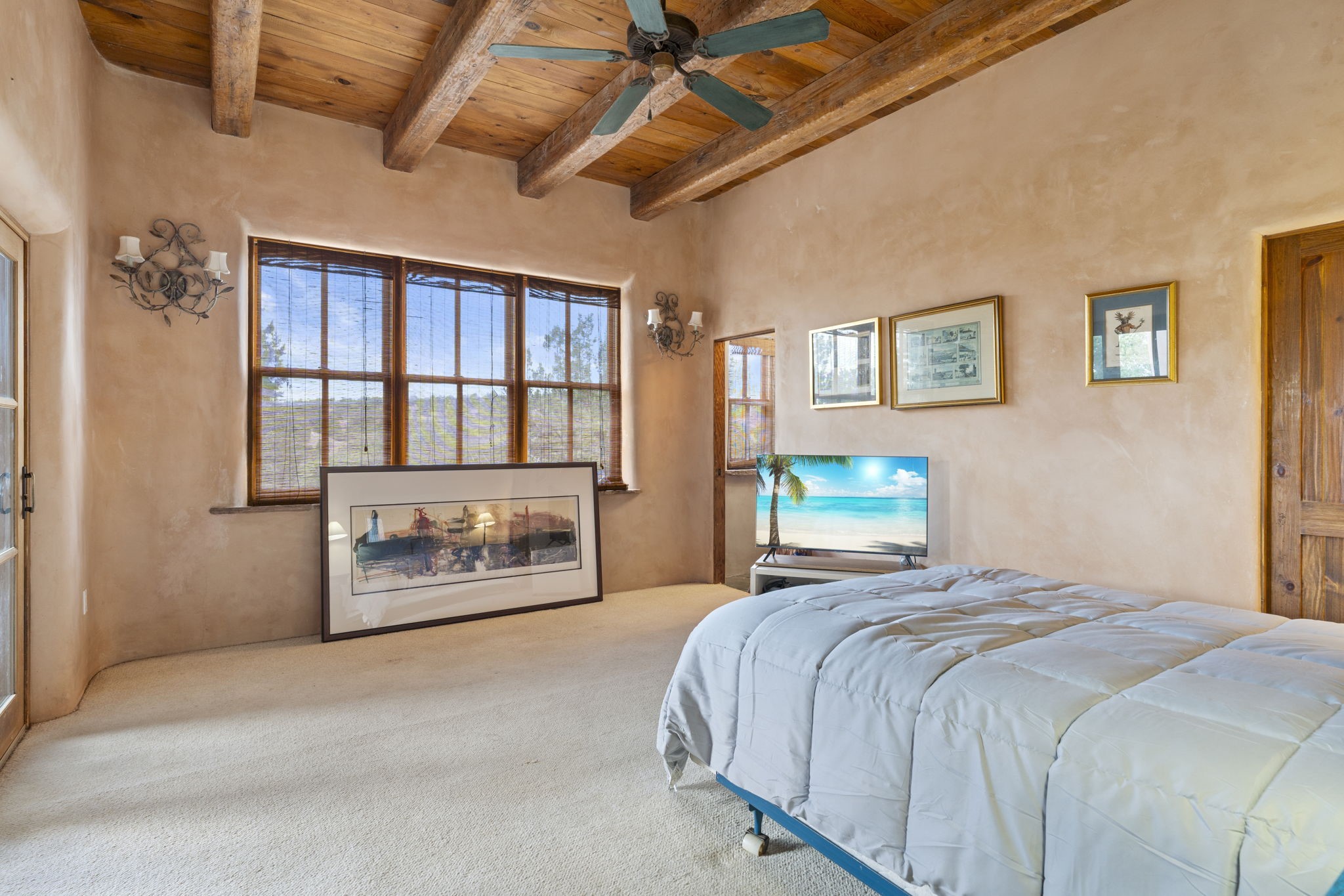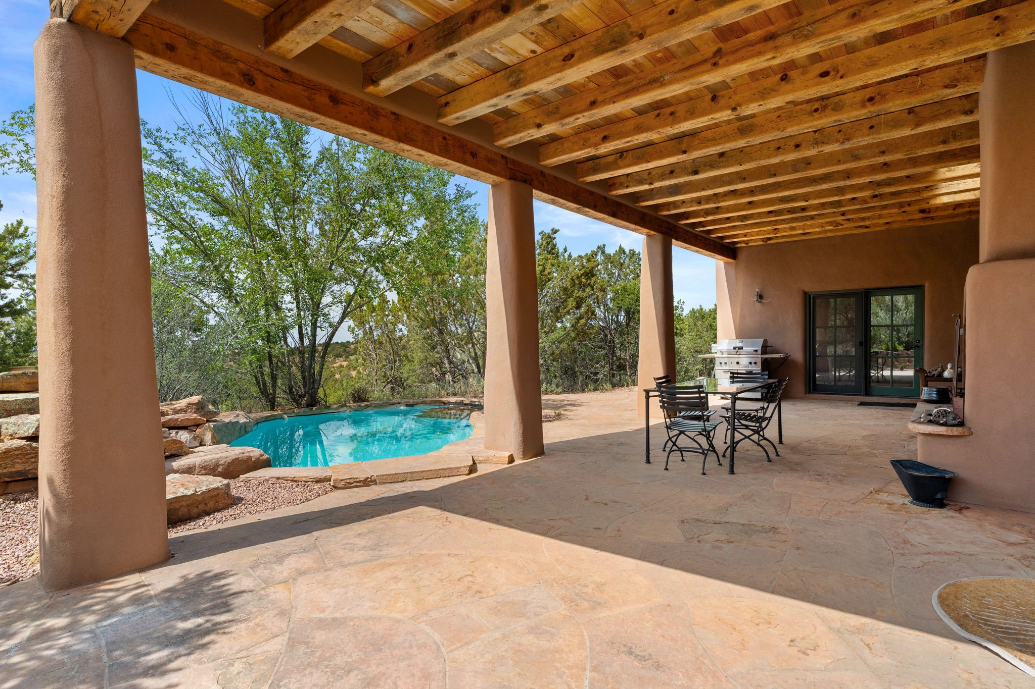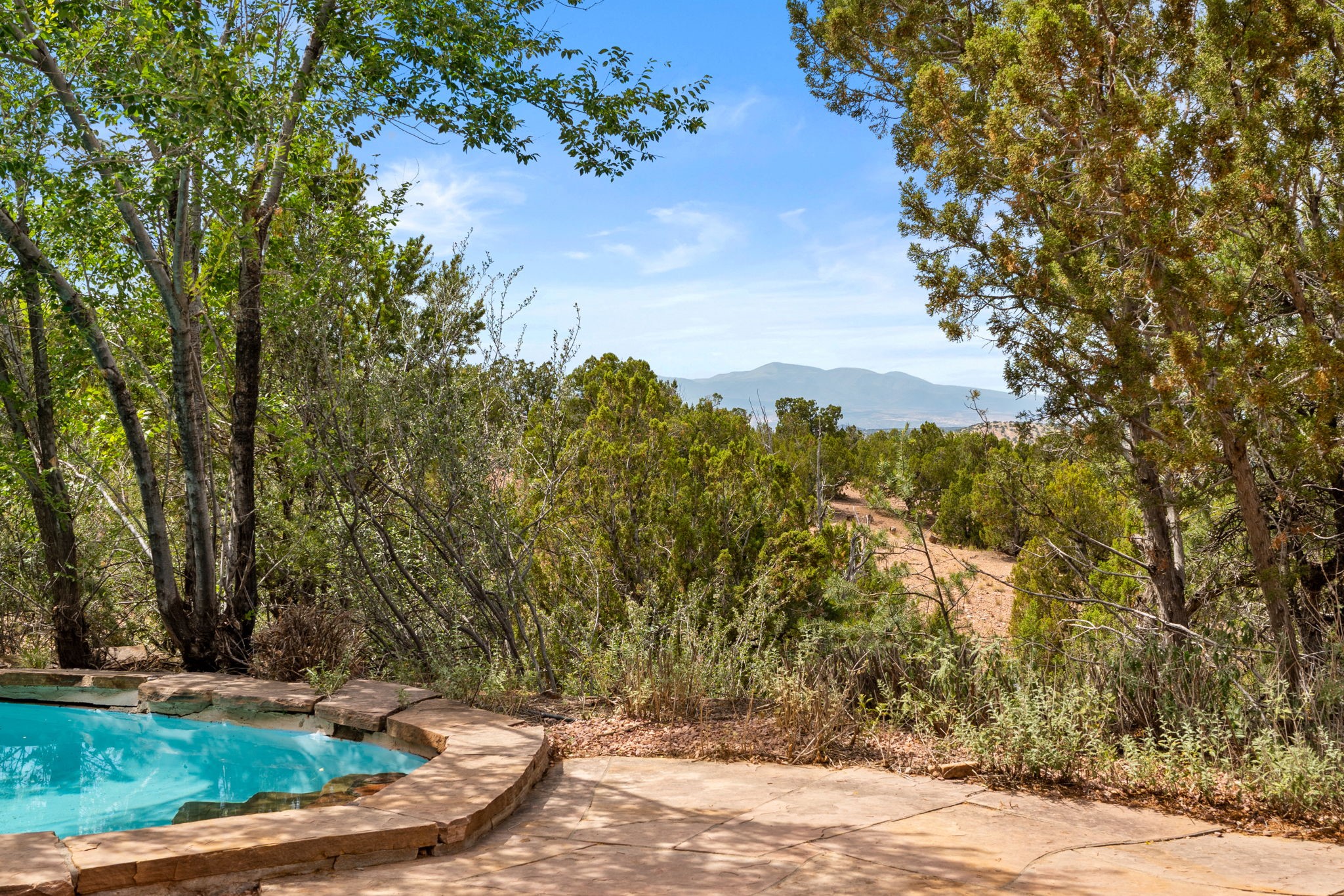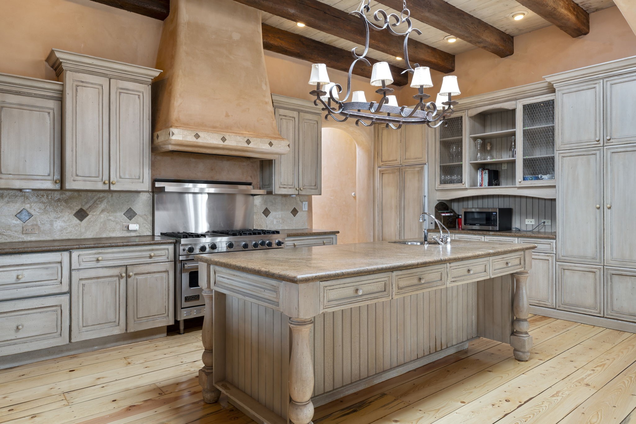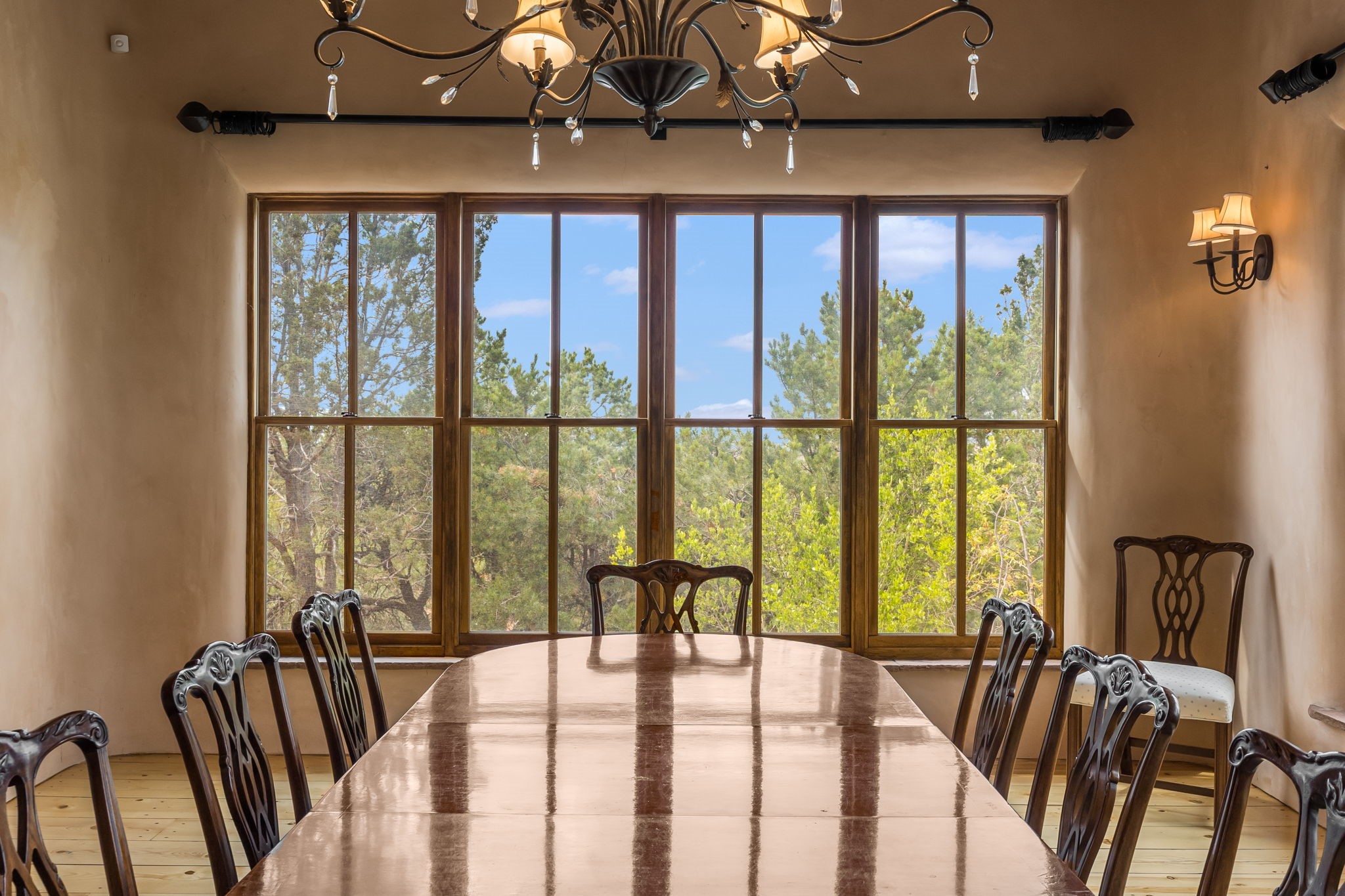 What kind of story are you ready for?? Santa Fe style meets European Country Estate! This 4 bedroom, 4 bathroom, high-quality Rastra construction features soaring ceilings, hand carved vigas, and far-reaching mountain views. Walking into the grand entrance, you are greeted by voluminous curved walls, golden-soft natural light, wide-plank pine floors, and a stately fireplace, which set the stage for an elegant Santa Fe lifestyle. The open concept French country kitchen faces a spacious den with views framed by large picture windows, and features an oversized island topped with granite. There is plenty of counter space for cooking and for entertaining guests. High-end appliances include a large Sub-Zero refrigerator, a six-burner Viking range, and a Bosch dishwasher. Additionally, this home's temperature-controlled wine cave accommodates 1500-2000 bottles for the serious aficionado. Relax in front of one of five fireplaces, and enjoy a large, formal dining room with views that will sweep guests off their feet! Or, linger over a morning cup of coffee on the grand portal overlooking the koi pond and the Jemez mountains. The lavish primary suite is on the main level and will have you living in luxury with a large deep, soaking tub, a private cedar-lined sauna, and a steam shower. There are several rooms downstairs (including a bathroom) which could be used as a mother-in-law suite, offices, or an artist studio. Complete with a TPO roof, an oversized two-car garage, and beautiful landscaping on drip irrigation, this is a timeless space you'll never want to leave. Rastra construction and owned solar panels create an extremely energy efficient environment, with almost non-existent electric bills. New stucco was done in 2025. Enjoy proximity to the club at Las Campanas, but without the high HOA fees. Don't miss this chance to live your dream Santa Fe lifestyle!