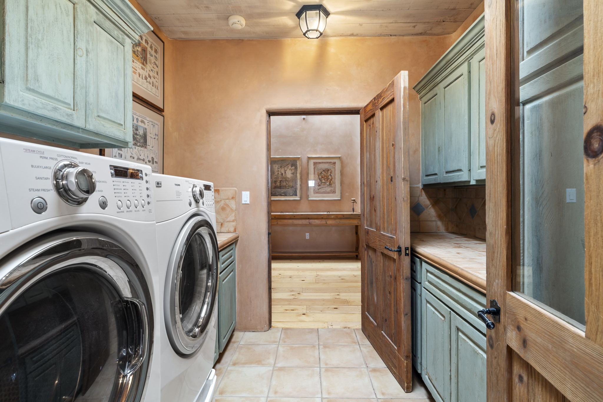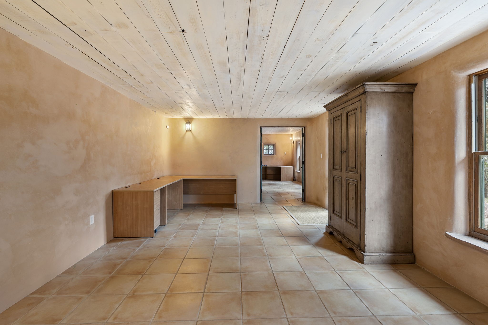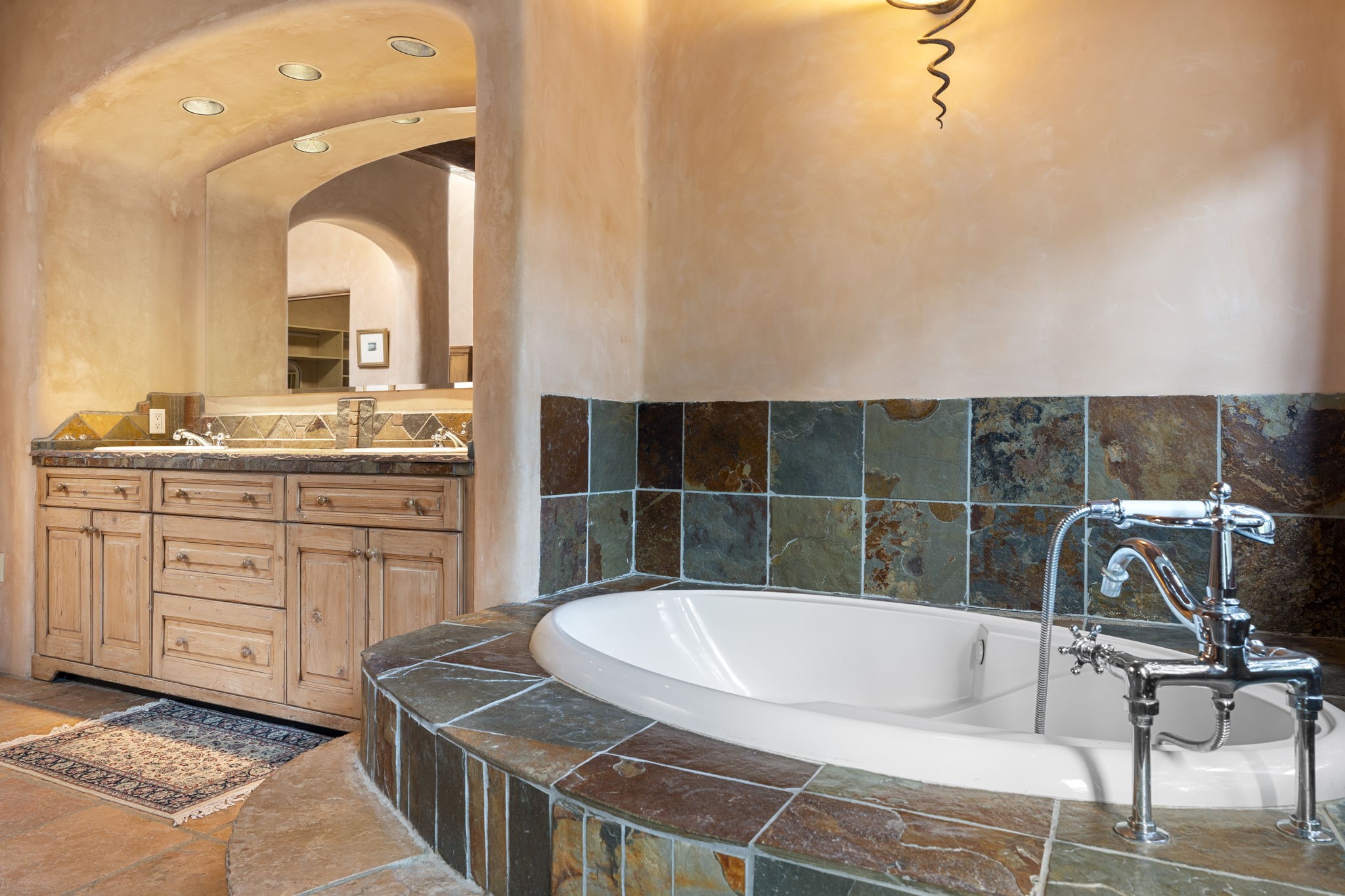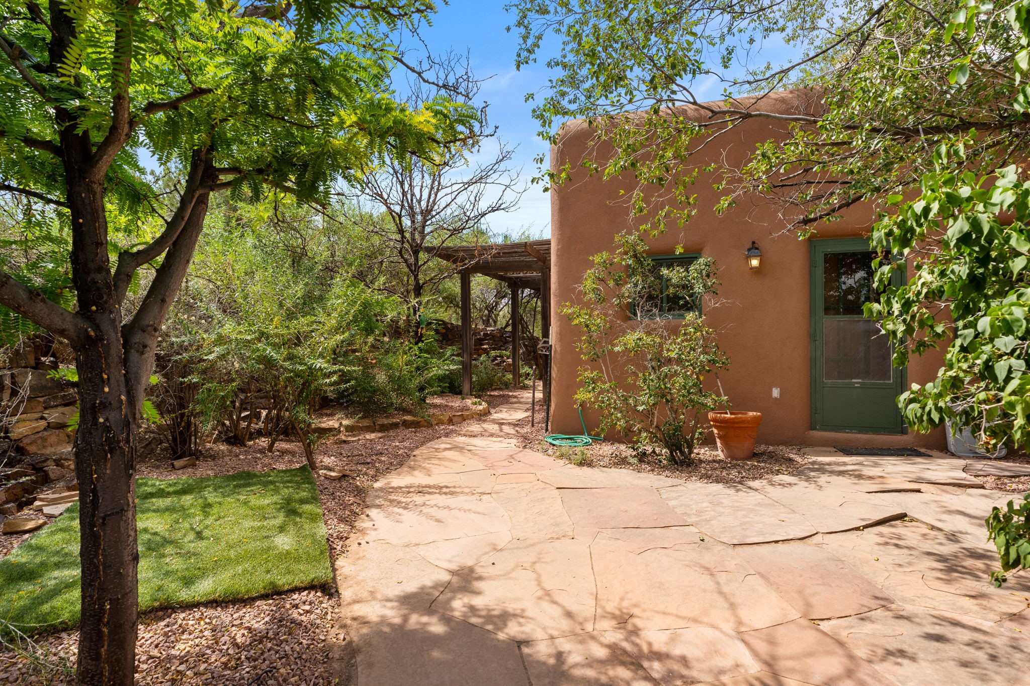 What kind of story are you ready for?? Santa Fe style meets European Country Estate! This 4 bedroom, 4 bathroom, high-quality Rastra construction features soaring ceilings, hand carved vigas, and far-reaching mountain views. Walking into the grand entrance, you are greeted by voluminous curved walls, golden-soft natural light, wide-plank pine floors, and a stately fireplace, which set the stage for an elegant Santa Fe lifestyle. The open concept French country kitchen faces a spacious den with views framed by large picture windows, and features an oversized island topped with granite. There is plenty of counter space for cooking and for entertaining guests. High-end appliances include a large Sub-Zero refrigerator, a six-burner Viking range, and a Bosch dishwasher. Additionally, this home's temperature-controlled wine cave accommodates 1500-2000 bottles for the serious aficionado. Relax in front of one of five fireplaces, and enjoy a large, formal dining room with views that will sweep guests off their feet! Or, linger over a morning cup of coffee on the grand portal overlooking the koi pond and the Jemez mountains. The lavish primary suite is on the main level and will have you living in luxury with a large deep, soaking tub, a private cedar-lined sauna, and a steam shower. There are several rooms downstairs (including a bathroom) which could be used as a mother-in-law suite, offices, or an artist studio. Complete with a TPO roof, an oversized two-car garage, and beautiful landscaping on drip irrigation, this is a timeless space you'll never want to leave. Rastra construction and owned solar panels create an extremely energy efficient environment, with almost non-existent electric bills. New stucco was done in 2025. Enjoy proximity to the club at Las Campanas, but without the high HOA fees. Don't miss this chance to live your dream Santa Fe lifestyle!