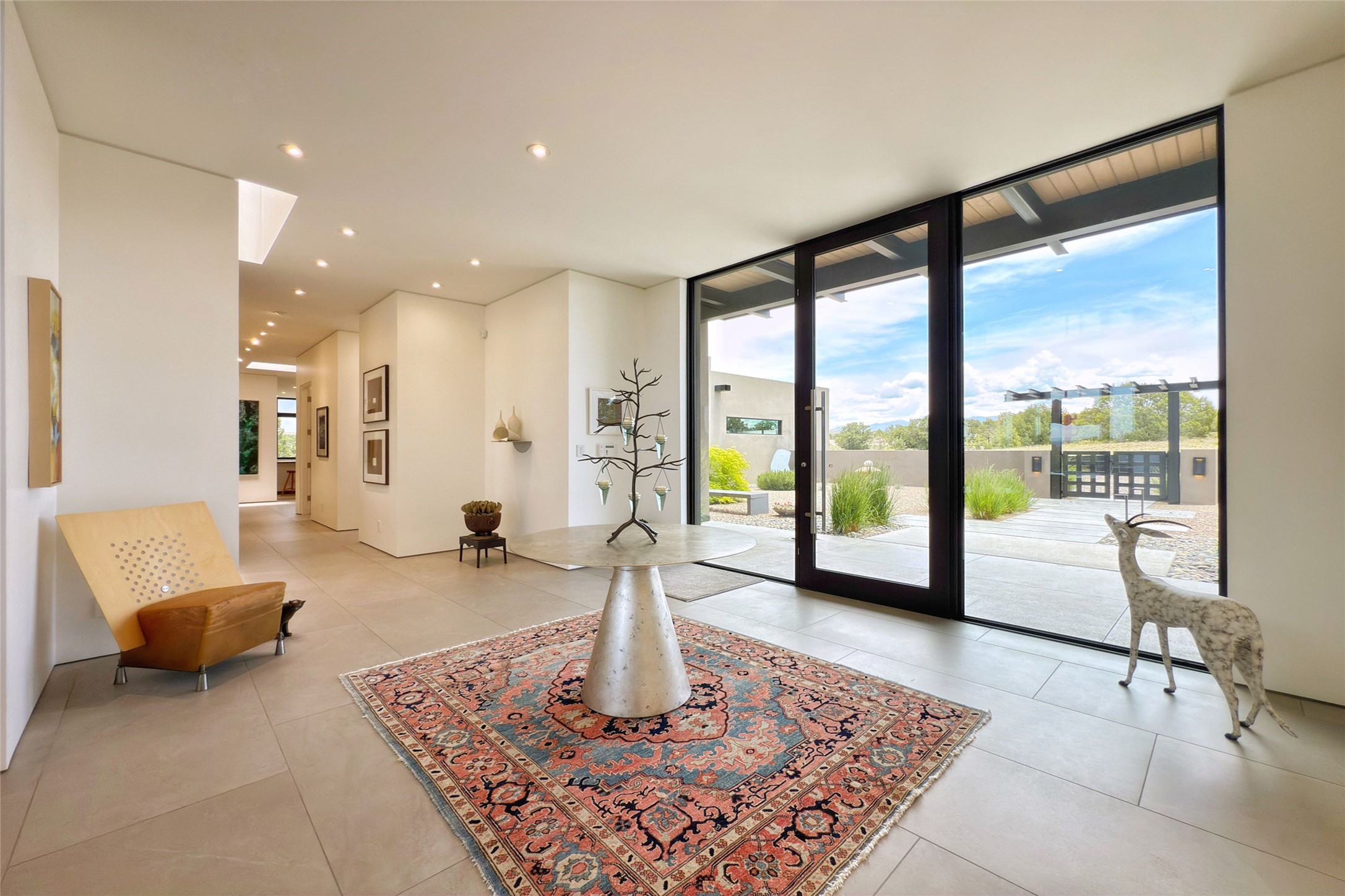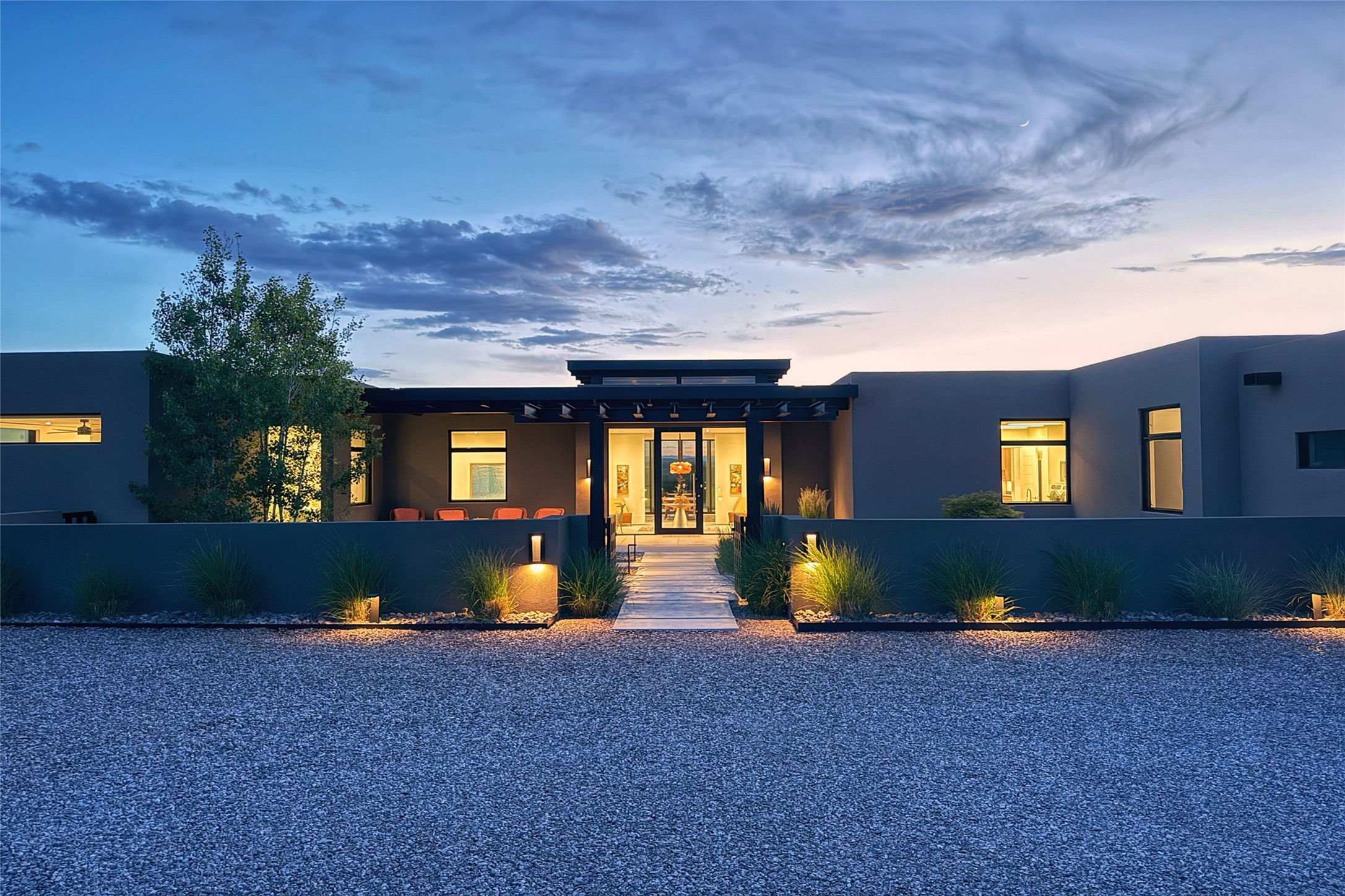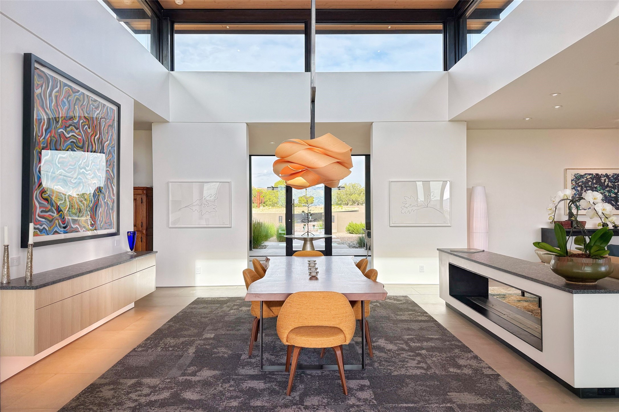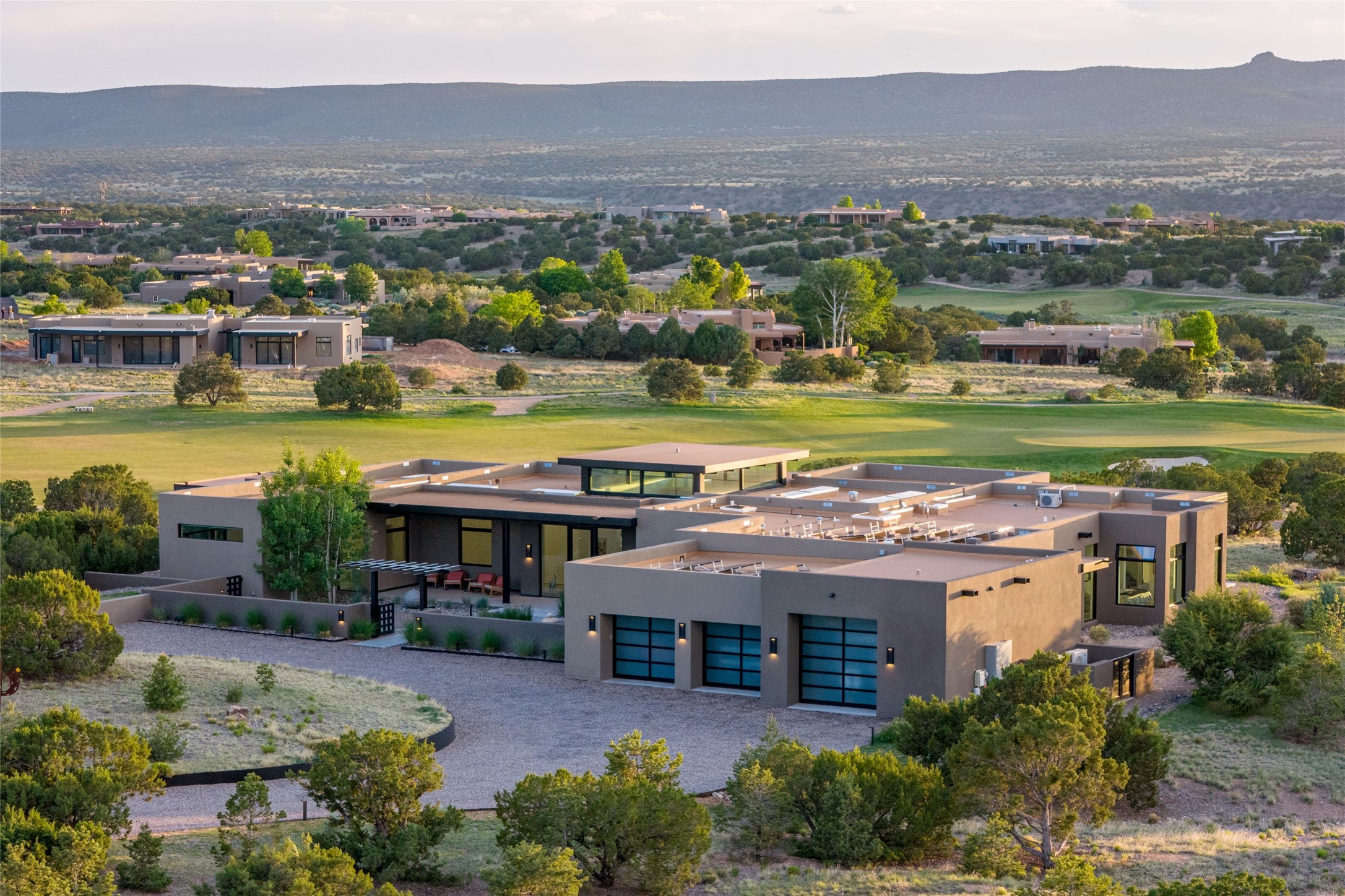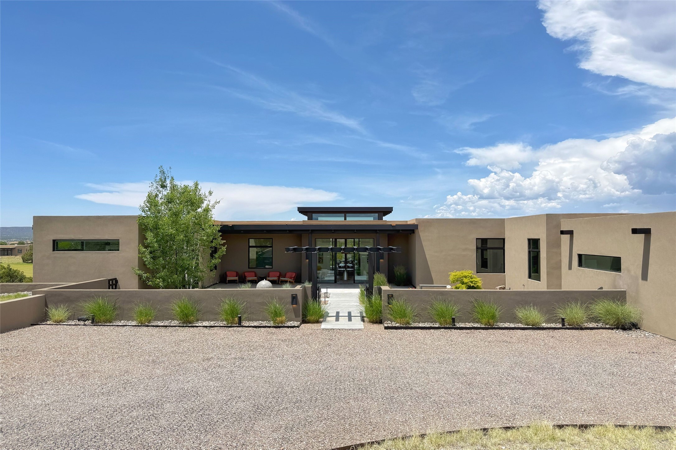 Wall Street Journal House of the Week featured 7/11/25. Artful design meets exceptional functionality in this striking contemporary estate, brilliantly conceived by renowned architect Lorn Tryk, and built by Prull Custom Builders. Resting on 4 acres, this home is a rare synthesis of modern form and high-performance living. A peaceful water feature welcomes you where a snow-melt walkway leads to a dramatic glass entry and gallery-style hall--perfect for displaying fine art. Inside, Tryk's "floating" walls, vanities, and cabinetry create a fabulous play of light and shadow. The dining room stuns with 17-foot clerestory ceilings, 72-inch EcoSmart fireplace, and floor-to-ceiling glass sliders opening to a heated portal, with in-ground hot tub, wood burning fireplace, and views of the Jemez and golf course. The chef's kitchen is built to entertain. A wraparound layout conceals a butler's pantry, while leathered granite counters, rift white oak cabinetry, steam and convection ovens, Sub-Zero wine storage, and a Grohe Blue seltzer system offer top-tier culinary tools. The primary suite is a sanctuary, complete with Ecosmart fireplace, in-suite gym, and a spa-style bath with walk-through triple-head shower. The guest wing includes two en-suites and a sitting area leads to a covered portal. For work and creativity, the home offers two distinct offices. One includes cabinetry with walnut countertops and a spacious craft table, while the other features skylights and massive storage for art supplies. This space could easily be converted into a fourth bedroom with bath. Smart home features include radiant in-floor heating and cooling and concealed media in the living room with sliding art panels to hide the TV. An integrated audiophile sound system by Linn operates in five locations. The three-car garage includes a dedicated RV bay and 50 amp EV charger. A truly distinctive property--thoughtfully designed, rich in detail, and purposefully built for elegant living and entertaining.
