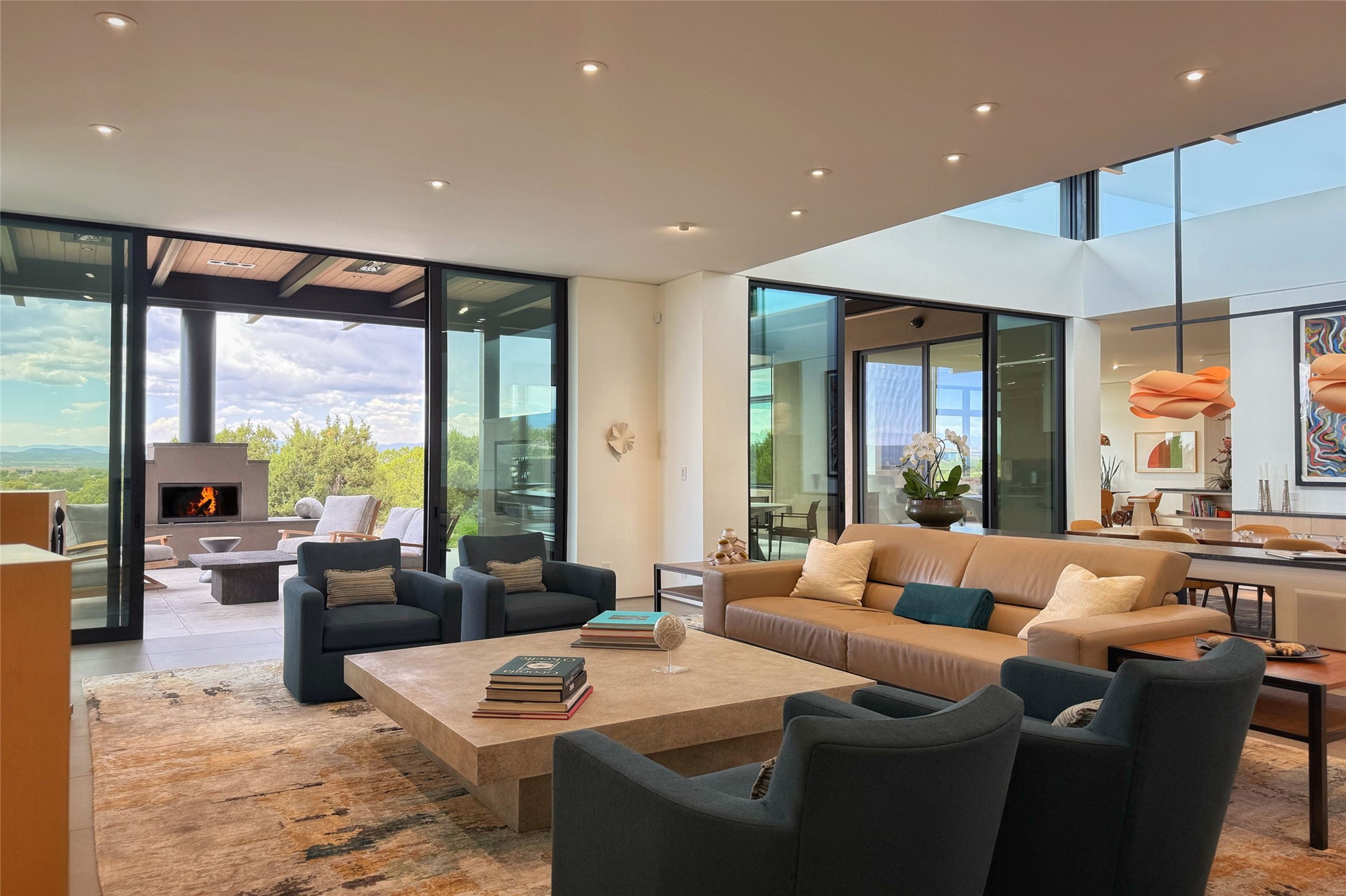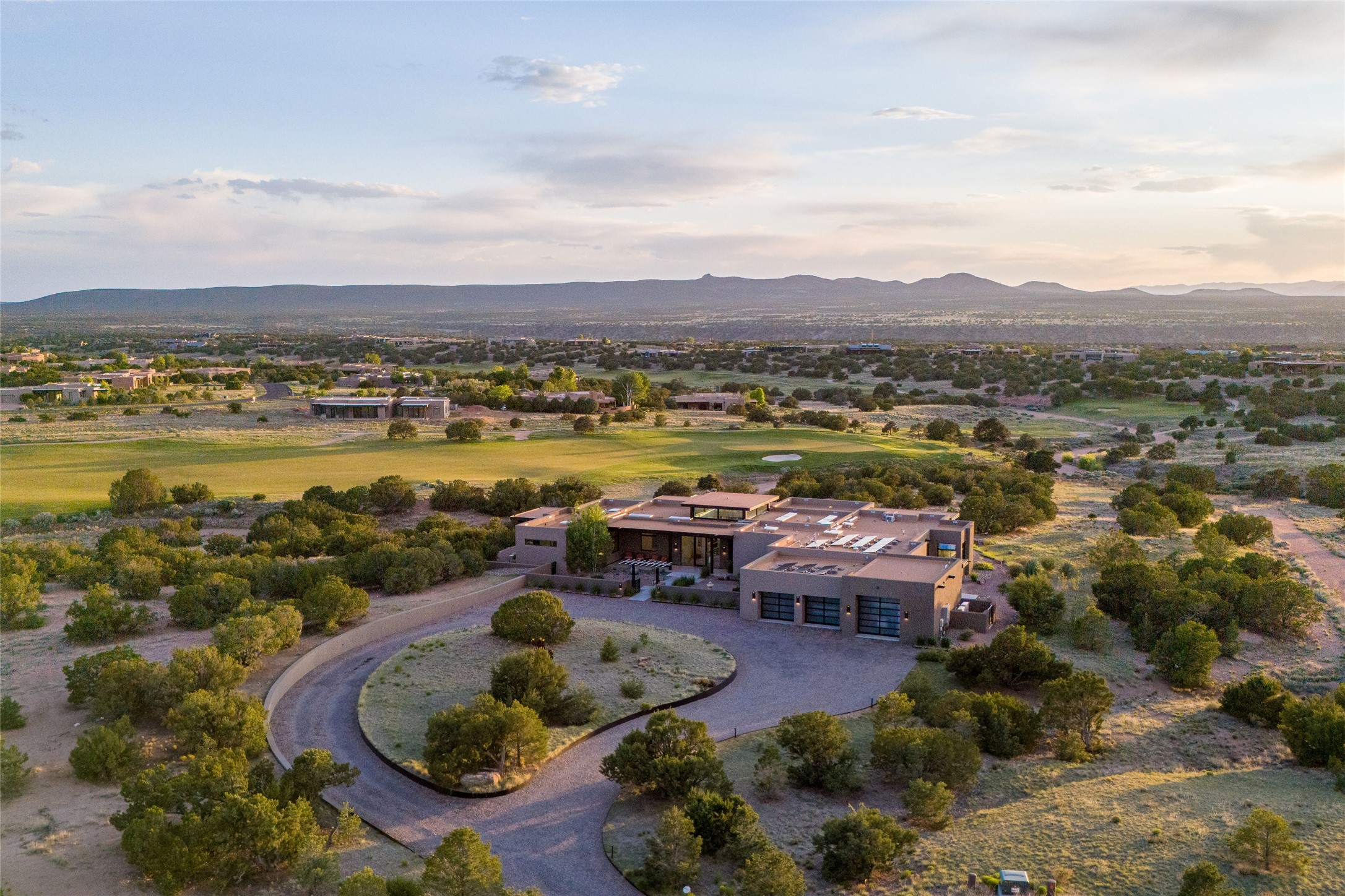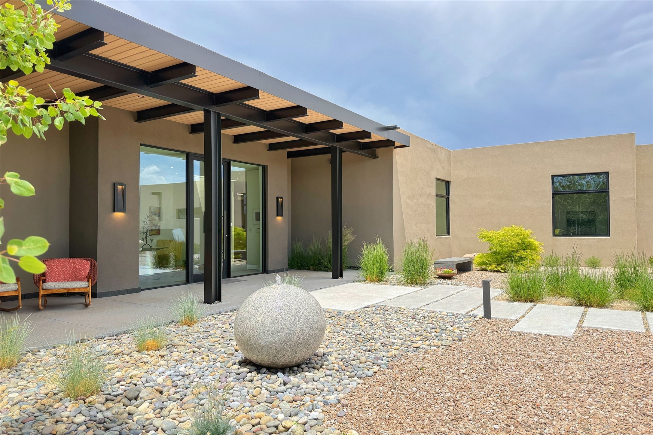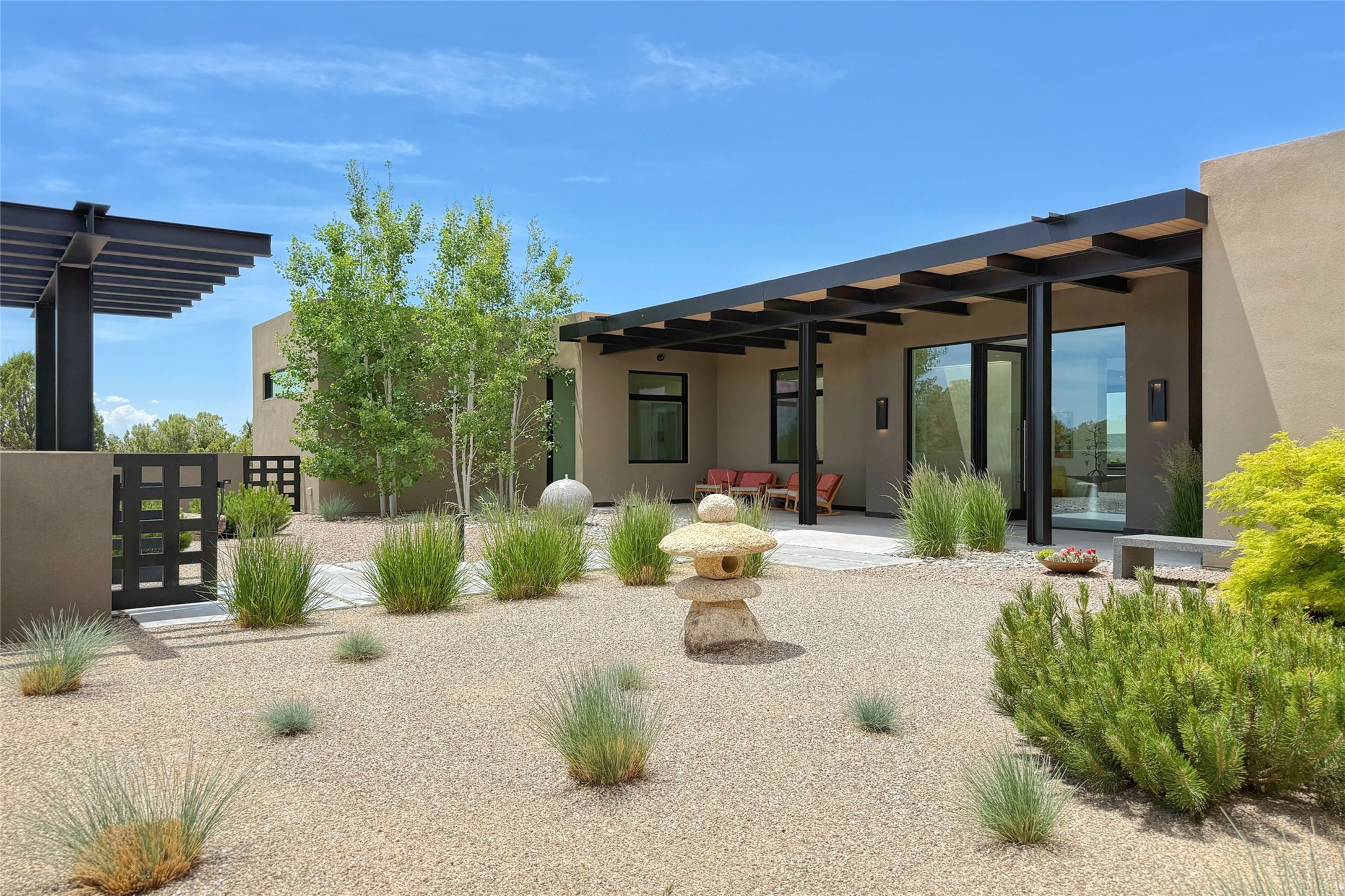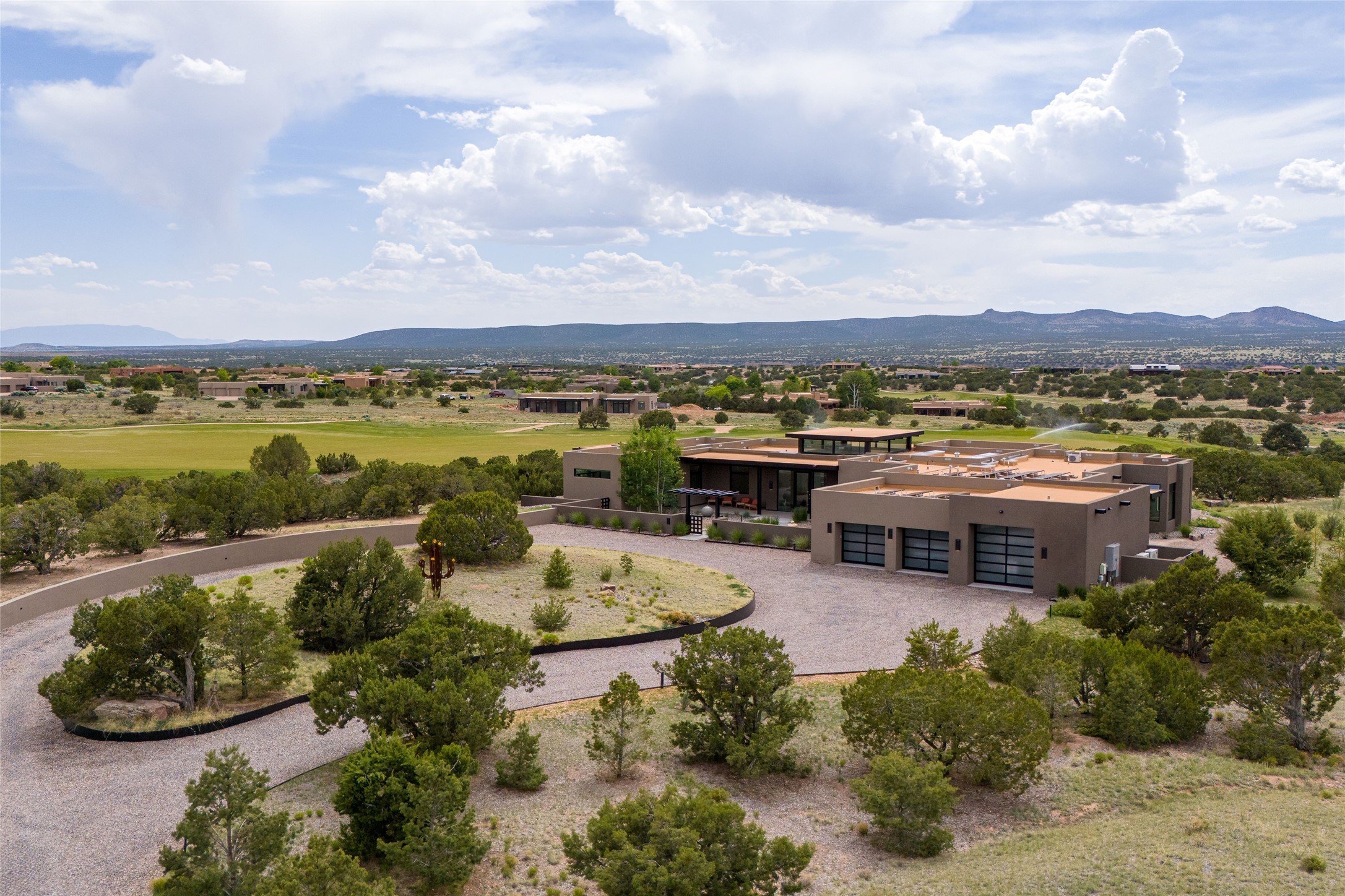 Wall Street Journal House of the Week featured 7/11/25. Artful design meets exceptional functionality in this striking contemporary estate, brilliantly conceived by renowned architect Lorn Tryk, and built by Prull Custom Builders. Resting on 4 acres, this home is a rare synthesis of modern form and high-performance living. A peaceful water feature welcomes you where a snow-melt walkway leads to a dramatic glass entry and gallery-style hall--perfect for displaying fine art. Inside, Tryk's "floating" walls, vanities, and cabinetry create a fabulous play of light and shadow. The dining room stuns with 17-foot clerestory ceilings, 72-inch EcoSmart fireplace, and floor-to-ceiling glass sliders opening to a heated portal, with in-ground hot tub, wood burning fireplace, and views of the Jemez and golf course. The chef's kitchen is built to entertain. A wraparound layout conceals a butler's pantry, while leathered granite counters, rift white oak cabinetry, steam and convection ovens, Sub-Zero wine storage, and a Grohe Blue seltzer system offer top-tier culinary tools. The primary suite is a sanctuary, complete with Ecosmart fireplace, in-suite gym, and a spa-style bath with walk-through triple-head shower. The guest wing includes two en-suites and a sitting area leads to a covered portal. For work and creativity, the home offers two distinct offices. One includes cabinetry with walnut countertops and a spacious craft table, while the other features skylights and massive storage for art supplies. This space could easily be converted into a fourth bedroom with bath. Smart home features include radiant in-floor heating and cooling and concealed media in the living room with sliding art panels to hide the TV. An integrated audiophile sound system by Linn operates in five locations. The three-car garage includes a dedicated RV bay and 50 amp EV charger. A truly distinctive property--thoughtfully designed, rich in detail, and purposefully built for elegant living and entertaining.