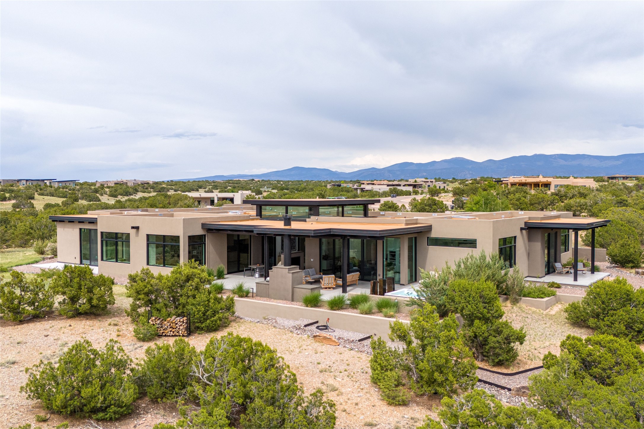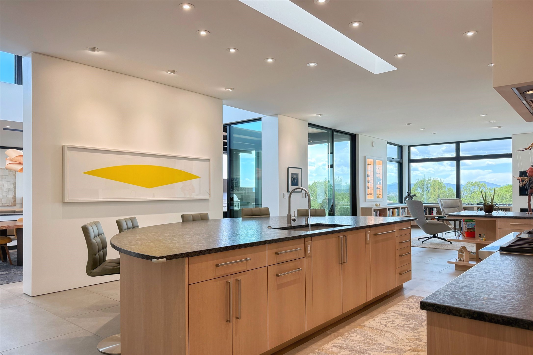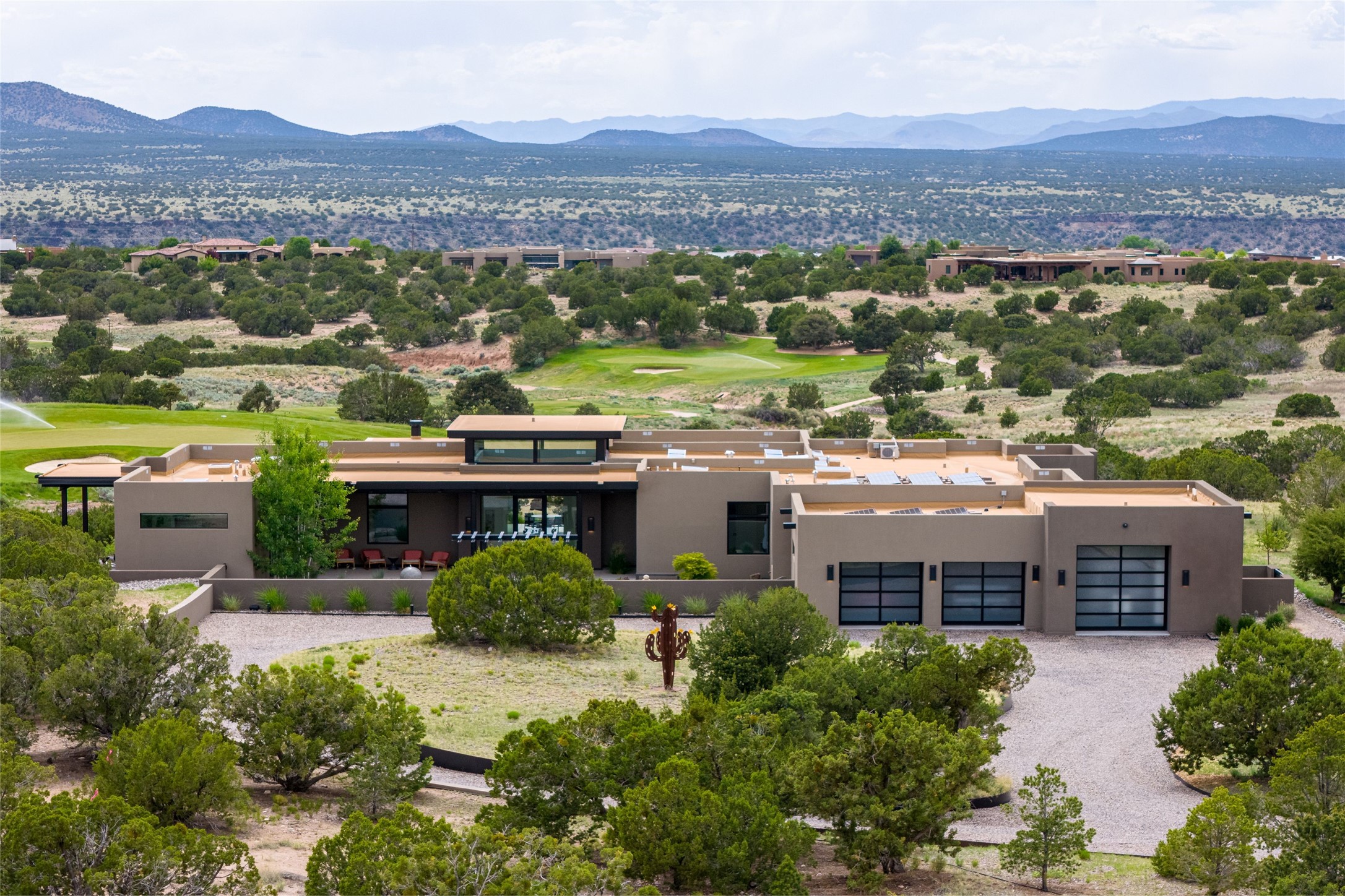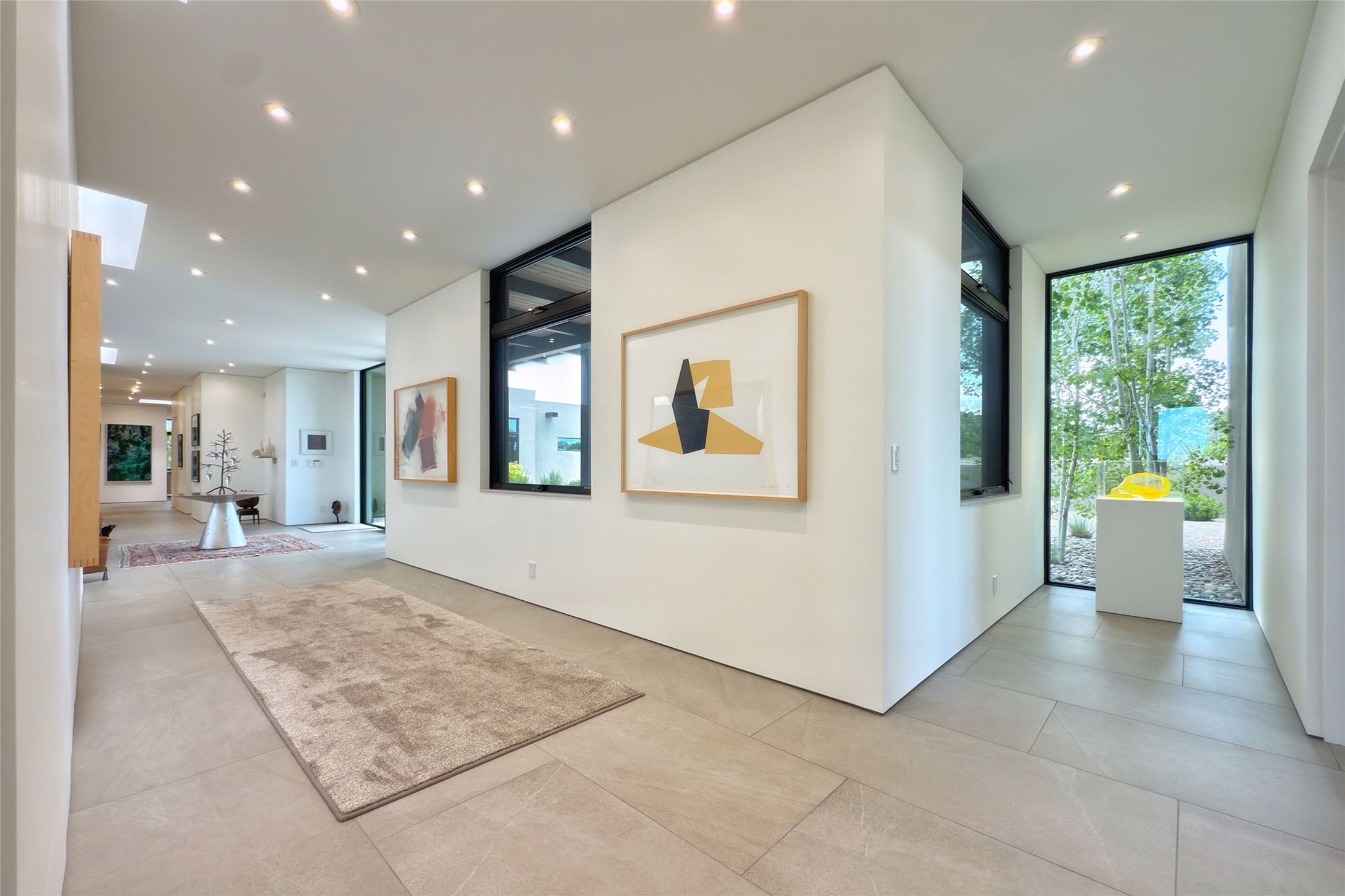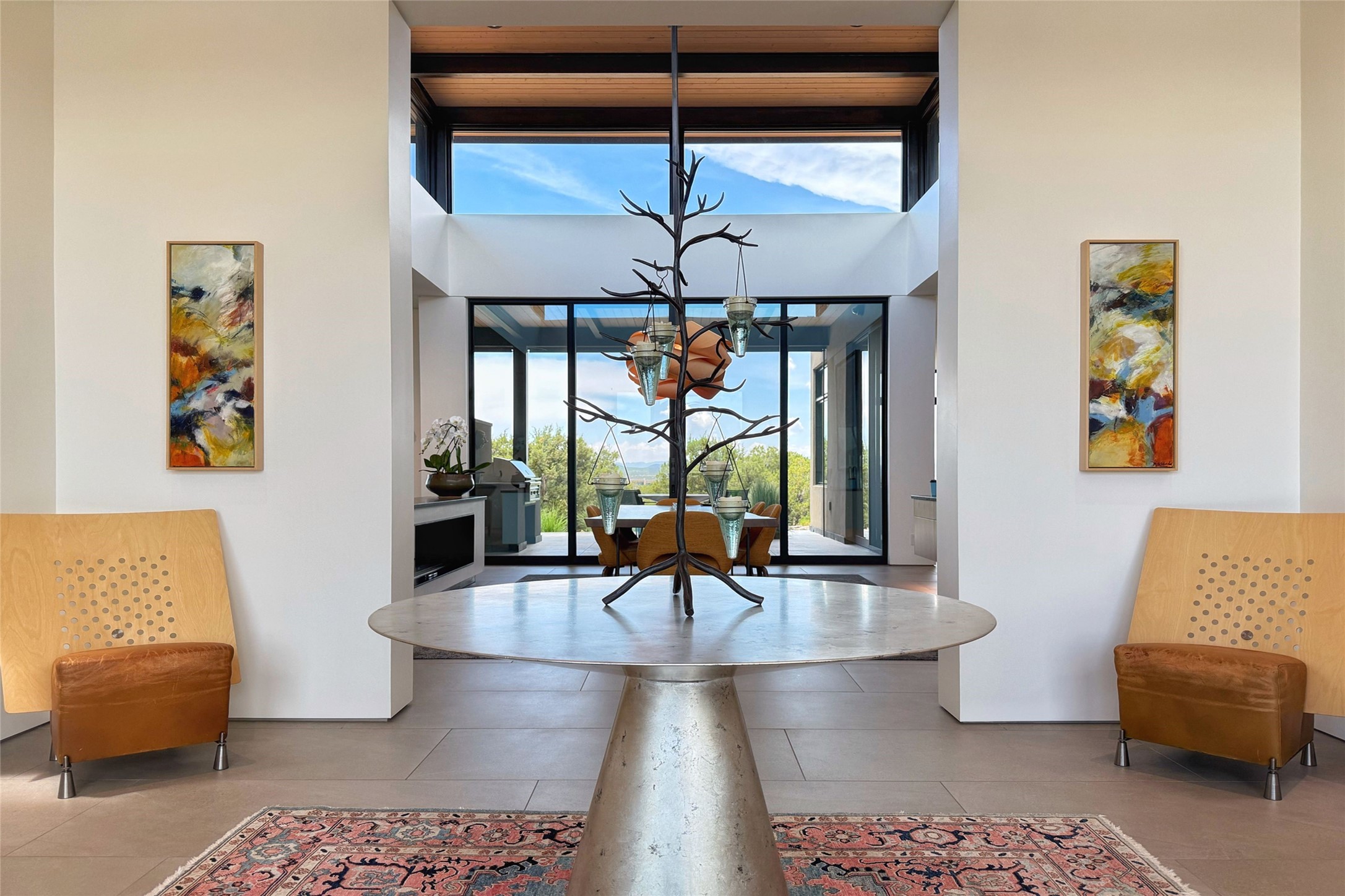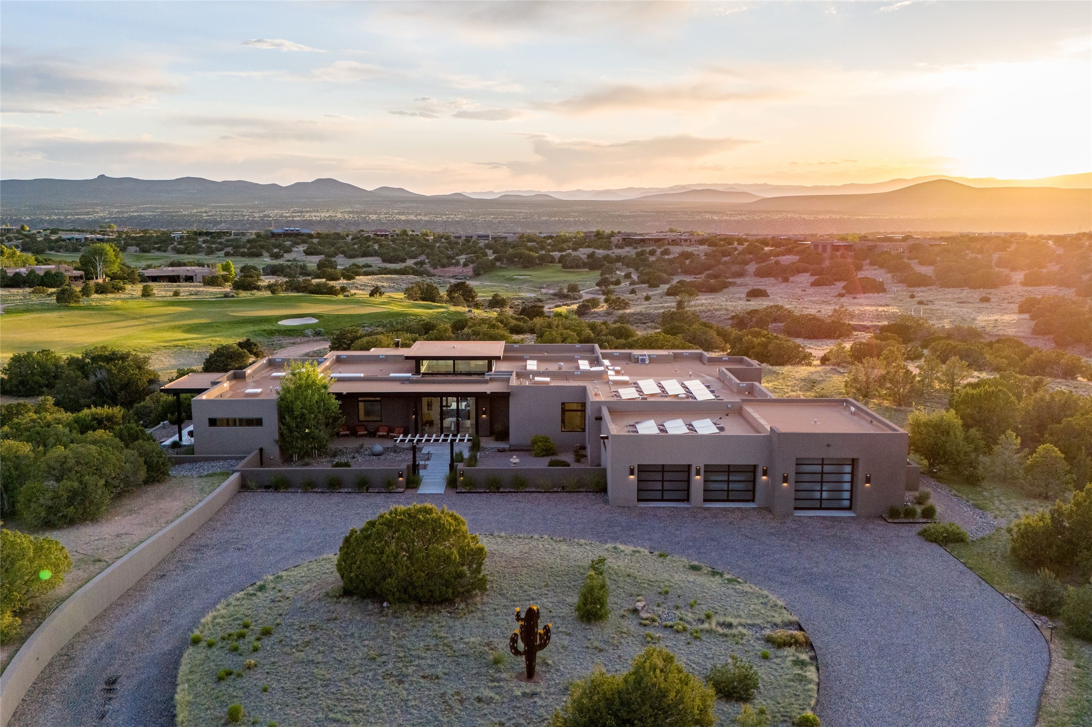 Wall Street Journal House of the Week featured 7/11/25. Artful design meets exceptional functionality in this striking contemporary estate, brilliantly conceived by renowned architect Lorn Tryk, and built by Prull Custom Builders. Resting on 4 acres, this home is a rare synthesis of modern form and high-performance living. A peaceful water feature welcomes you where a snow-melt walkway leads to a dramatic glass entry and gallery-style hall--perfect for displaying fine art. Inside, Tryk's "floating" walls, vanities, and cabinetry create a fabulous play of light and shadow. The dining room stuns with 17-foot clerestory ceilings, 72-inch EcoSmart fireplace, and floor-to-ceiling glass sliders opening to a heated portal, with in-ground hot tub, wood burning fireplace, and views of the Jemez and golf course. The chef's kitchen is built to entertain. A wraparound layout conceals a butler's pantry, while leathered granite counters, rift white oak cabinetry, steam and convection ovens, Sub-Zero wine storage, and a Grohe Blue seltzer system offer top-tier culinary tools. The primary suite is a sanctuary, complete with Ecosmart fireplace, in-suite gym, and a spa-style bath with walk-through triple-head shower. The guest wing includes two en-suites and a sitting area leads to a covered portal. For work and creativity, the home offers two distinct offices. One includes cabinetry with walnut countertops and a spacious craft table, while the other features skylights and massive storage for art supplies. This space could easily be converted into a fourth bedroom with bath. Smart home features include radiant in-floor heating and cooling and concealed media in the living room with sliding art panels to hide the TV. An integrated audiophile sound system by Linn operates in five locations. The three-car garage includes a dedicated RV bay and 50 amp EV charger. A truly distinctive property--thoughtfully designed, rich in detail, and purposefully built for elegant living and entertaining.
