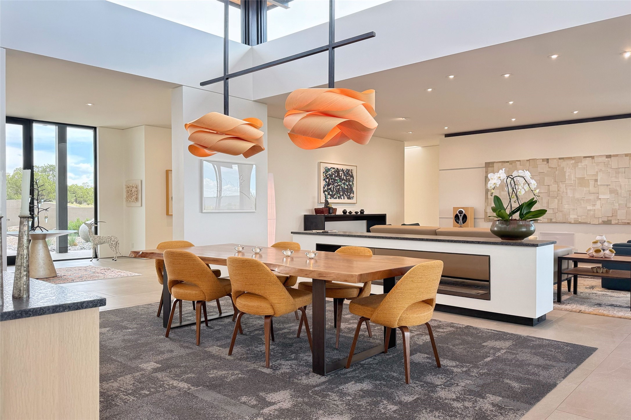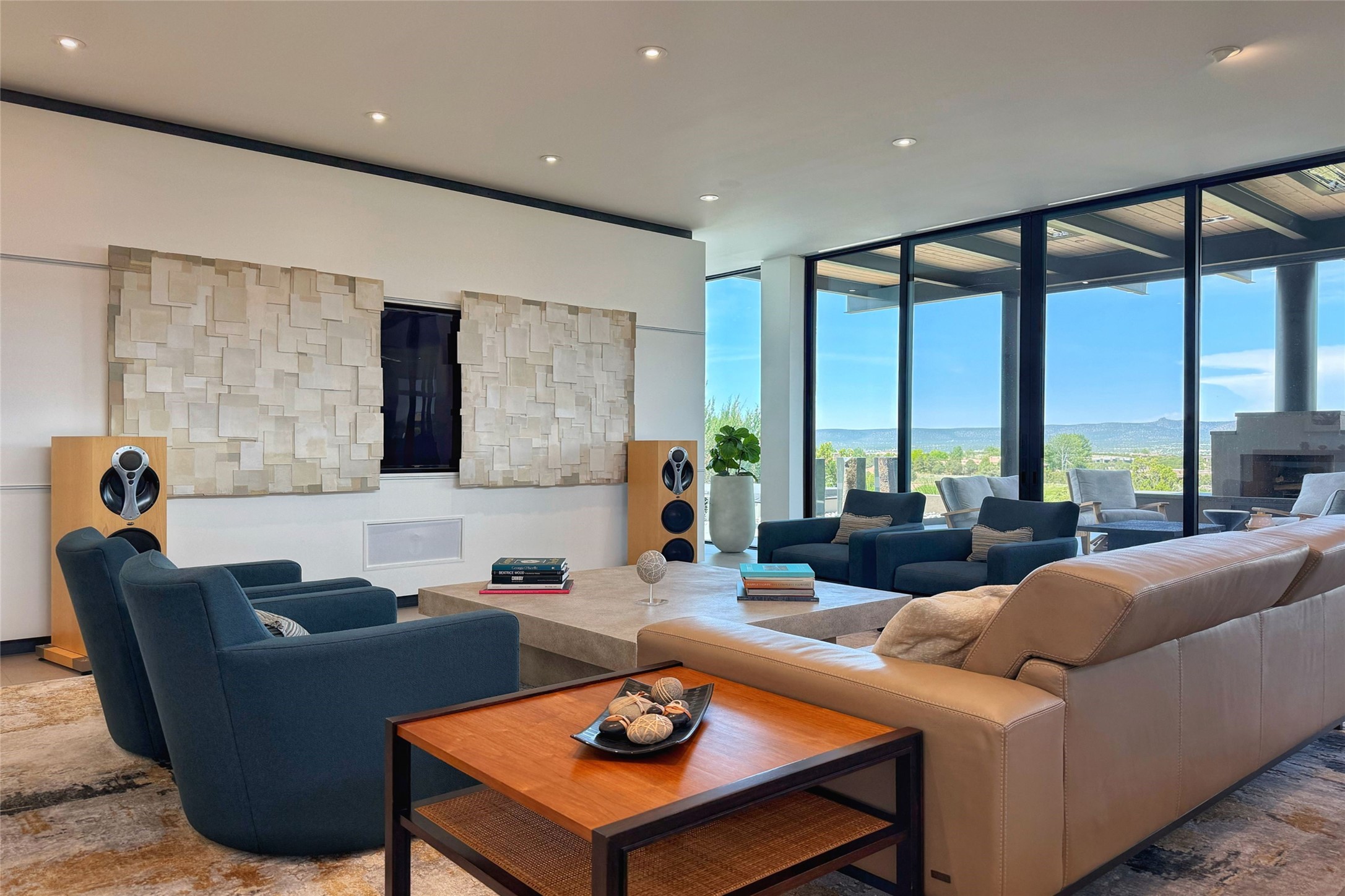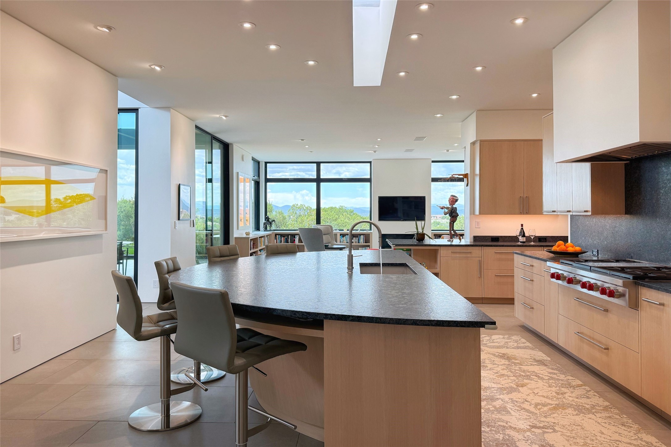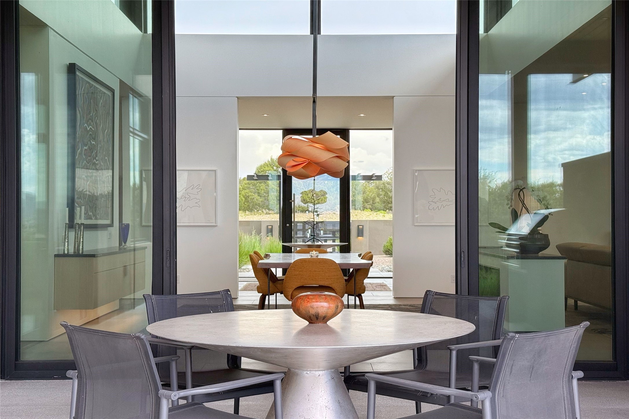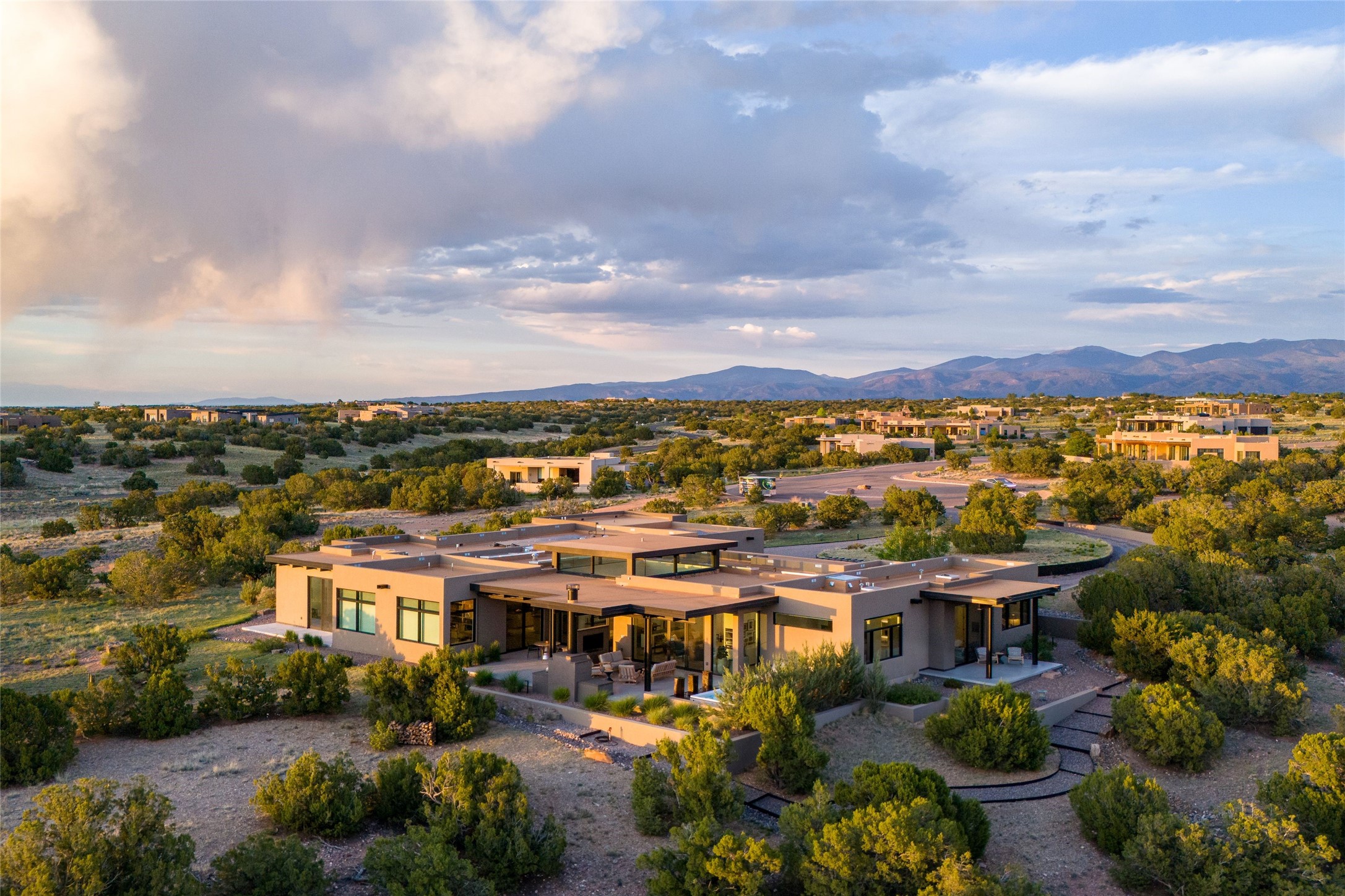 Wall Street Journal House of the Week featured 7/11/25. Artful design meets exceptional functionality in this striking contemporary estate, brilliantly conceived by renowned architect Lorn Tryk, and built by Prull Custom Builders. Resting on 4 acres, this home is a rare synthesis of modern form and high-performance living. A peaceful water feature welcomes you where a snow-melt walkway leads to a dramatic glass entry and gallery-style hall--perfect for displaying fine art. Inside, Tryk's "floating" walls, vanities, and cabinetry create a fabulous play of light and shadow. The dining room stuns with 17-foot clerestory ceilings, 72-inch EcoSmart fireplace, and floor-to-ceiling glass sliders opening to a heated portal, with in-ground hot tub, wood burning fireplace, and views of the Jemez and golf course. The chef's kitchen is built to entertain. A wraparound layout conceals a butler's pantry, while leathered granite counters, rift white oak cabinetry, steam and convection ovens, Sub-Zero wine storage, and a Grohe Blue seltzer system offer top-tier culinary tools. The primary suite is a sanctuary, complete with Ecosmart fireplace, in-suite gym, and a spa-style bath with walk-through triple-head shower. The guest wing includes two en-suites and a sitting area leads to a covered portal. For work and creativity, the home offers two distinct offices. One includes cabinetry with walnut countertops and a spacious craft table, while the other features skylights and massive storage for art supplies. This space could easily be converted into a fourth bedroom with bath. Smart home features include radiant in-floor heating and cooling and concealed media in the living room with sliding art panels to hide the TV. An integrated audiophile sound system by Linn operates in five locations. The three-car garage includes a dedicated RV bay and 50 amp EV charger. A truly distinctive property--thoughtfully designed, rich in detail, and purposefully built for elegant living and entertaining.