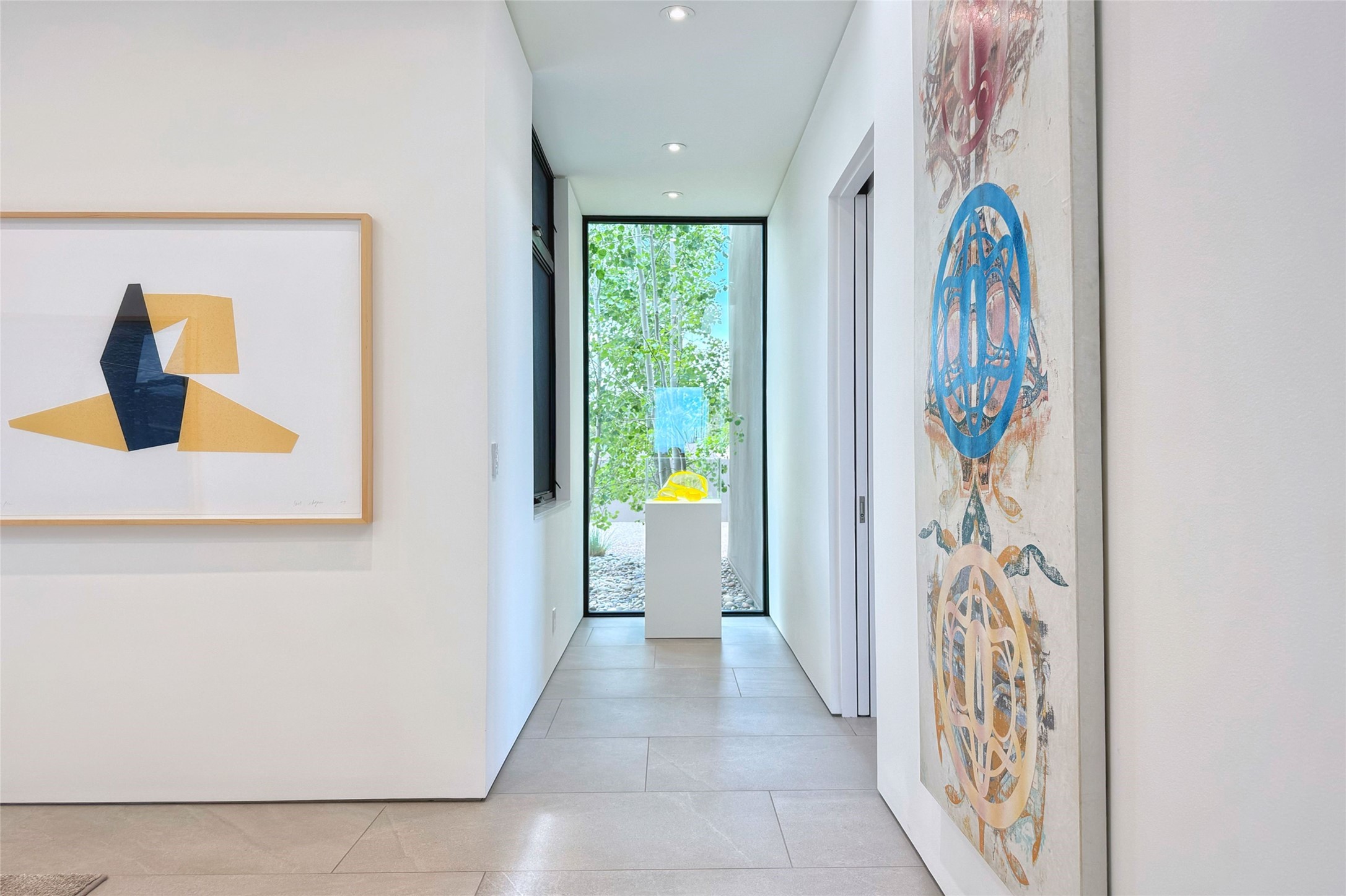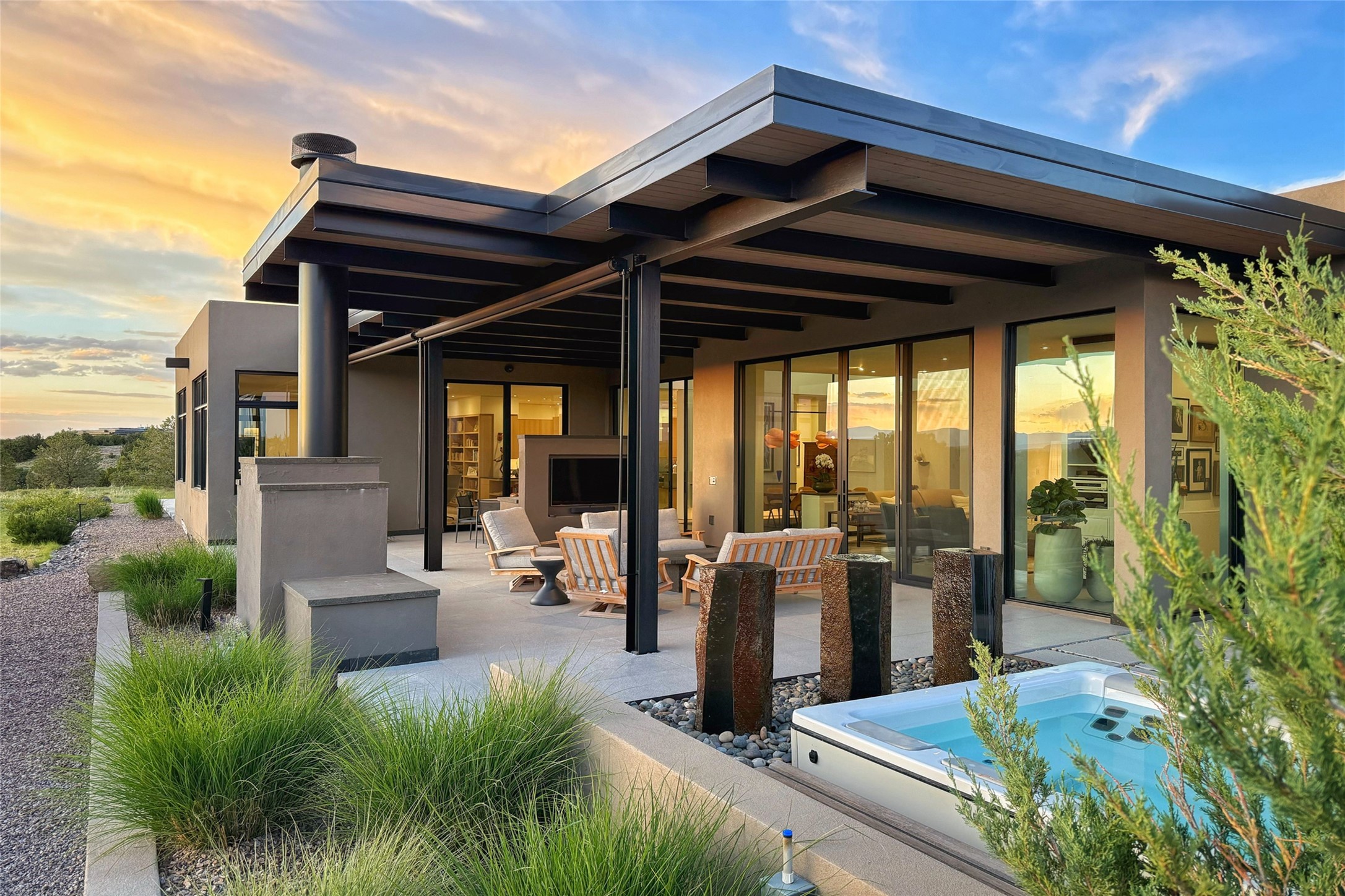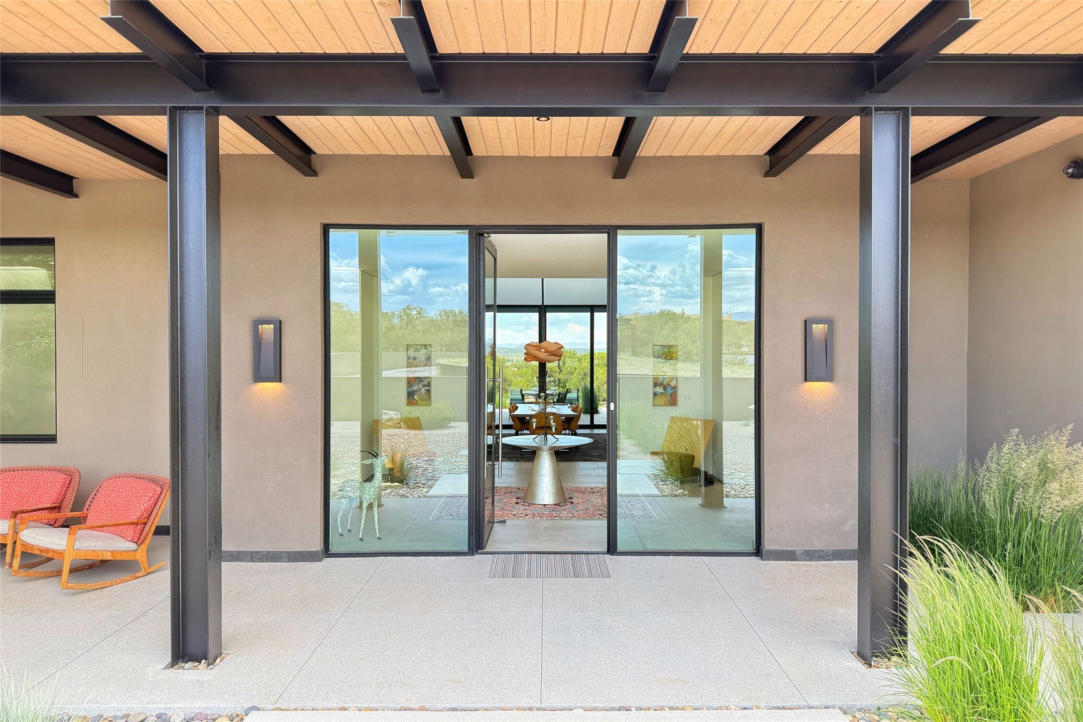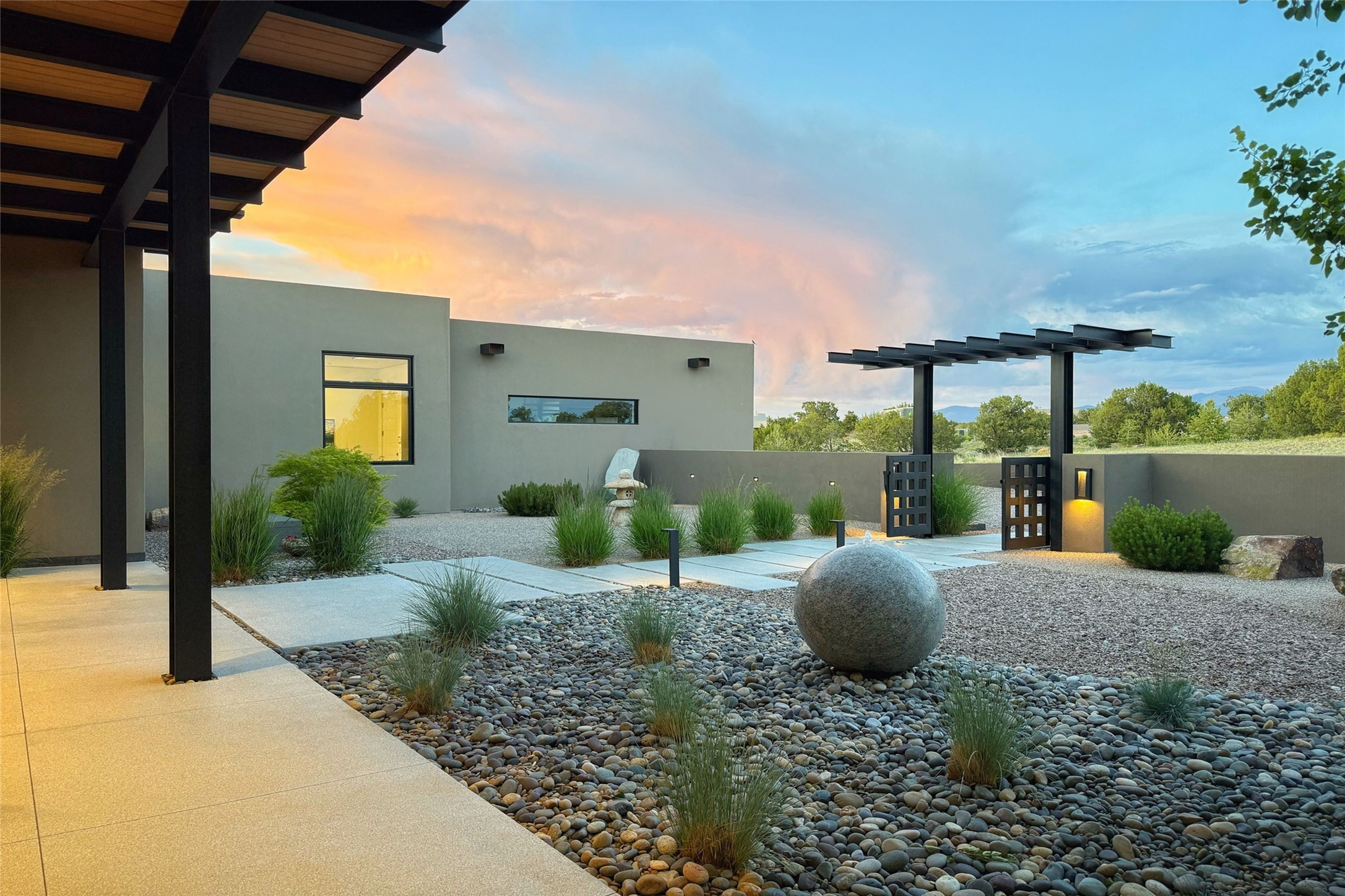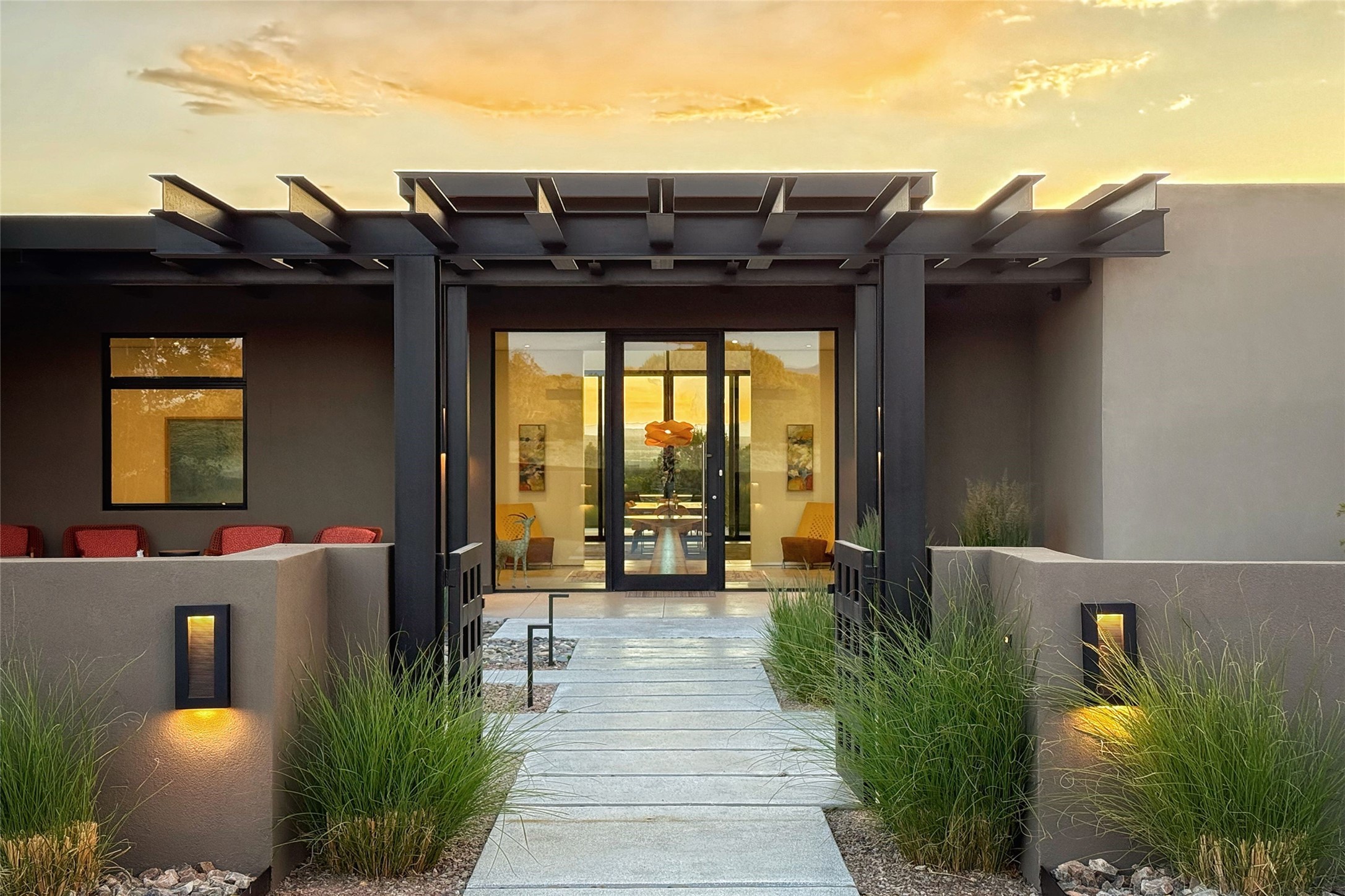 Wall Street Journal House of the Week featured 7/11/25. Artful design meets exceptional functionality in this striking contemporary estate, brilliantly conceived by renowned architect Lorn Tryk, and built by Prull Custom Builders. Resting on 4 acres, this home is a rare synthesis of modern form and high-performance living. A peaceful water feature welcomes you where a snow-melt walkway leads to a dramatic glass entry and gallery-style hall--perfect for displaying fine art. Inside, Tryk's "floating" walls, vanities, and cabinetry create a fabulous play of light and shadow. The dining room stuns with 17-foot clerestory ceilings, 72-inch EcoSmart fireplace, and floor-to-ceiling glass sliders opening to a heated portal, with in-ground hot tub, wood burning fireplace, and views of the Jemez and golf course. The chef's kitchen is built to entertain. A wraparound layout conceals a butler's pantry, while leathered granite counters, rift white oak cabinetry, steam and convection ovens, Sub-Zero wine storage, and a Grohe Blue seltzer system offer top-tier culinary tools. The primary suite is a sanctuary, complete with Ecosmart fireplace, in-suite gym, and a spa-style bath with walk-through triple-head shower. The guest wing includes two en-suites and a sitting area leads to a covered portal. For work and creativity, the home offers two distinct offices. One includes cabinetry with walnut countertops and a spacious craft table, while the other features skylights and massive storage for art supplies. This space could easily be converted into a fourth bedroom with bath. Smart home features include radiant in-floor heating and cooling and concealed media in the living room with sliding art panels to hide the TV. An integrated audiophile sound system by Linn operates in five locations. The three-car garage includes a dedicated RV bay and 50 amp EV charger. A truly distinctive property--thoughtfully designed, rich in detail, and purposefully built for elegant living and entertaining.