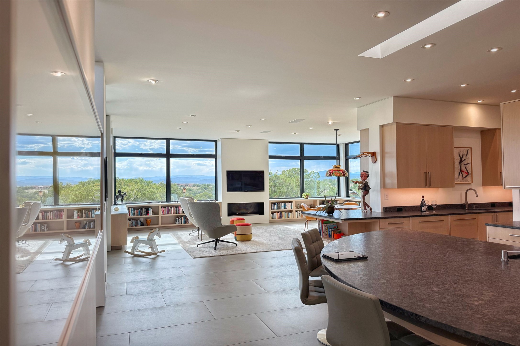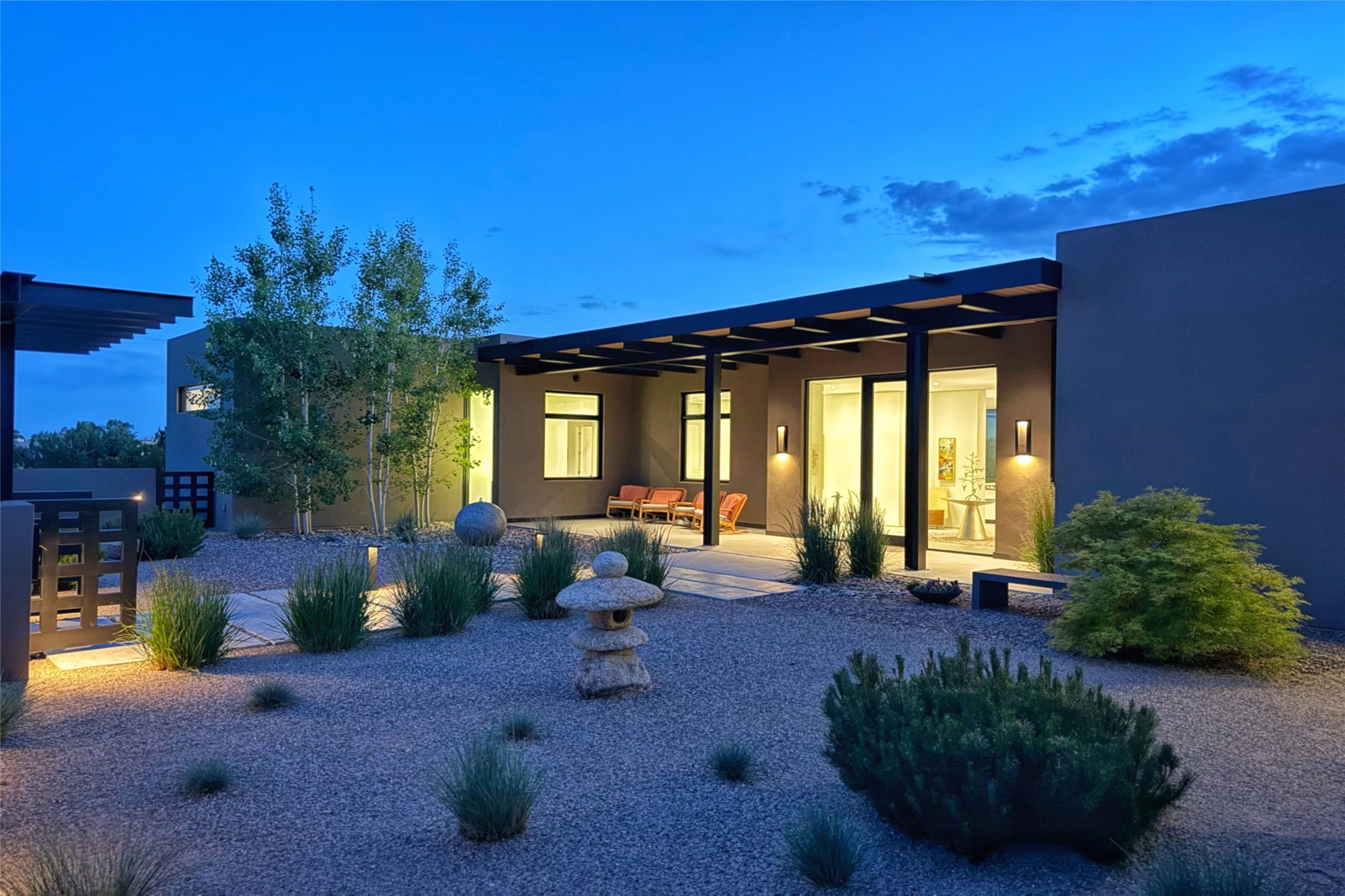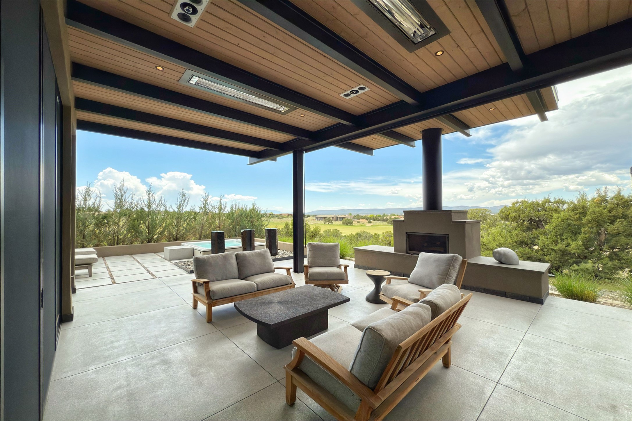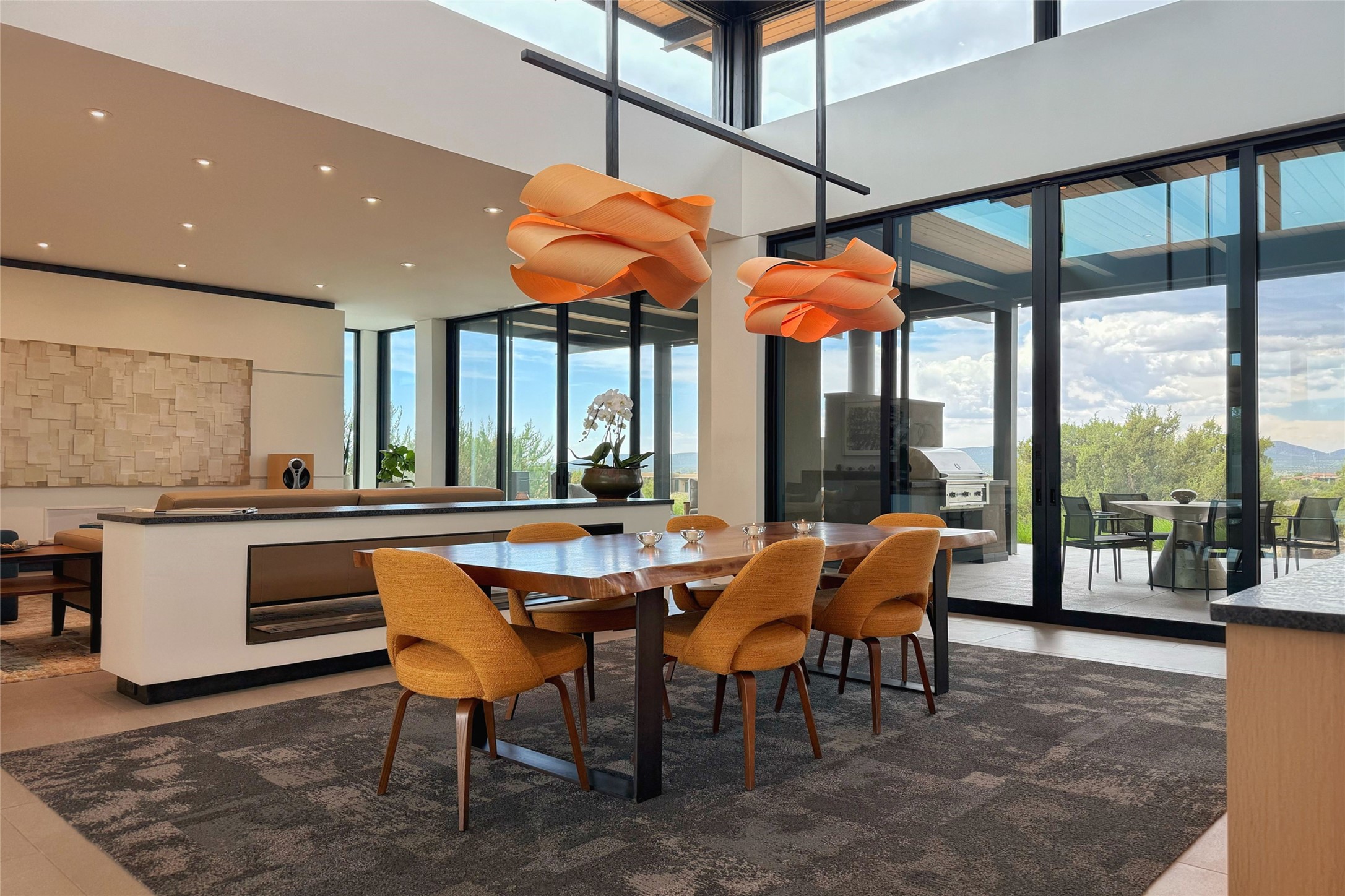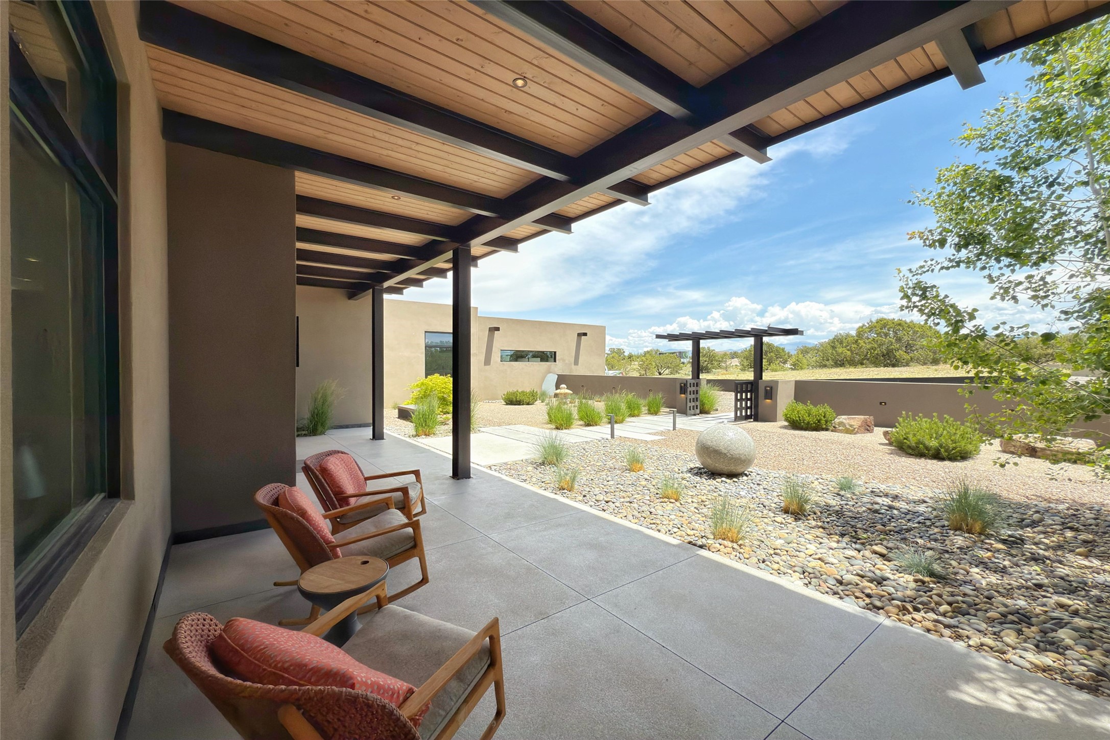Wall Street Journal House of the Week featured 7/11/25. Artful design meets exceptional functionality in this striking contemporary estate, brilliantly conceived by renowned architect Lorn Tryk, and built by Prull Custom Builders. Resting on 4 acres, this home is a rare synthesis of modern form and high-performance living. A peaceful water feature welcomes you where a snow-melt walkway leads to a dramatic glass entry and gallery-style hall--perfect for displaying fine art. Inside, Tryk's "floating" walls, vanities, and cabinetry create a fabulous play of light and shadow. The dining room stuns with 17-foot clerestory ceilings, 72-inch EcoSmart fireplace, and floor-to-ceiling glass sliders opening to a heated portal, with in-ground hot tub, wood burning fireplace, and views of the Jemez and golf course. The chef's kitchen is built to entertain. A wraparound layout conceals a butler's pantry, while leathered granite counters, rift white oak cabinetry, steam and convection ovens, Sub-Zero wine storage, and a Grohe Blue seltzer system offer top-tier culinary tools. The primary suite is a sanctuary, complete with Ecosmart fireplace, in-suite gym, and a spa-style bath with walk-through triple-head shower. The guest wing includes two en-suites and a sitting area leads to a covered portal. For work and creativity, the home offers two distinct offices. One includes cabinetry with walnut countertops and a spacious craft table, while the other features skylights and massive storage for art supplies. This space could easily be converted into a fourth bedroom with bath. Smart home features include radiant in-floor heating and cooling and concealed media in the living room with sliding art panels to hide the TV. An integrated audiophile sound system by Linn operates in five locations. The three-car garage includes a dedicated RV bay and 50 amp EV charger. A truly distinctive property--thoughtfully designed, rich in detail, and purposefully built for elegant living and entertaining.