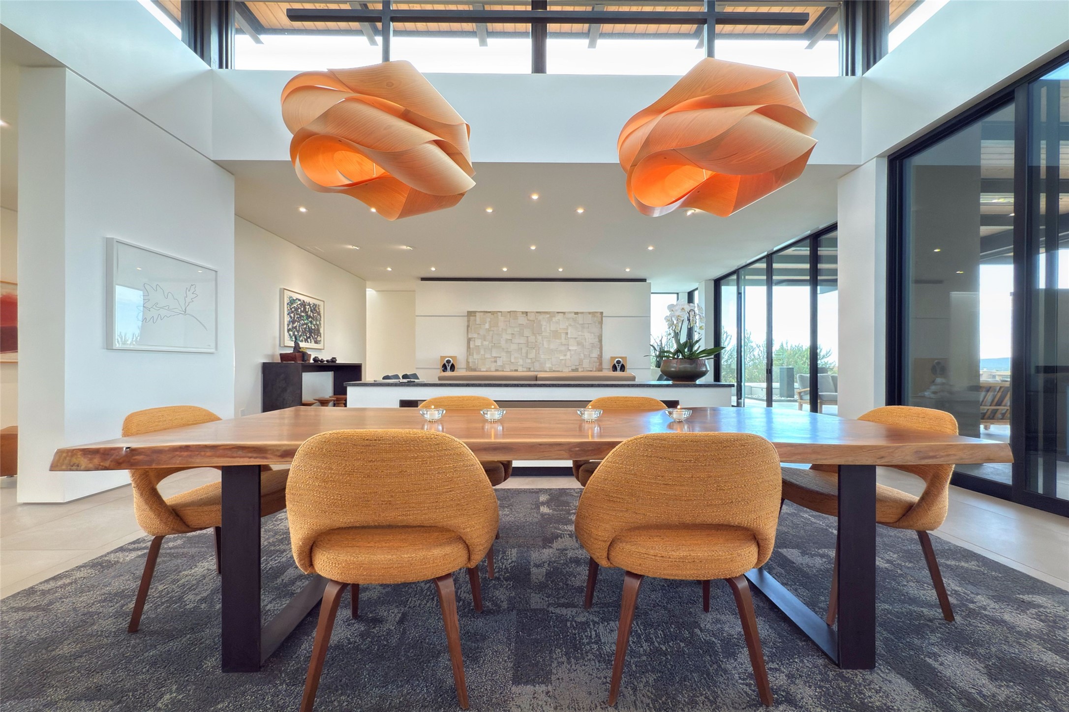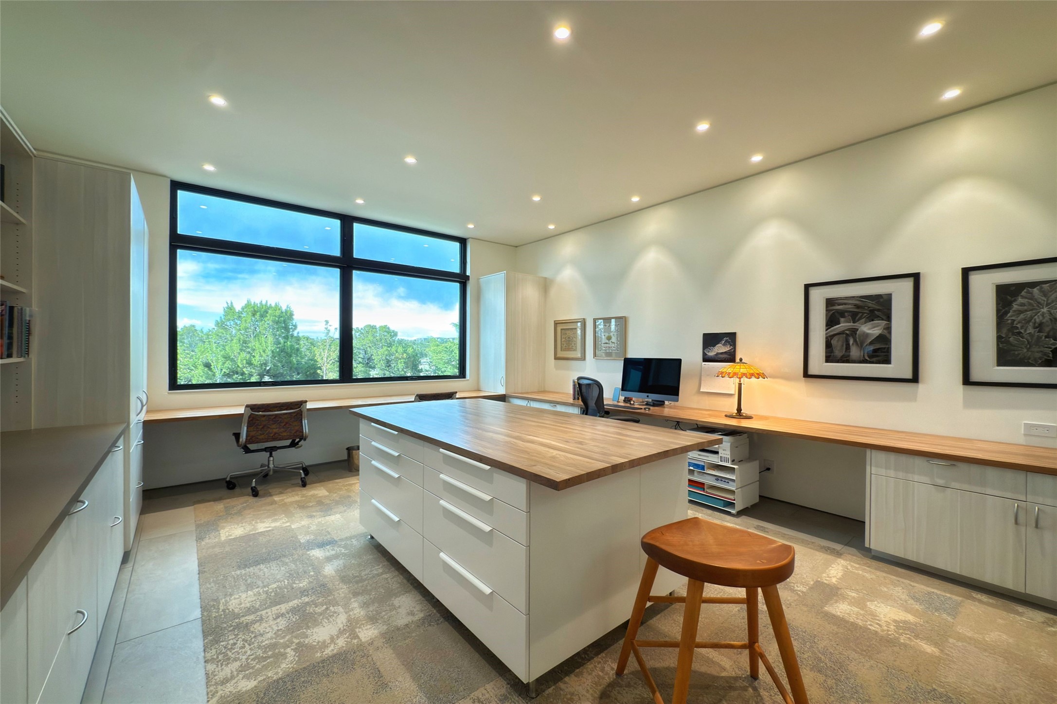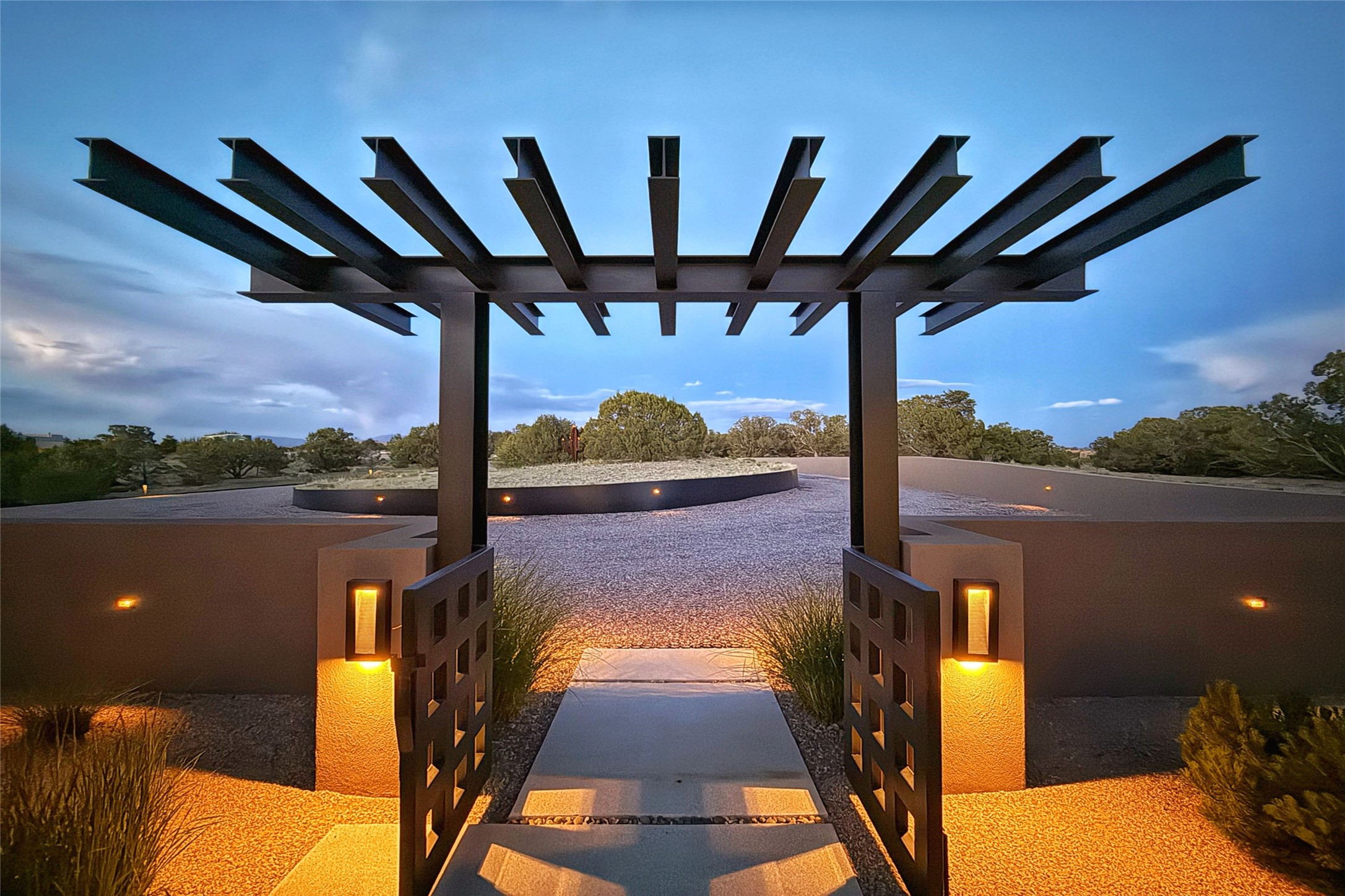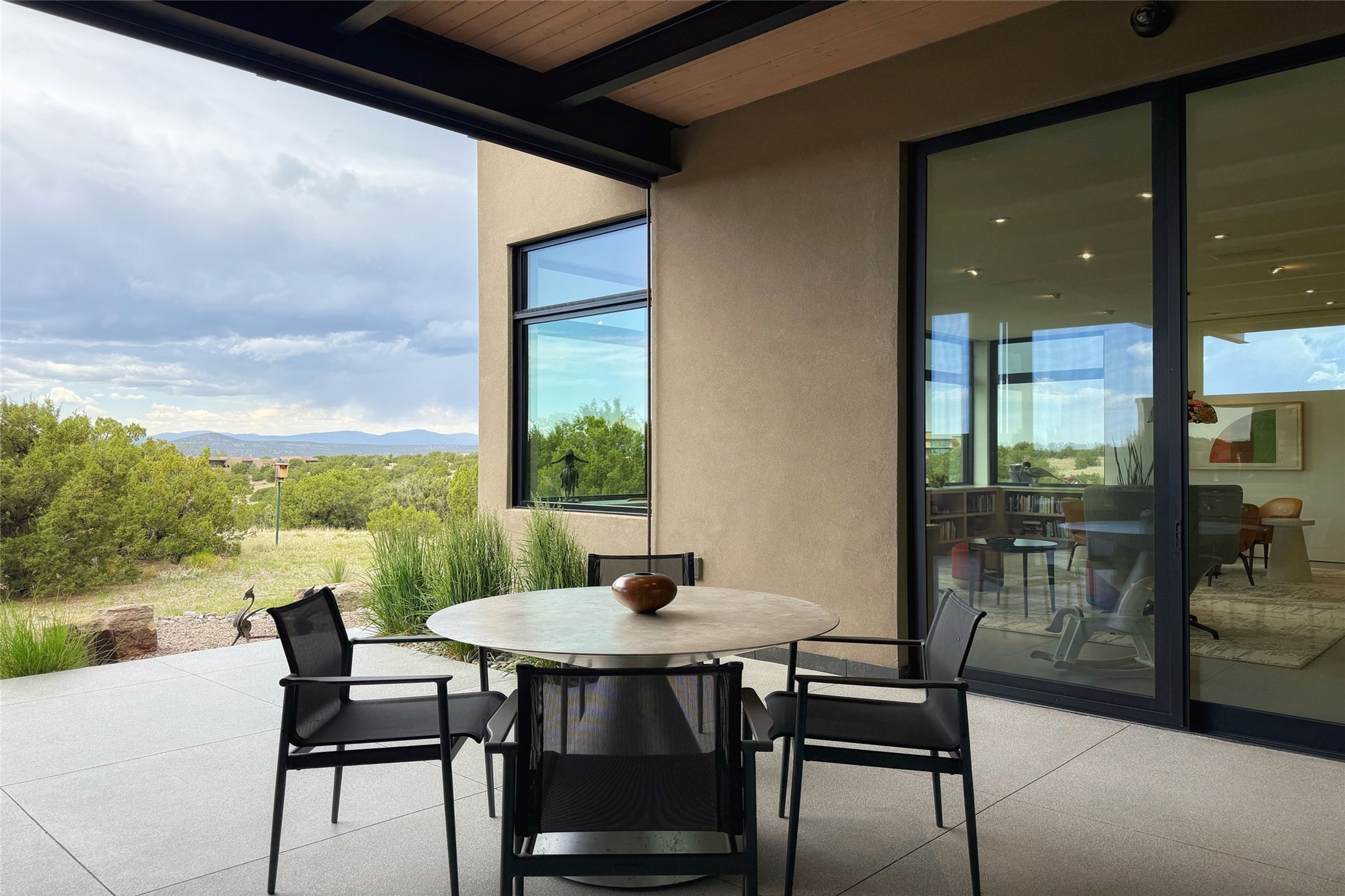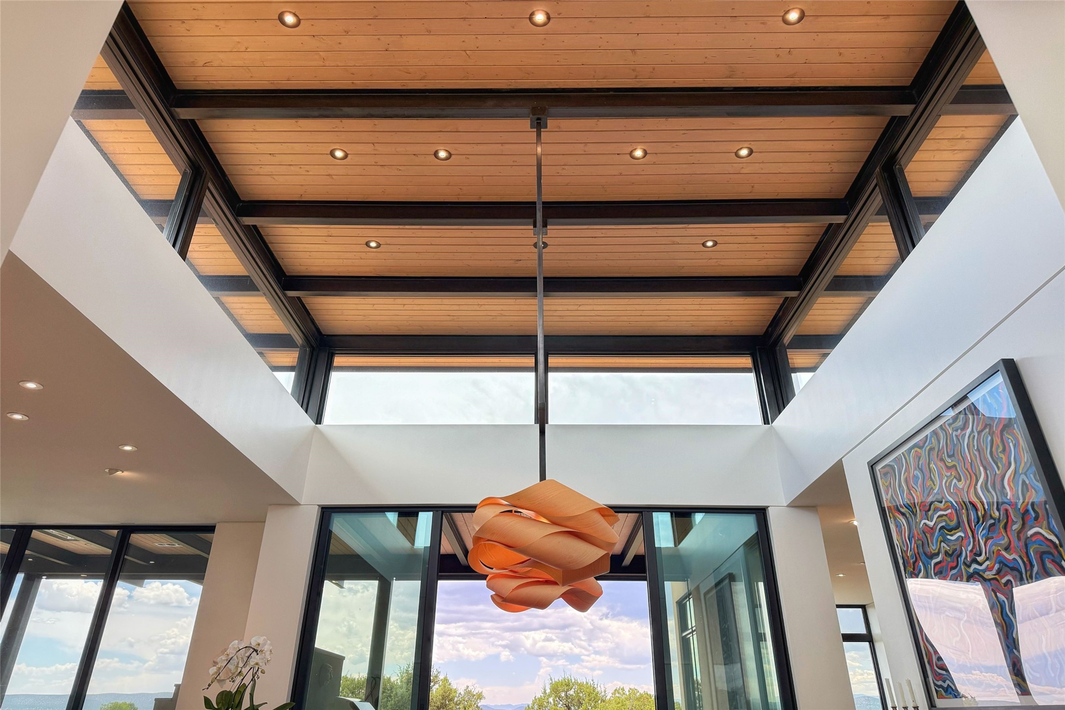 Wall Street Journal House of the Week featured 7/11/25. Artful design meets exceptional functionality in this striking contemporary estate, brilliantly conceived by renowned architect Lorn Tryk, and built by Prull Custom Builders. Resting on 4 acres, this home is a rare synthesis of modern form and high-performance living. A peaceful water feature welcomes you where a snow-melt walkway leads to a dramatic glass entry and gallery-style hall--perfect for displaying fine art. Inside, Tryk's "floating" walls, vanities, and cabinetry create a fabulous play of light and shadow. The dining room stuns with 17-foot clerestory ceilings, 72-inch EcoSmart fireplace, and floor-to-ceiling glass sliders opening to a heated portal, with in-ground hot tub, wood burning fireplace, and views of the Jemez and golf course. The chef's kitchen is built to entertain. A wraparound layout conceals a butler's pantry, while leathered granite counters, rift white oak cabinetry, steam and convection ovens, Sub-Zero wine storage, and a Grohe Blue seltzer system offer top-tier culinary tools. The primary suite is a sanctuary, complete with Ecosmart fireplace, in-suite gym, and a spa-style bath with walk-through triple-head shower. The guest wing includes two en-suites and a sitting area leads to a covered portal. For work and creativity, the home offers two distinct offices. One includes cabinetry with walnut countertops and a spacious craft table, while the other features skylights and massive storage for art supplies. This space could easily be converted into a fourth bedroom with bath. Smart home features include radiant in-floor heating and cooling and concealed media in the living room with sliding art panels to hide the TV. An integrated audiophile sound system by Linn operates in five locations. The three-car garage includes a dedicated RV bay and 50 amp EV charger. A truly distinctive property--thoughtfully designed, rich in detail, and purposefully built for elegant living and entertaining.