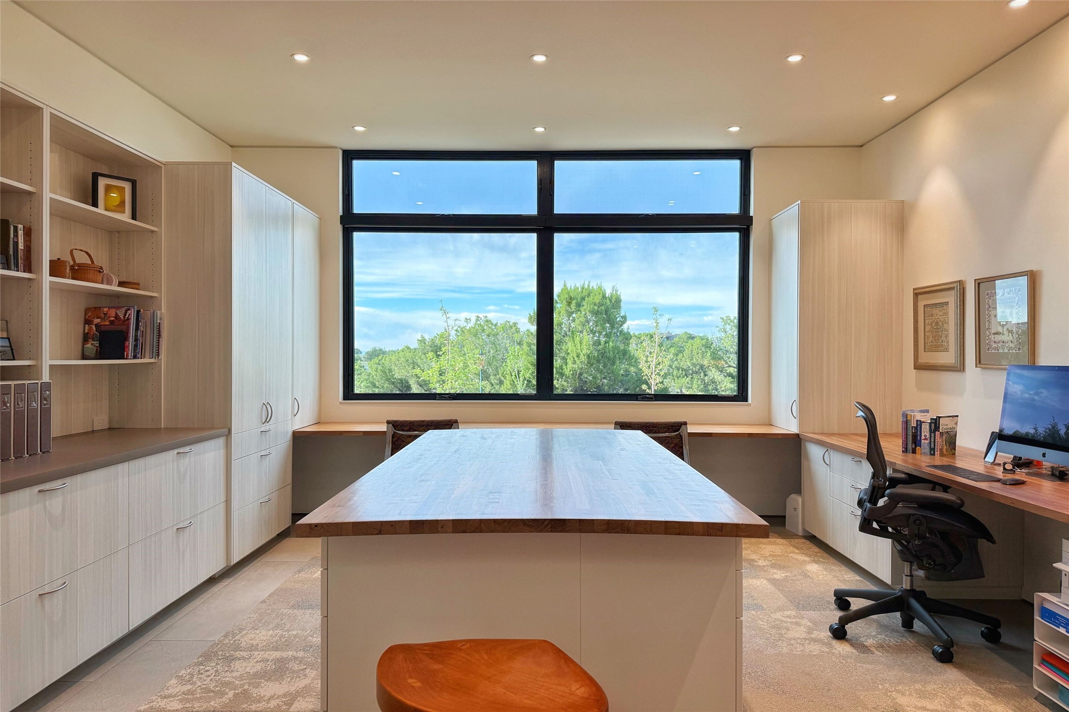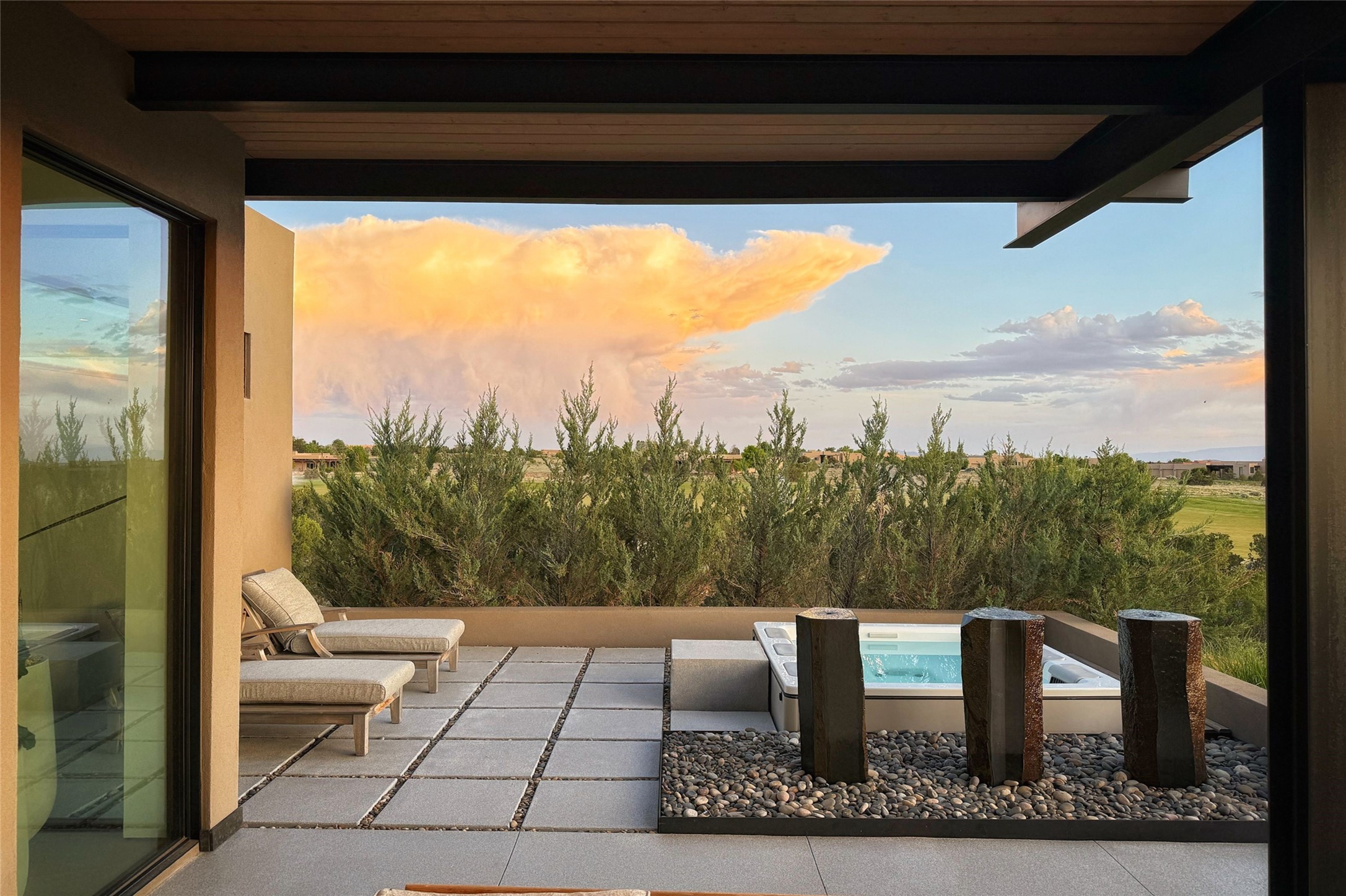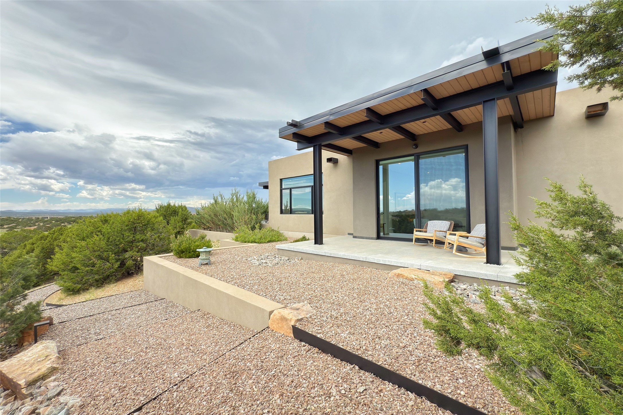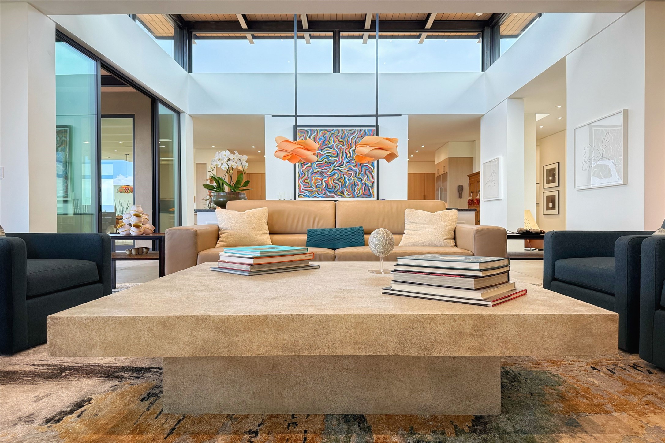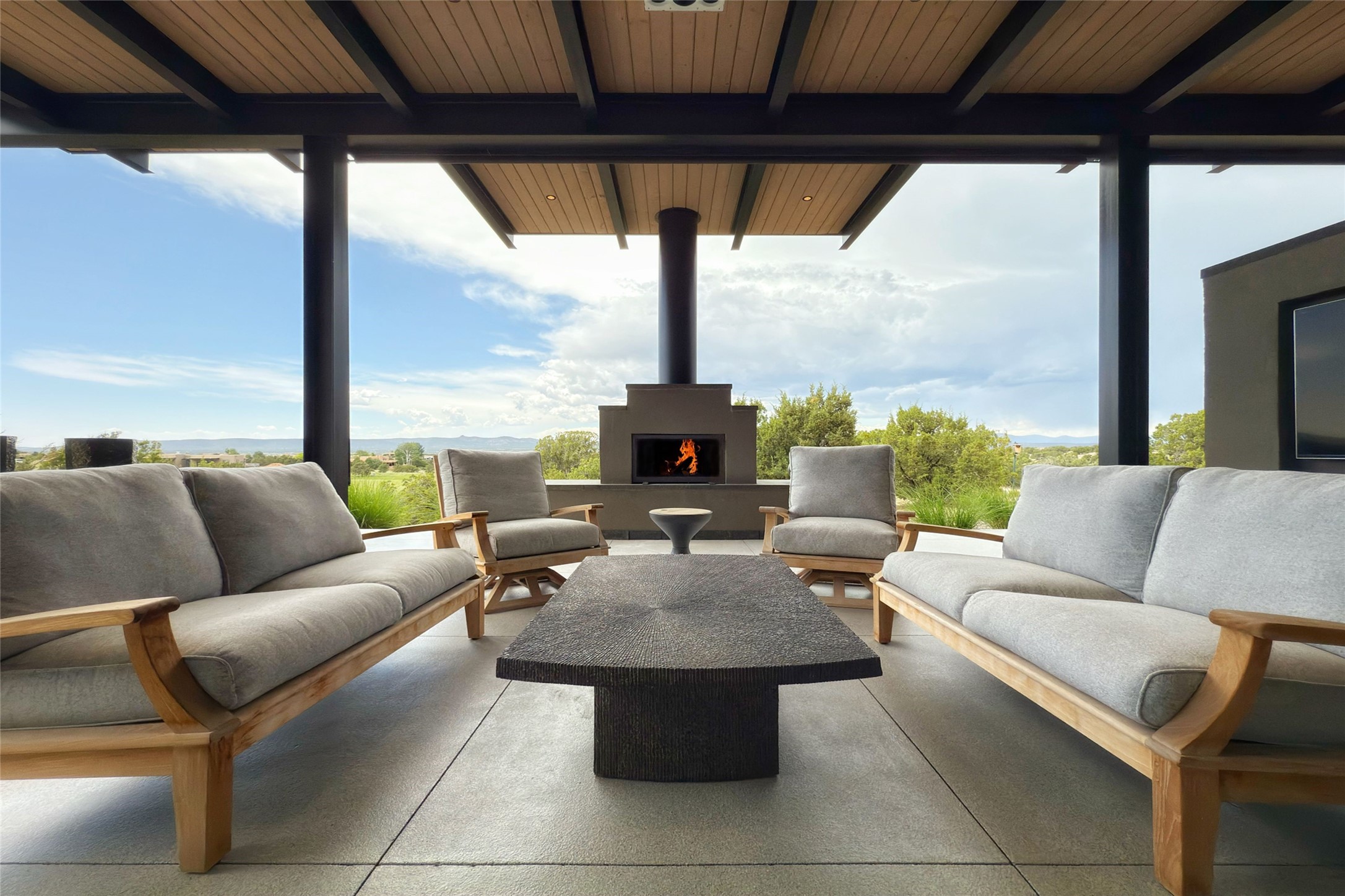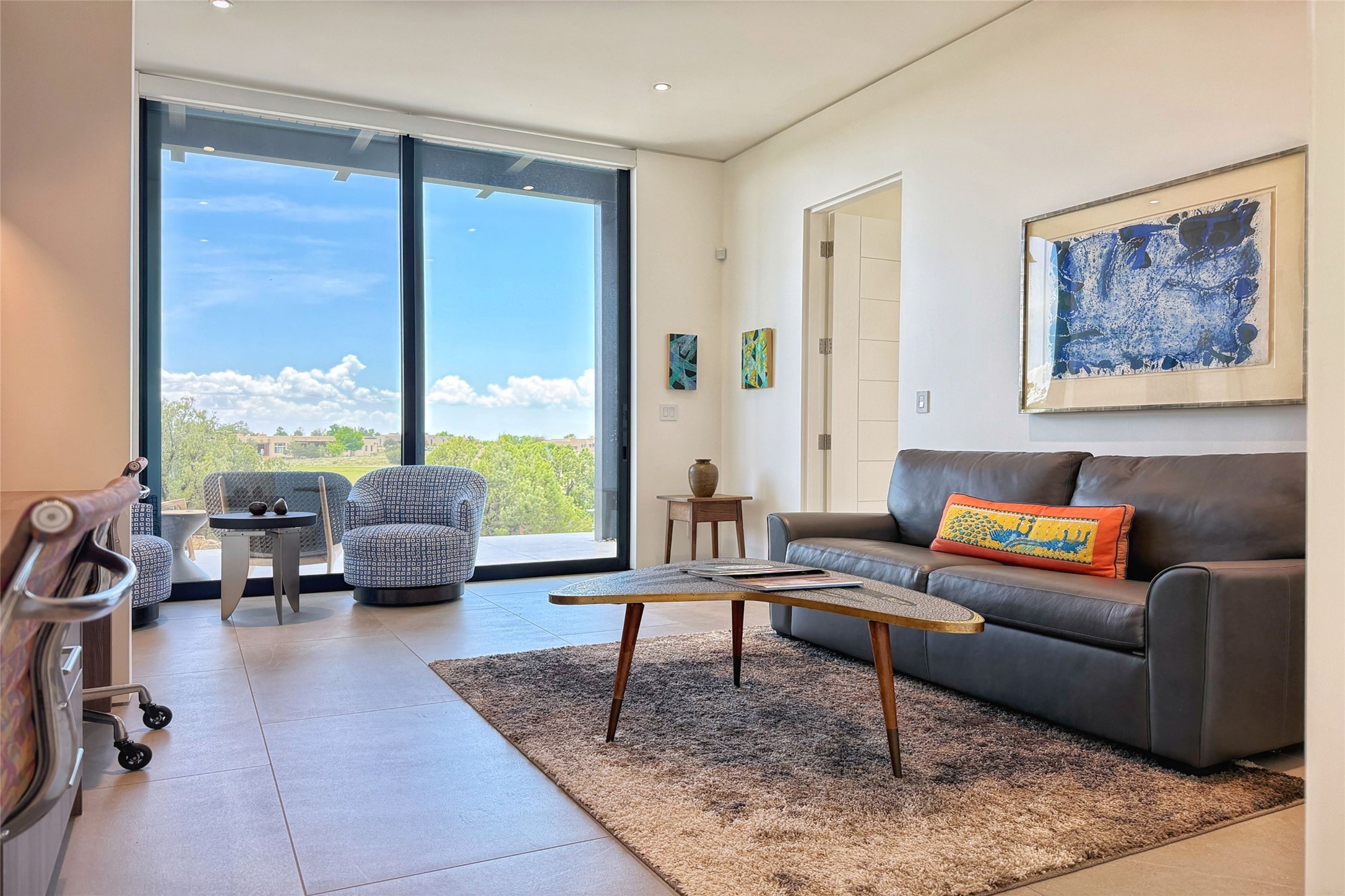 Wall Street Journal House of the Week featured 7/11/25. Artful design meets exceptional functionality in this striking contemporary estate, brilliantly conceived by renowned architect Lorn Tryk, and built by Prull Custom Builders. Resting on 4 acres, this home is a rare synthesis of modern form and high-performance living. A peaceful water feature welcomes you where a snow-melt walkway leads to a dramatic glass entry and gallery-style hall--perfect for displaying fine art. Inside, Tryk's "floating" walls, vanities, and cabinetry create a fabulous play of light and shadow. The dining room stuns with 17-foot clerestory ceilings, 72-inch EcoSmart fireplace, and floor-to-ceiling glass sliders opening to a heated portal, with in-ground hot tub, wood burning fireplace, and views of the Jemez and golf course. The chef's kitchen is built to entertain. A wraparound layout conceals a butler's pantry, while leathered granite counters, rift white oak cabinetry, steam and convection ovens, Sub-Zero wine storage, and a Grohe Blue seltzer system offer top-tier culinary tools. The primary suite is a sanctuary, complete with Ecosmart fireplace, in-suite gym, and a spa-style bath with walk-through triple-head shower. The guest wing includes two en-suites and a sitting area leads to a covered portal. For work and creativity, the home offers two distinct offices. One includes cabinetry with walnut countertops and a spacious craft table, while the other features skylights and massive storage for art supplies. This space could easily be converted into a fourth bedroom with bath. Smart home features include radiant in-floor heating and cooling and concealed media in the living room with sliding art panels to hide the TV. An integrated audiophile sound system by Linn operates in five locations. The three-car garage includes a dedicated RV bay and 50 amp EV charger. A truly distinctive property--thoughtfully designed, rich in detail, and purposefully built for elegant living and entertaining.
