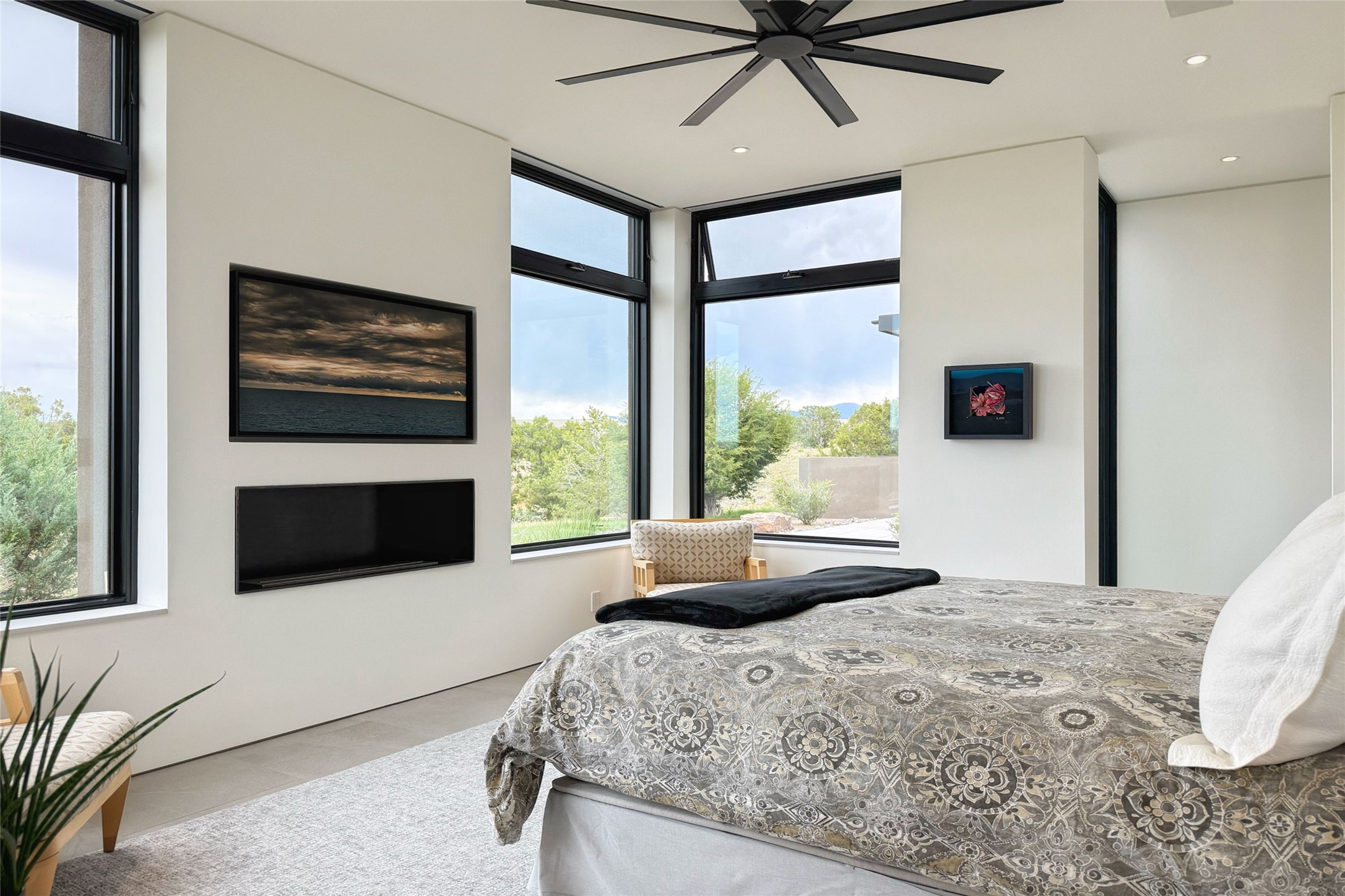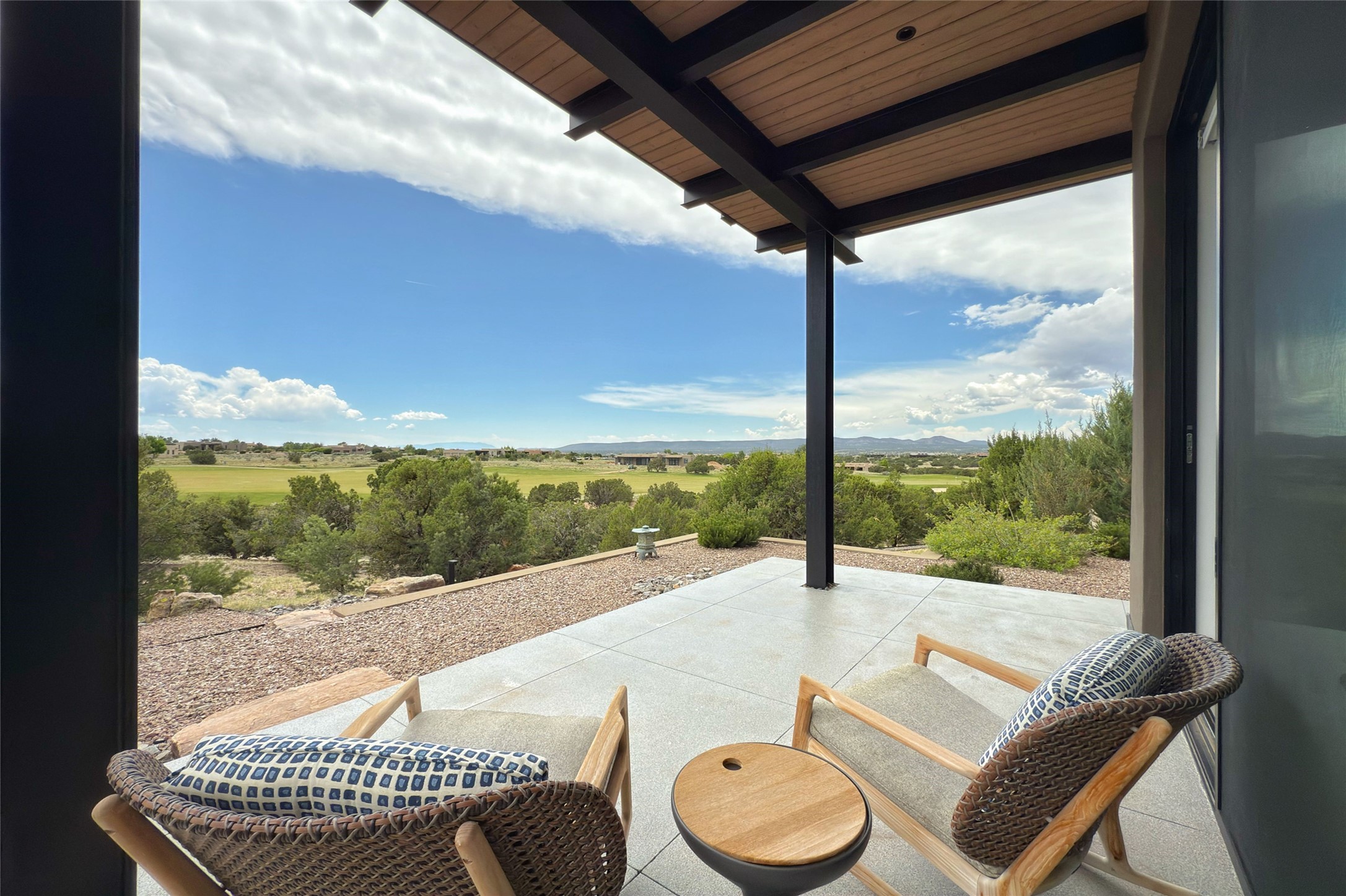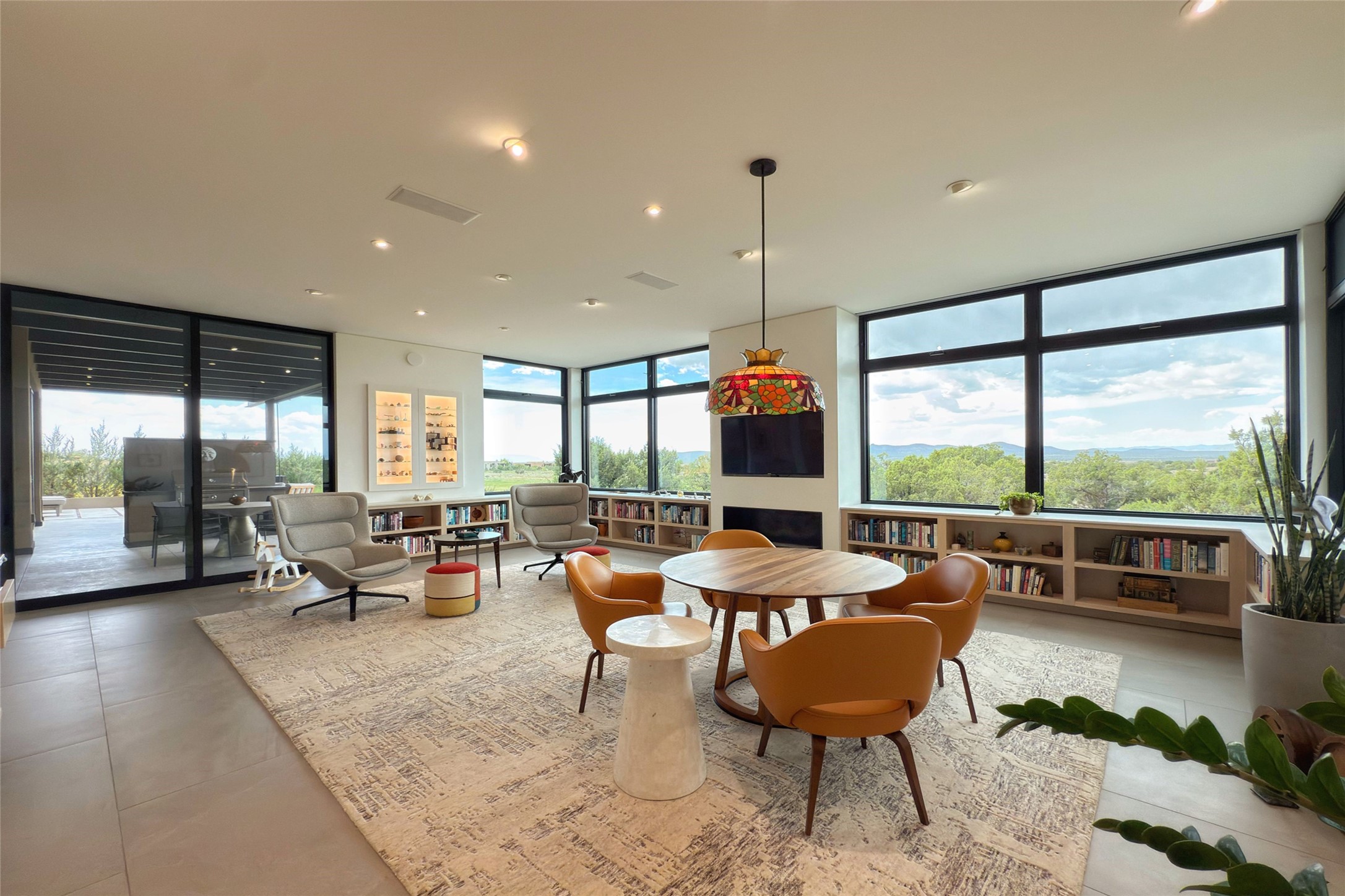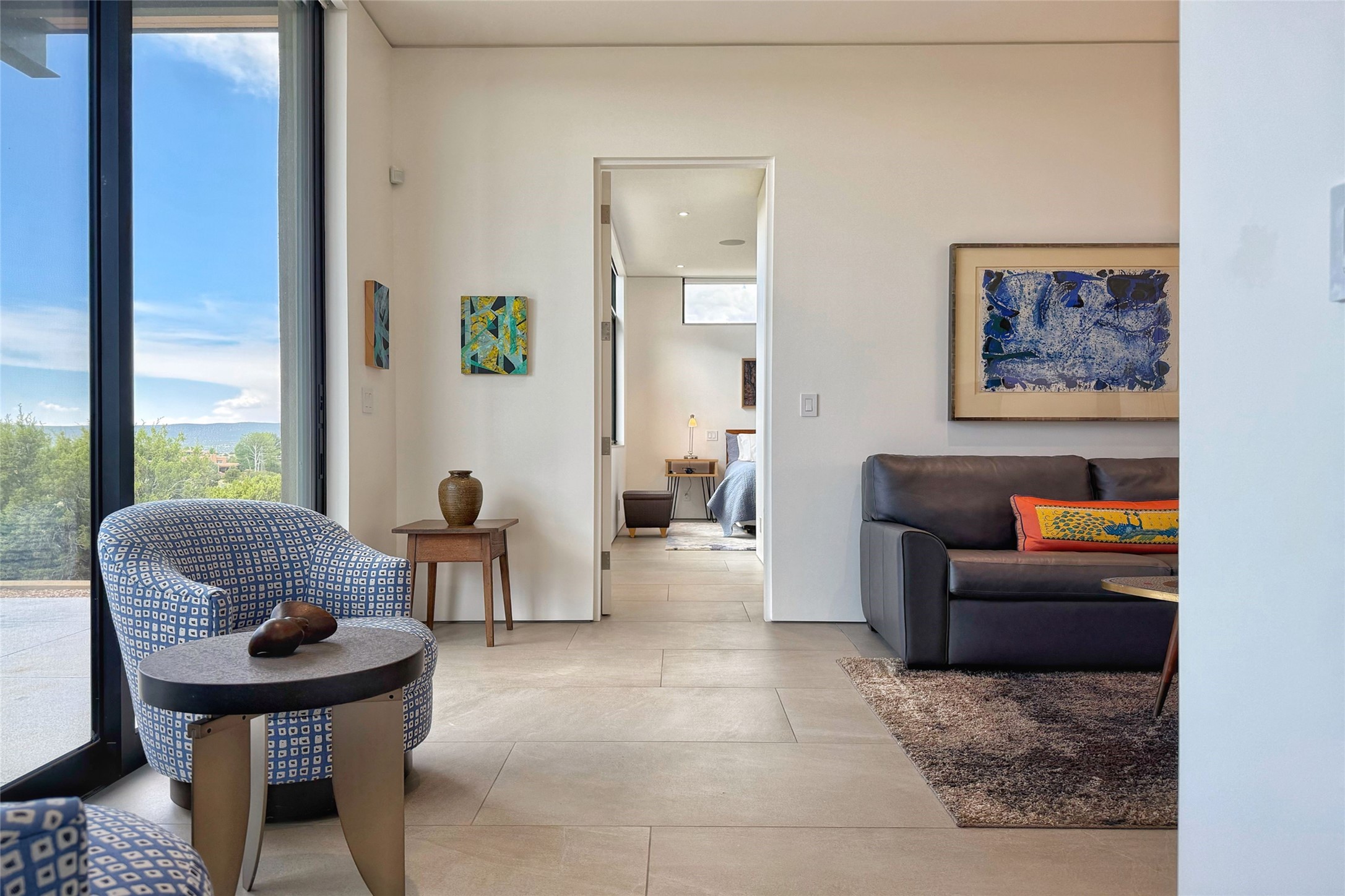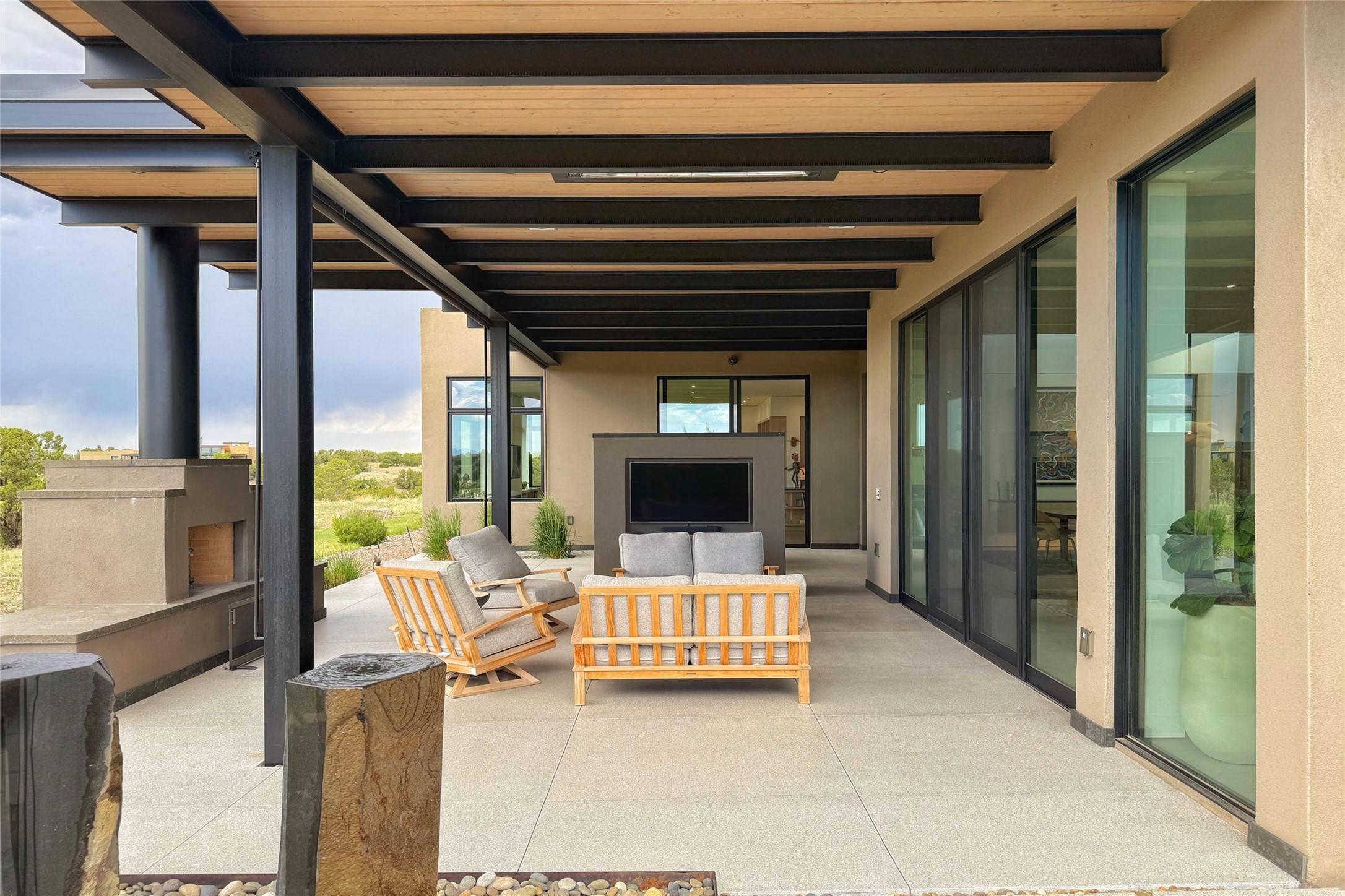 Wall Street Journal House of the Week featured 7/11/25. Artful design meets exceptional functionality in this striking contemporary estate, brilliantly conceived by renowned architect Lorn Tryk, and built by Prull Custom Builders. Resting on 4 acres, this home is a rare synthesis of modern form and high-performance living. A peaceful water feature welcomes you where a snow-melt walkway leads to a dramatic glass entry and gallery-style hall--perfect for displaying fine art. Inside, Tryk's "floating" walls, vanities, and cabinetry create a fabulous play of light and shadow. The dining room stuns with 17-foot clerestory ceilings, 72-inch EcoSmart fireplace, and floor-to-ceiling glass sliders opening to a heated portal, with in-ground hot tub, wood burning fireplace, and views of the Jemez and golf course. The chef's kitchen is built to entertain. A wraparound layout conceals a butler's pantry, while leathered granite counters, rift white oak cabinetry, steam and convection ovens, Sub-Zero wine storage, and a Grohe Blue seltzer system offer top-tier culinary tools. The primary suite is a sanctuary, complete with Ecosmart fireplace, in-suite gym, and a spa-style bath with walk-through triple-head shower. The guest wing includes two en-suites and a sitting area leads to a covered portal. For work and creativity, the home offers two distinct offices. One includes cabinetry with walnut countertops and a spacious craft table, while the other features skylights and massive storage for art supplies. This space could easily be converted into a fourth bedroom with bath. Smart home features include radiant in-floor heating and cooling and concealed media in the living room with sliding art panels to hide the TV. An integrated audiophile sound system by Linn operates in five locations. The three-car garage includes a dedicated RV bay and 50 amp EV charger. A truly distinctive property--thoughtfully designed, rich in detail, and purposefully built for elegant living and entertaining.