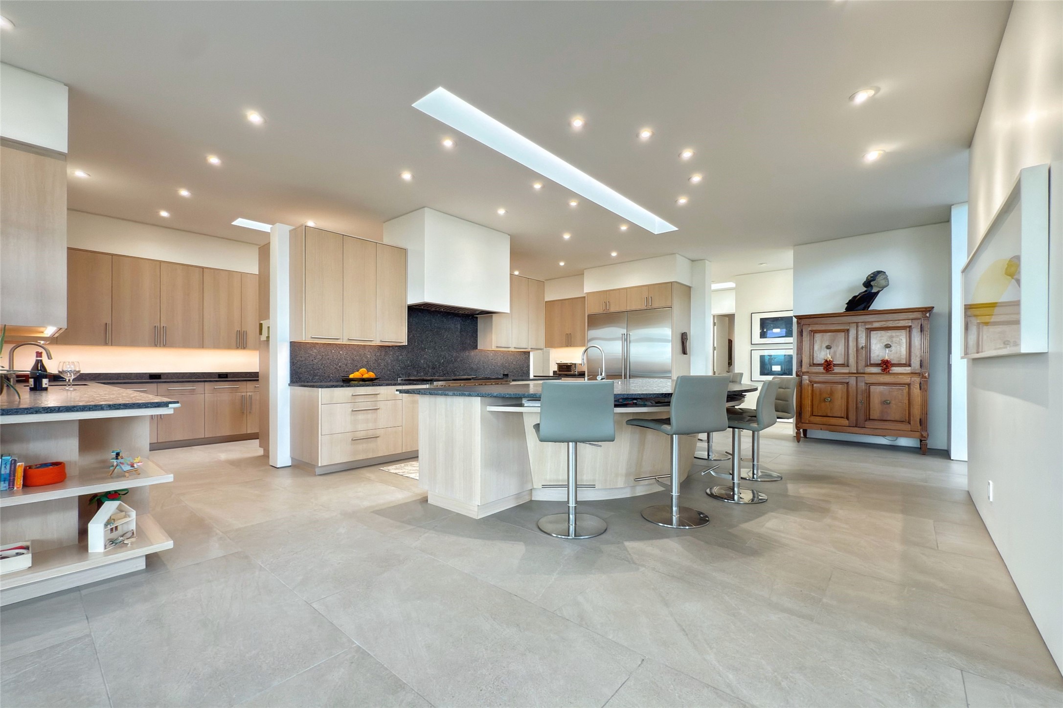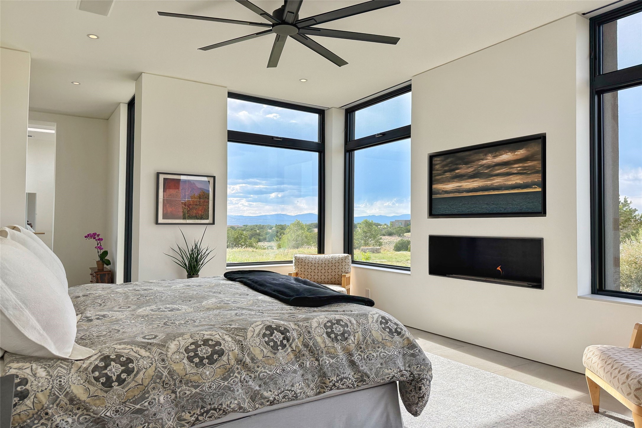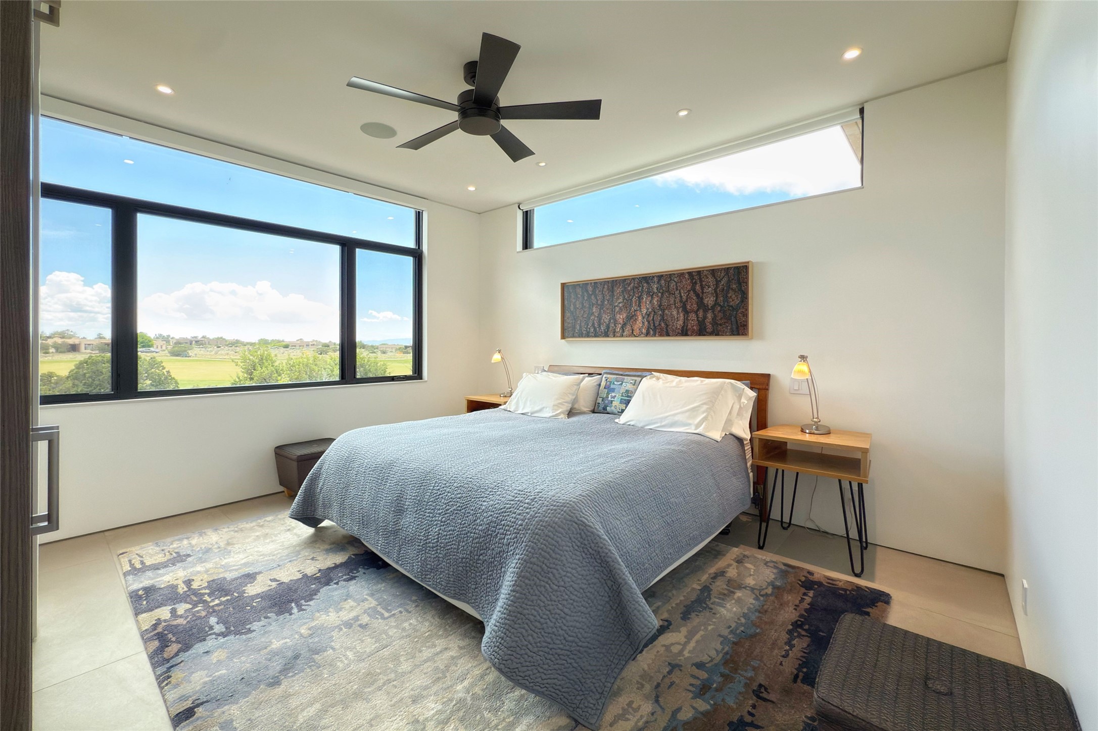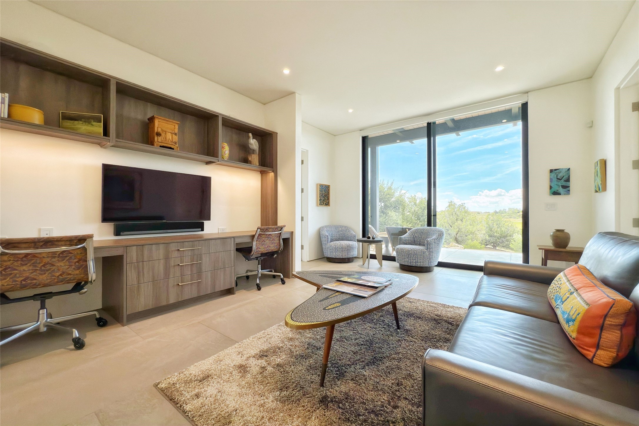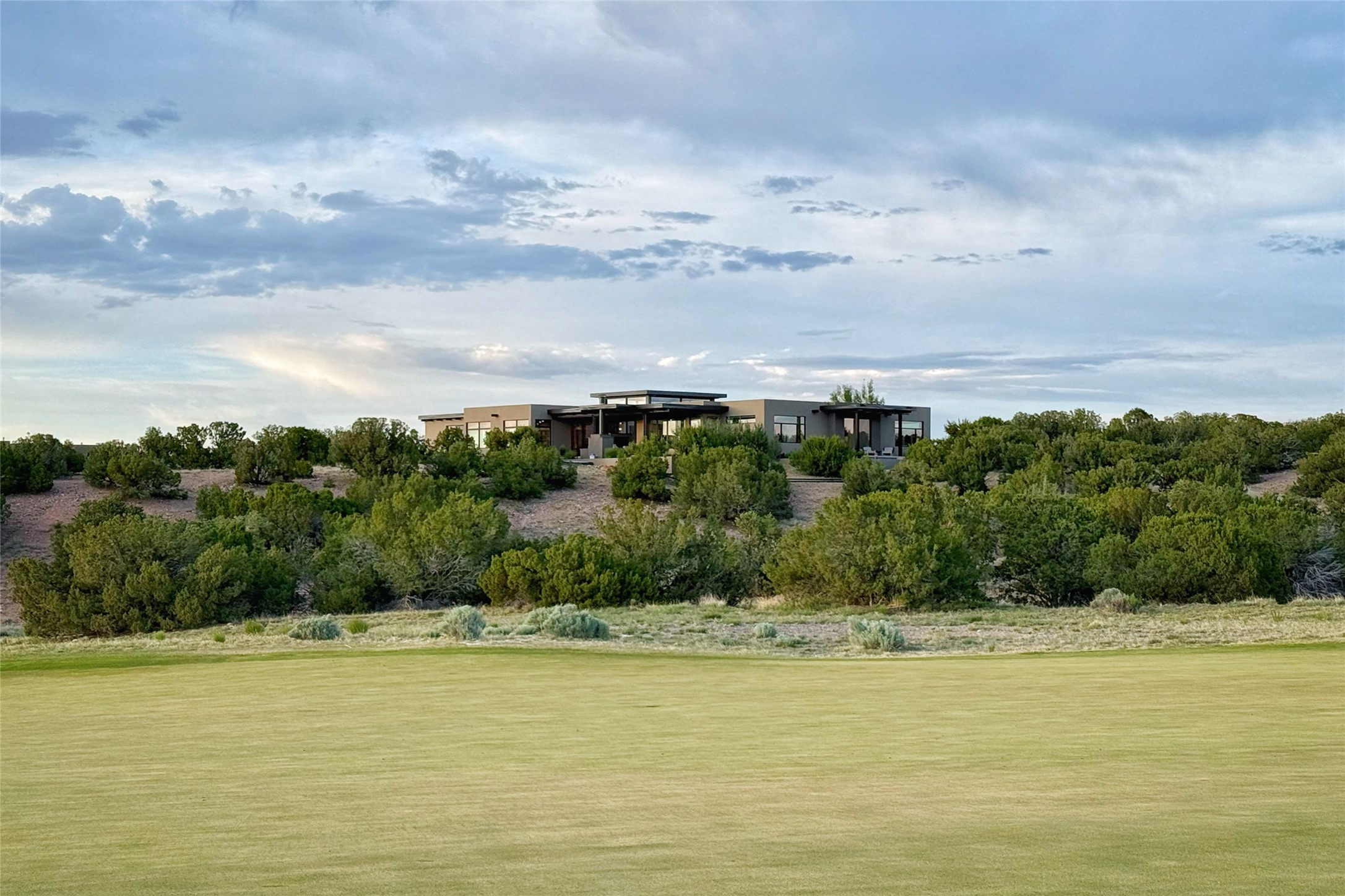 Wall Street Journal House of the Week featured 7/11/25. Artful design meets exceptional functionality in this striking contemporary estate, brilliantly conceived by renowned architect Lorn Tryk, and built by Prull Custom Builders. Resting on 4 acres, this home is a rare synthesis of modern form and high-performance living. A peaceful water feature welcomes you where a snow-melt walkway leads to a dramatic glass entry and gallery-style hall--perfect for displaying fine art. Inside, Tryk's "floating" walls, vanities, and cabinetry create a fabulous play of light and shadow. The dining room stuns with 17-foot clerestory ceilings, 72-inch EcoSmart fireplace, and floor-to-ceiling glass sliders opening to a heated portal, with in-ground hot tub, wood burning fireplace, and views of the Jemez and golf course. The chef's kitchen is built to entertain. A wraparound layout conceals a butler's pantry, while leathered granite counters, rift white oak cabinetry, steam and convection ovens, Sub-Zero wine storage, and a Grohe Blue seltzer system offer top-tier culinary tools. The primary suite is a sanctuary, complete with Ecosmart fireplace, in-suite gym, and a spa-style bath with walk-through triple-head shower. The guest wing includes two en-suites and a sitting area leads to a covered portal. For work and creativity, the home offers two distinct offices. One includes cabinetry with walnut countertops and a spacious craft table, while the other features skylights and massive storage for art supplies. This space could easily be converted into a fourth bedroom with bath. Smart home features include radiant in-floor heating and cooling and concealed media in the living room with sliding art panels to hide the TV. An integrated audiophile sound system by Linn operates in five locations. The three-car garage includes a dedicated RV bay and 50 amp EV charger. A truly distinctive property--thoughtfully designed, rich in detail, and purposefully built for elegant living and entertaining.