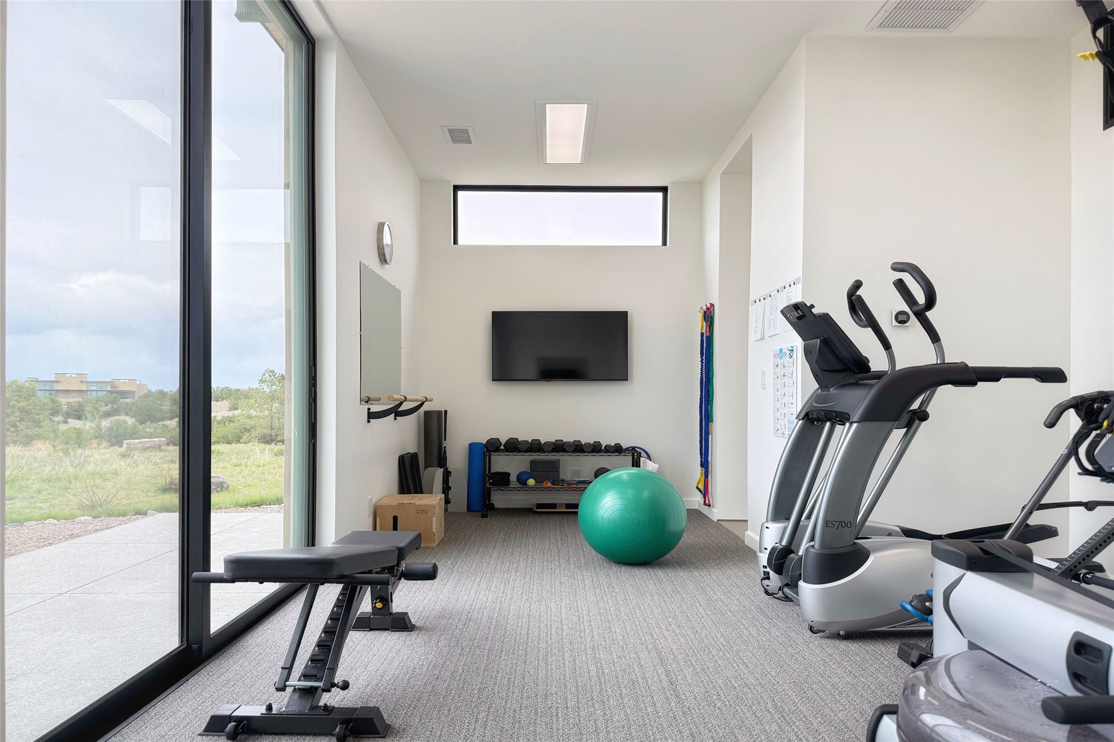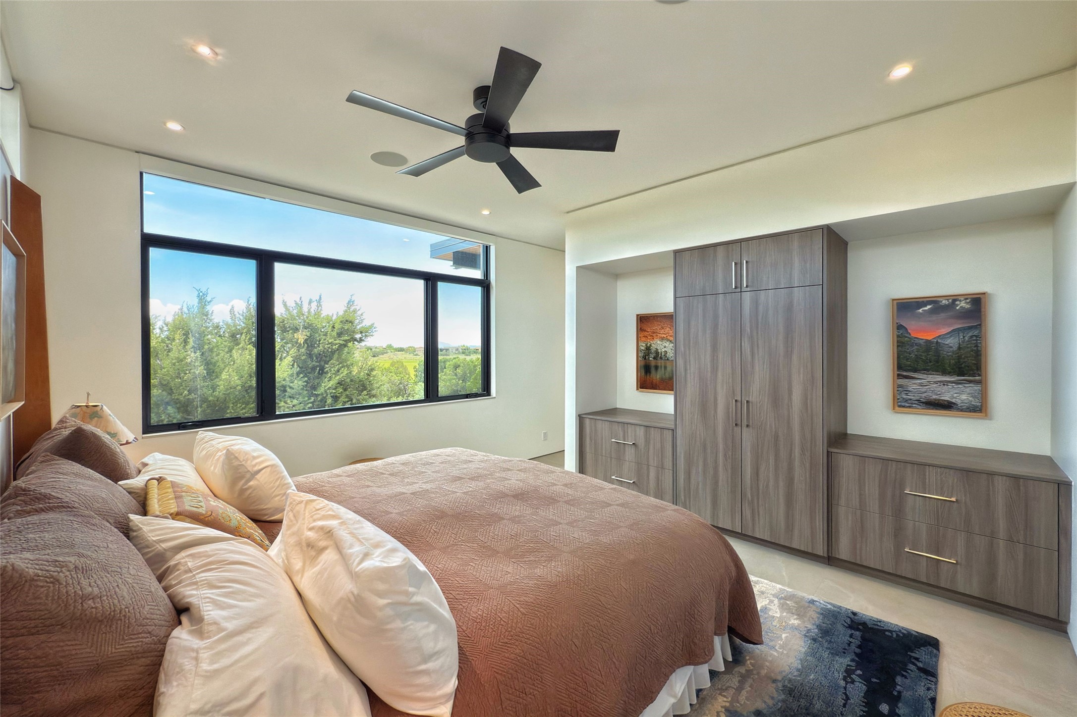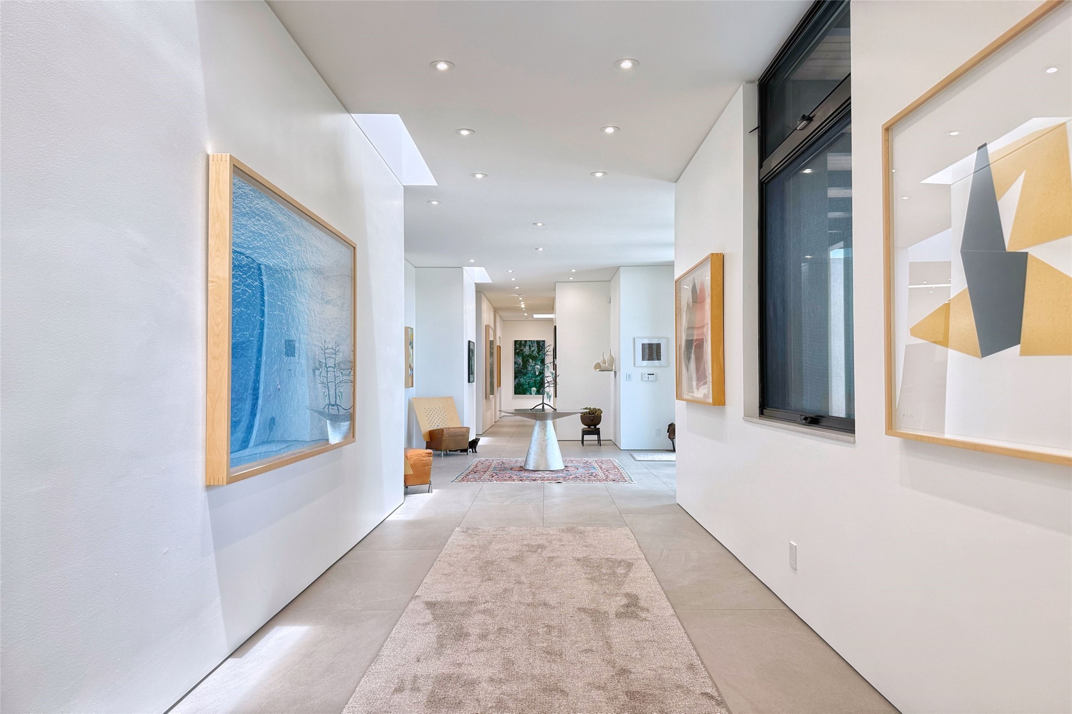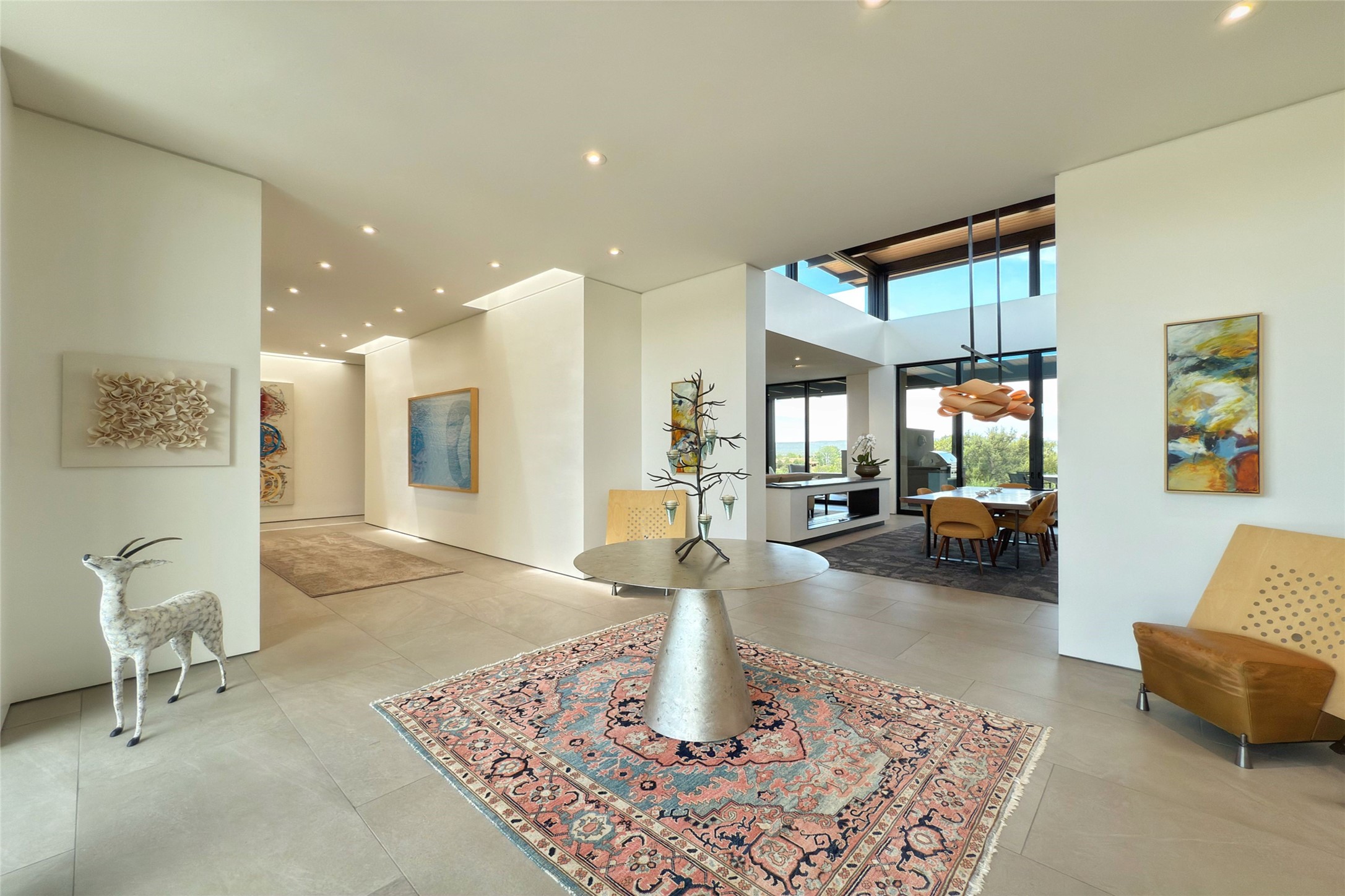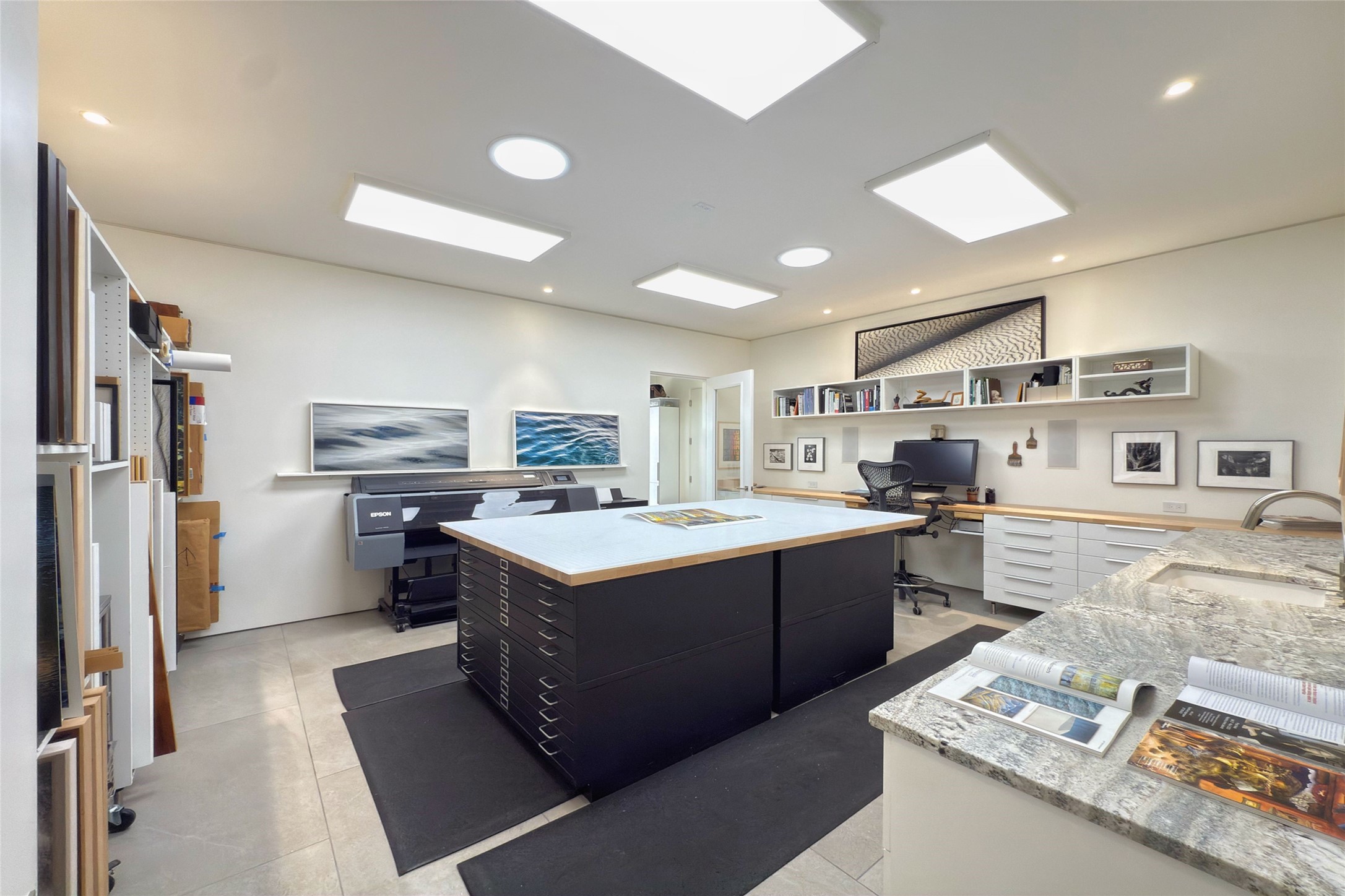 Wall Street Journal House of the Week featured 7/11/25. Artful design meets exceptional functionality in this striking contemporary estate, brilliantly conceived by renowned architect Lorn Tryk, and built by Prull Custom Builders. Resting on 4 acres, this home is a rare synthesis of modern form and high-performance living. A peaceful water feature welcomes you where a snow-melt walkway leads to a dramatic glass entry and gallery-style hall--perfect for displaying fine art. Inside, Tryk's "floating" walls, vanities, and cabinetry create a fabulous play of light and shadow. The dining room stuns with 17-foot clerestory ceilings, 72-inch EcoSmart fireplace, and floor-to-ceiling glass sliders opening to a heated portal, with in-ground hot tub, wood burning fireplace, and views of the Jemez and golf course. The chef's kitchen is built to entertain. A wraparound layout conceals a butler's pantry, while leathered granite counters, rift white oak cabinetry, steam and convection ovens, Sub-Zero wine storage, and a Grohe Blue seltzer system offer top-tier culinary tools. The primary suite is a sanctuary, complete with Ecosmart fireplace, in-suite gym, and a spa-style bath with walk-through triple-head shower. The guest wing includes two en-suites and a sitting area leads to a covered portal. For work and creativity, the home offers two distinct offices. One includes cabinetry with walnut countertops and a spacious craft table, while the other features skylights and massive storage for art supplies. This space could easily be converted into a fourth bedroom with bath. Smart home features include radiant in-floor heating and cooling and concealed media in the living room with sliding art panels to hide the TV. An integrated audiophile sound system by Linn operates in five locations. The three-car garage includes a dedicated RV bay and 50 amp EV charger. A truly distinctive property--thoughtfully designed, rich in detail, and purposefully built for elegant living and entertaining.
