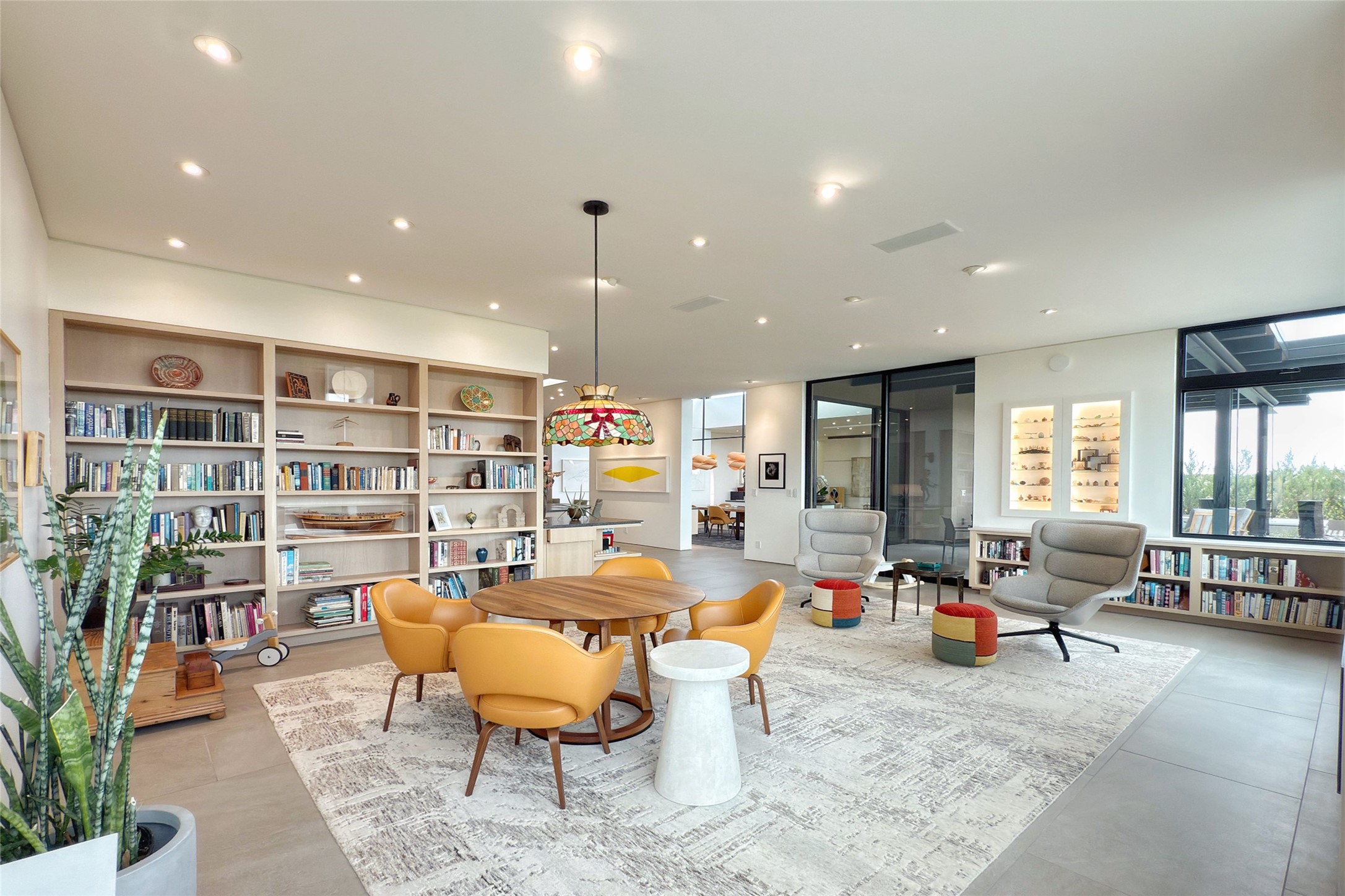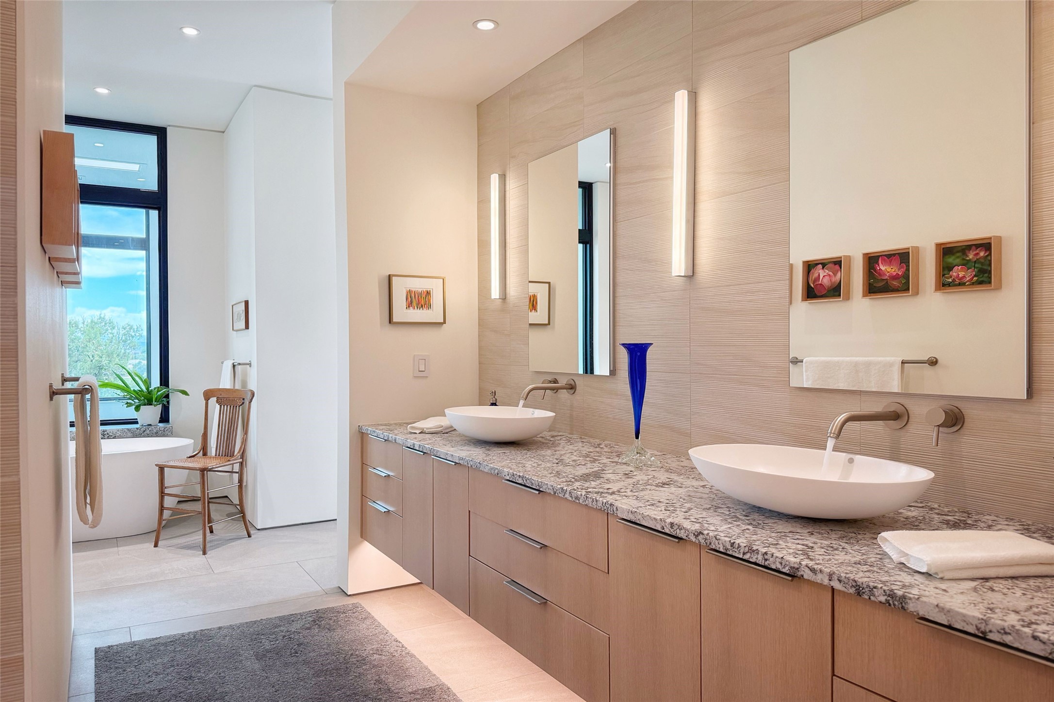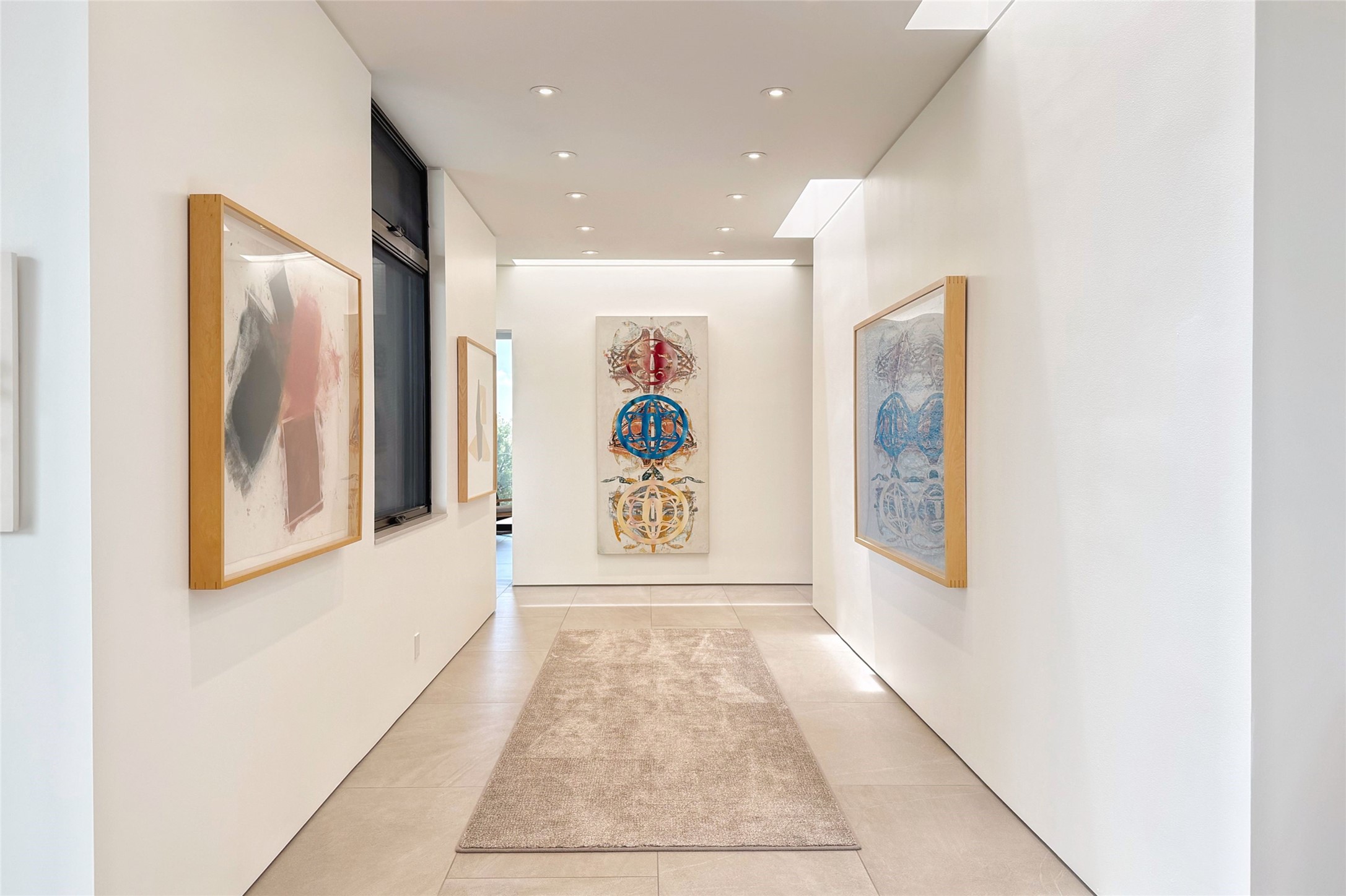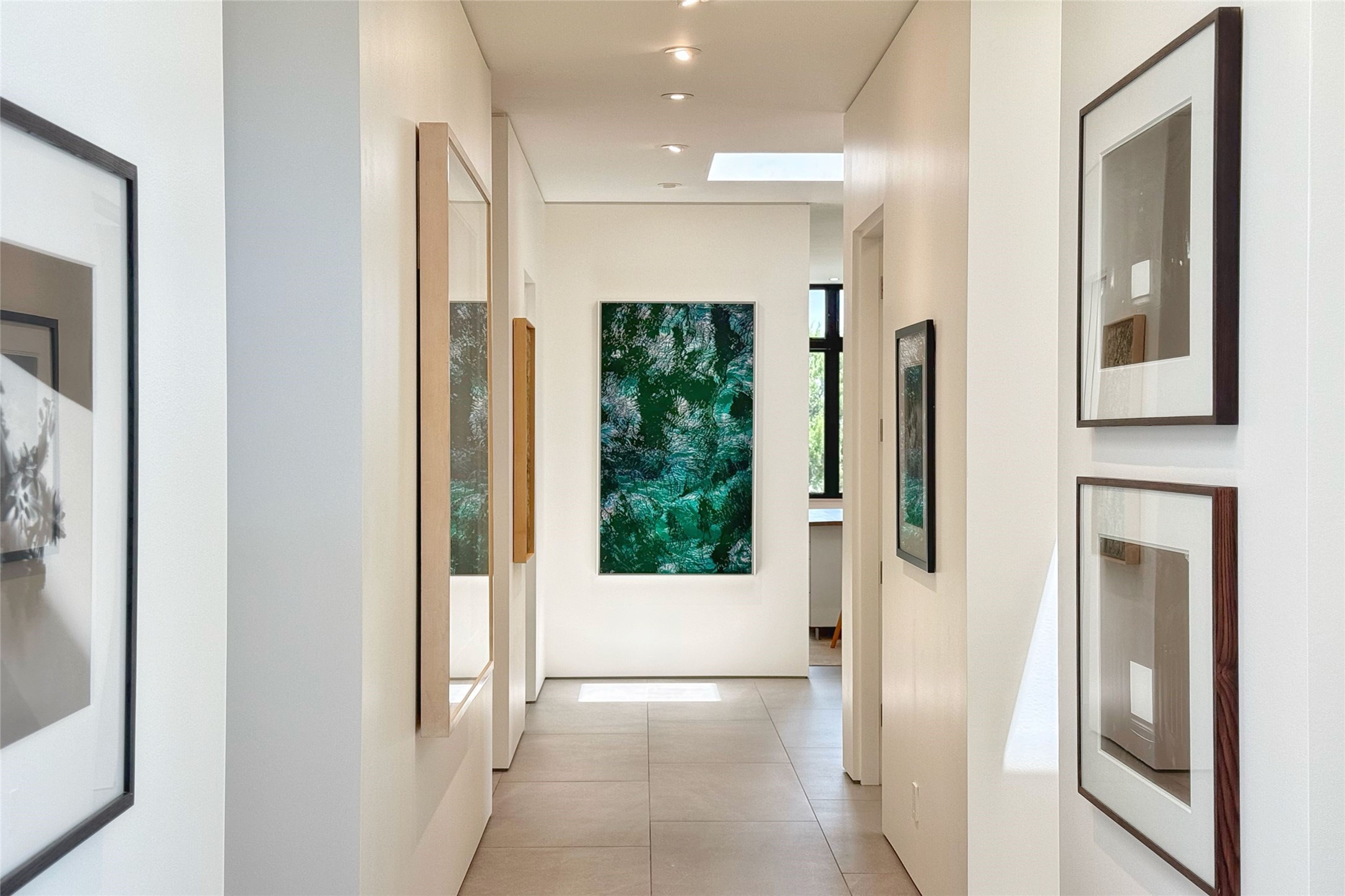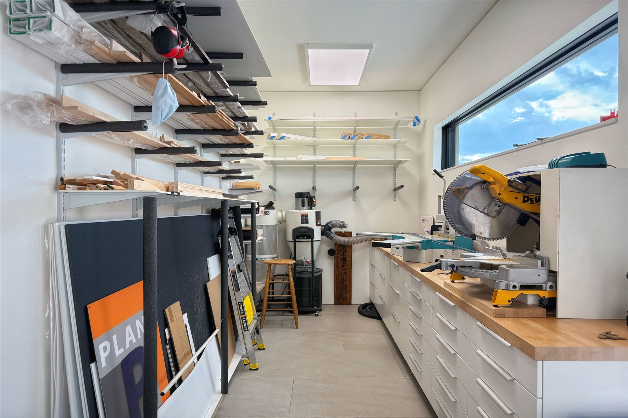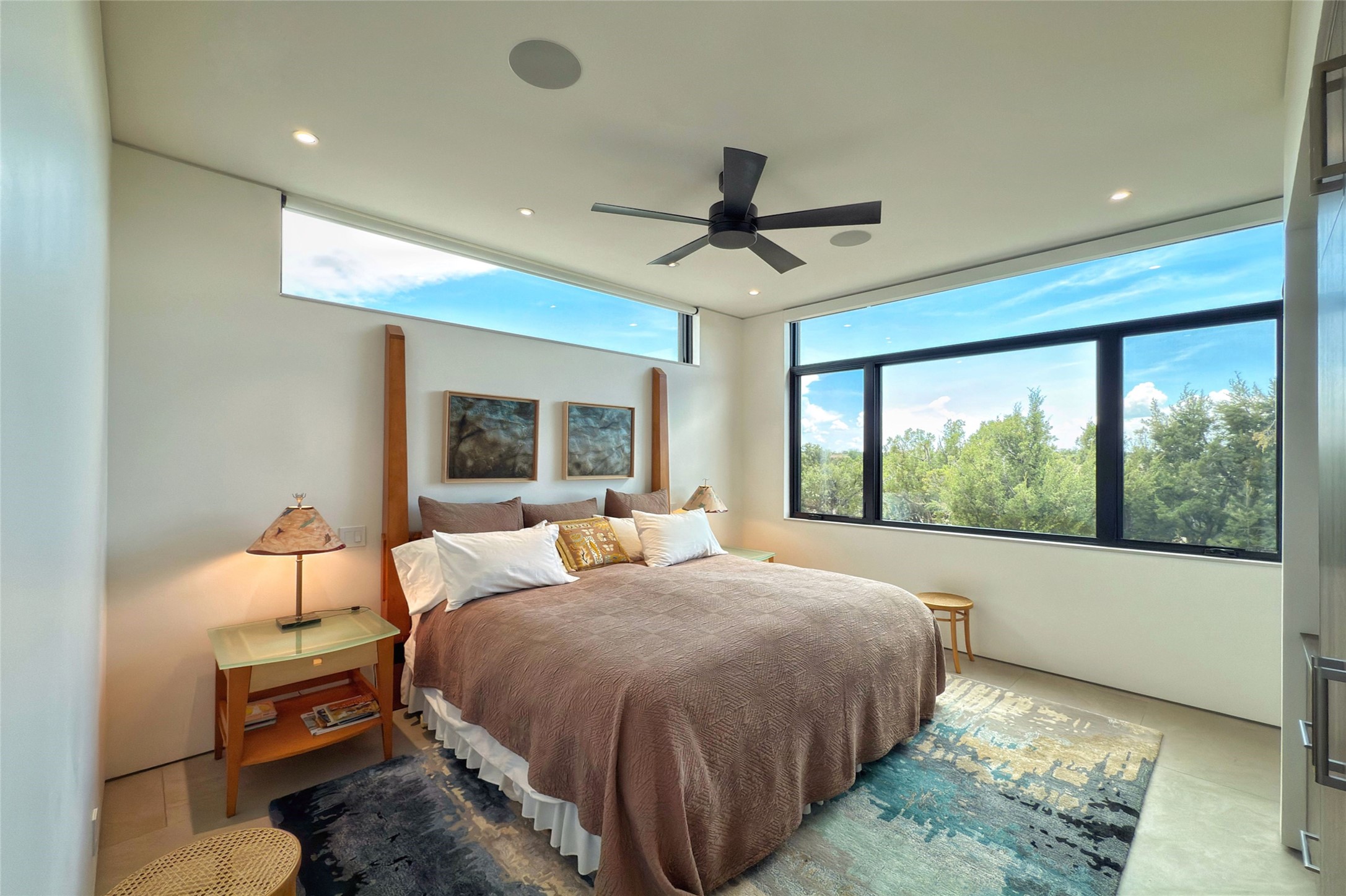 Wall Street Journal House of the Week featured 7/11/25. Artful design meets exceptional functionality in this striking contemporary estate, brilliantly conceived by renowned architect Lorn Tryk, and built by Prull Custom Builders. Resting on 4 acres, this home is a rare synthesis of modern form and high-performance living. A peaceful water feature welcomes you where a snow-melt walkway leads to a dramatic glass entry and gallery-style hall--perfect for displaying fine art. Inside, Tryk's "floating" walls, vanities, and cabinetry create a fabulous play of light and shadow. The dining room stuns with 17-foot clerestory ceilings, 72-inch EcoSmart fireplace, and floor-to-ceiling glass sliders opening to a heated portal, with in-ground hot tub, wood burning fireplace, and views of the Jemez and golf course. The chef's kitchen is built to entertain. A wraparound layout conceals a butler's pantry, while leathered granite counters, rift white oak cabinetry, steam and convection ovens, Sub-Zero wine storage, and a Grohe Blue seltzer system offer top-tier culinary tools. The primary suite is a sanctuary, complete with Ecosmart fireplace, in-suite gym, and a spa-style bath with walk-through triple-head shower. The guest wing includes two en-suites and a sitting area leads to a covered portal. For work and creativity, the home offers two distinct offices. One includes cabinetry with walnut countertops and a spacious craft table, while the other features skylights and massive storage for art supplies. This space could easily be converted into a fourth bedroom with bath. Smart home features include radiant in-floor heating and cooling and concealed media in the living room with sliding art panels to hide the TV. An integrated audiophile sound system by Linn operates in five locations. The three-car garage includes a dedicated RV bay and 50 amp EV charger. A truly distinctive property--thoughtfully designed, rich in detail, and purposefully built for elegant living and entertaining.