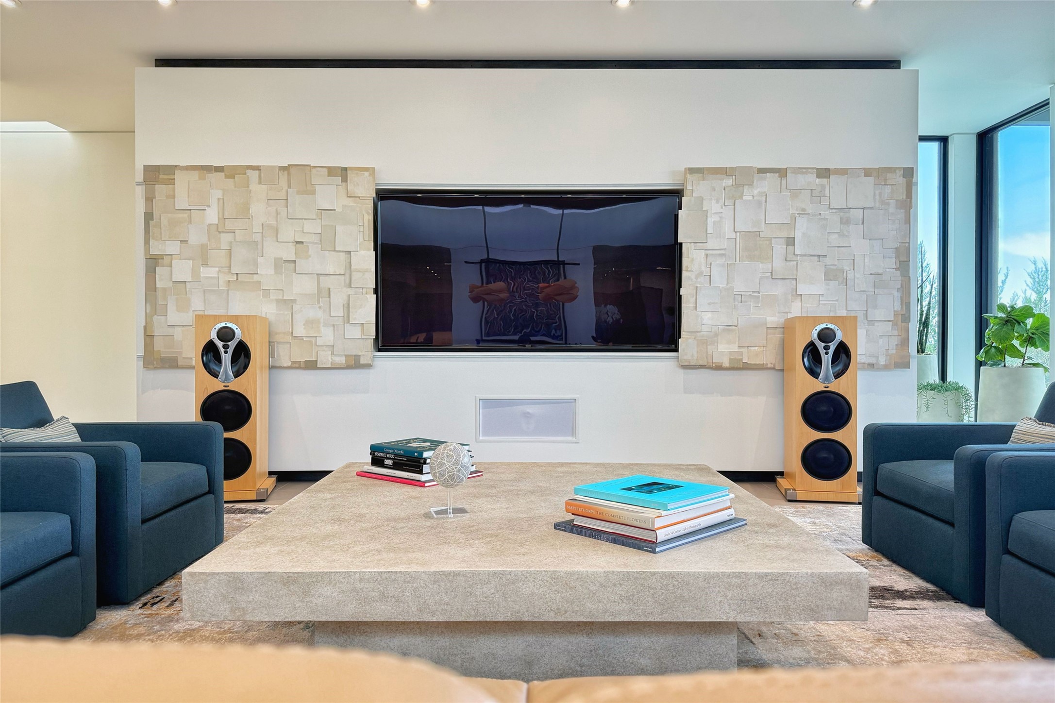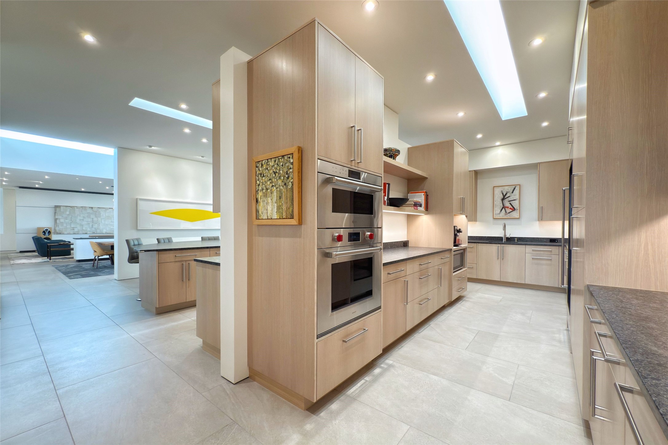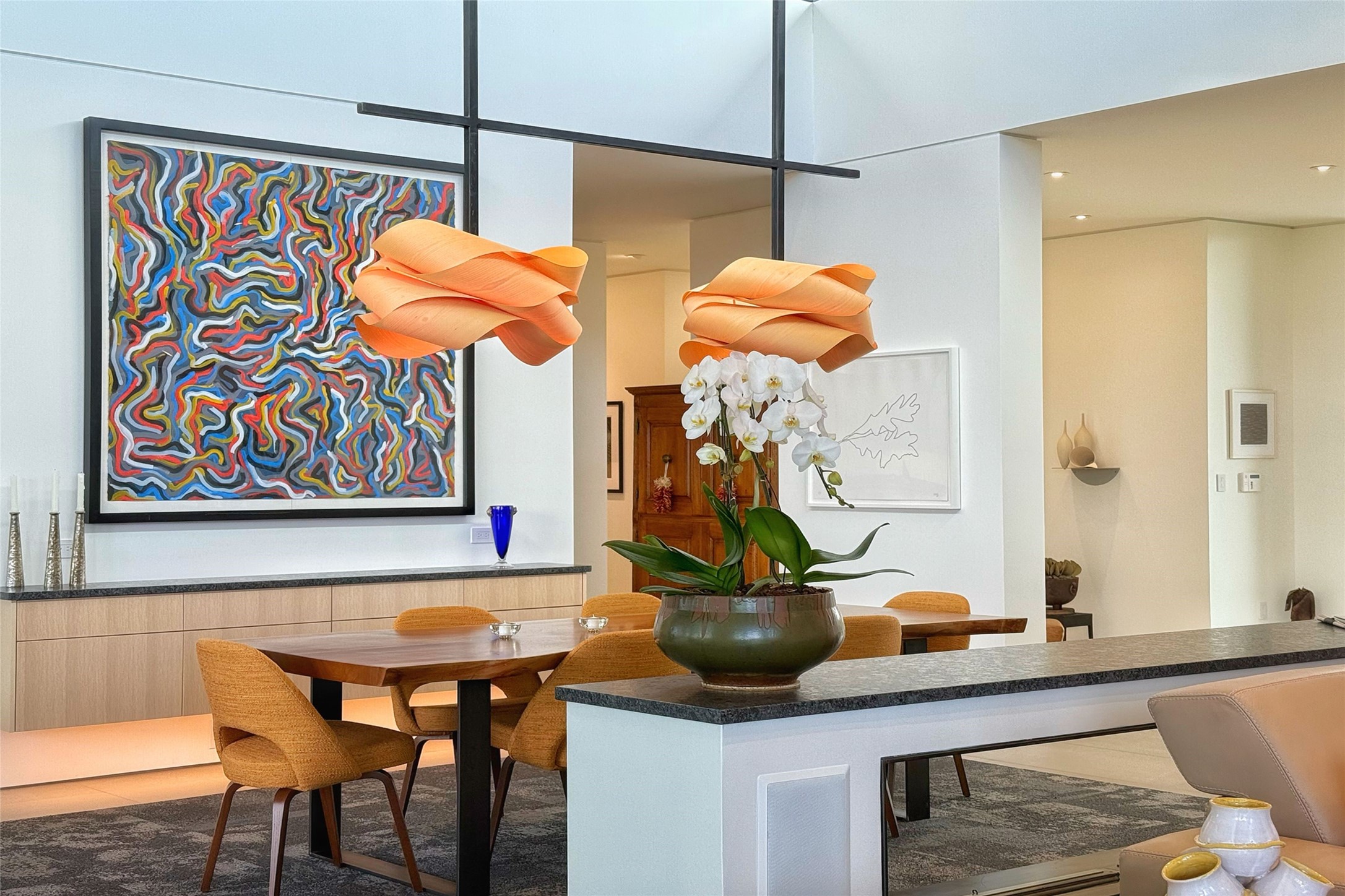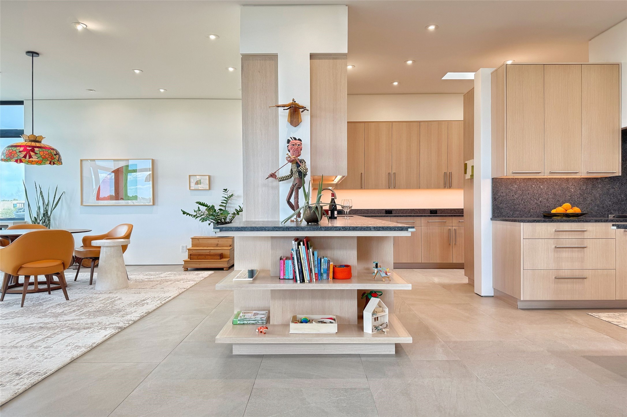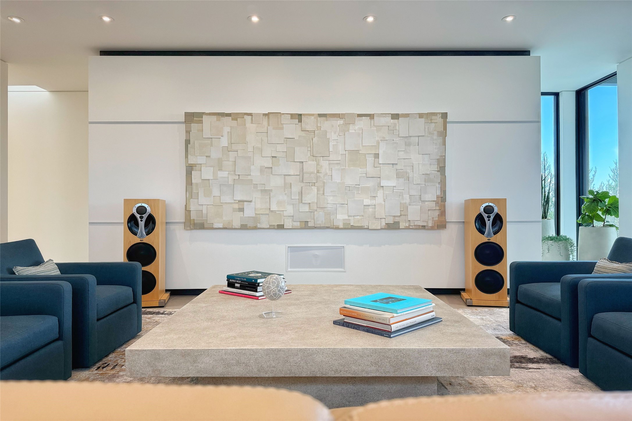 Wall Street Journal House of the Week featured 7/11/25. Artful design meets exceptional functionality in this striking contemporary estate, brilliantly conceived by renowned architect Lorn Tryk, and built by Prull Custom Builders. Resting on 4 acres, this home is a rare synthesis of modern form and high-performance living. A peaceful water feature welcomes you where a snow-melt walkway leads to a dramatic glass entry and gallery-style hall--perfect for displaying fine art. Inside, Tryk's "floating" walls, vanities, and cabinetry create a fabulous play of light and shadow. The dining room stuns with 17-foot clerestory ceilings, 72-inch EcoSmart fireplace, and floor-to-ceiling glass sliders opening to a heated portal, with in-ground hot tub, wood burning fireplace, and views of the Jemez and golf course. The chef's kitchen is built to entertain. A wraparound layout conceals a butler's pantry, while leathered granite counters, rift white oak cabinetry, steam and convection ovens, Sub-Zero wine storage, and a Grohe Blue seltzer system offer top-tier culinary tools. The primary suite is a sanctuary, complete with Ecosmart fireplace, in-suite gym, and a spa-style bath with walk-through triple-head shower. The guest wing includes two en-suites and a sitting area leads to a covered portal. For work and creativity, the home offers two distinct offices. One includes cabinetry with walnut countertops and a spacious craft table, while the other features skylights and massive storage for art supplies. This space could easily be converted into a fourth bedroom with bath. Smart home features include radiant in-floor heating and cooling and concealed media in the living room with sliding art panels to hide the TV. An integrated audiophile sound system by Linn operates in five locations. The three-car garage includes a dedicated RV bay and 50 amp EV charger. A truly distinctive property--thoughtfully designed, rich in detail, and purposefully built for elegant living and entertaining.