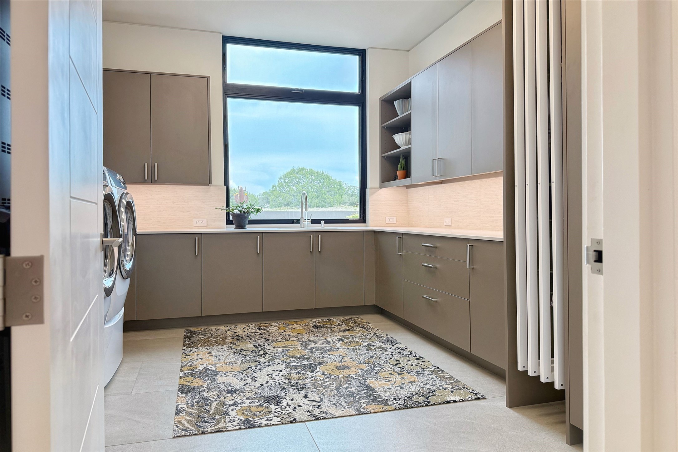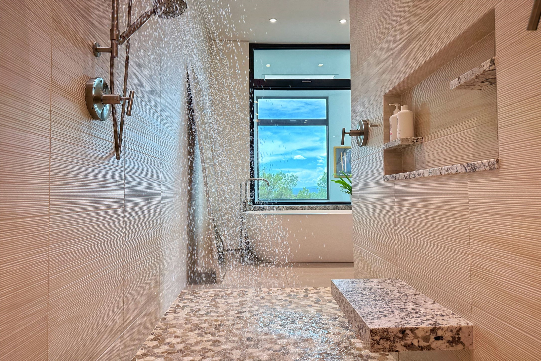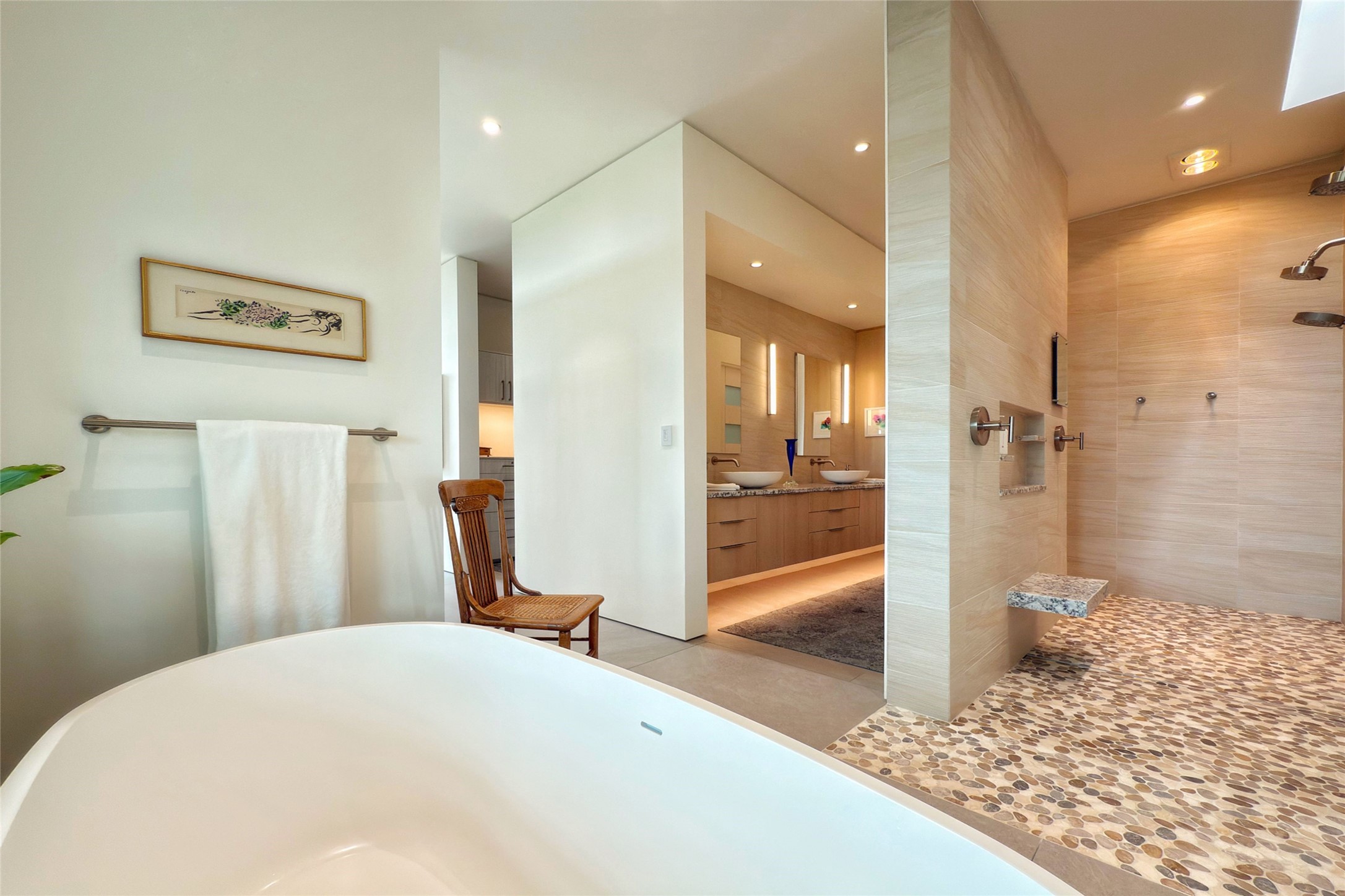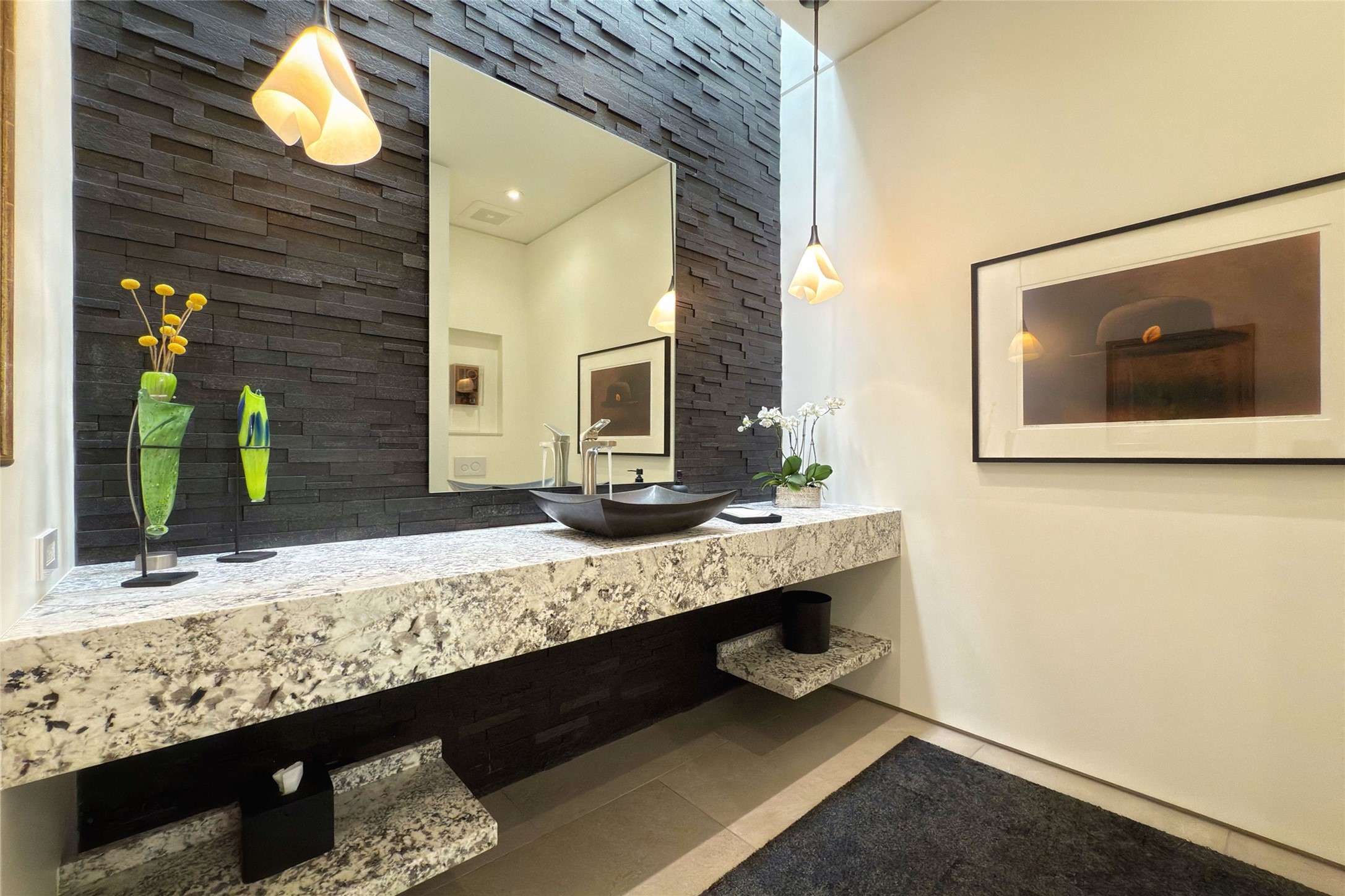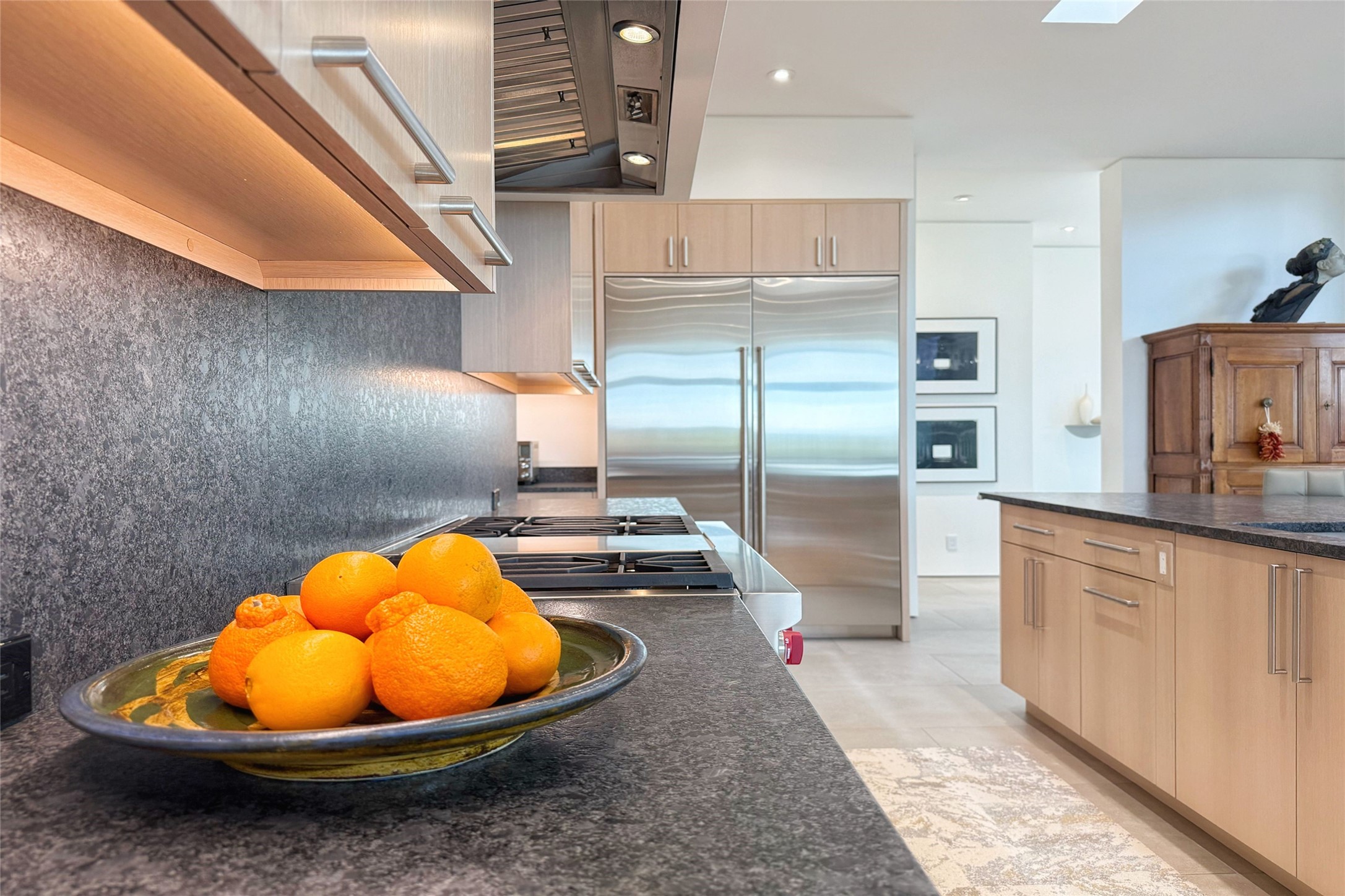 Wall Street Journal House of the Week featured 7/11/25. Artful design meets exceptional functionality in this striking contemporary estate, brilliantly conceived by renowned architect Lorn Tryk, and built by Prull Custom Builders. Resting on 4 acres, this home is a rare synthesis of modern form and high-performance living. A peaceful water feature welcomes you where a snow-melt walkway leads to a dramatic glass entry and gallery-style hall--perfect for displaying fine art. Inside, Tryk's "floating" walls, vanities, and cabinetry create a fabulous play of light and shadow. The dining room stuns with 17-foot clerestory ceilings, 72-inch EcoSmart fireplace, and floor-to-ceiling glass sliders opening to a heated portal, with in-ground hot tub, wood burning fireplace, and views of the Jemez and golf course. The chef's kitchen is built to entertain. A wraparound layout conceals a butler's pantry, while leathered granite counters, rift white oak cabinetry, steam and convection ovens, Sub-Zero wine storage, and a Grohe Blue seltzer system offer top-tier culinary tools. The primary suite is a sanctuary, complete with Ecosmart fireplace, in-suite gym, and a spa-style bath with walk-through triple-head shower. The guest wing includes two en-suites and a sitting area leads to a covered portal. For work and creativity, the home offers two distinct offices. One includes cabinetry with walnut countertops and a spacious craft table, while the other features skylights and massive storage for art supplies. This space could easily be converted into a fourth bedroom with bath. Smart home features include radiant in-floor heating and cooling and concealed media in the living room with sliding art panels to hide the TV. An integrated audiophile sound system by Linn operates in five locations. The three-car garage includes a dedicated RV bay and 50 amp EV charger. A truly distinctive property--thoughtfully designed, rich in detail, and purposefully built for elegant living and entertaining.