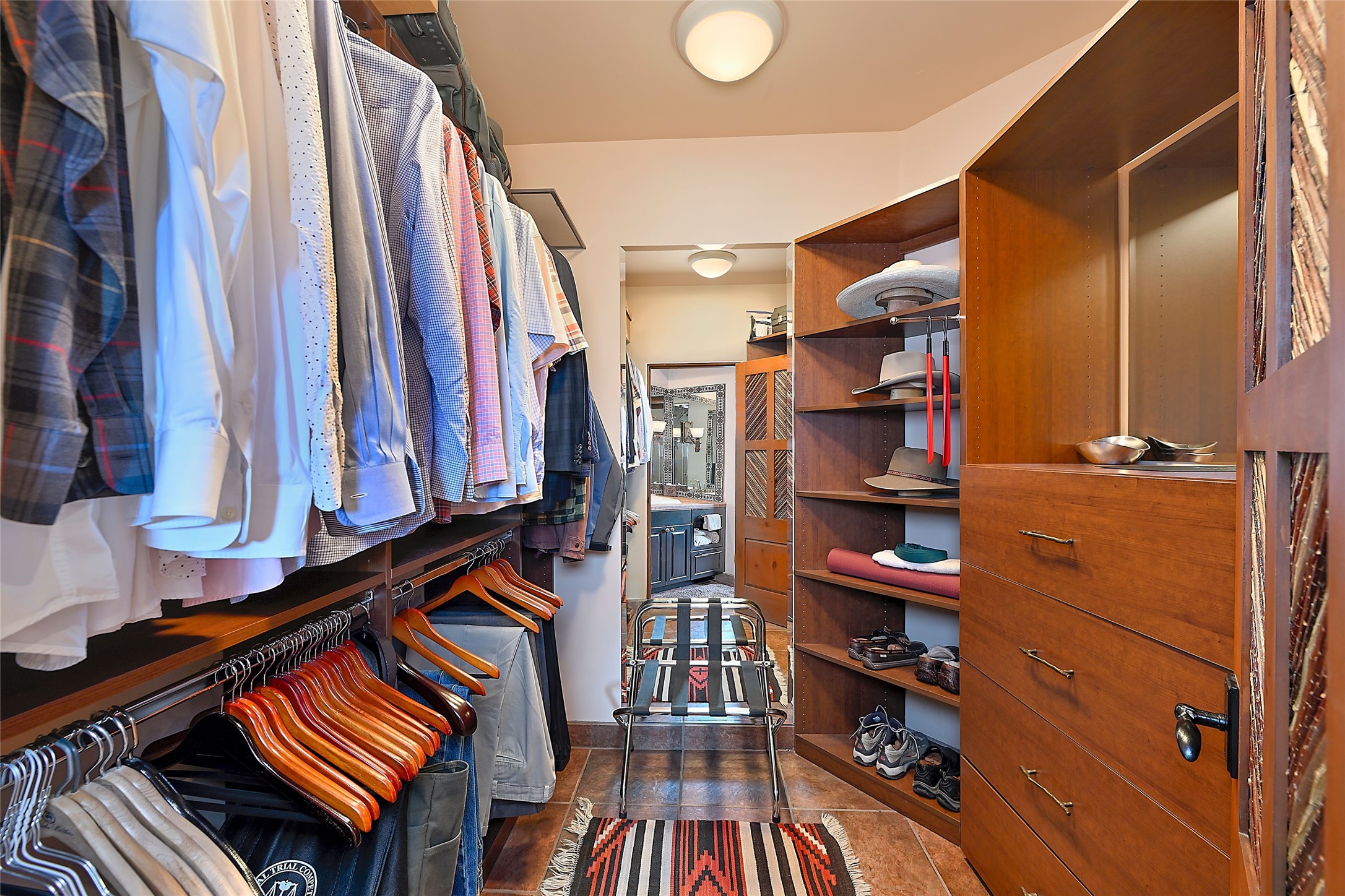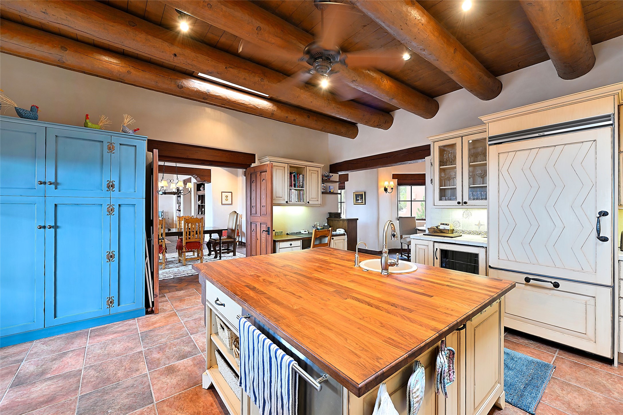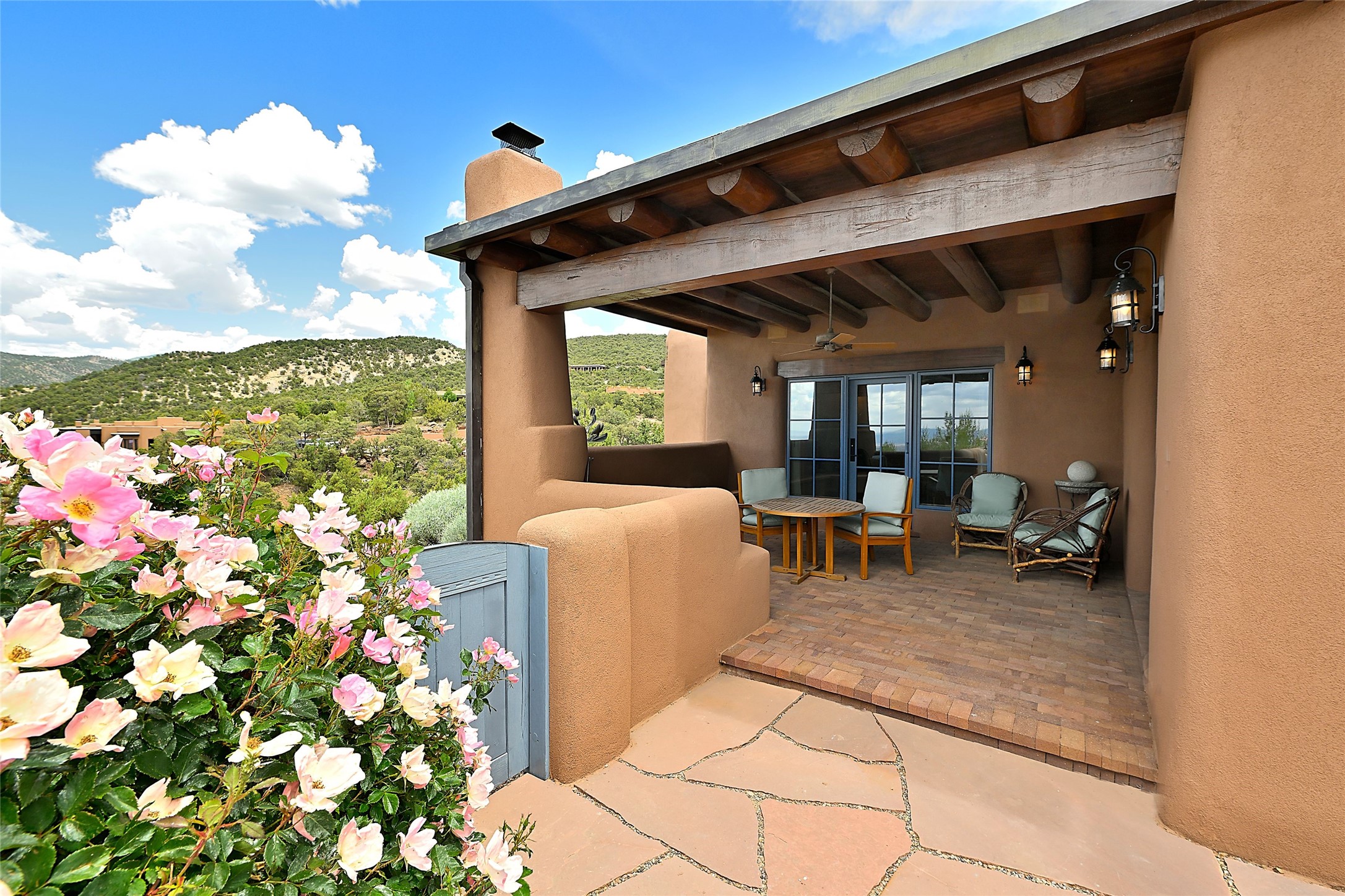 A true masterpiece of Spanish Pueblo architecture, this exceptional residence in Bishop's Lodge Hills is a stunning collaboration between acclaimed architect Ed Boniface and master builder Will Prull. Designed and constructed in 2007 for the current owner, with meticulous attention to detail, this home seamlessly blends traditional craftsmanship with modern luxury, all while capturing commanding views of the surrounding mountains and breathtaking sunsets. Upon entering the foyer, guests are enveloped in a space inspired by the sacred geometry of a Navajo Hogan, setting the tone for the rich architectural heritage woven throughout the home. The grand living room boasts soaring beamed ceilings supported by hand-carved corbels, while a striking fireplace design--borrowed from ancient traditions--serves as a warm and welcoming focal point. The formal dining area opens gracefully onto the Grand Portal, which leads to an expansive rooftop deck, offering panoramic vistas that define Santa Fe's unparalleled beauty. The chef's kitchen is a showpiece of authenticity and elegance, featuring antiqued custom cabinetry, classic tile countertops and custom carved backsplashes, and top-of-the-line Viking Stainless appliances. At its heart sits a black walnut-topped center island--both functional and visually stunning--complemented by an adjacent breakfast room that overlooks the walled entry courtyard, creating an intimate space for morning gatherings. The luxurious primary suite is a retreat unto itself, complete with a charming gas Kiva fireplace, two spa-like baths, and two walk-in closets. A separate office, situated within the primary wing, provides the perfect setting for focus and creativity. On the opposite wing, comfortable guest suites ensure privacy and tranquility, making this home an ideal sanctuary for both residents and visitors alike. Every aspect of this home's design and construction reflects an extraordinary commitment to craftsmanship, authenticity, and architectural excellence.