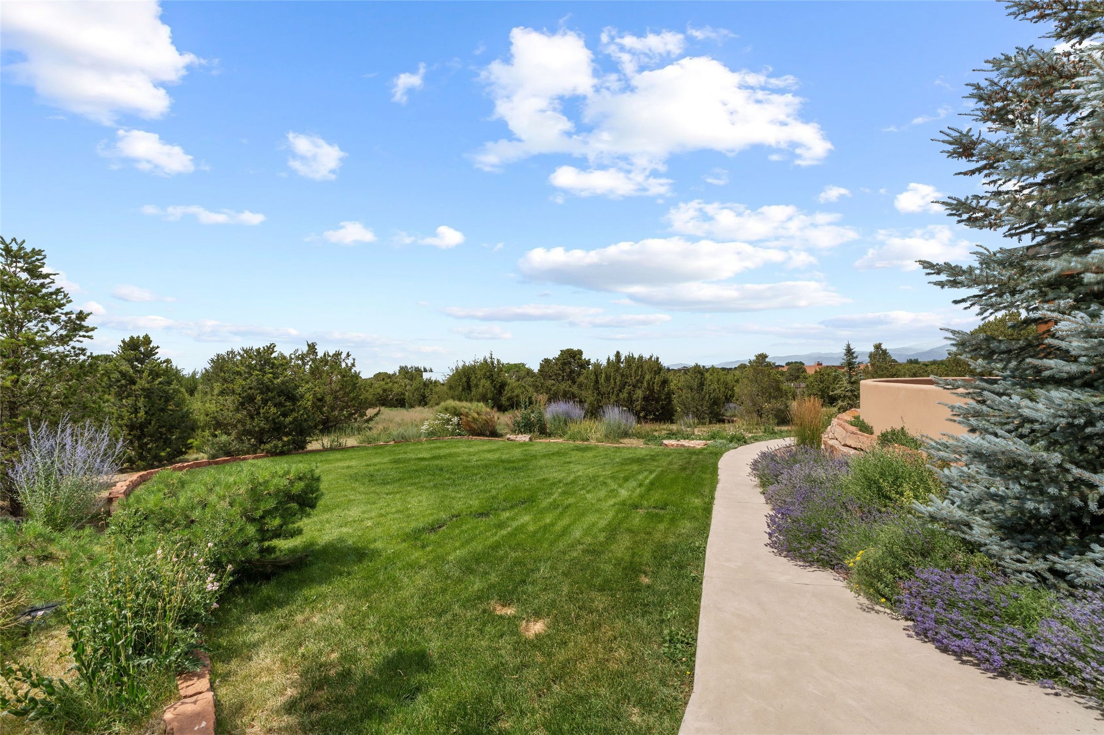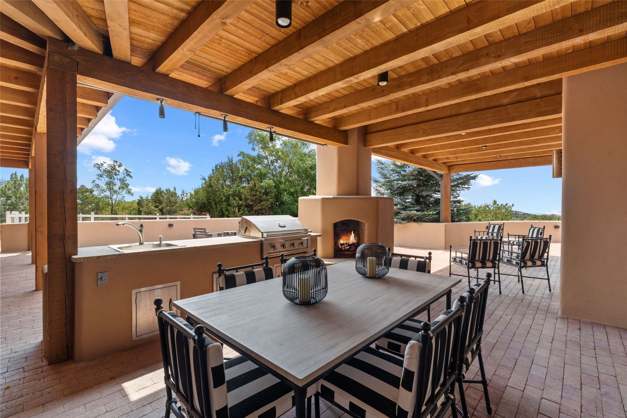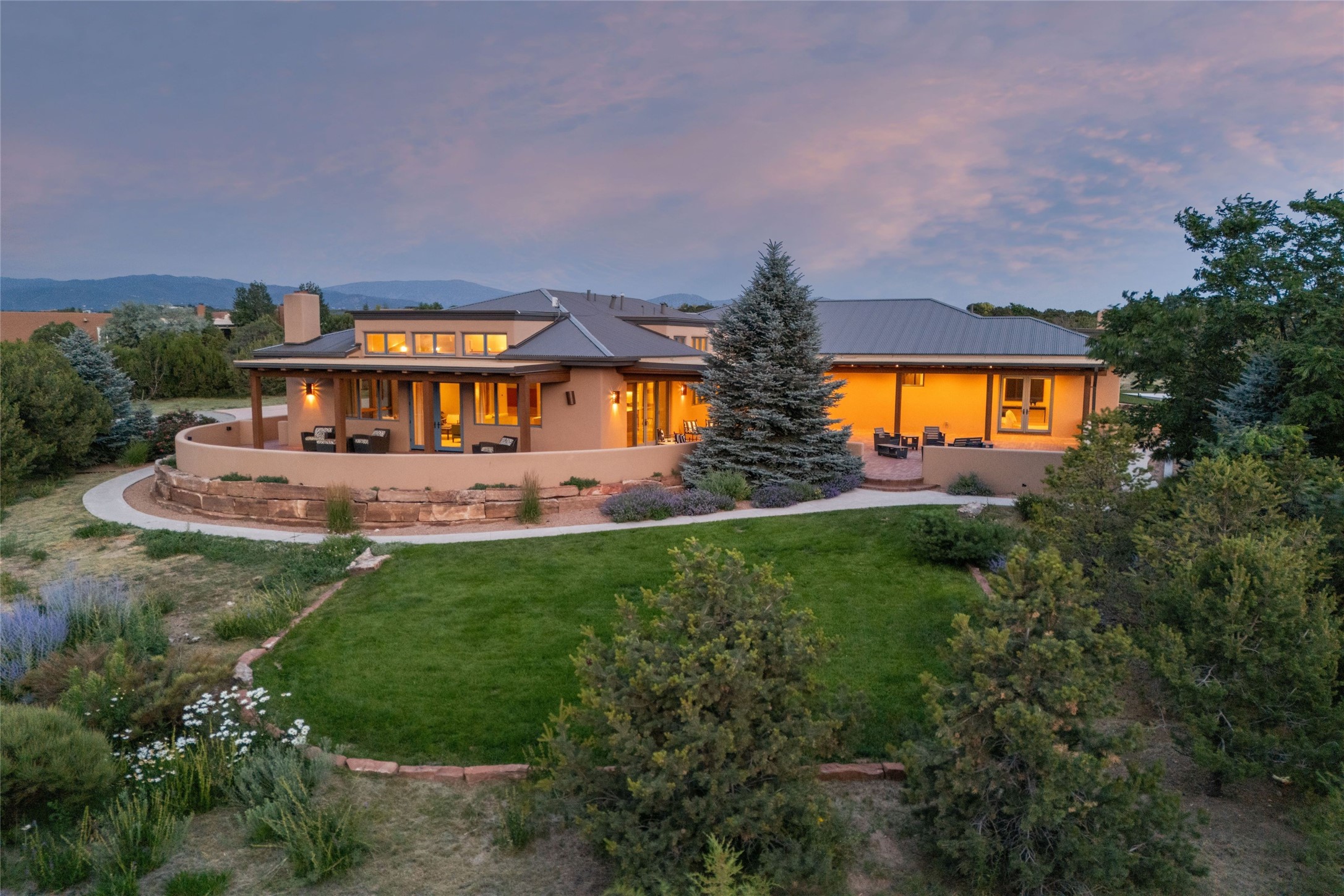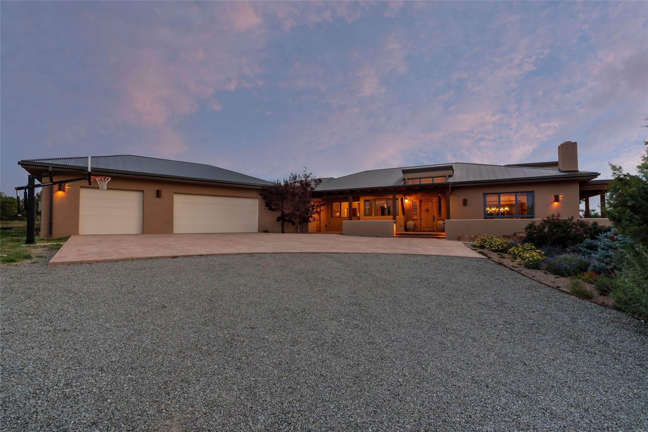 Northern New Mexican style 5-bedroom, 4.5-bath custom-built 5,200 sq. ft. home spanning over 2.5 acres offers panoramic 180-degree views that stretch from the majestic Sangre de Cristo Mountains to the captivating Badlands and Los Alamos.Positioned at the end of a private, gated drive and surrounded by an 8-foot-high coyote fence, this residence is a true entertainer's delight. The open floor plan flows effortlessly into spacious covered and uncovered patios, ideal for hosting both intimate gatherings and grand celebrations. Crafted by Driscoll Construction in 2015, the home showcases bespoke design elements, including custom solid wood doors, white oak flooring, and elegant plaster walls throughout the common areas and primary suite. Enjoy the warmth of three fireplaces, including one on the expansive 1,500 sq. ft. portal, where you can relish both sunrise and sunset vistas.The gourmet kitchen invites culinary creativity with its generous center island, clerestory windows, premium appliances, and double dishwashers. Prioritize wellness with a primary bath steam shower, a 300 sq. ft. gym, an outdoor 6-person sauna, a vegetable garden on drip irrigation, and a fully enclosed chicken coop.Additional highlights include a pitched metal roof, an oversized 3-car garage, photovoltaic solar energy, and rainwater harvesting. Recent upgrades in 2023 encompass new stucco, water filtration, a dog run, and an outdoor grill. Enjoy convenient access to downtown Santa Fe, all while embracing the serene beauty of this exceptional property.