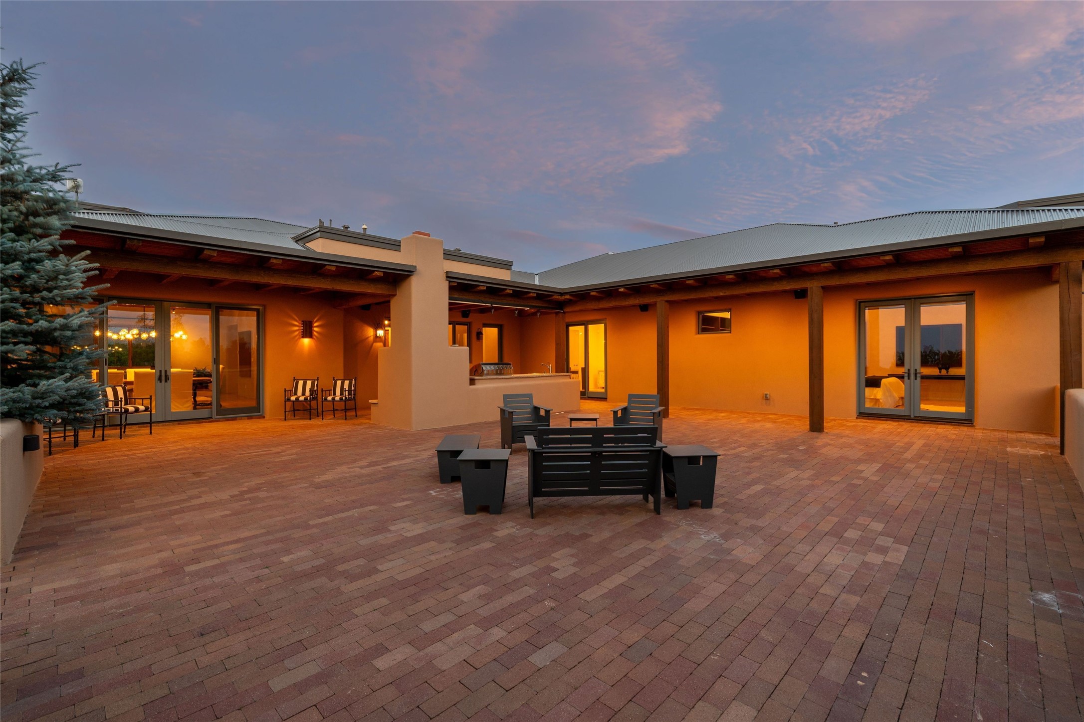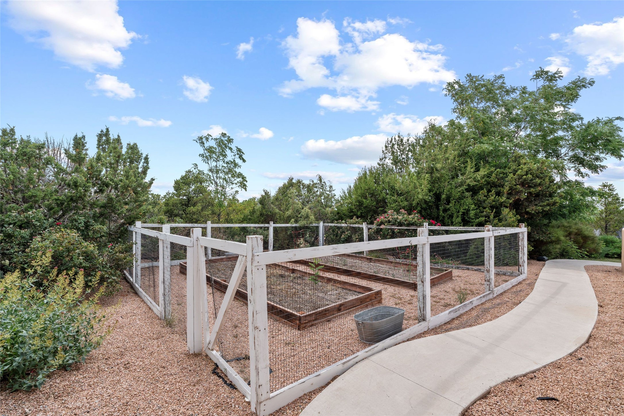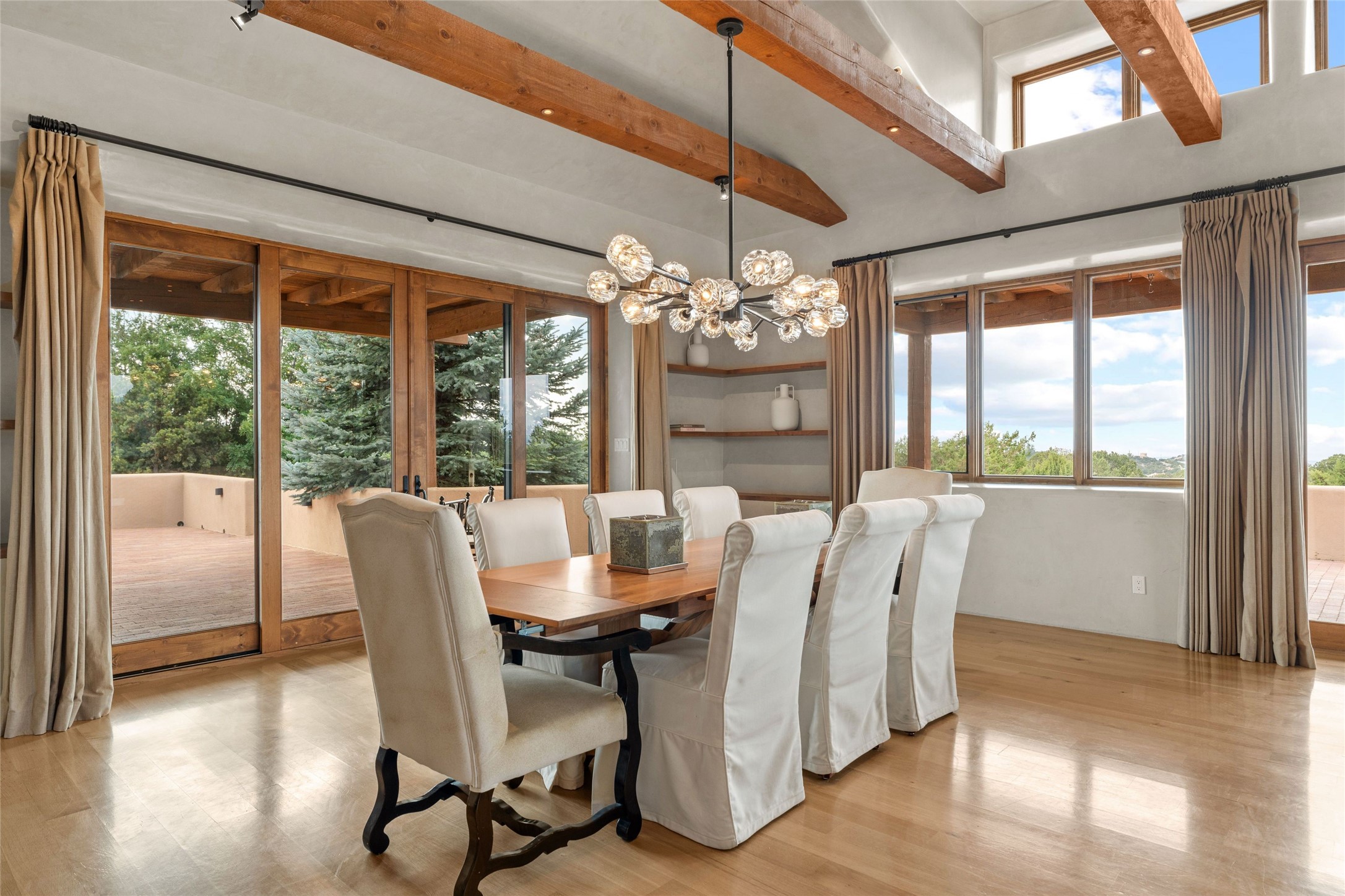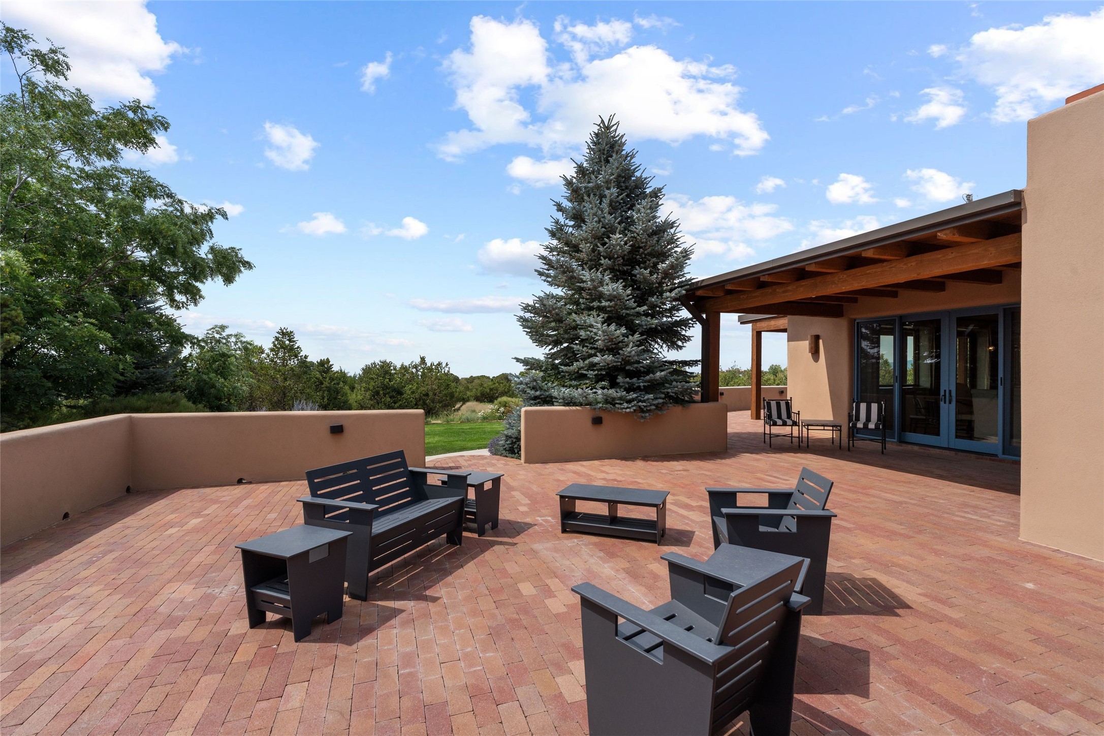 Northern New Mexican style 5-bedroom, 4.5-bath custom-built 5,200 sq. ft. home spanning over 2.5 acres offers panoramic 180-degree views that stretch from the majestic Sangre de Cristo Mountains to the captivating Badlands and Los Alamos.Positioned at the end of a private, gated drive and surrounded by an 8-foot-high coyote fence, this residence is a true entertainer's delight. The open floor plan flows effortlessly into spacious covered and uncovered patios, ideal for hosting both intimate gatherings and grand celebrations. Crafted by Driscoll Construction in 2015, the home showcases bespoke design elements, including custom solid wood doors, white oak flooring, and elegant plaster walls throughout the common areas and primary suite. Enjoy the warmth of three fireplaces, including one on the expansive 1,500 sq. ft. portal, where you can relish both sunrise and sunset vistas.The gourmet kitchen invites culinary creativity with its generous center island, clerestory windows, premium appliances, and double dishwashers. Prioritize wellness with a primary bath steam shower, a 300 sq. ft. gym, an outdoor 6-person sauna, a vegetable garden on drip irrigation, and a fully enclosed chicken coop.Additional highlights include a pitched metal roof, an oversized 3-car garage, photovoltaic solar energy, and rainwater harvesting. Recent upgrades in 2023 encompass new stucco, water filtration, a dog run, and an outdoor grill. Enjoy convenient access to downtown Santa Fe, all while embracing the serene beauty of this exceptional property.