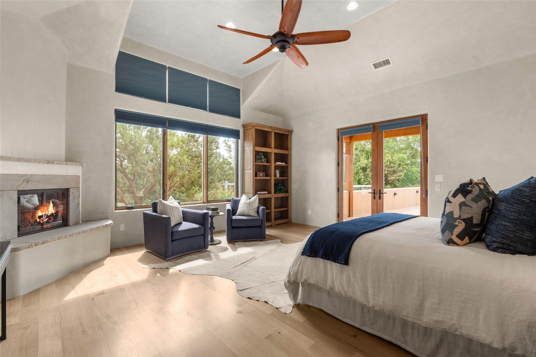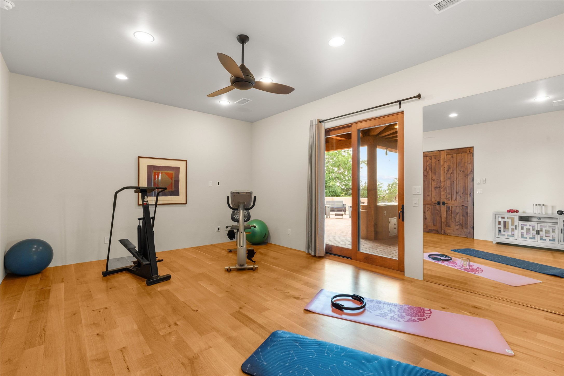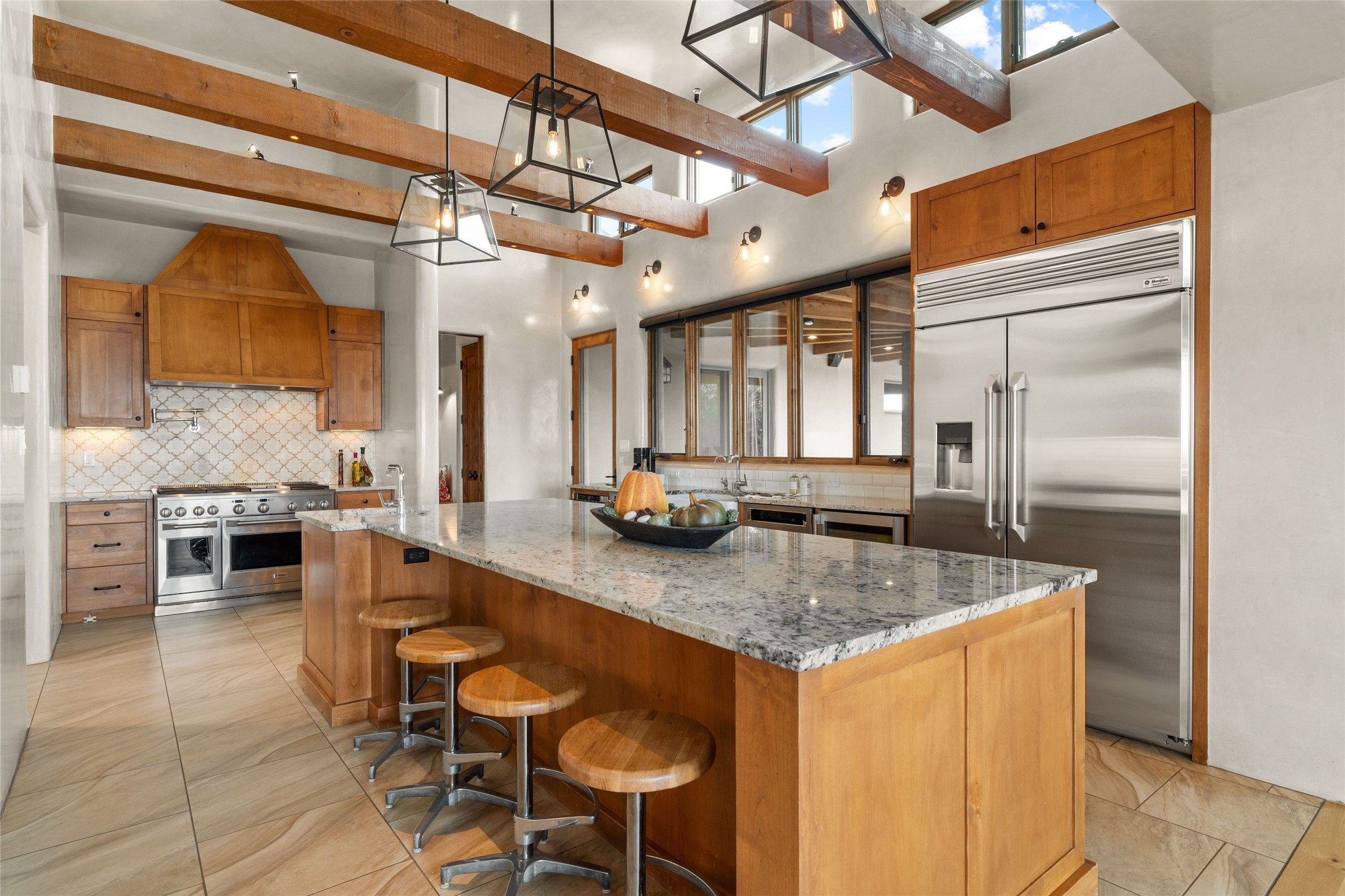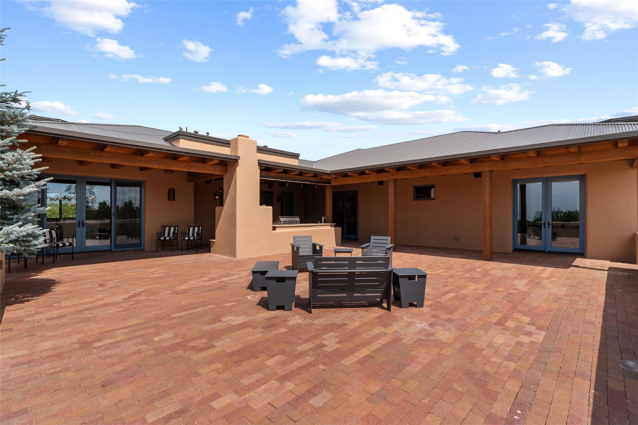 Northern New Mexican style 5-bedroom, 4.5-bath custom-built 5,200 sq. ft. home spanning over 2.5 acres offers panoramic 180-degree views that stretch from the majestic Sangre de Cristo Mountains to the captivating Badlands and Los Alamos.Positioned at the end of a private, gated drive and surrounded by an 8-foot-high coyote fence, this residence is a true entertainer's delight. The open floor plan flows effortlessly into spacious covered and uncovered patios, ideal for hosting both intimate gatherings and grand celebrations. Crafted by Driscoll Construction in 2015, the home showcases bespoke design elements, including custom solid wood doors, white oak flooring, and elegant plaster walls throughout the common areas and primary suite. Enjoy the warmth of three fireplaces, including one on the expansive 1,500 sq. ft. portal, where you can relish both sunrise and sunset vistas.The gourmet kitchen invites culinary creativity with its generous center island, clerestory windows, premium appliances, and double dishwashers. Prioritize wellness with a primary bath steam shower, a 300 sq. ft. gym, an outdoor 6-person sauna, a vegetable garden on drip irrigation, and a fully enclosed chicken coop.Additional highlights include a pitched metal roof, an oversized 3-car garage, photovoltaic solar energy, and rainwater harvesting. Recent upgrades in 2023 encompass new stucco, water filtration, a dog run, and an outdoor grill. Enjoy convenient access to downtown Santa Fe, all while embracing the serene beauty of this exceptional property.