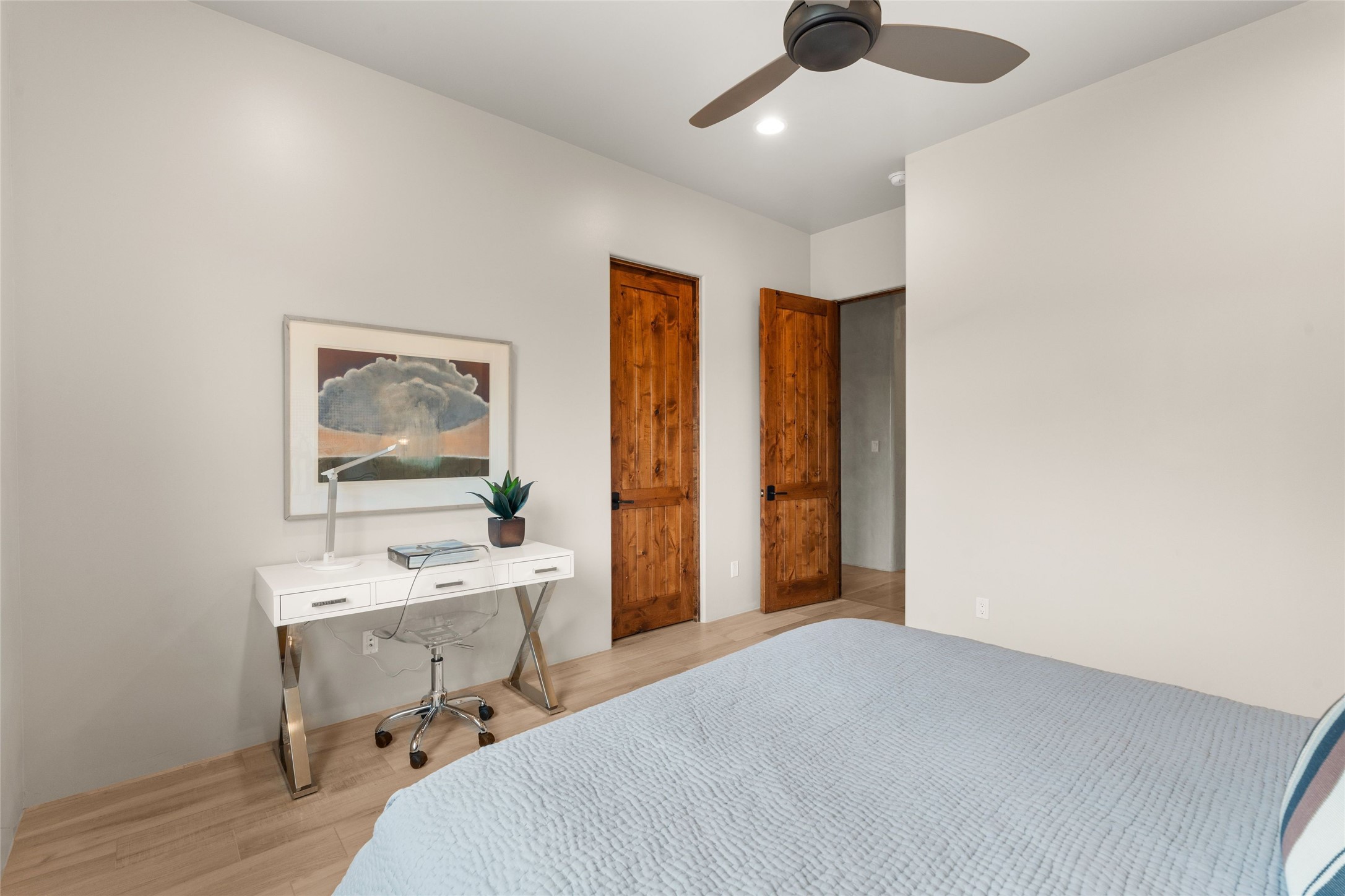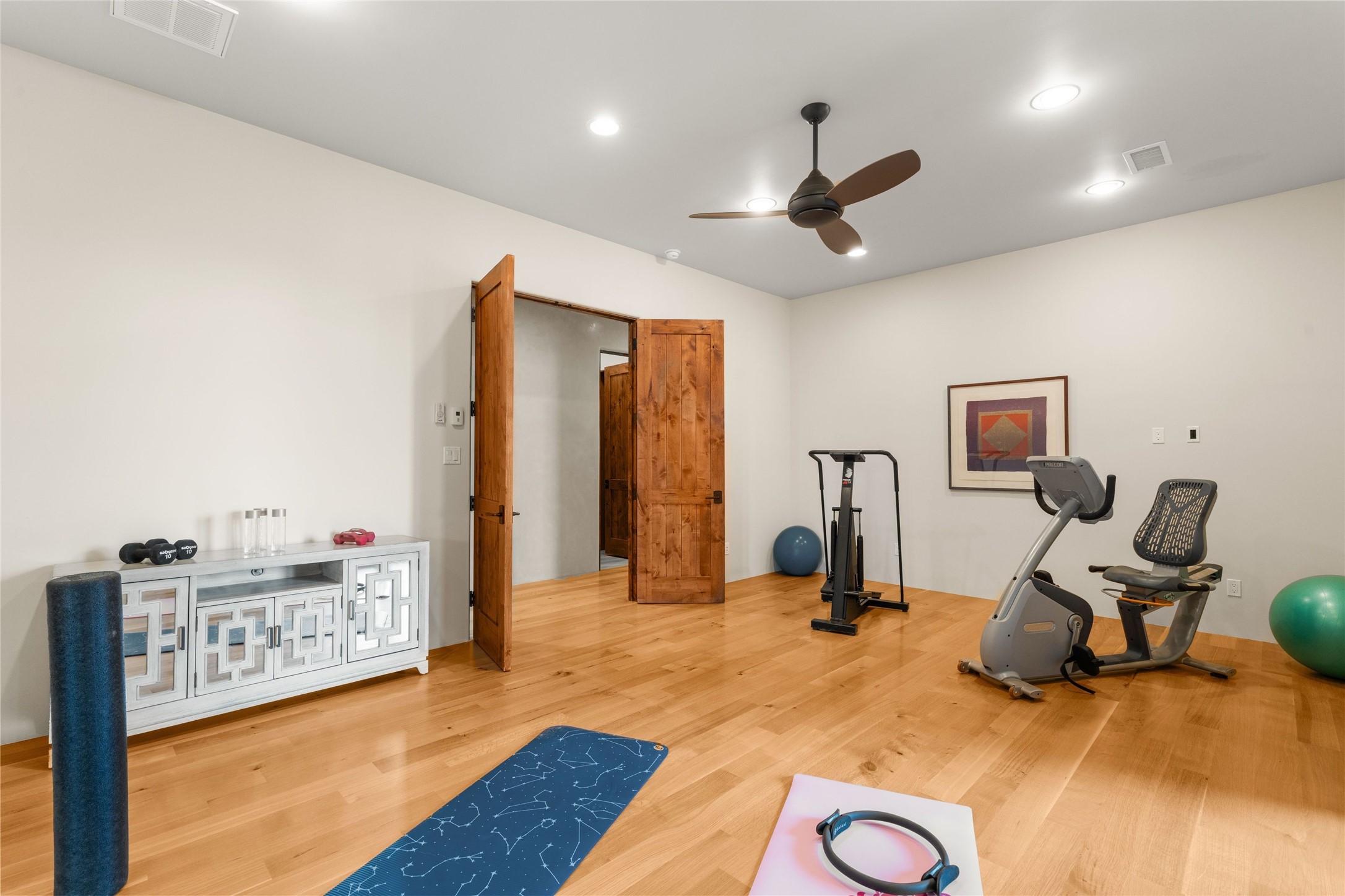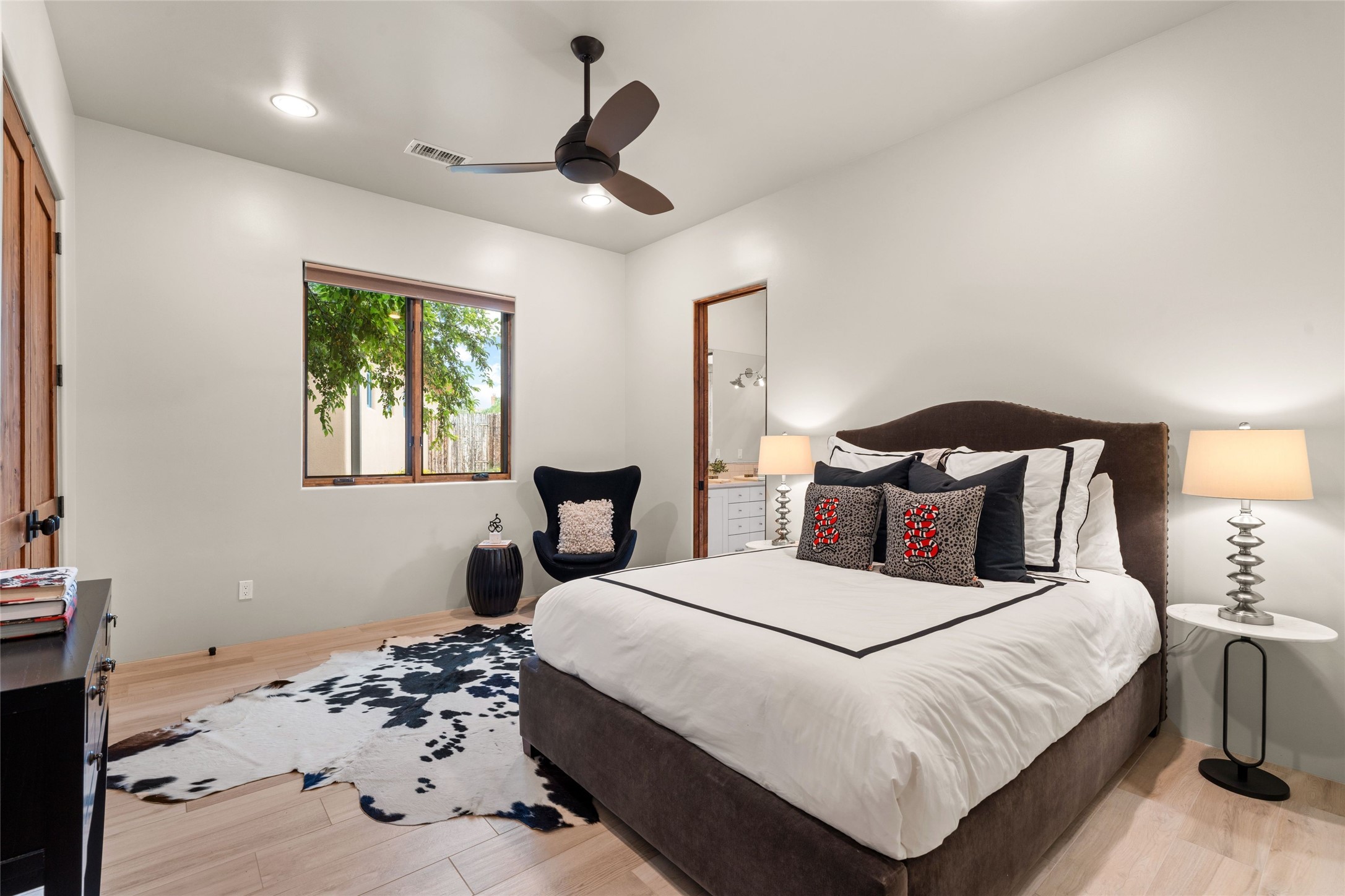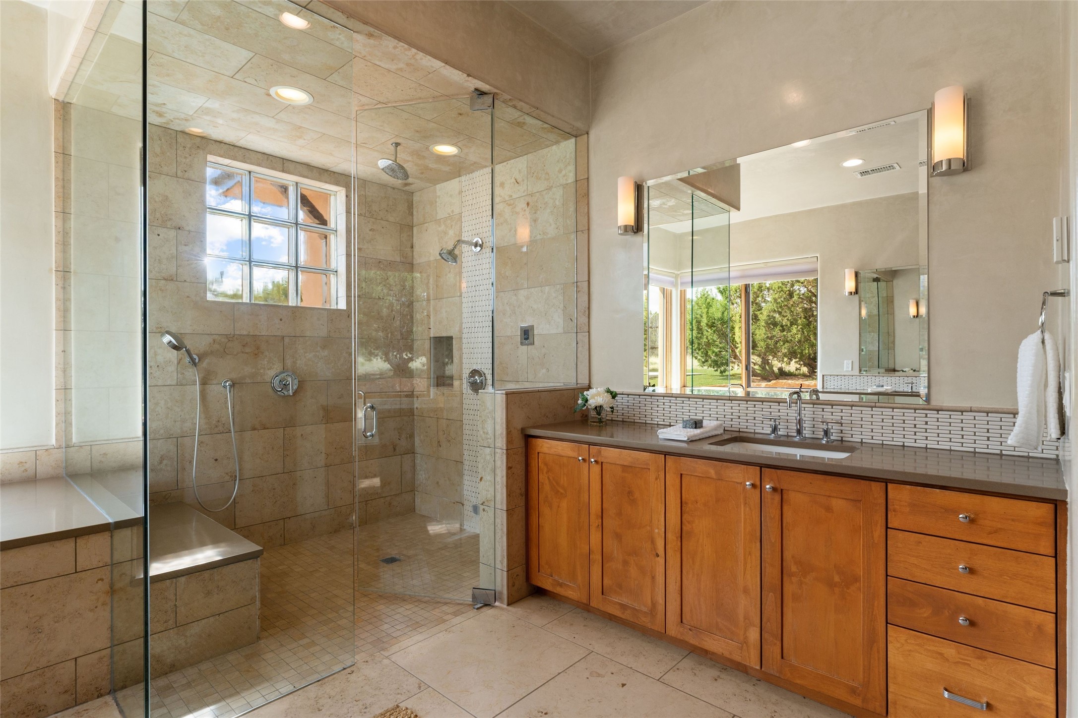 Northern New Mexican style 5-bedroom, 4.5-bath custom-built 5,200 sq. ft. home spanning over 2.5 acres offers panoramic 180-degree views that stretch from the majestic Sangre de Cristo Mountains to the captivating Badlands and Los Alamos.Positioned at the end of a private, gated drive and surrounded by an 8-foot-high coyote fence, this residence is a true entertainer's delight. The open floor plan flows effortlessly into spacious covered and uncovered patios, ideal for hosting both intimate gatherings and grand celebrations. Crafted by Driscoll Construction in 2015, the home showcases bespoke design elements, including custom solid wood doors, white oak flooring, and elegant plaster walls throughout the common areas and primary suite. Enjoy the warmth of three fireplaces, including one on the expansive 1,500 sq. ft. portal, where you can relish both sunrise and sunset vistas.The gourmet kitchen invites culinary creativity with its generous center island, clerestory windows, premium appliances, and double dishwashers. Prioritize wellness with a primary bath steam shower, a 300 sq. ft. gym, an outdoor 6-person sauna, a vegetable garden on drip irrigation, and a fully enclosed chicken coop.Additional highlights include a pitched metal roof, an oversized 3-car garage, photovoltaic solar energy, and rainwater harvesting. Recent upgrades in 2023 encompass new stucco, water filtration, a dog run, and an outdoor grill. Enjoy convenient access to downtown Santa Fe, all while embracing the serene beauty of this exceptional property.
