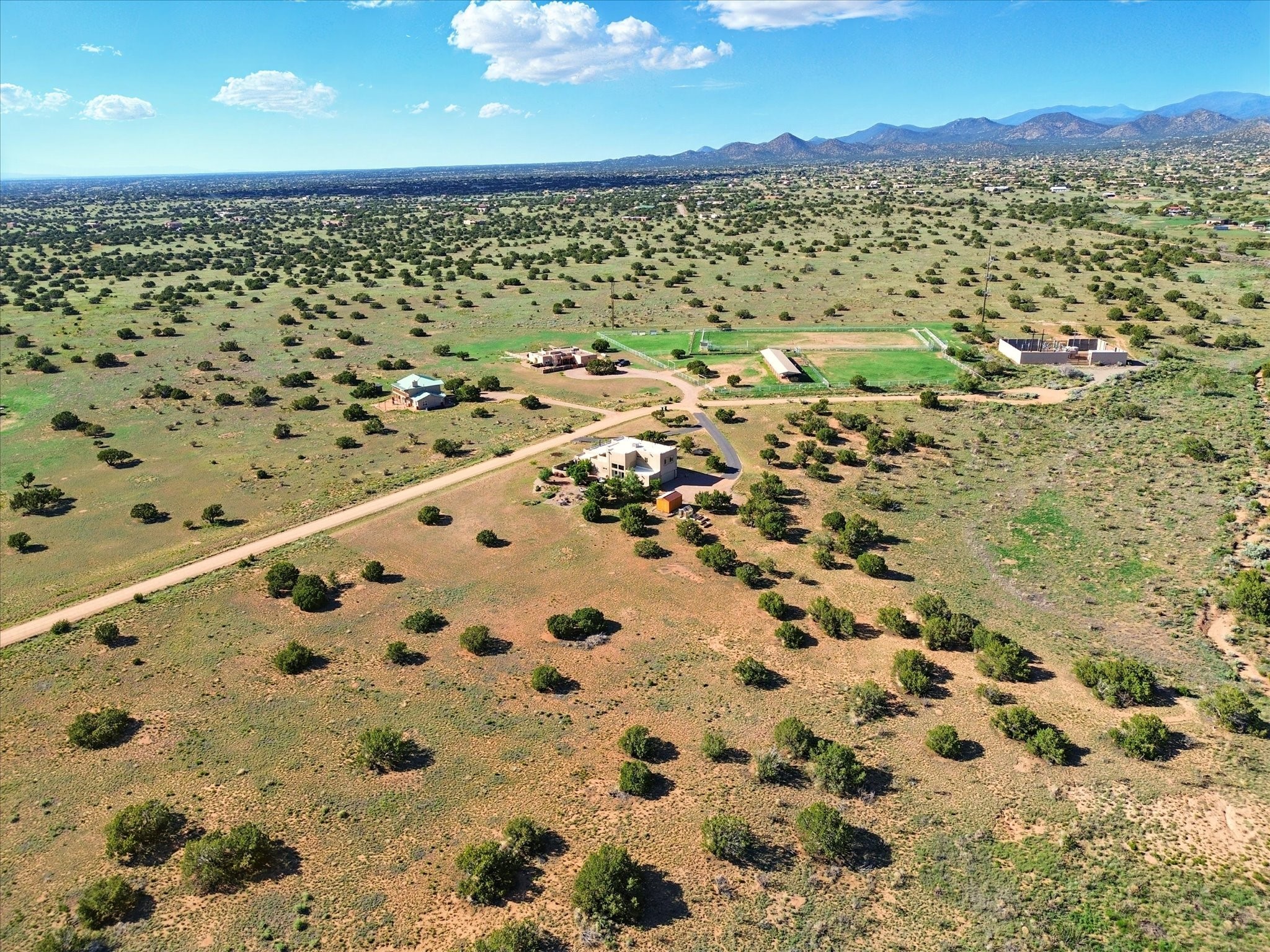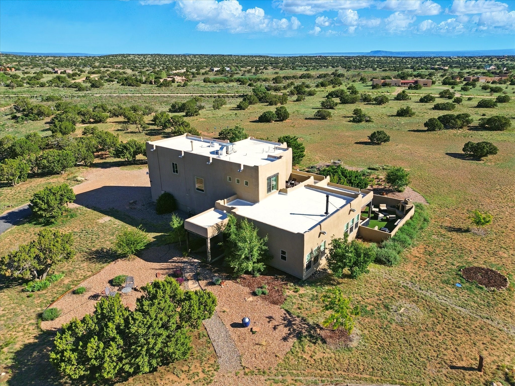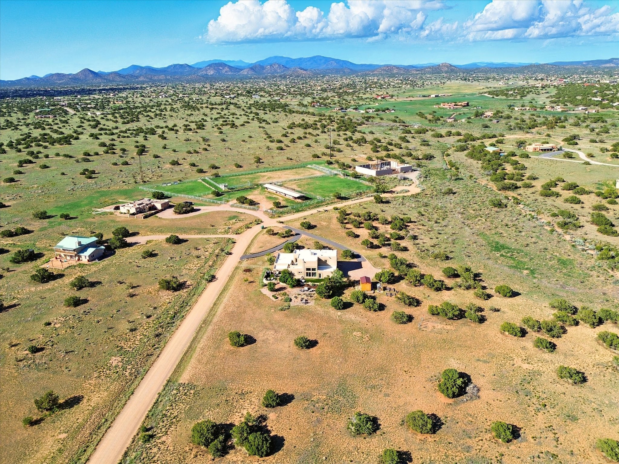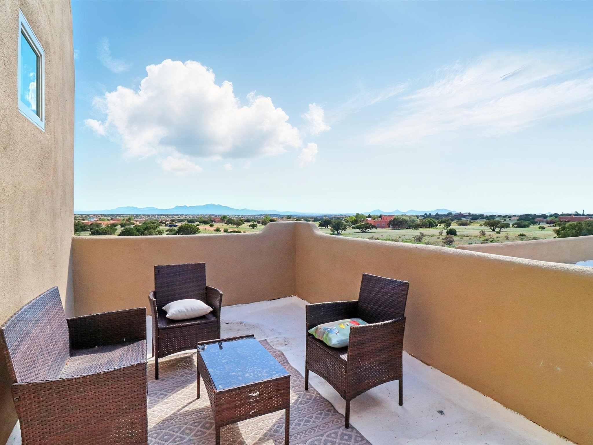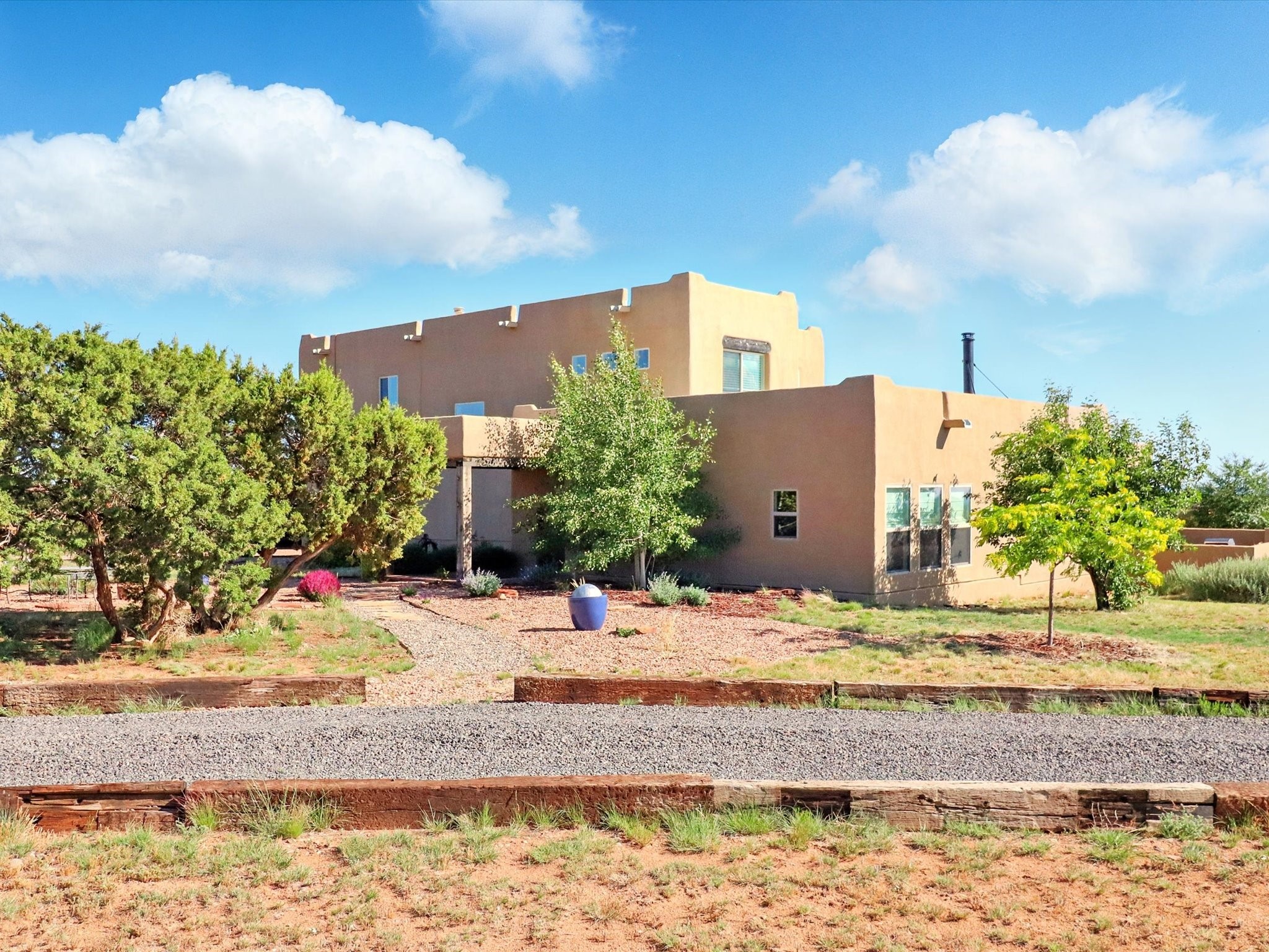 Seller concession available ($10,000 with acceptable offer)Experience breathtaking views surrounding this exceptional property located on just over 4 acres of pristine high desert landscape. This stunning home blends the timeless charm of Pueblo-style architecture with the inviting touches of modern farmhouse design including an expansive 1,000 square foot addition completed in 2020. The versatile floor plan is anchored by a beautifully updated gourmet kitchen featuring a Sub-Zero refrigerator and custom finishes with ample workspace, and a seamless flow for entertaining. On the main floor you will find that the primary bedroom showcases soaring ceilings with a picturesque view and private access to the outdoor courtyard. Complete with an oversized closet area and beautifully renovated bathroom that is perfect for soaking in the bathtub while taking in the view from the large picture window right above. The second floor consists of two bedrooms, a bonus room and two bathrooms. The balcony off the ensuite bedroom is ideal for soaking in the mountains and serene sunsets. Step outside to enjoy the covered portal and cozy up by the outdoor wood-burning fireplace. Fruit trees dot the landscape, adding character and a touch of sweetness to your retreat. Backed by peaceful green space and only minutes from the Galisteo Basin preserve, Santa Fe Rail Trail, this property offers the perfect blend of tranquility, access to nature and refined living. Do not miss this rare opportunity to own a home that truly captures the spirit and beauty of New Mexico.Pre-listing inspection report is available.