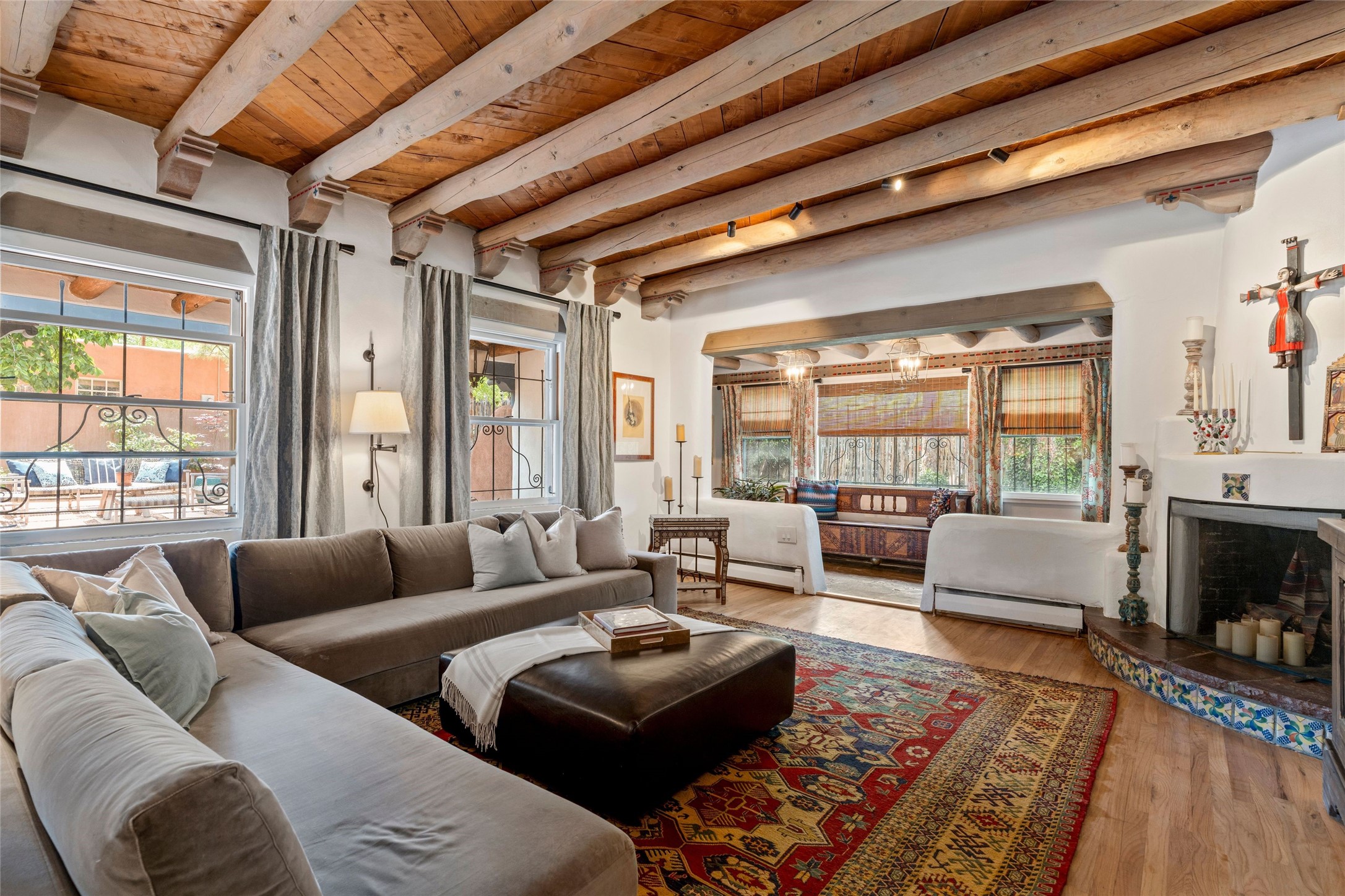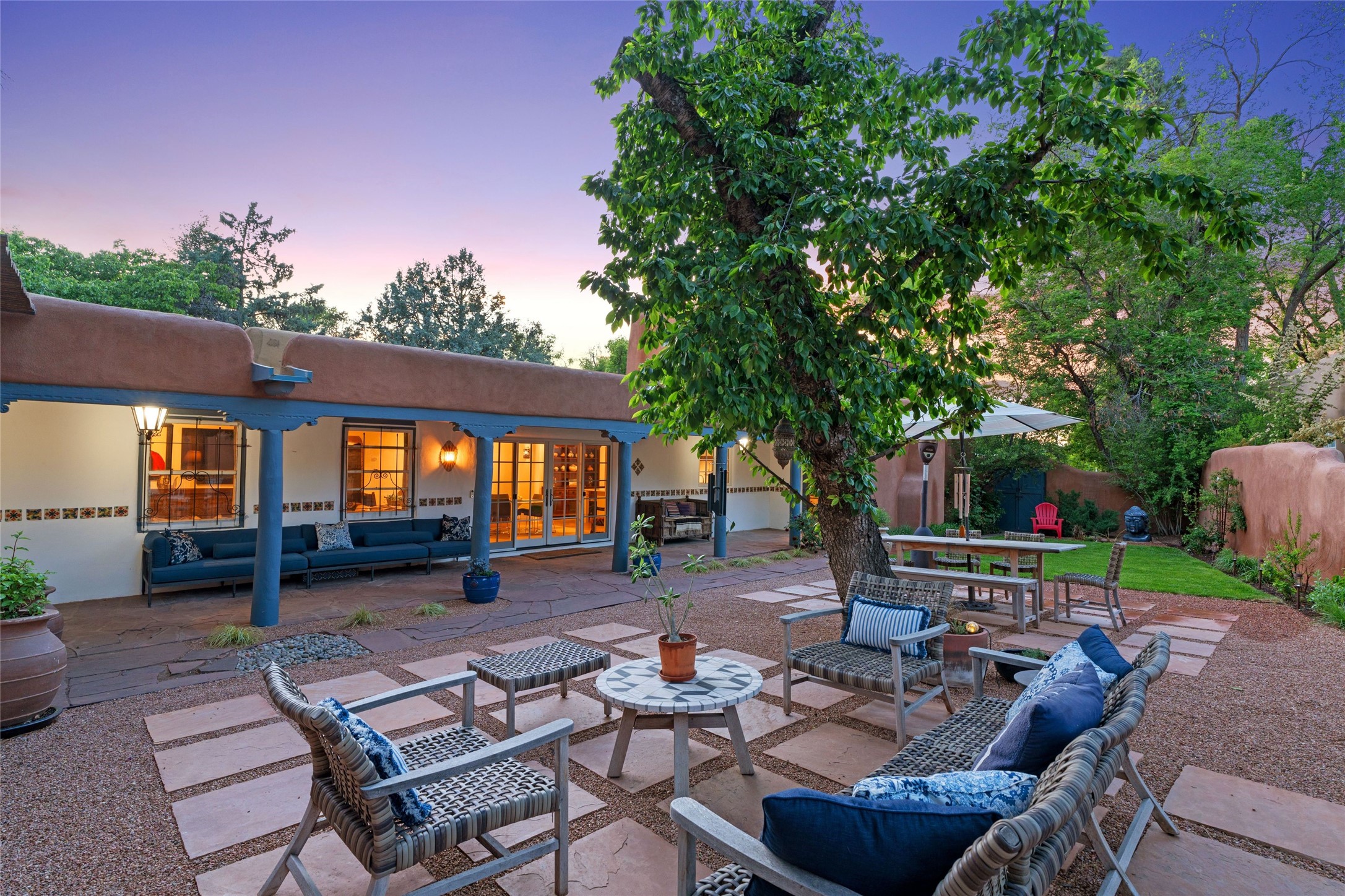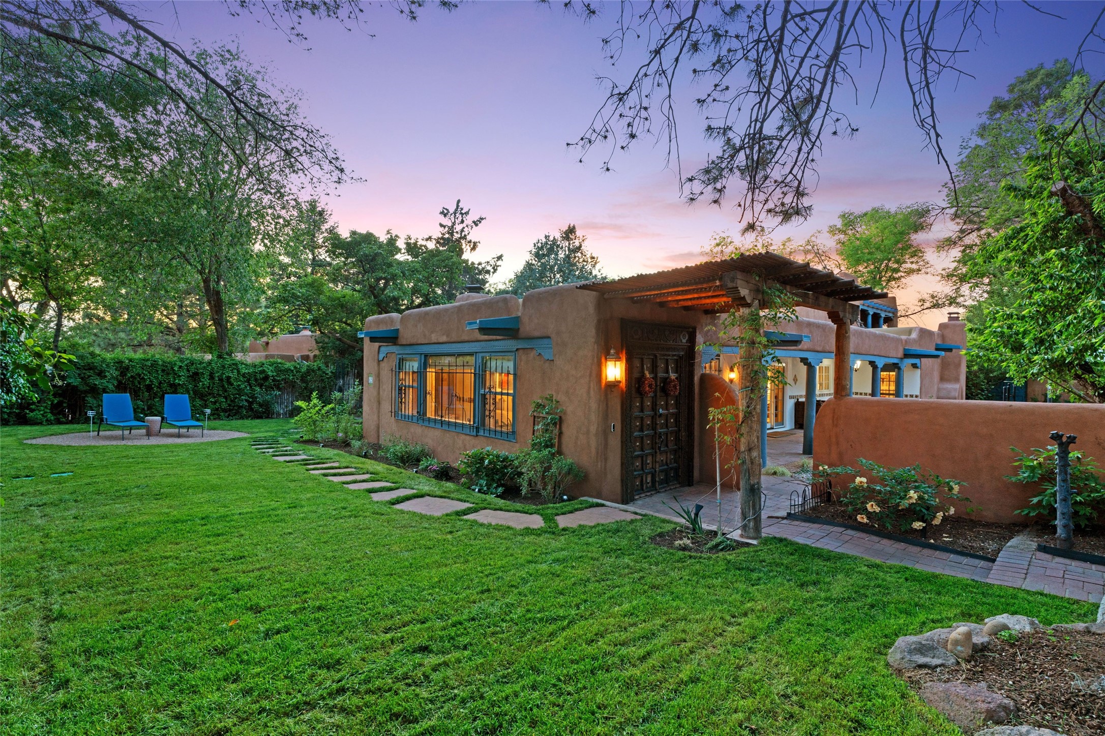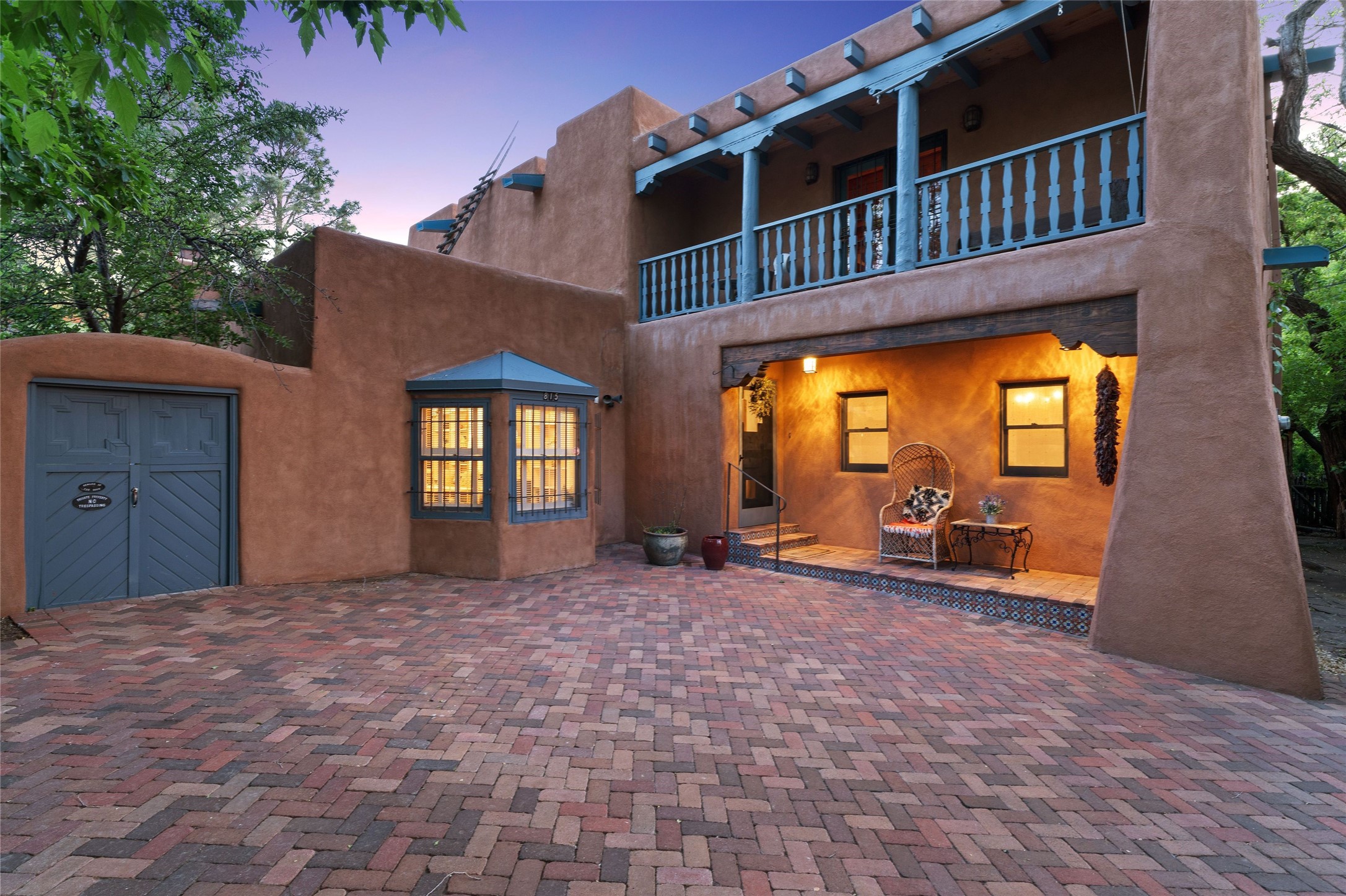 This Historic Eastside 4-bedroom, 4-bath residence fronting the picturesque Acequia Madre de Santa Fe offers a seamless blend of historic character and modern sensibility. Lot extends from Camino del Poniente to Acequia Madre with private access and parking off both streets. As you enter, a generous grand foyer welcomes you, setting the tone for this extraordinary home. With 3 wood-burning fireplaces, the inviting warmth of the living spaces is enhanced by traditional plastered walls, carved doors, exposed vigas and beams. The floors, a blend of wood, flagstone, and brick, tell a story of artisanal craftsmanship, while colorful tiles add character throughout. The formal dining room, equipped with built-in shelving and cabinets, is perfect for hosting elegant dinners, while the spacious kitchen is a culinary haven. Skylights flood the area with natural light, illuminating a center island complete with a wine fridge, a farmhouse sink, and high-end appliances. An informal dining area opens to an outdoor portal and patio, offering an ideal backdrop for al fresco gatherings. Upstairs, a versatile space awaits as a second living area, bedroom, or office. The attached casita is a private one-bedroom suite complete with a kitchen, full bath, washer, dryer, and dedicated parking area. The private wraparound yard, with mature flowering fruit and shade trees, offers a peaceful outdoor retreat in the heart of the city. Recent enhancements include the replacement of majority plumbing pipes, sewer line, and numerous windows. Additionally, leased water rights from the Acequia Madre are available. Located in a coveted area a block away from Canyon Road and a short distance to the Santa Fe Plaza.