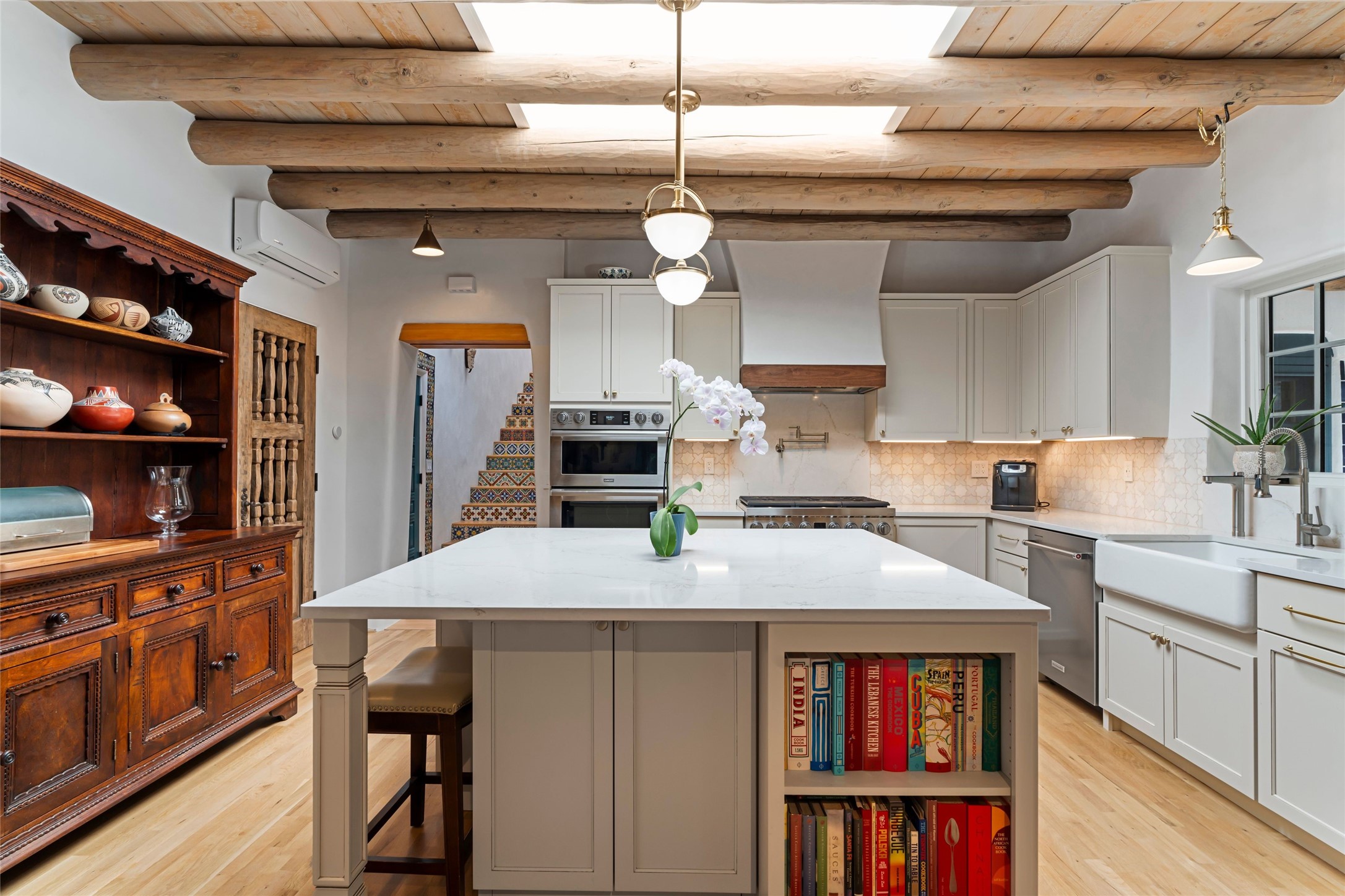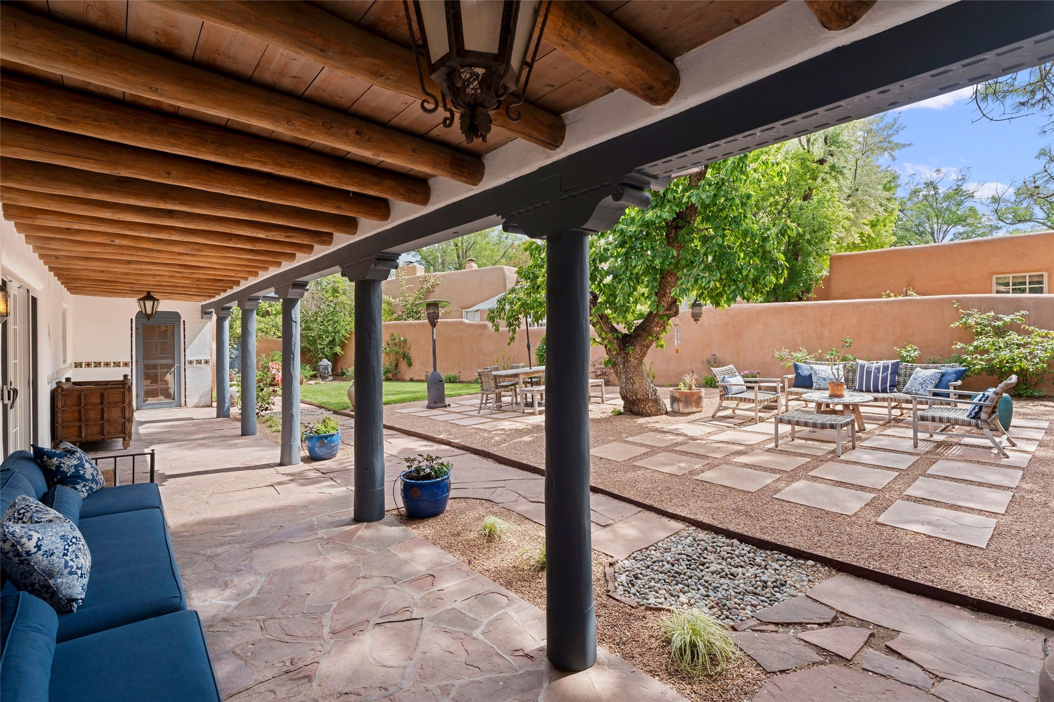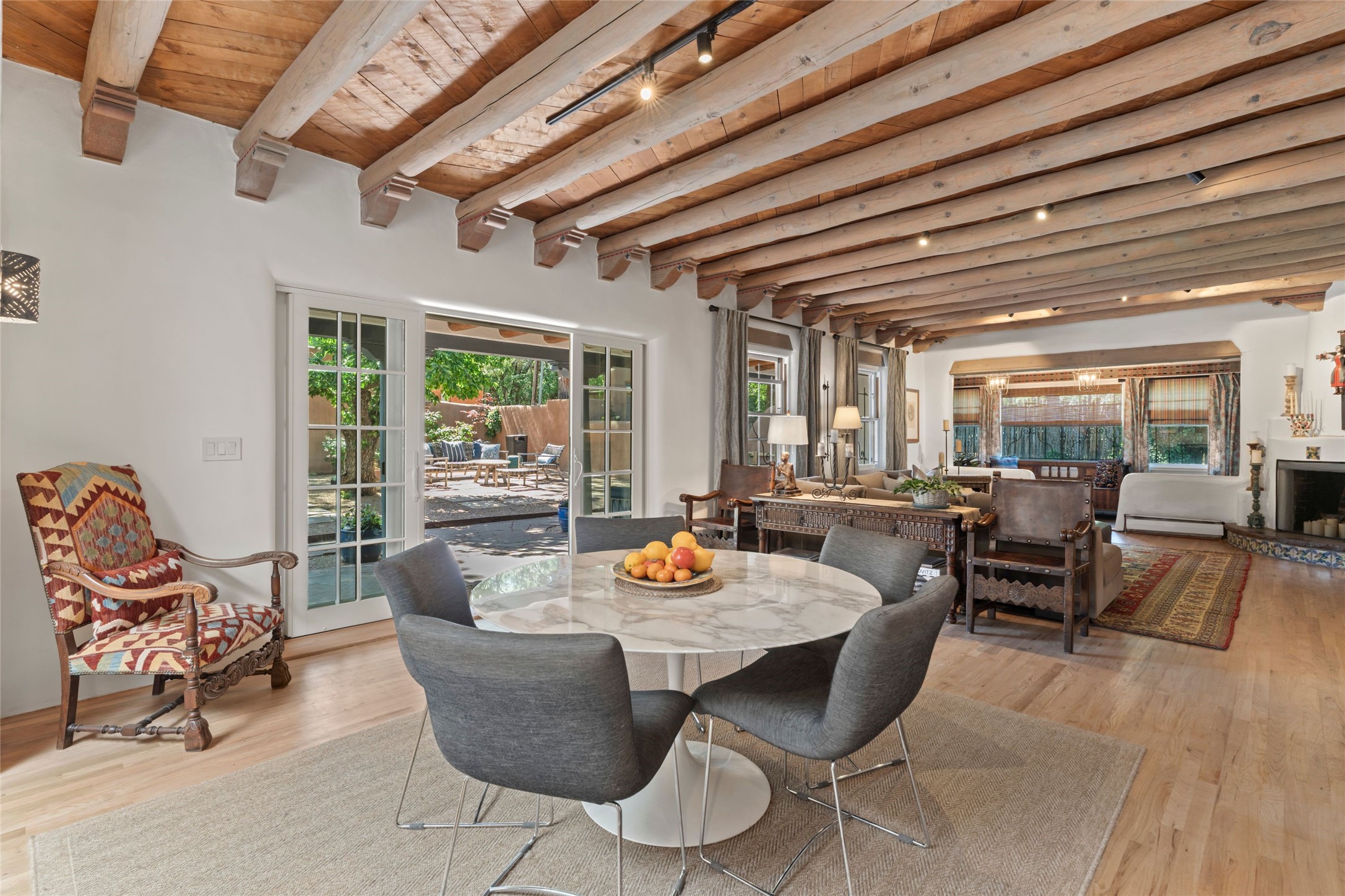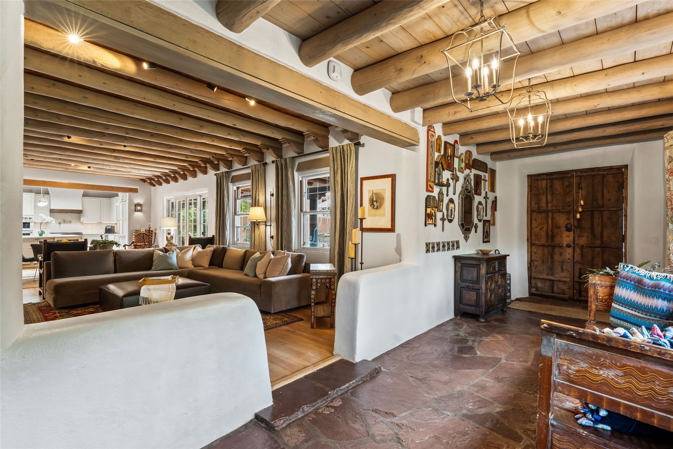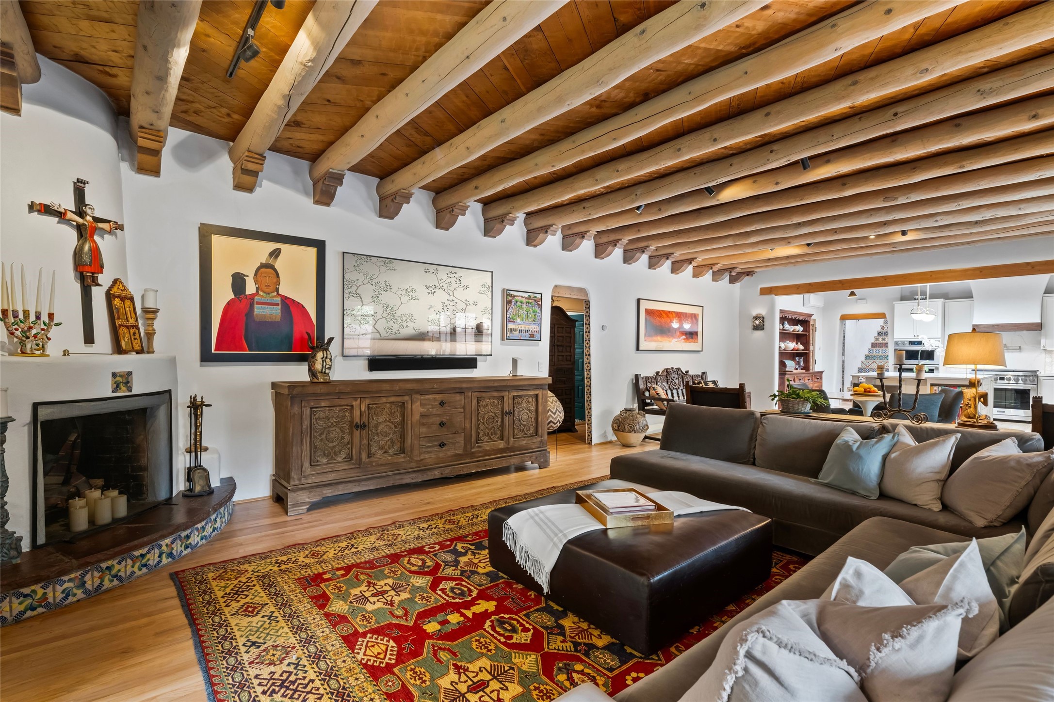 This Historic Eastside 4-bedroom, 4-bath residence fronting the picturesque Acequia Madre de Santa Fe offers a seamless blend of historic character and modern sensibility. Lot extends from Camino del Poniente to Acequia Madre with private access and parking off both streets. As you enter, a generous grand foyer welcomes you, setting the tone for this extraordinary home. With 3 wood-burning fireplaces, the inviting warmth of the living spaces is enhanced by traditional plastered walls, carved doors, exposed vigas and beams. The floors, a blend of wood, flagstone, and brick, tell a story of artisanal craftsmanship, while colorful tiles add character throughout. The formal dining room, equipped with built-in shelving and cabinets, is perfect for hosting elegant dinners, while the spacious kitchen is a culinary haven. Skylights flood the area with natural light, illuminating a center island complete with a wine fridge, a farmhouse sink, and high-end appliances. An informal dining area opens to an outdoor portal and patio, offering an ideal backdrop for al fresco gatherings. Upstairs, a versatile space awaits as a second living area, bedroom, or office. The attached casita is a private one-bedroom suite complete with a kitchen, full bath, washer, dryer, and dedicated parking area. The private wraparound yard, with mature flowering fruit and shade trees, offers a peaceful outdoor retreat in the heart of the city. Recent enhancements include the replacement of majority plumbing pipes, sewer line, and numerous windows. Additionally, leased water rights from the Acequia Madre are available. Located in a coveted area a block away from Canyon Road and a short distance to the Santa Fe Plaza.