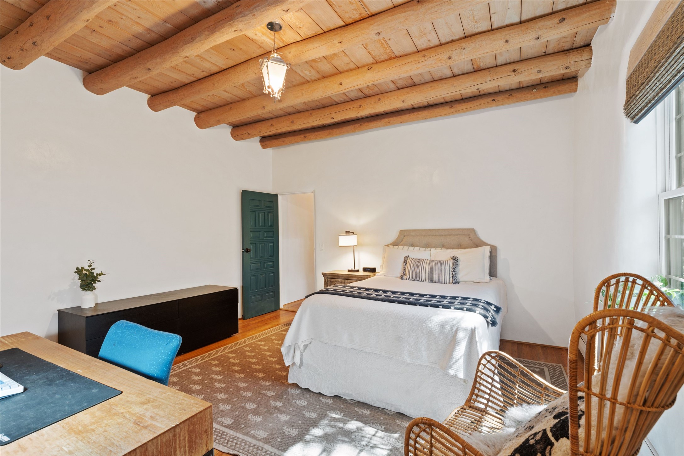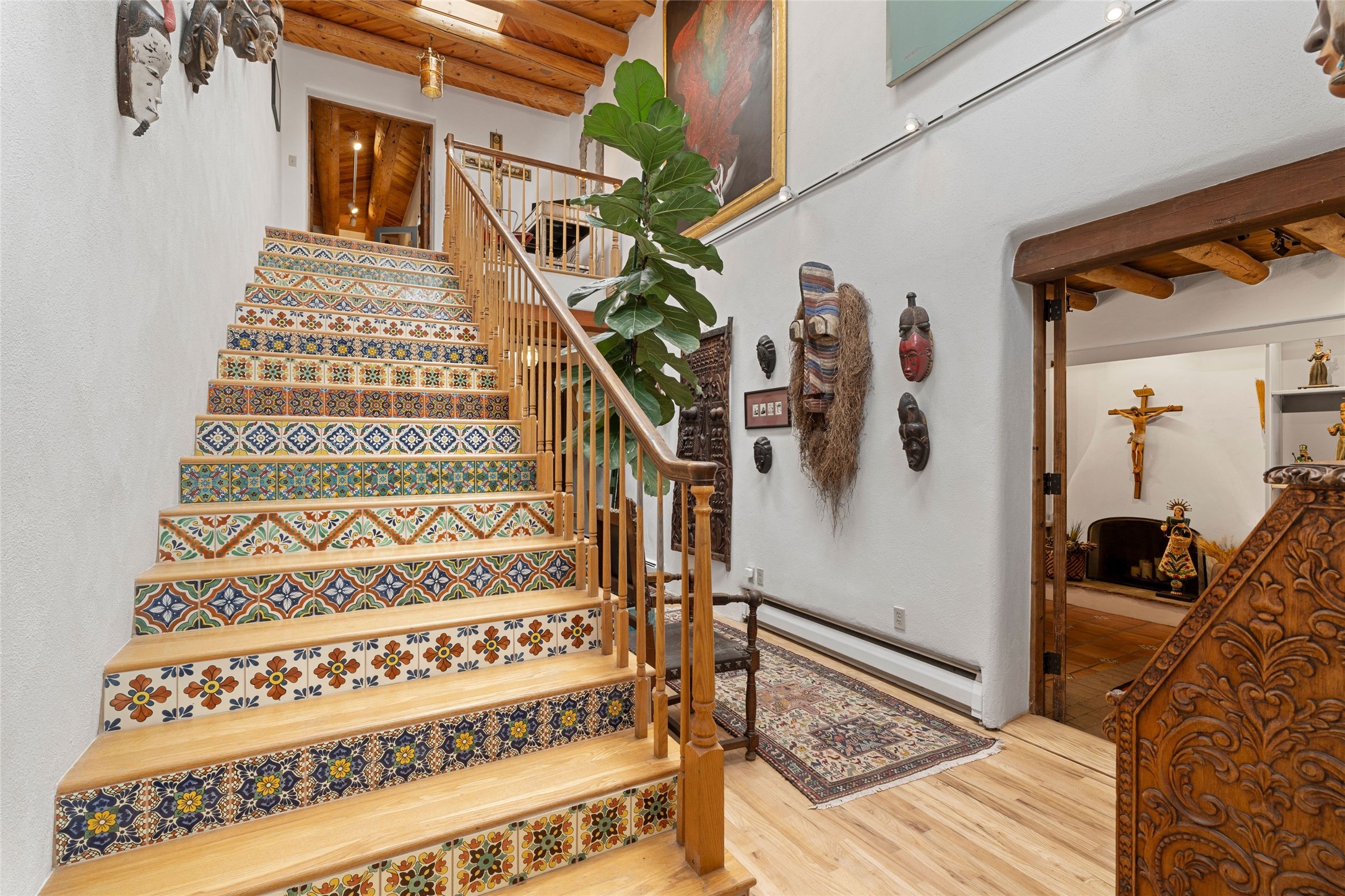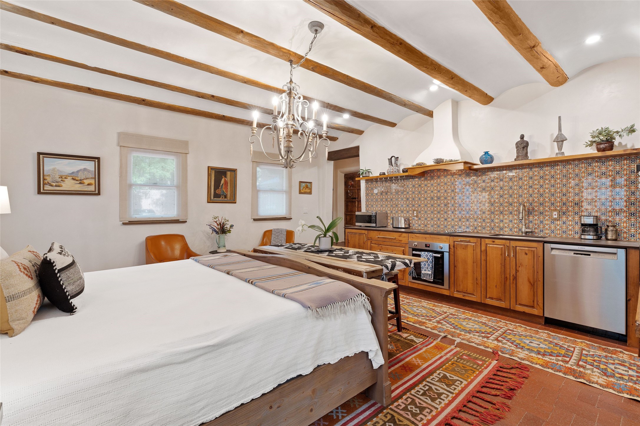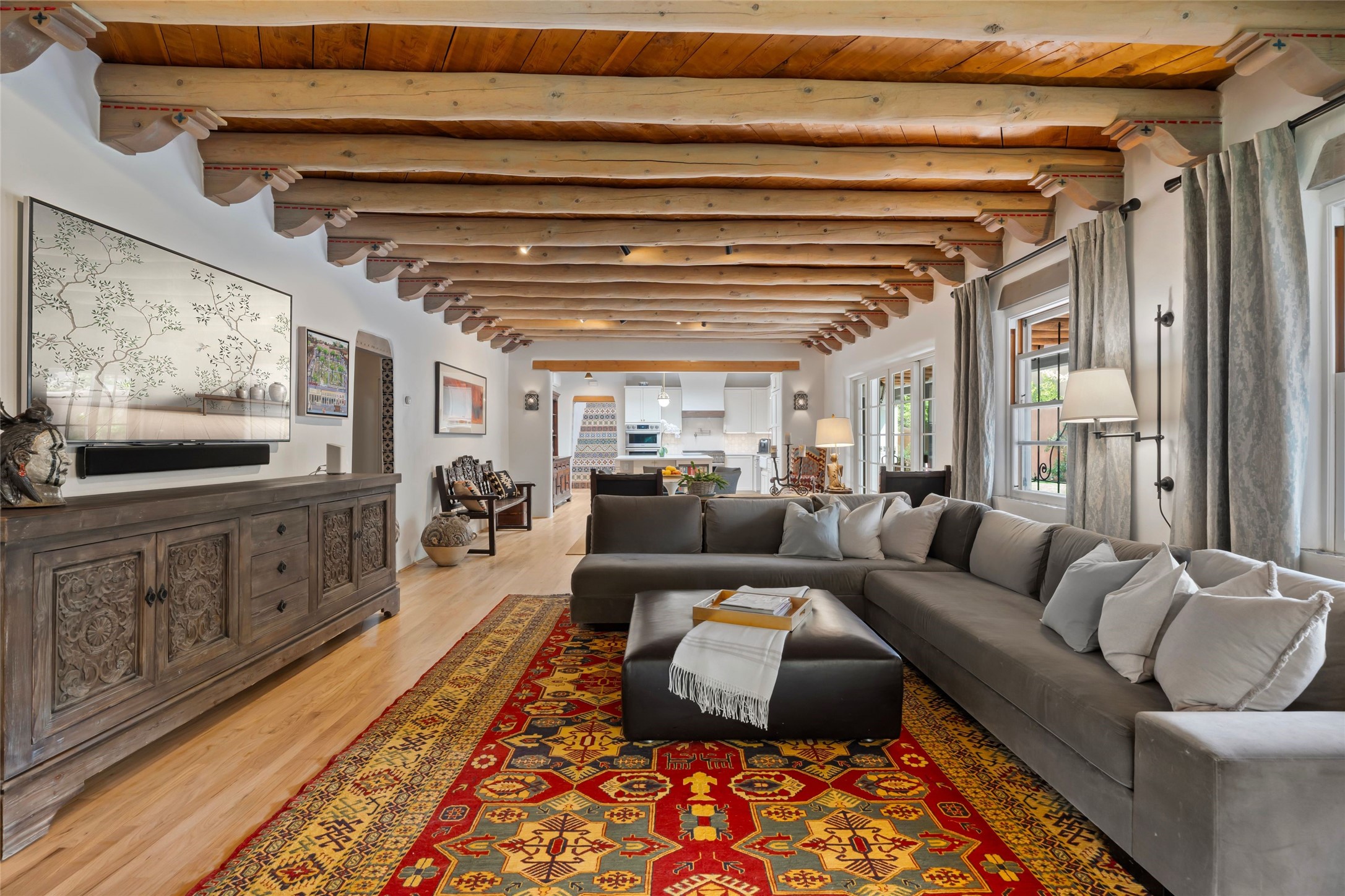 This Historic Eastside 4-bedroom, 4-bath residence fronting the picturesque Acequia Madre de Santa Fe offers a seamless blend of historic character and modern sensibility. Lot extends from Camino del Poniente to Acequia Madre with private access and parking off both streets. As you enter, a generous grand foyer welcomes you, setting the tone for this extraordinary home. With 3 wood-burning fireplaces, the inviting warmth of the living spaces is enhanced by traditional plastered walls, carved doors, exposed vigas and beams. The floors, a blend of wood, flagstone, and brick, tell a story of artisanal craftsmanship, while colorful tiles add character throughout. The formal dining room, equipped with built-in shelving and cabinets, is perfect for hosting elegant dinners, while the spacious kitchen is a culinary haven. Skylights flood the area with natural light, illuminating a center island complete with a wine fridge, a farmhouse sink, and high-end appliances. An informal dining area opens to an outdoor portal and patio, offering an ideal backdrop for al fresco gatherings. Upstairs, a versatile space awaits as a second living area, bedroom, or office. The attached casita is a private one-bedroom suite complete with a kitchen, full bath, washer, dryer, and dedicated parking area. The private wraparound yard, with mature flowering fruit and shade trees, offers a peaceful outdoor retreat in the heart of the city. Recent enhancements include the replacement of majority plumbing pipes, sewer line, and numerous windows. Additionally, leased water rights from the Acequia Madre are available. Located in a coveted area a block away from Canyon Road and a short distance to the Santa Fe Plaza.