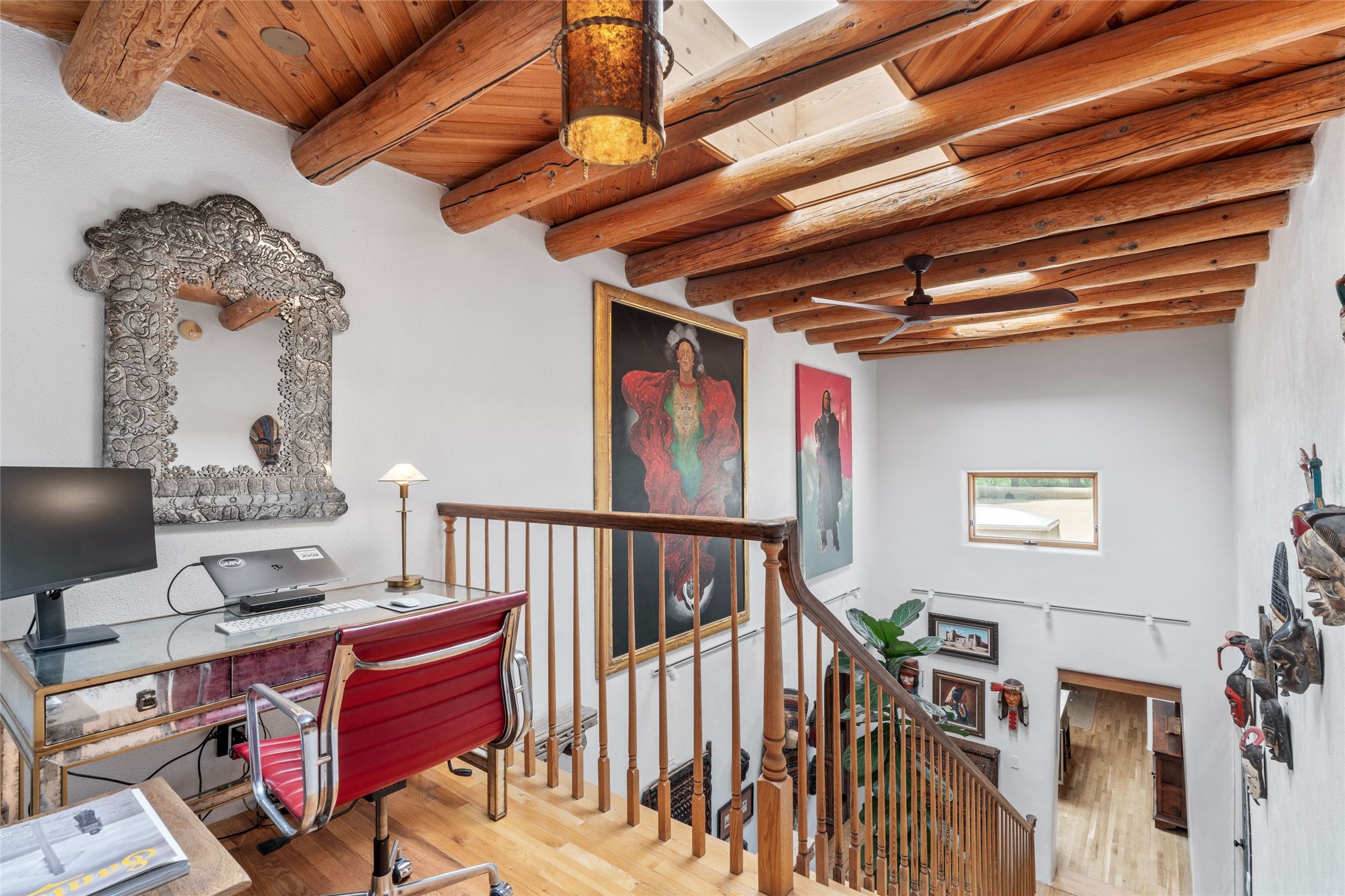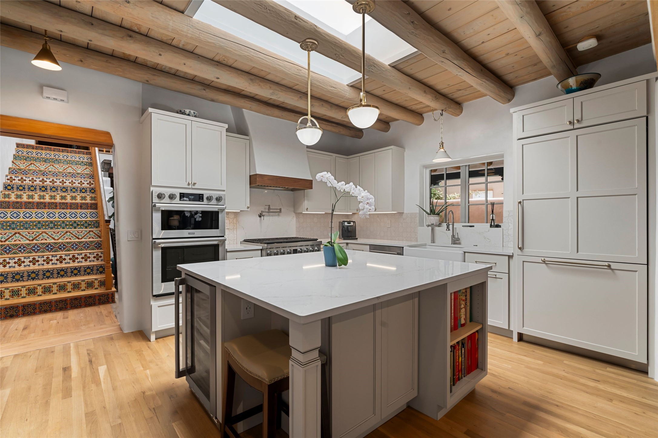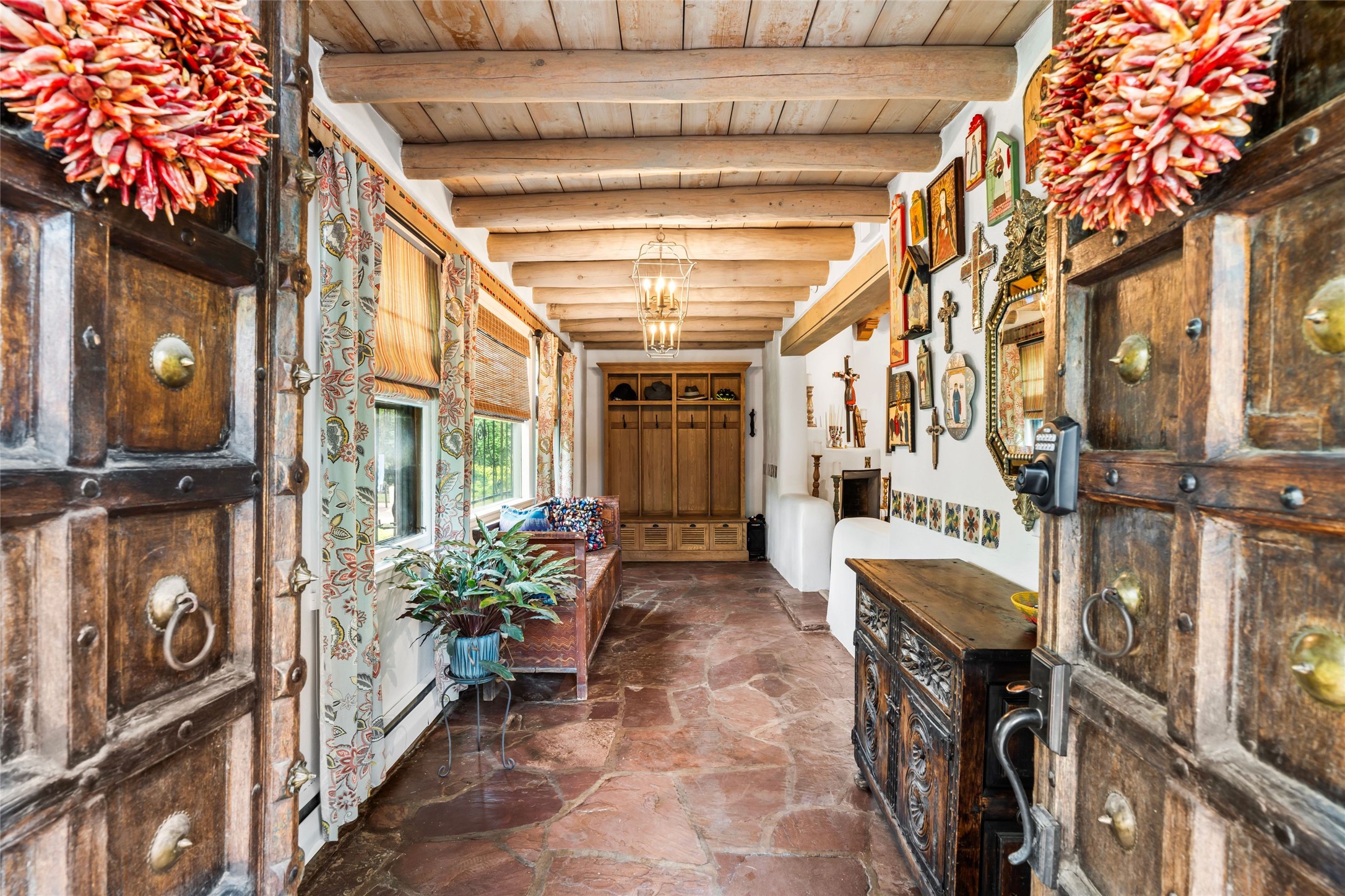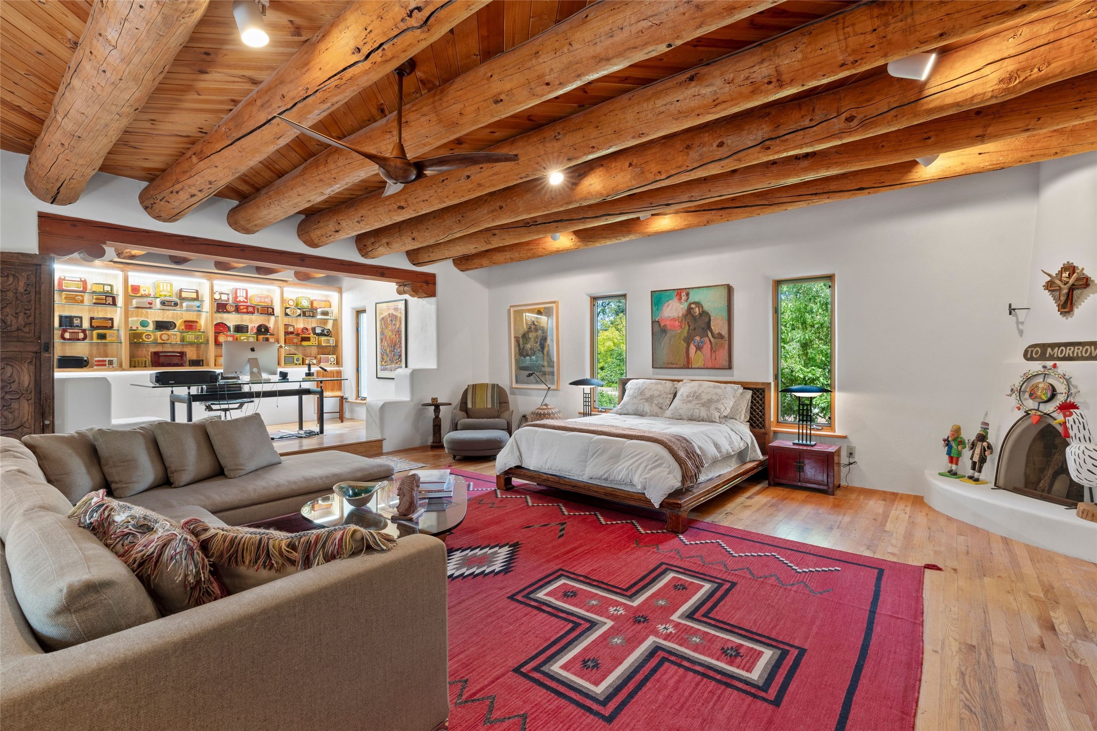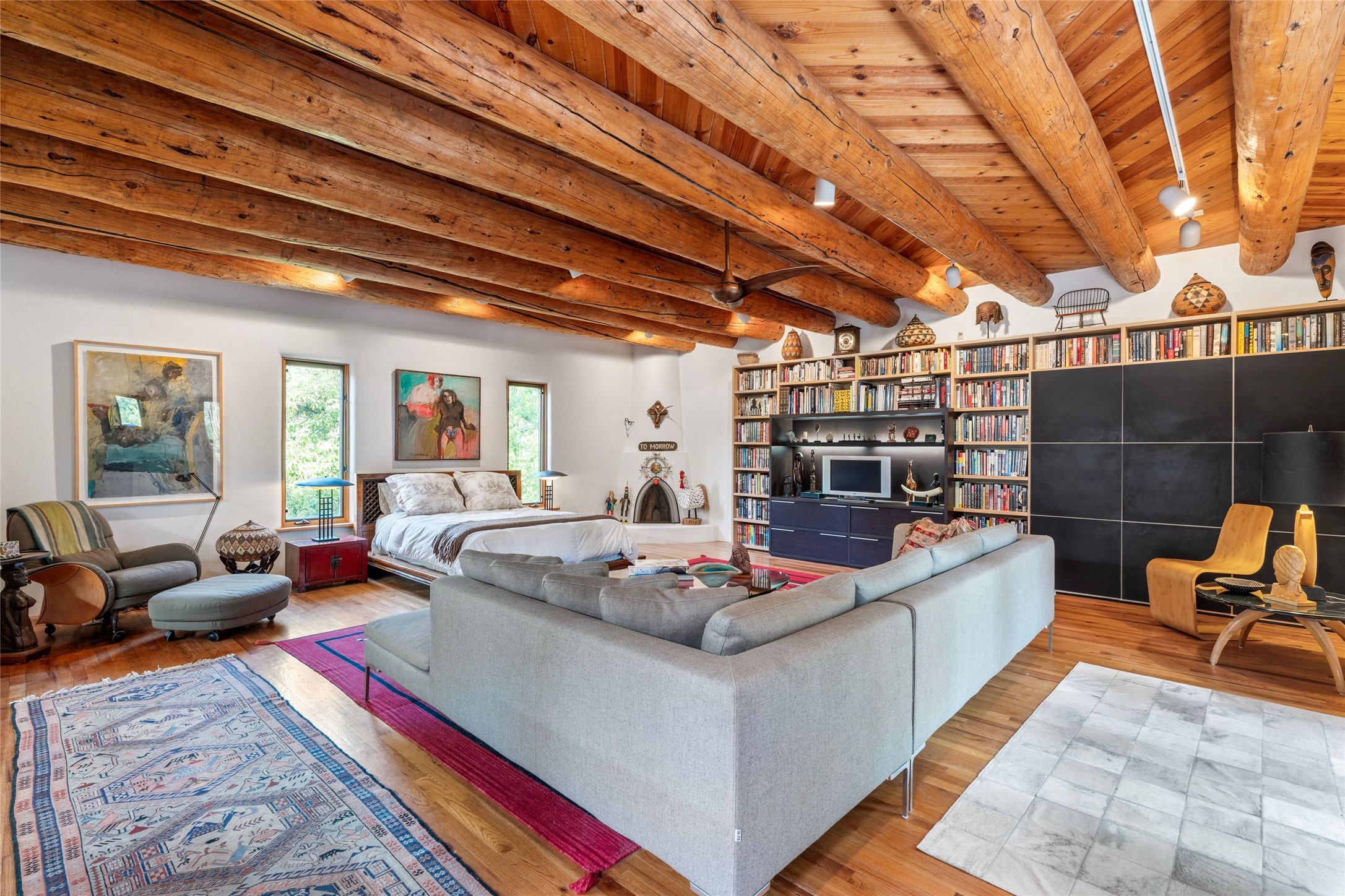 This Historic Eastside 4-bedroom, 4-bath residence fronting the picturesque Acequia Madre de Santa Fe offers a seamless blend of historic character and modern sensibility. Lot extends from Camino del Poniente to Acequia Madre with private access and parking off both streets. As you enter, a generous grand foyer welcomes you, setting the tone for this extraordinary home. With 3 wood-burning fireplaces, the inviting warmth of the living spaces is enhanced by traditional plastered walls, carved doors, exposed vigas and beams. The floors, a blend of wood, flagstone, and brick, tell a story of artisanal craftsmanship, while colorful tiles add character throughout. The formal dining room, equipped with built-in shelving and cabinets, is perfect for hosting elegant dinners, while the spacious kitchen is a culinary haven. Skylights flood the area with natural light, illuminating a center island complete with a wine fridge, a farmhouse sink, and high-end appliances. An informal dining area opens to an outdoor portal and patio, offering an ideal backdrop for al fresco gatherings. Upstairs, a versatile space awaits as a second living area, bedroom, or office. The attached casita is a private one-bedroom suite complete with a kitchen, full bath, washer, dryer, and dedicated parking area. The private wraparound yard, with mature flowering fruit and shade trees, offers a peaceful outdoor retreat in the heart of the city. Recent enhancements include the replacement of majority plumbing pipes, sewer line, and numerous windows. Additionally, leased water rights from the Acequia Madre are available. Located in a coveted area a block away from Canyon Road and a short distance to the Santa Fe Plaza.