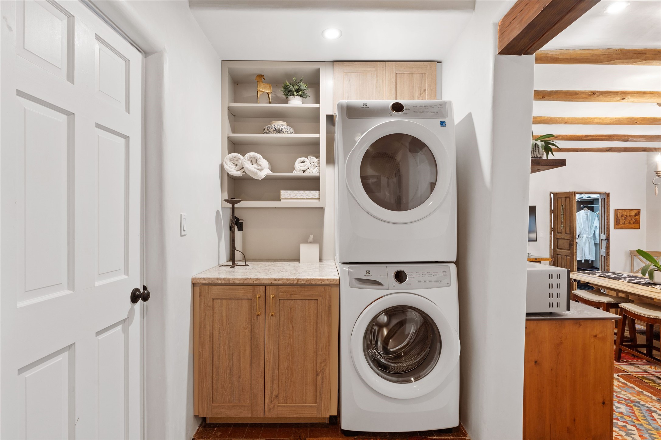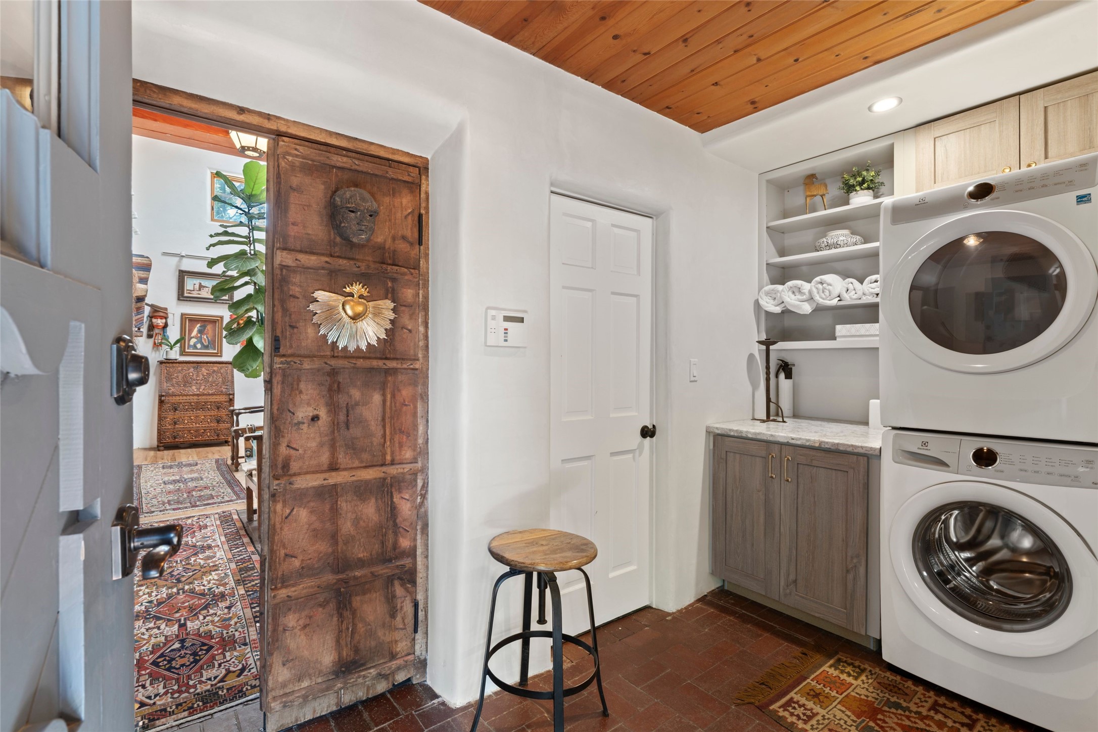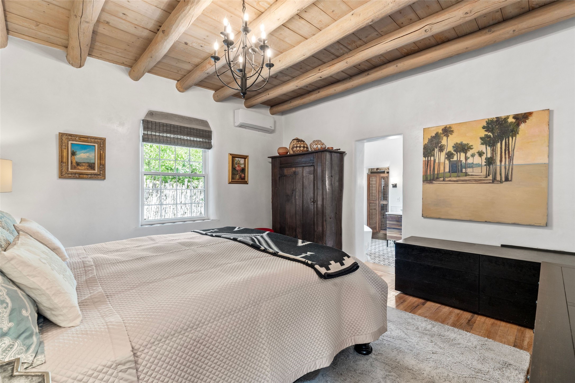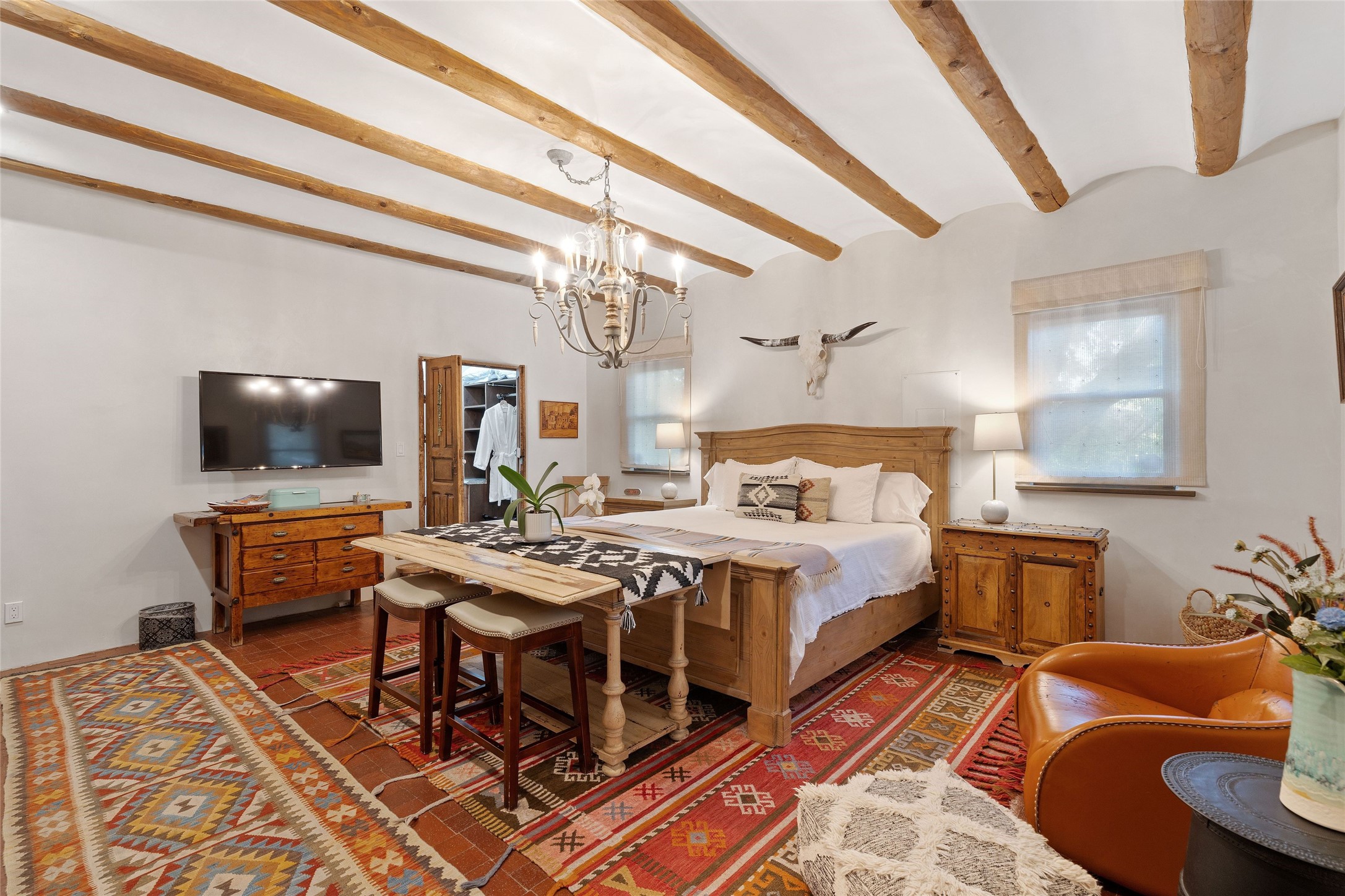 This Historic Eastside 4-bedroom, 4-bath residence fronting the picturesque Acequia Madre de Santa Fe offers a seamless blend of historic character and modern sensibility. Lot extends from Camino del Poniente to Acequia Madre with private access and parking off both streets. As you enter, a generous grand foyer welcomes you, setting the tone for this extraordinary home. With 3 wood-burning fireplaces, the inviting warmth of the living spaces is enhanced by traditional plastered walls, carved doors, exposed vigas and beams. The floors, a blend of wood, flagstone, and brick, tell a story of artisanal craftsmanship, while colorful tiles add character throughout. The formal dining room, equipped with built-in shelving and cabinets, is perfect for hosting elegant dinners, while the spacious kitchen is a culinary haven. Skylights flood the area with natural light, illuminating a center island complete with a wine fridge, a farmhouse sink, and high-end appliances. An informal dining area opens to an outdoor portal and patio, offering an ideal backdrop for al fresco gatherings. Upstairs, a versatile space awaits as a second living area, bedroom, or office. The attached casita is a private one-bedroom suite complete with a kitchen, full bath, washer, dryer, and dedicated parking area. The private wraparound yard, with mature flowering fruit and shade trees, offers a peaceful outdoor retreat in the heart of the city. Recent enhancements include the replacement of majority plumbing pipes, sewer line, and numerous windows. Additionally, leased water rights from the Acequia Madre are available. Located in a coveted area a block away from Canyon Road and a short distance to the Santa Fe Plaza.