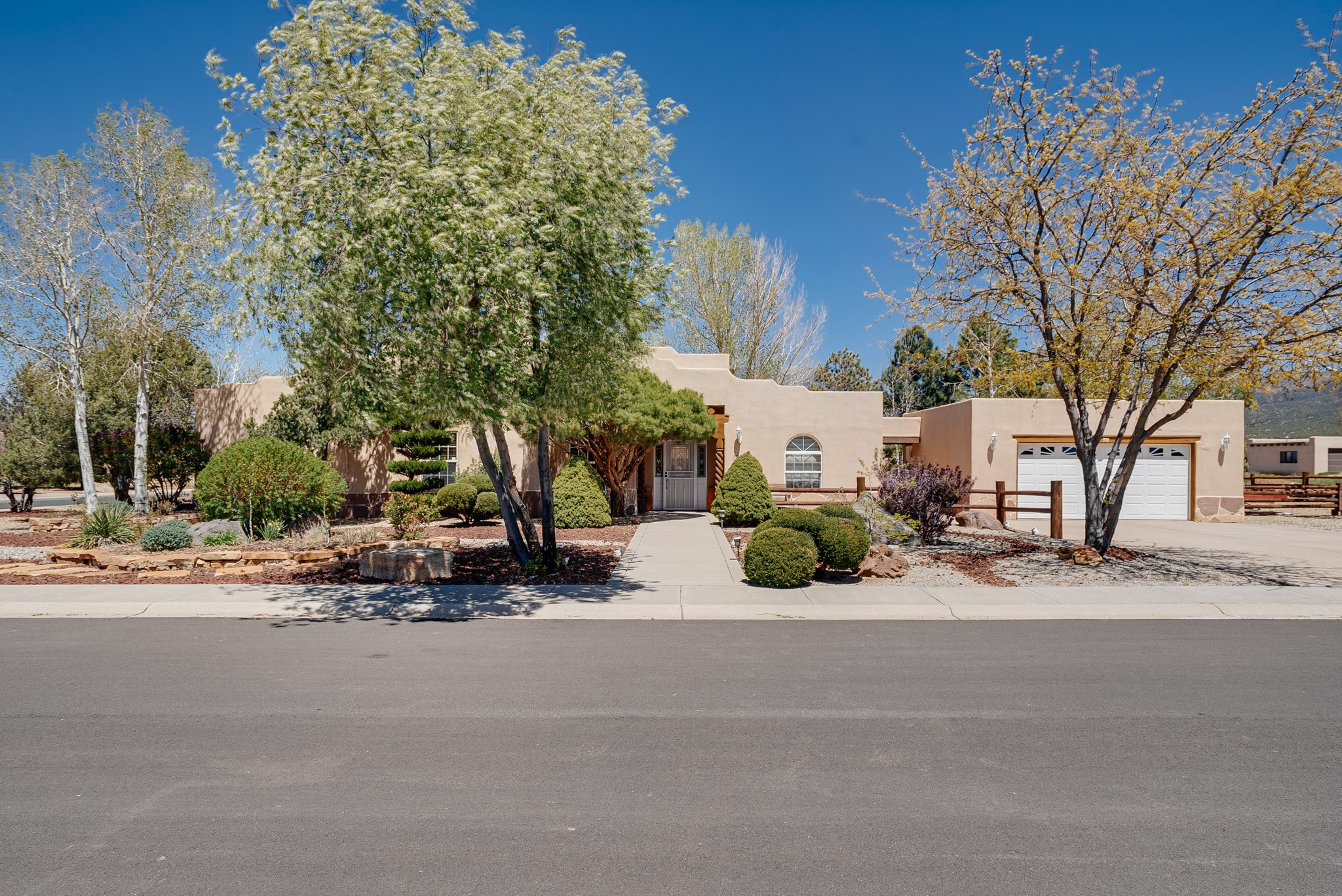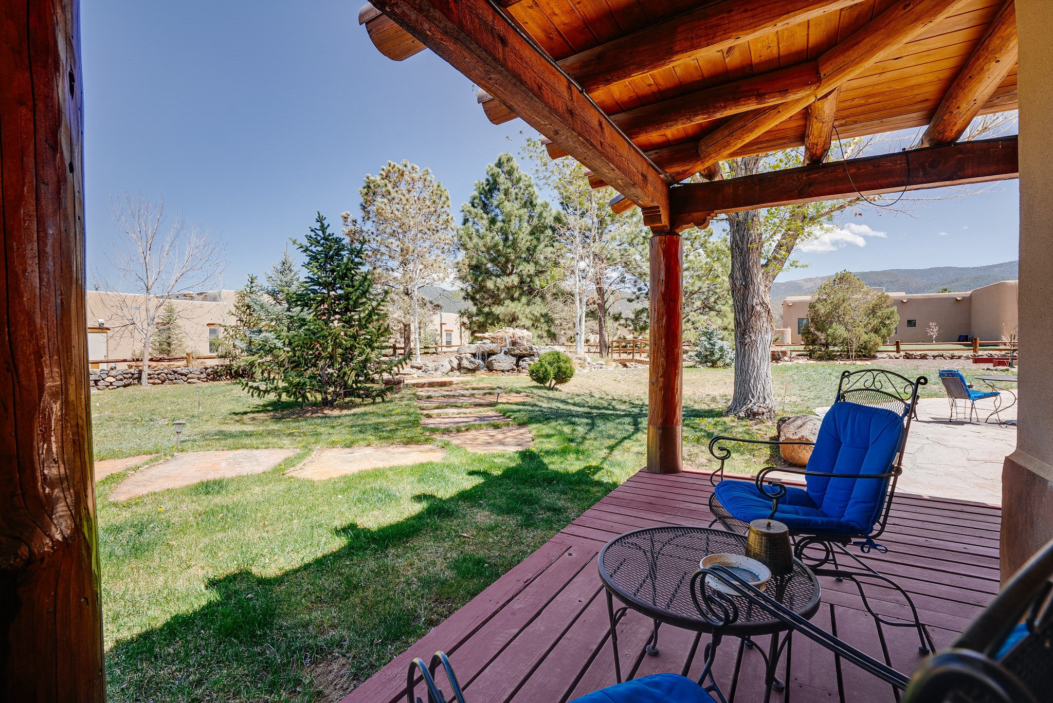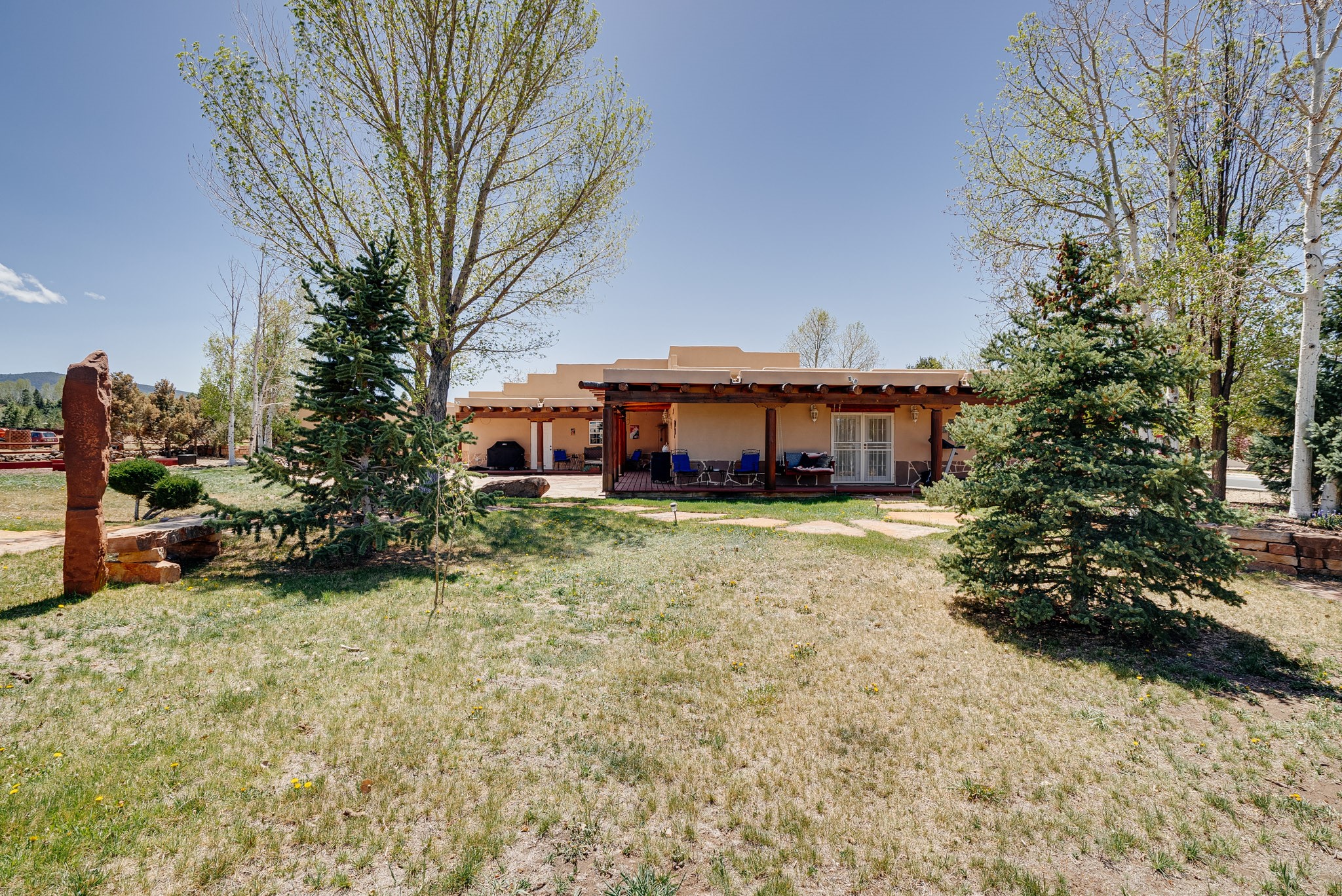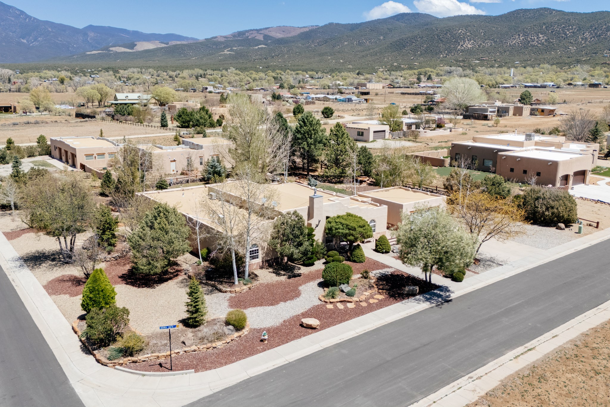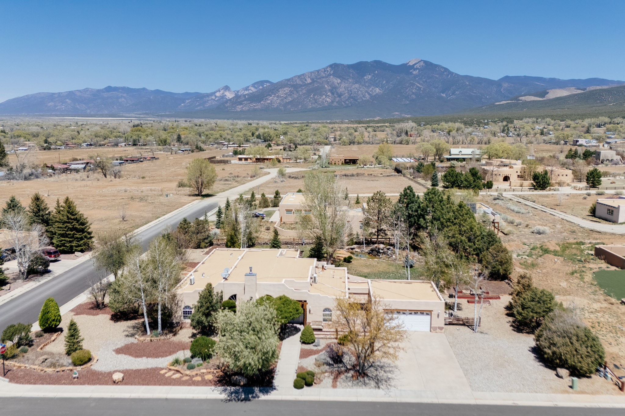 Discover this spacious 4-bedroom, 3-bathroom home offering 3,400 square feet of comfort, style, and Southwestern charm -- all nestled in the desirable Vegas De Taos subdivision. Enjoy the convenience of an in-town location with the tranquility of a secluded .68-acre lot, complete with paved roads, sidewalks, and mature landscaping. This special neighborhood offers so much, including a strong sense of community. The beautifully landscaped property features multiple water features, lush grass, raised garden beds, and a stunning assortment of trees -- including mature conifers, deciduous, and fruit trees. Relax under big blue skies with breathtaking mountain views, and enjoy the easy-care xeriscaping in the front and lush backyard oasis in the rear. Thoughtfully designed rock walls and wooden fences create a variety of distinct, inviting outdoor spaces.The home's grand great room welcomes you with 14' vaulted ceilings, custom woodwork, and radiant floor heating, complemented by efficient split units for year-round comfort. French doors off the dining area open to a spacious covered veranda -- perfect for entertaining or quiet evenings. The kitchen is a dream with stainless steel appliances, a double oven, a smooth-surface cooktop on the island, a 3-basin sink, and an expansive island that seats up to eight. Host family gatherings in the formal dining room or enjoy casual meals around the island.The west wing offers two bright guest bedrooms, a large full bathroom, and a luxurious master suite featuring hickory Pergo flooring, a sitting area or office nook, a whirlpool tub, separate shower, and extra-large walk-in closet. The east wing includes another spacious bedroom, guest bathroom, large pantry, hall closet, and a laundry room leading to the covered breezeway and detached two-car garage.Minutes from downtown Taos, the hospital, and grocery stores, this home offers the perfect blend of convenience, space, and a true homestead feel -- a rare find in Taos!