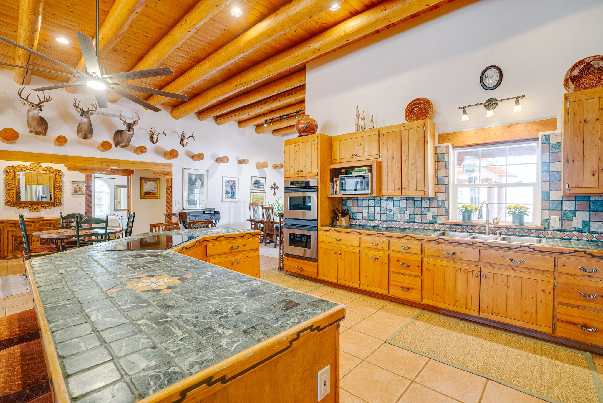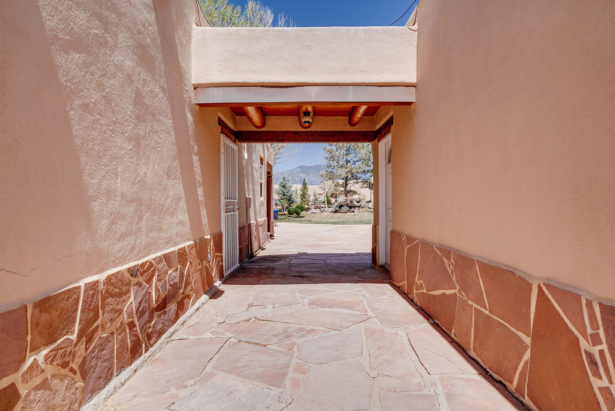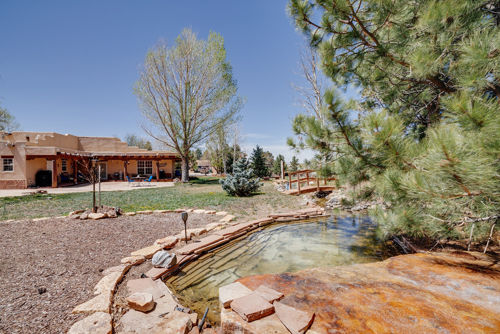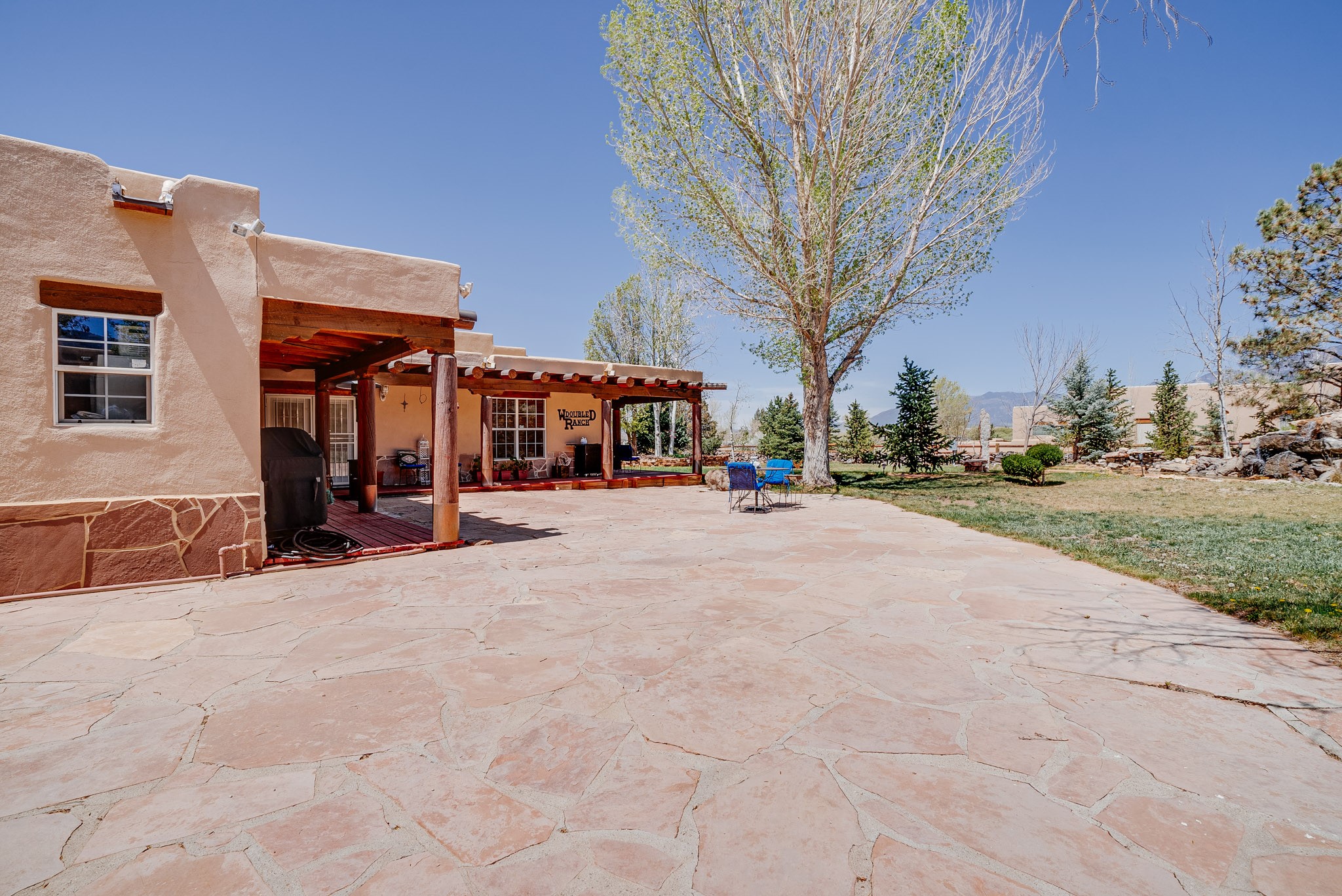 Discover this spacious 4-bedroom, 3-bathroom home offering 3,400 square feet of comfort, style, and Southwestern charm -- all nestled in the desirable Vegas De Taos subdivision. Enjoy the convenience of an in-town location with the tranquility of a secluded .68-acre lot, complete with paved roads, sidewalks, and mature landscaping. This special neighborhood offers so much, including a strong sense of community. The beautifully landscaped property features multiple water features, lush grass, raised garden beds, and a stunning assortment of trees -- including mature conifers, deciduous, and fruit trees. Relax under big blue skies with breathtaking mountain views, and enjoy the easy-care xeriscaping in the front and lush backyard oasis in the rear. Thoughtfully designed rock walls and wooden fences create a variety of distinct, inviting outdoor spaces.The home's grand great room welcomes you with 14' vaulted ceilings, custom woodwork, and radiant floor heating, complemented by efficient split units for year-round comfort. French doors off the dining area open to a spacious covered veranda -- perfect for entertaining or quiet evenings. The kitchen is a dream with stainless steel appliances, a double oven, a smooth-surface cooktop on the island, a 3-basin sink, and an expansive island that seats up to eight. Host family gatherings in the formal dining room or enjoy casual meals around the island.The west wing offers two bright guest bedrooms, a large full bathroom, and a luxurious master suite featuring hickory Pergo flooring, a sitting area or office nook, a whirlpool tub, separate shower, and extra-large walk-in closet. The east wing includes another spacious bedroom, guest bathroom, large pantry, hall closet, and a laundry room leading to the covered breezeway and detached two-car garage.Minutes from downtown Taos, the hospital, and grocery stores, this home offers the perfect blend of convenience, space, and a true homestead feel -- a rare find in Taos!