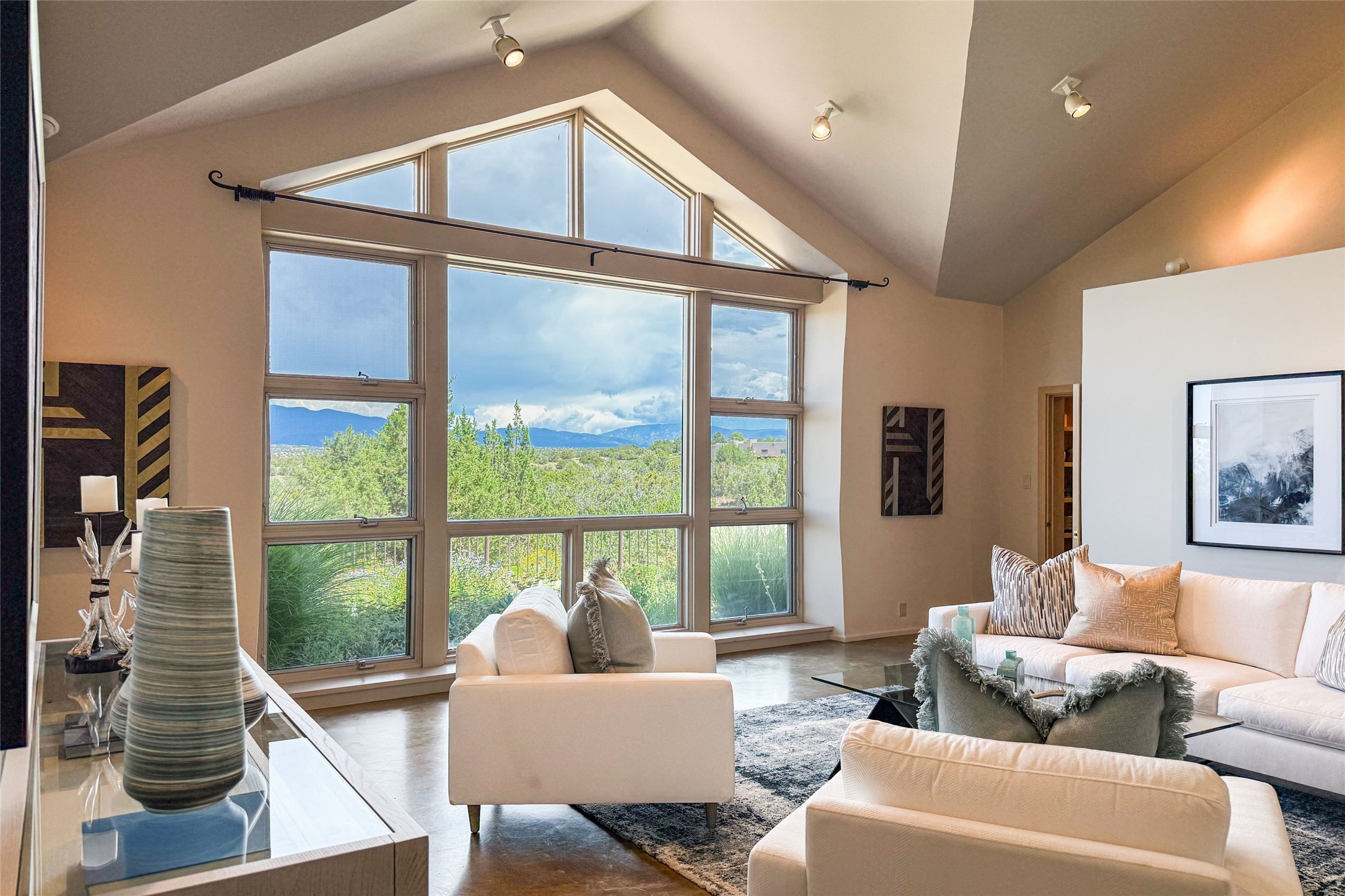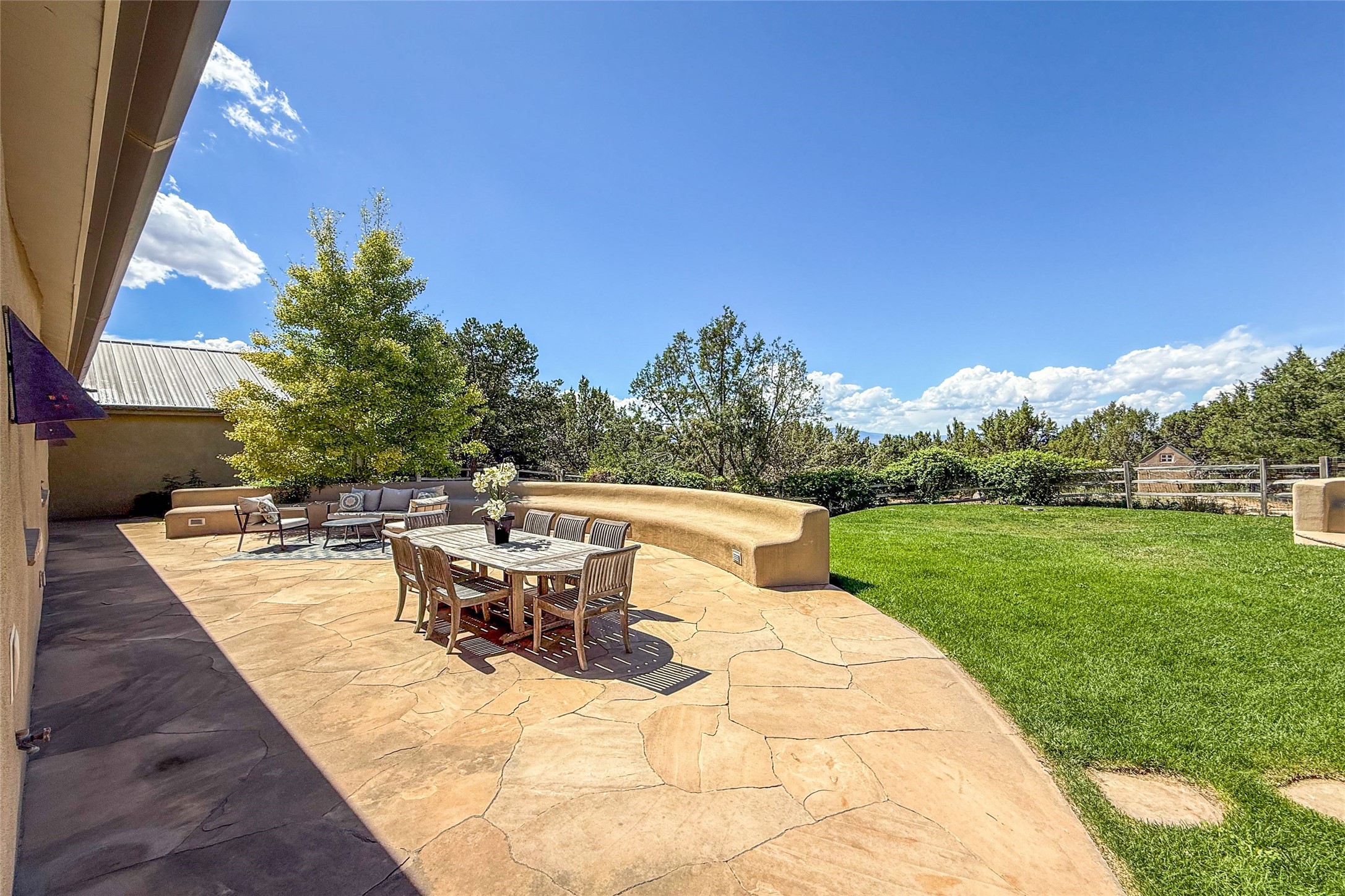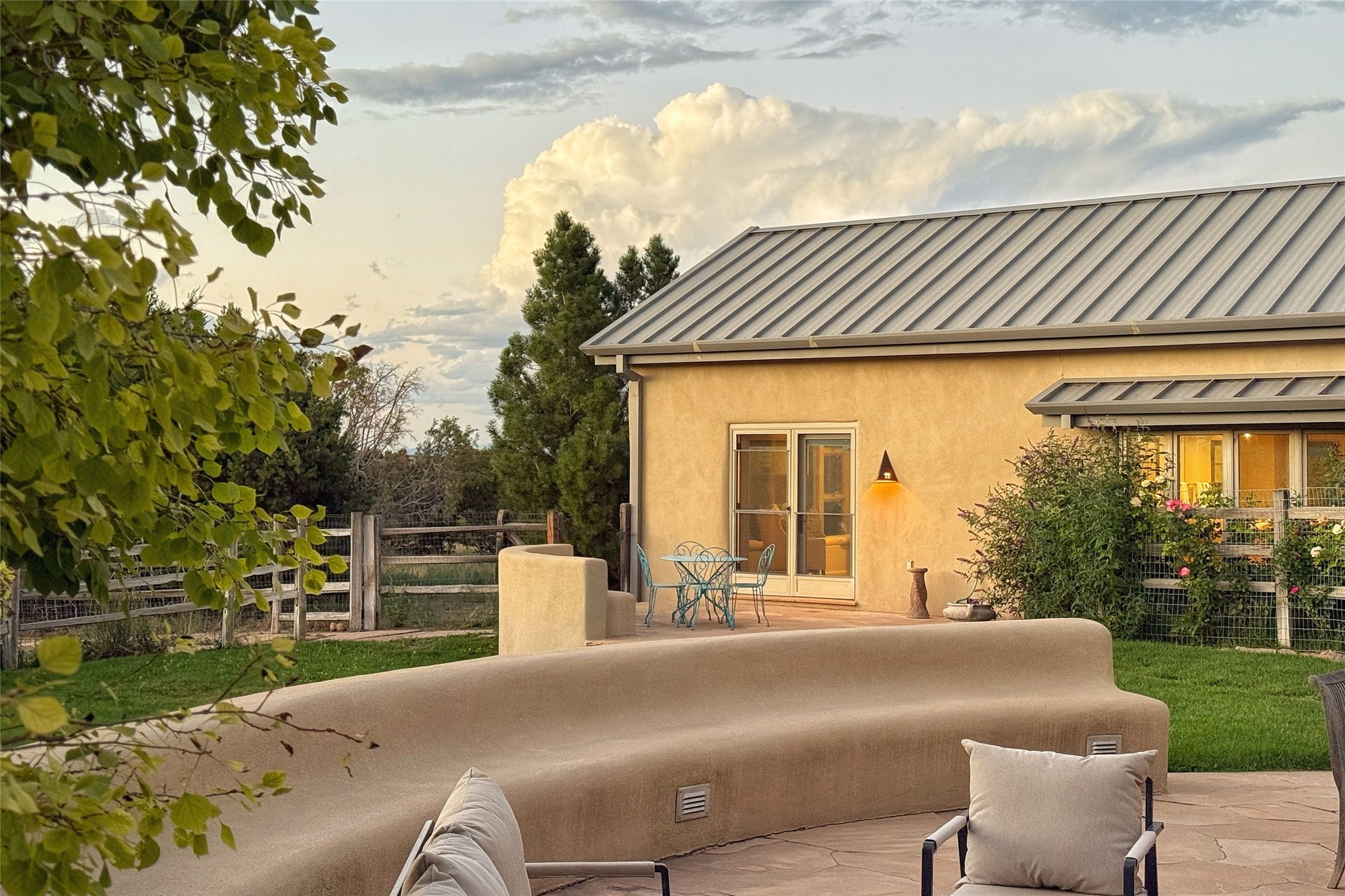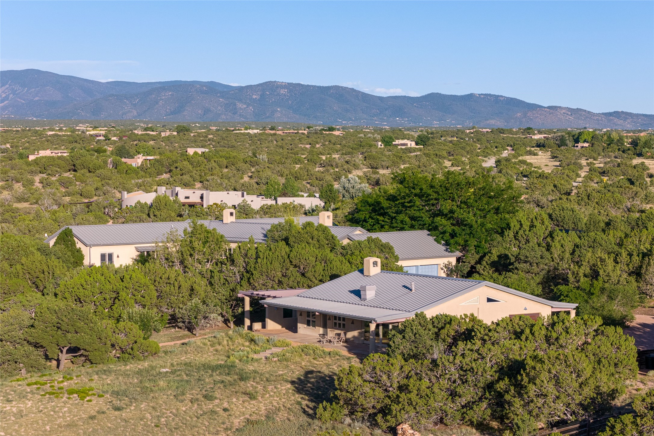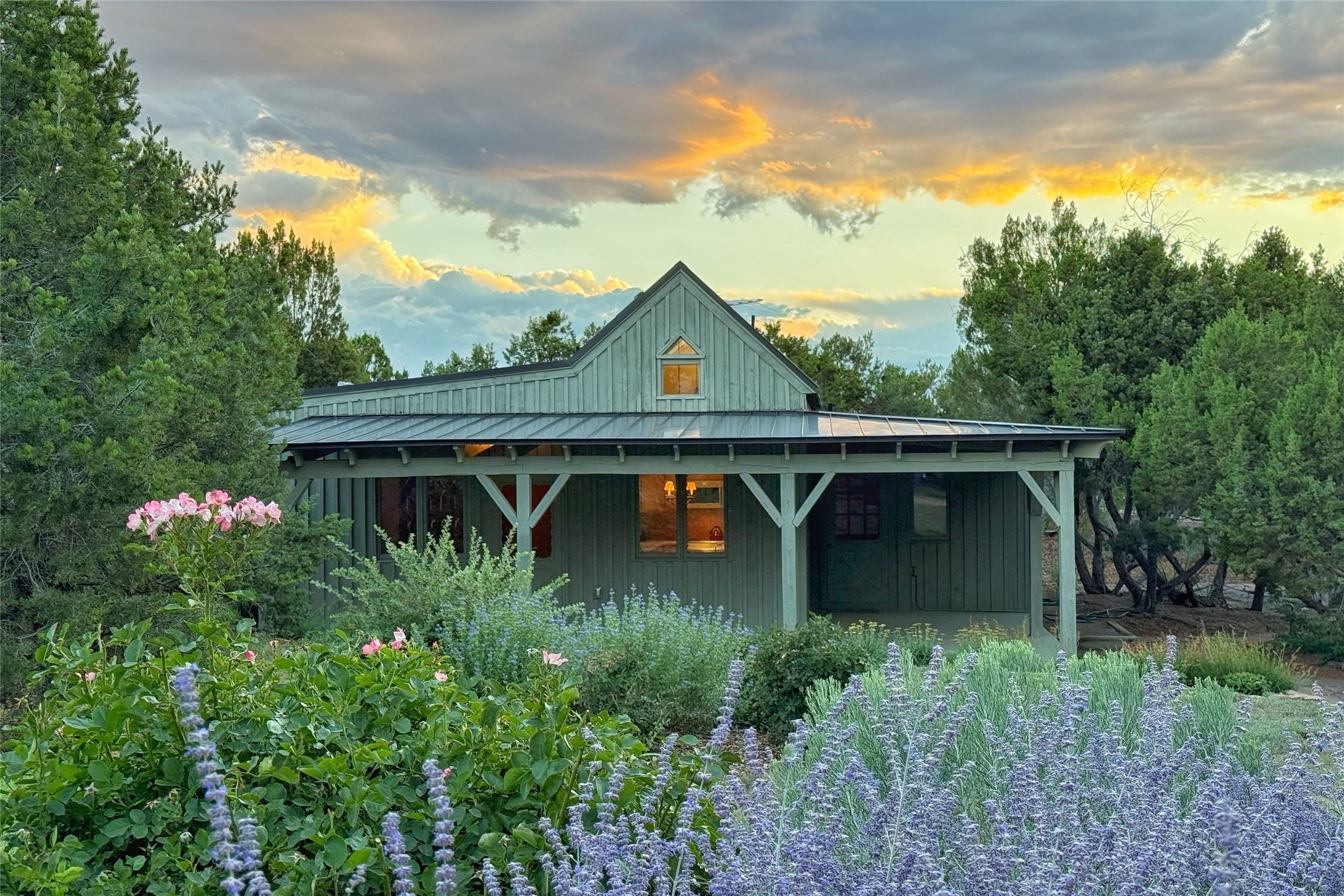 This serene La Tierra Nueva compound, with three distinct residences totaling 7,341 sq. feet of living space. Designed by renowned architect, Lila DeWindt, this lush oasis boasts mature landscaping in a serene, country-like setting with Sangre and Jemez mountain views, 11.85 acres, and vegetable and perennial gardens. The 3,982 sq. foot single level main residence features a blend of timeless Northern NM and modern design, a dramatic high-pitched roof, double-sided stone fireplace, copious natural light, andlarge windows that capture breathtaking Sangre views. With two sitting rooms, a media room and bedrooms that boast mountain views, this residence is truly stunning. Sitting in a bay window, the primary suite's tub overlooks a flower garden. An open-concept kitchen is centered around a large island, perfect for hosting.The home enjoys a portal and multiple patio spaces. The charming 1,334 sq. foot, two bedroom guest house includes a full kitchen, Saltillo tile flooring, a wood-burning stove, large windows, and wrap-around porch. The impressive 2,025 sq footmodern 1-bedroom studio has an open living/dining/kitchen area, and portal. The adult rec-room, with built-in bar, is ideal as live/work space, artist studio/music room, car enthusiast or convert to a barn. Perfect for large gatherings and relaxing with sunset Jemez views. Beneath the studio, lays a remarkable walk-in wine cellar for approx. 5000 bottles with wine tasting area. The property also includes a generous fenced dog area and room for horses.A truly peaceful, secluded atmosphere just 18 minutes from the heart of Santa Fe or the airport, and 8 minutes to The Club at Las Campanas. La Tierra Nueva is a coveted, gated, equestrian-friendly community with access to over 60,000 acres BLM land, and tennis/pickleball court. Ideal for multigenerational living, a large family, or patron of the arts, 7 Goodnight Trail West is a true hidden gem.