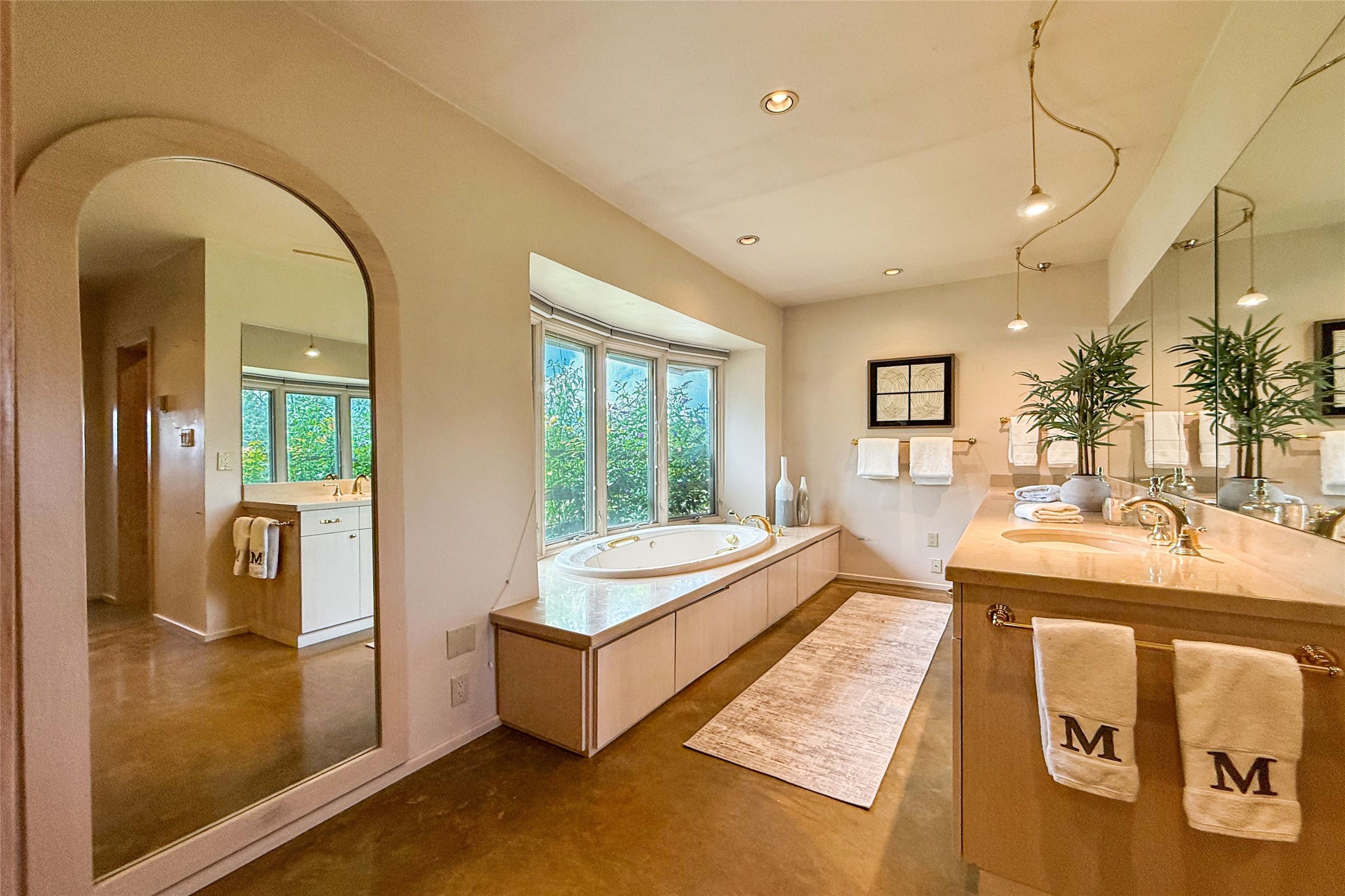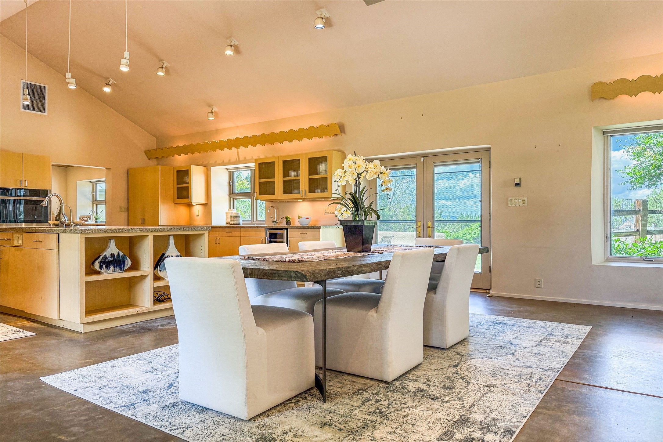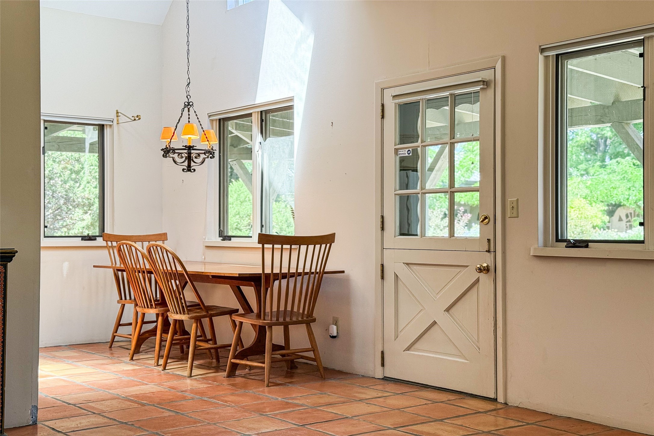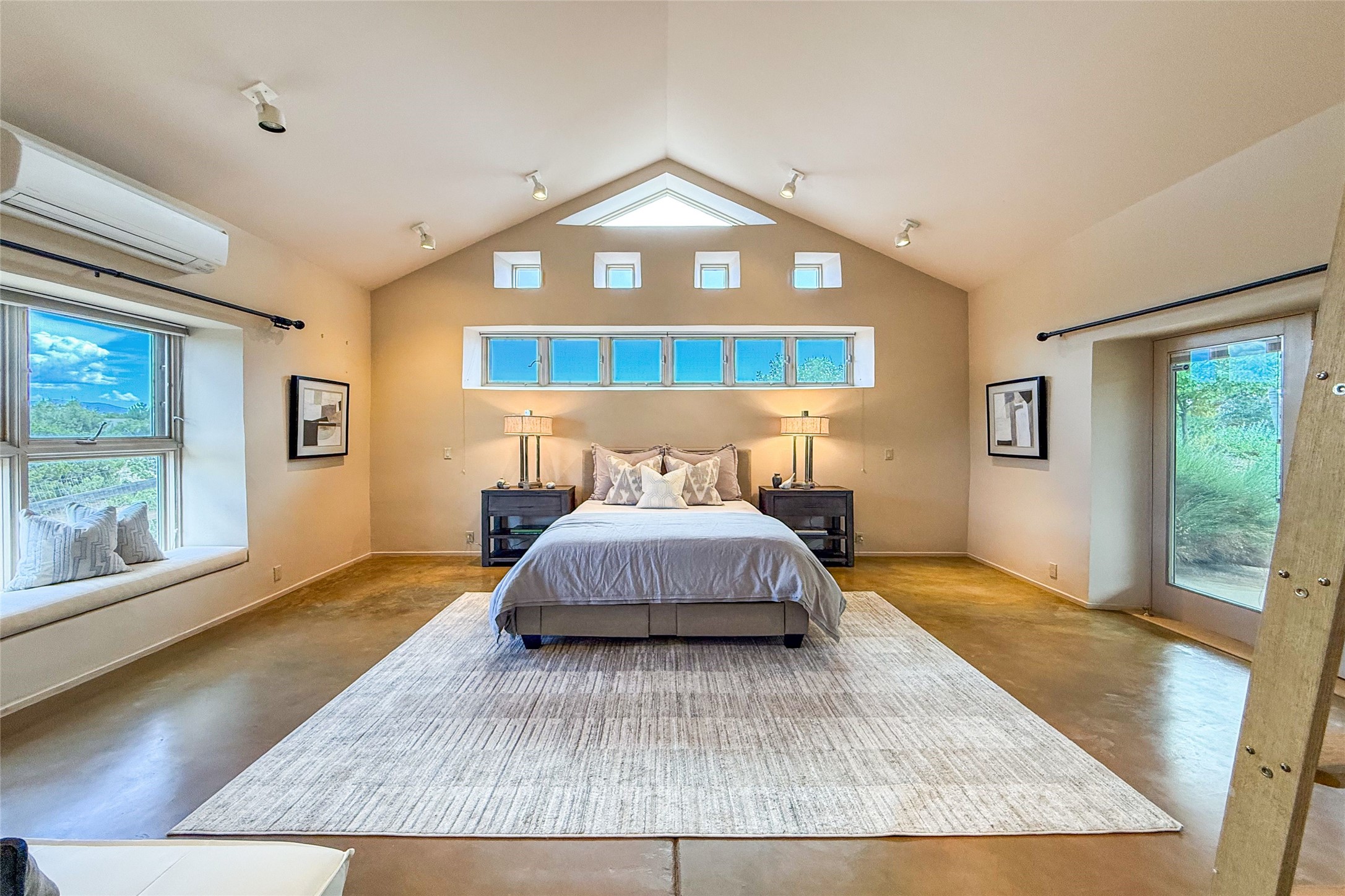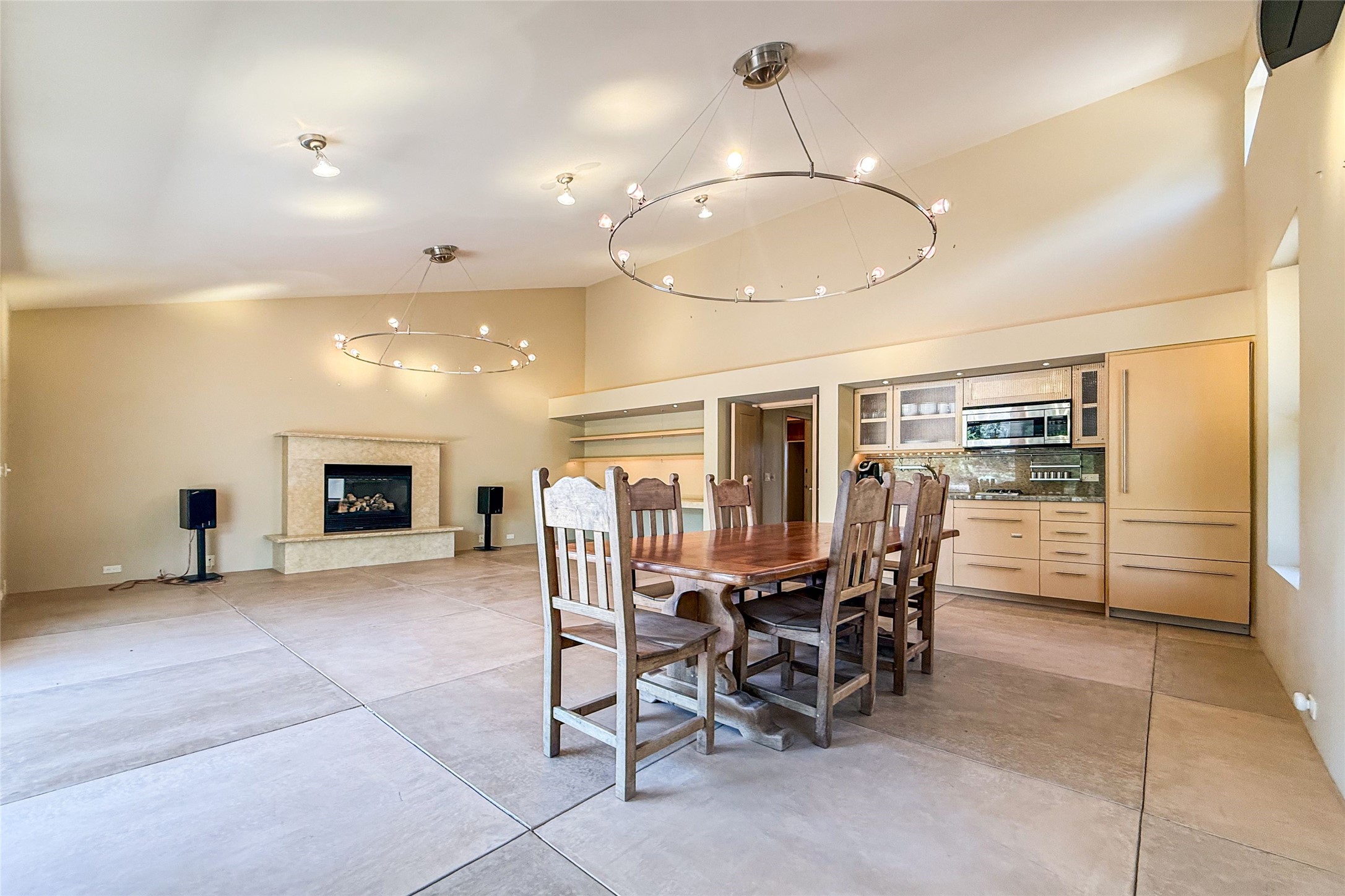 This serene La Tierra Nueva compound, with three distinct residences totaling 7,341 sq. feet of living space. Designed by renowned architect, Lila DeWindt, this lush oasis boasts mature landscaping in a serene, country-like setting with Sangre and Jemez mountain views, 11.85 acres, and vegetable and perennial gardens. The 3,982 sq. foot single level main residence features a blend of timeless Northern NM and modern design, a dramatic high-pitched roof, double-sided stone fireplace, copious natural light, andlarge windows that capture breathtaking Sangre views. With two sitting rooms, a media room and bedrooms that boast mountain views, this residence is truly stunning. Sitting in a bay window, the primary suite's tub overlooks a flower garden. An open-concept kitchen is centered around a large island, perfect for hosting.The home enjoys a portal and multiple patio spaces. The charming 1,334 sq. foot, two bedroom guest house includes a full kitchen, Saltillo tile flooring, a wood-burning stove, large windows, and wrap-around porch. The impressive 2,025 sq footmodern 1-bedroom studio has an open living/dining/kitchen area, and portal. The adult rec-room, with built-in bar, is ideal as live/work space, artist studio/music room, car enthusiast or convert to a barn. Perfect for large gatherings and relaxing with sunset Jemez views. Beneath the studio, lays a remarkable walk-in wine cellar for approx. 5000 bottles with wine tasting area. The property also includes a generous fenced dog area and room for horses.A truly peaceful, secluded atmosphere just 18 minutes from the heart of Santa Fe or the airport, and 8 minutes to The Club at Las Campanas. La Tierra Nueva is a coveted, gated, equestrian-friendly community with access to over 60,000 acres BLM land, and tennis/pickleball court. Ideal for multigenerational living, a large family, or patron of the arts, 7 Goodnight Trail West is a true hidden gem.