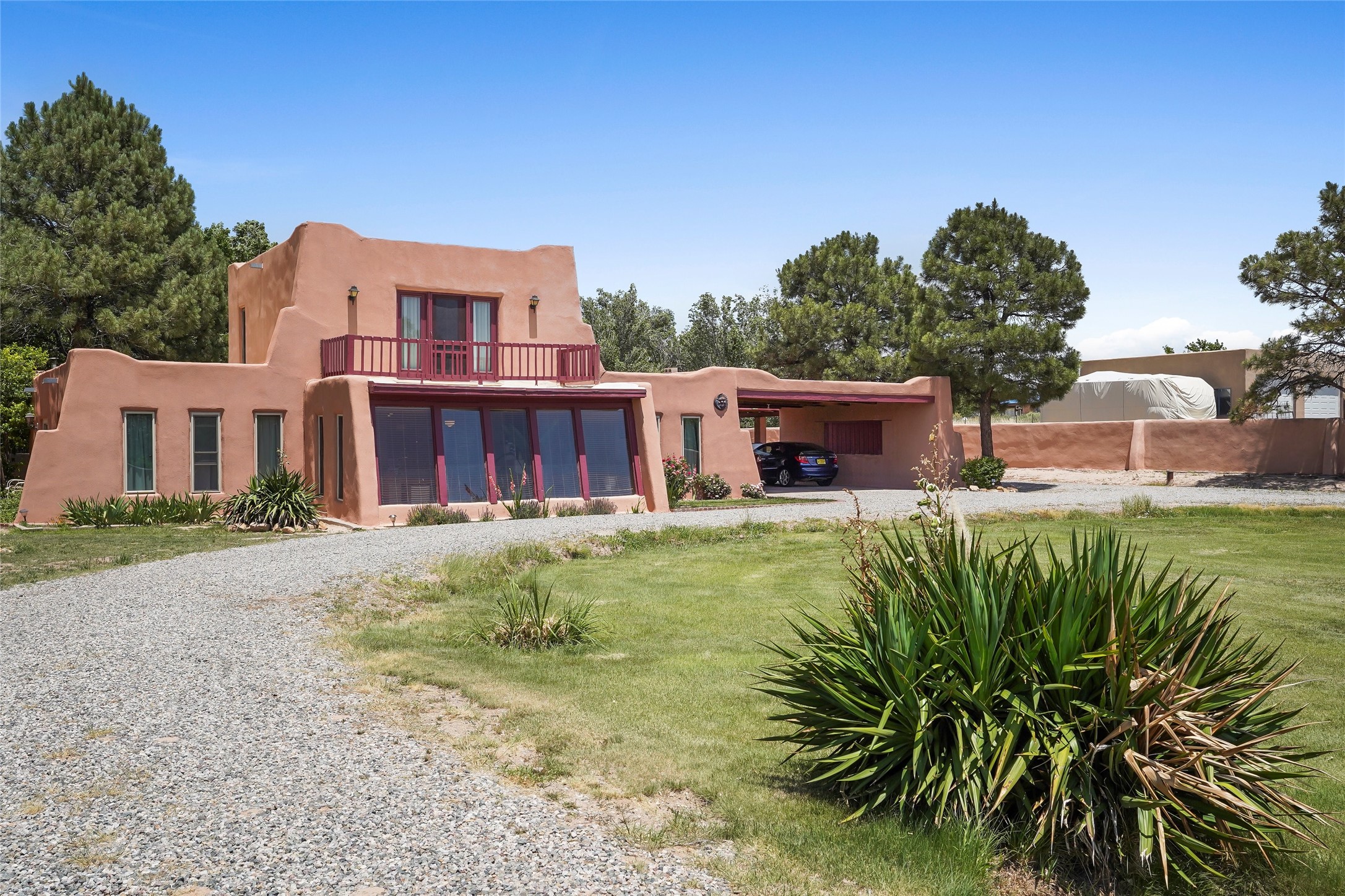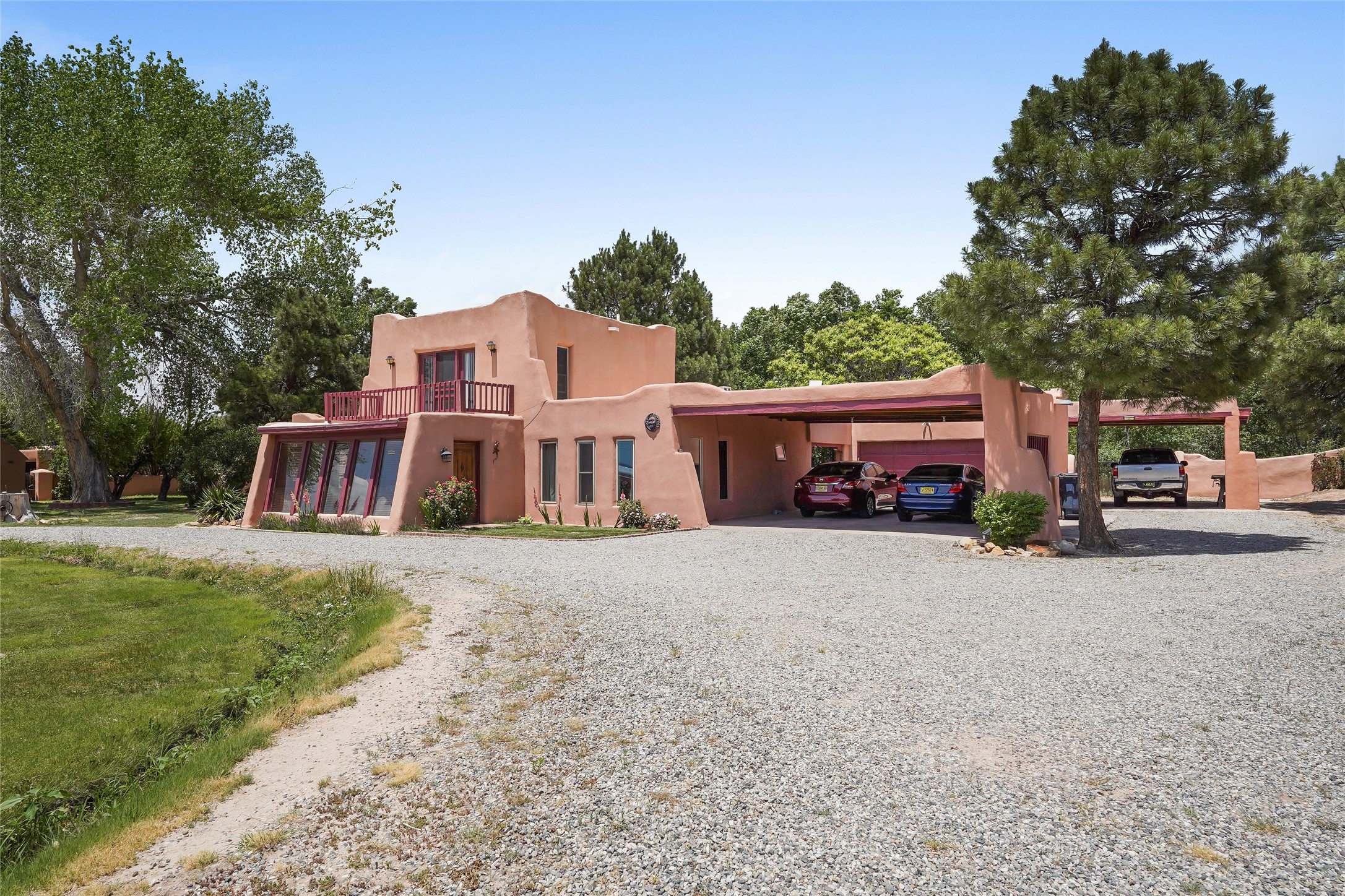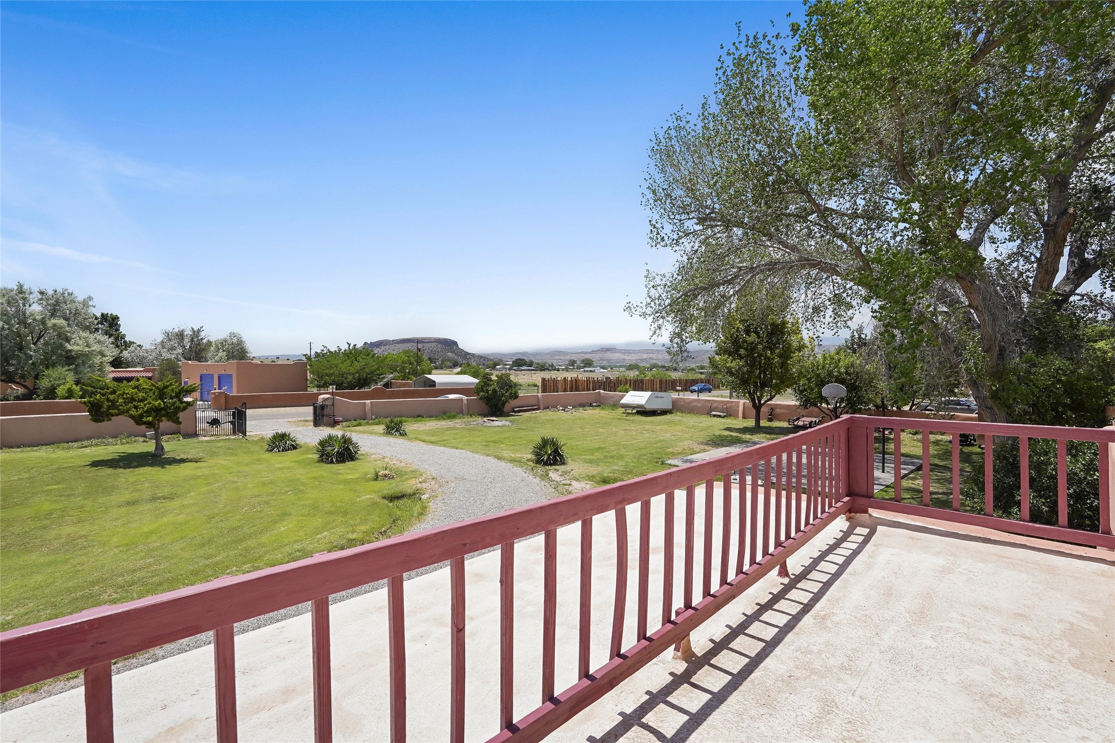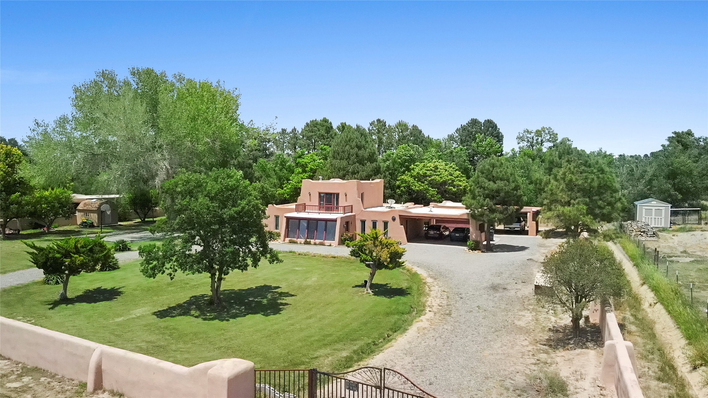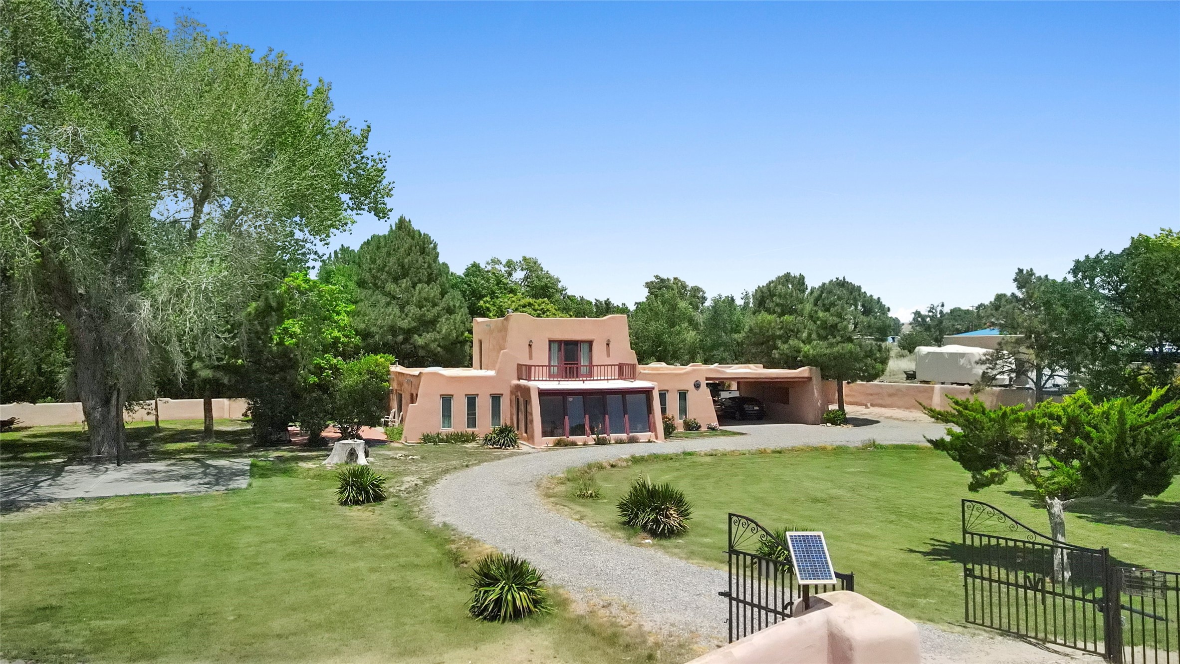 Welcome to 36 County Road 126 in La Mesilla! This charming 3-bedroom, 2-bath detached home offers the perfect blend of comfort, privacy, and outdoor living on a gated 0.8-acre lot. Surrounded by lush greenery, this property is a serene escape with plenty of space to enjoy and entertain. Inside, you'll find two spacious living rooms--one featuring a classic kiva fireplace and the other warmed by a cozy pellet stove--ideal for relaxing evenings year-round. The well-designed layout flows easily to the kitchen and dining areas, creating a welcoming atmosphere throughout. Upstairs, the primary bedroom includes a private balcony, perfect for taking in the peaceful views and fresh air. Step outside to enjoy the expansive patio, your very own basketball court, and beautifully landscaped grounds. Additional features include a two-car garage, carport, and gated access for added privacy and security. Whether you're gathering with friends or enjoying a quiet night at home, this unique La Mesilla residence has it all!