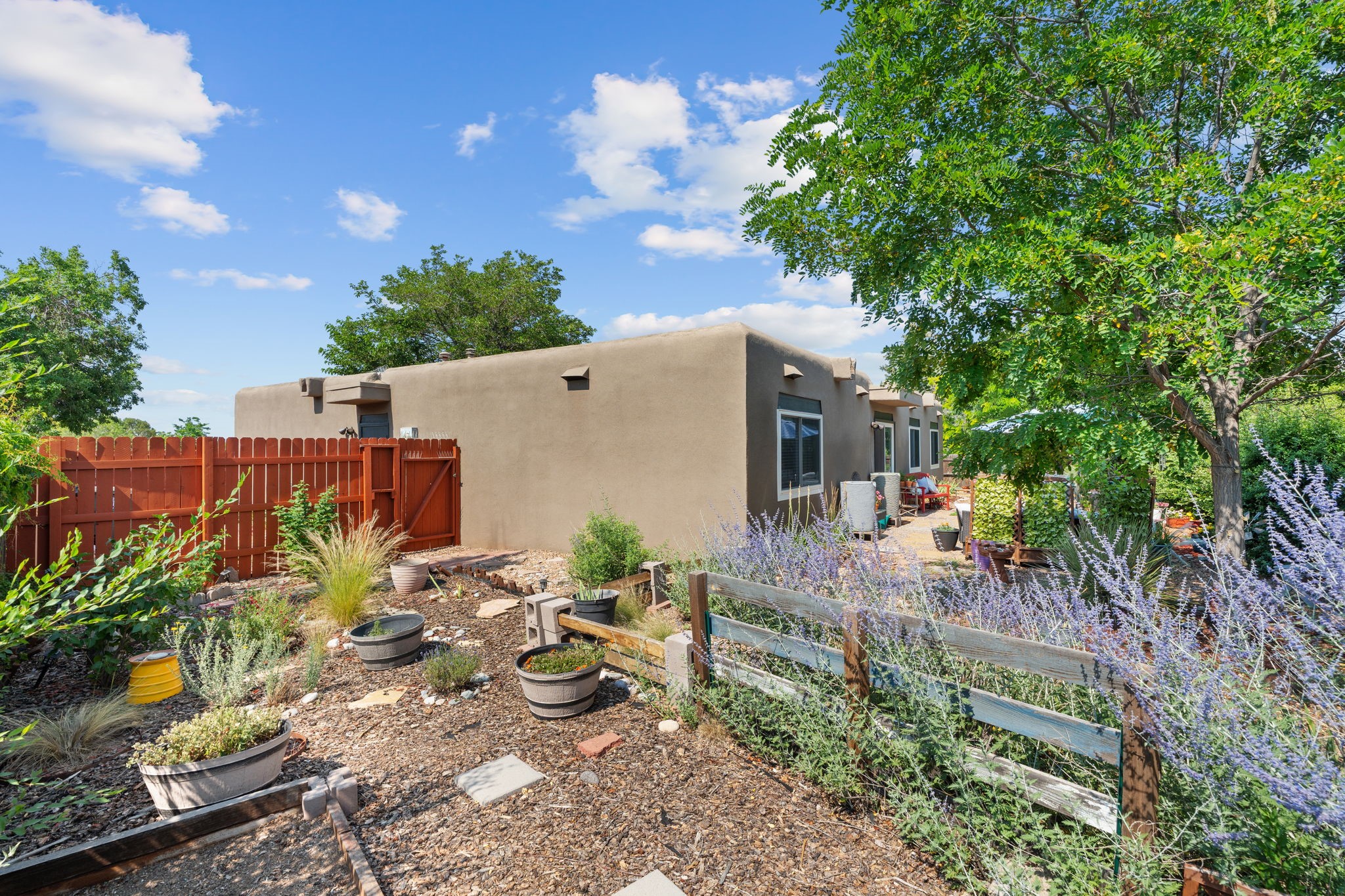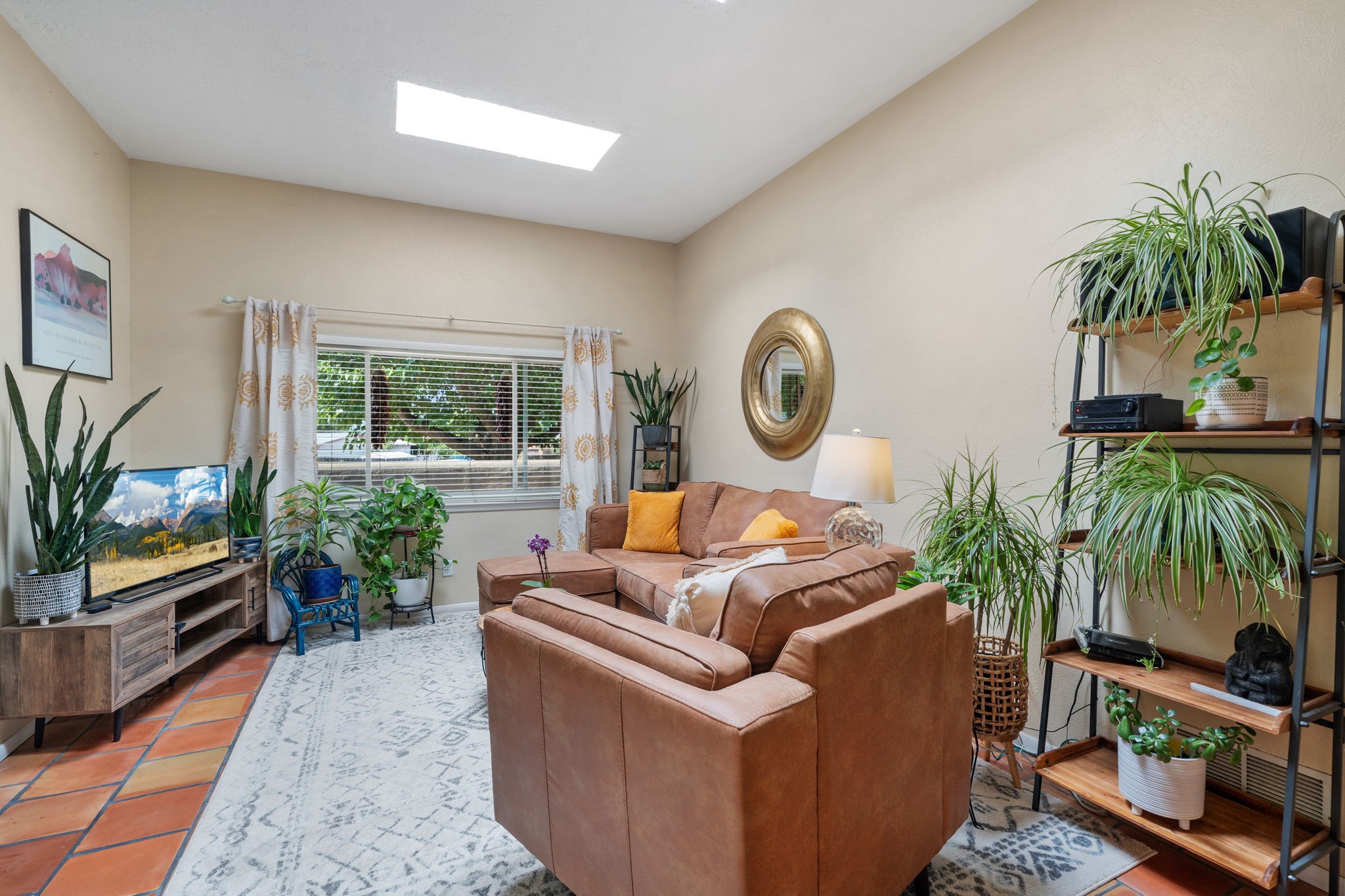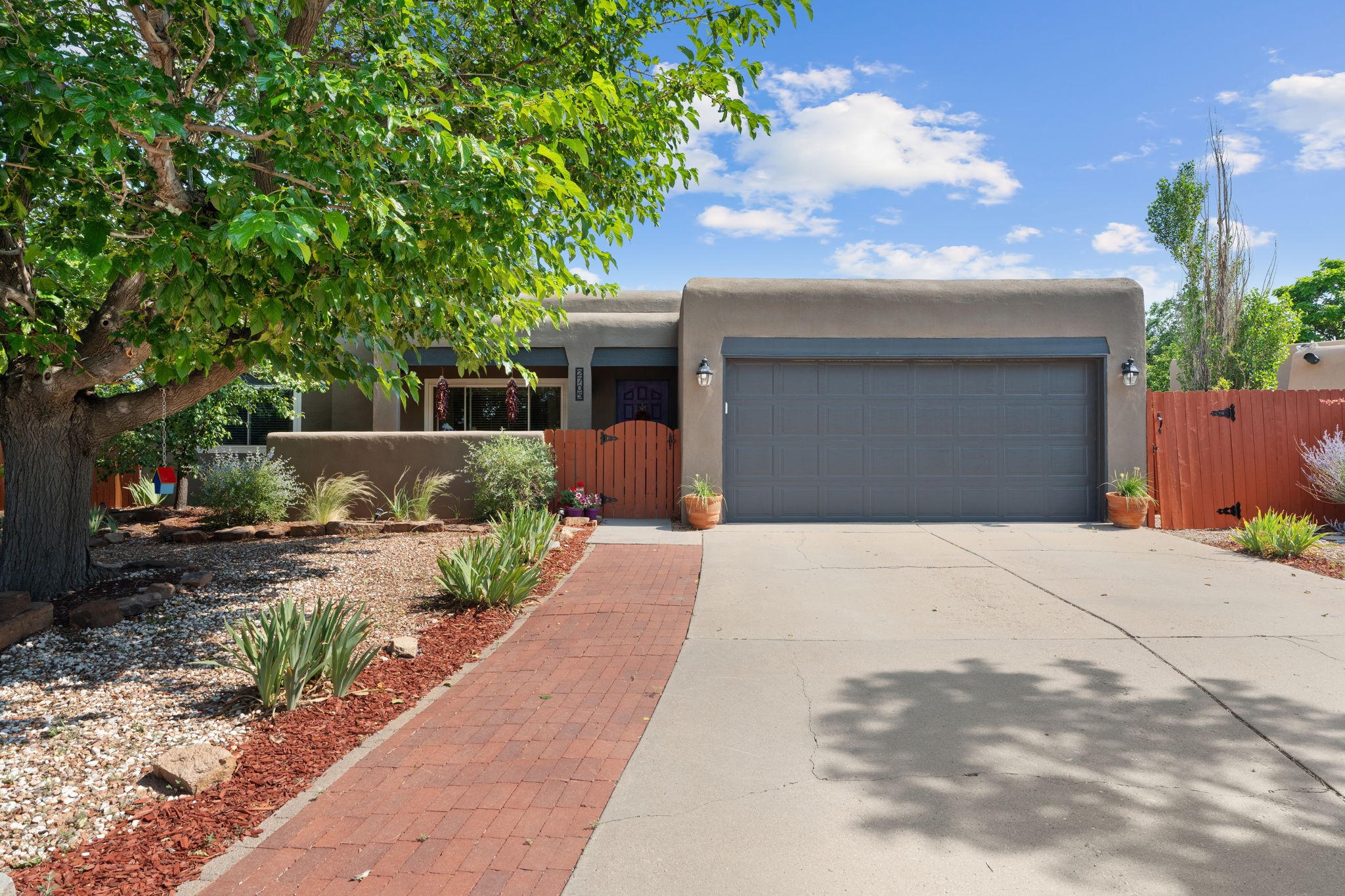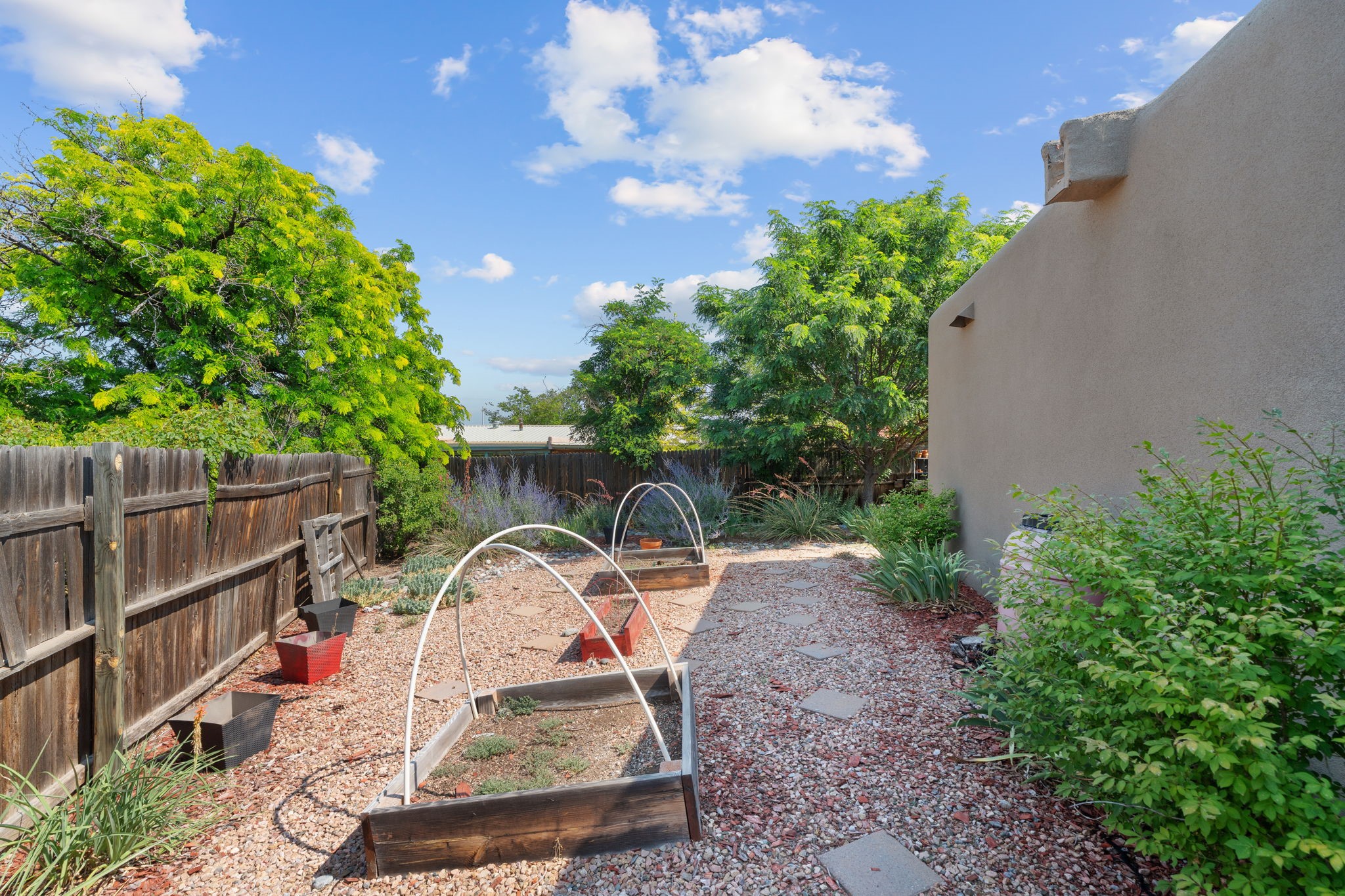 Come see this Southside four bedroom home, conveniently located close to schools, shopping and parks. The cozy entry courtyard sparkles with colorful flowers, and is shaded by large trees. The living room has tall ceilings and is filled with light from 2 large skylights. The updated kitchen has stainless appliances, tile backsplash and quartz counters. There is direct access to the inviting outdoor space, where bright and perennials are mixed in the dappled light of shade trees. The backyard is fenced, and there are two raised vegetable beds for the green of thumb. Saltillo tile is the floor treatment in most of the house, with carpeted bedrooms. There is ample closet space and a ceiling fan in every bedroom. This affordable home is in excellent condition, with updated vinyl windows and gorgeous new stucco.