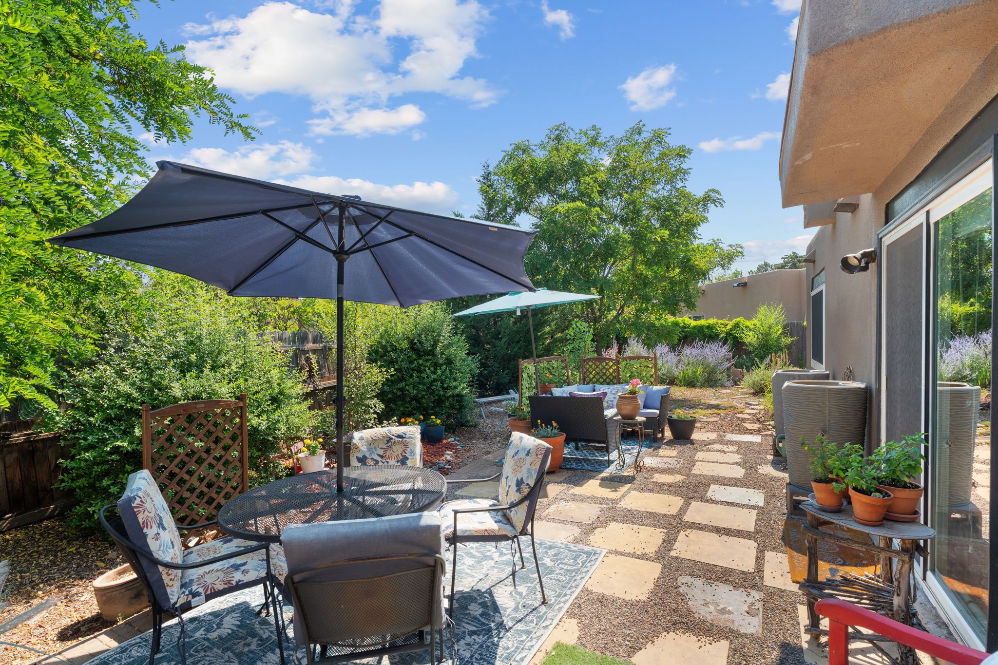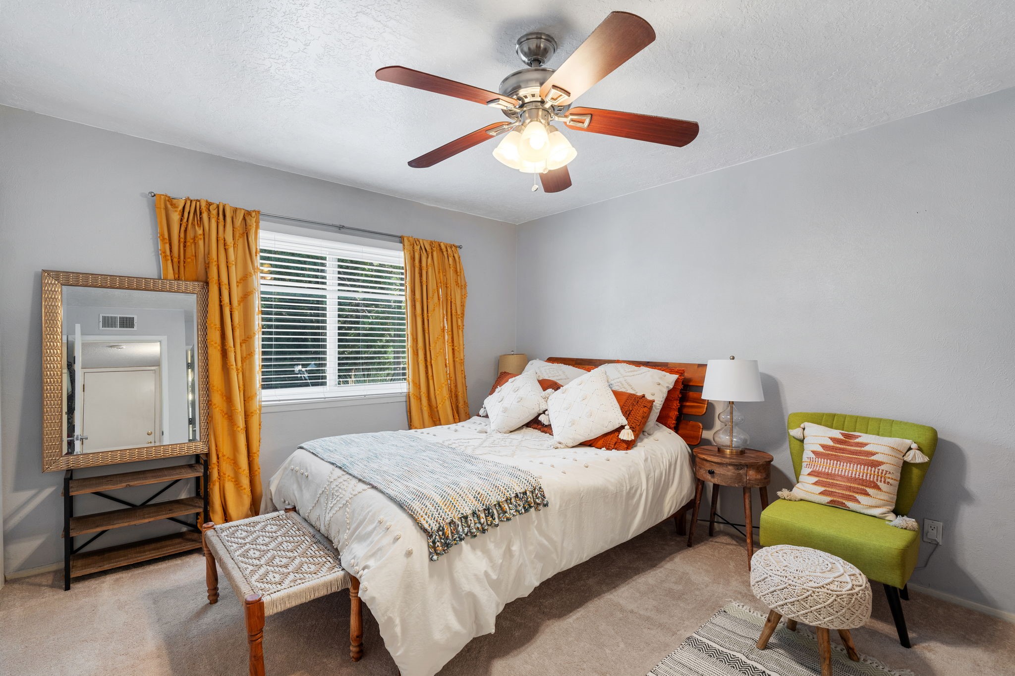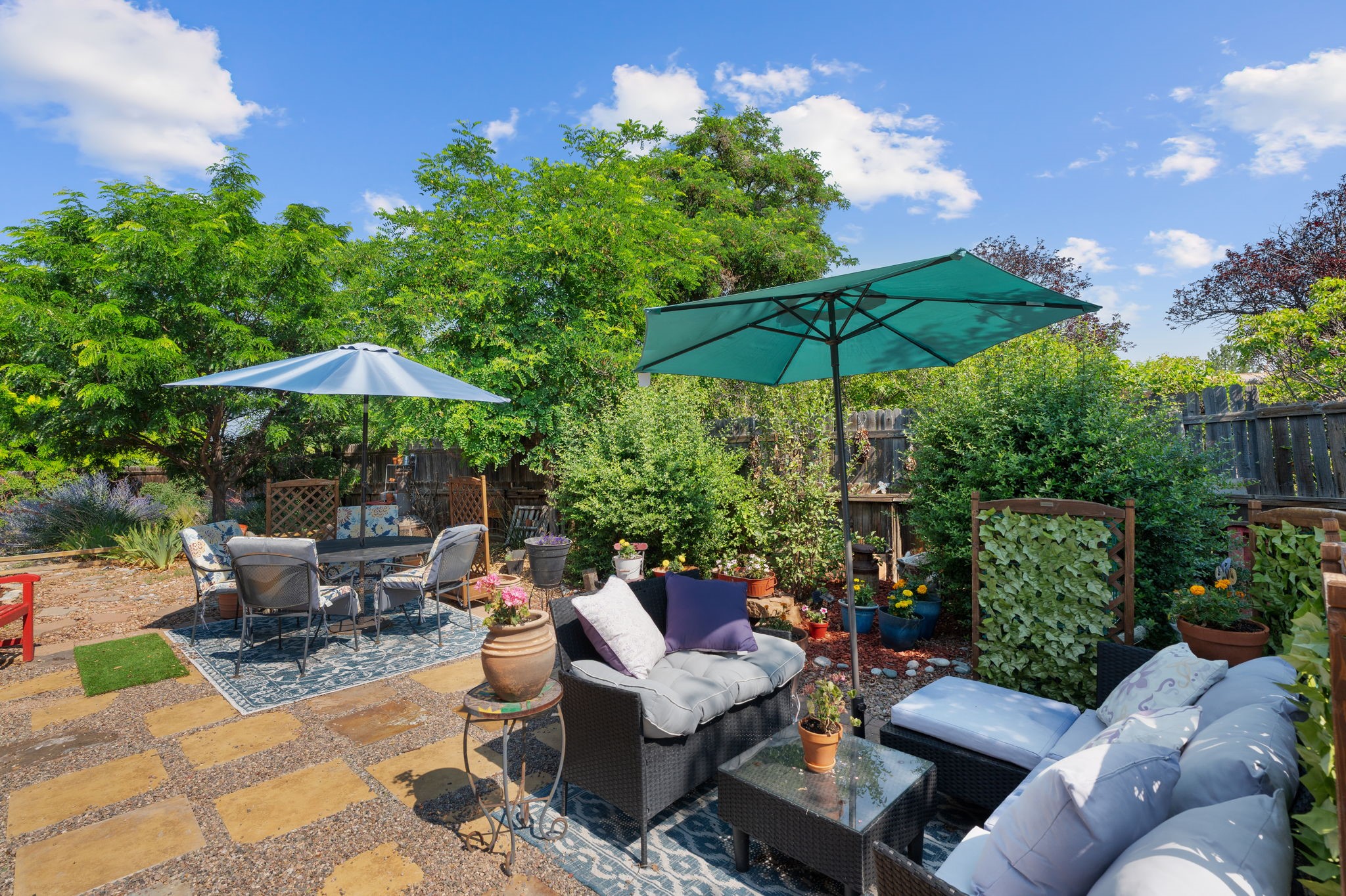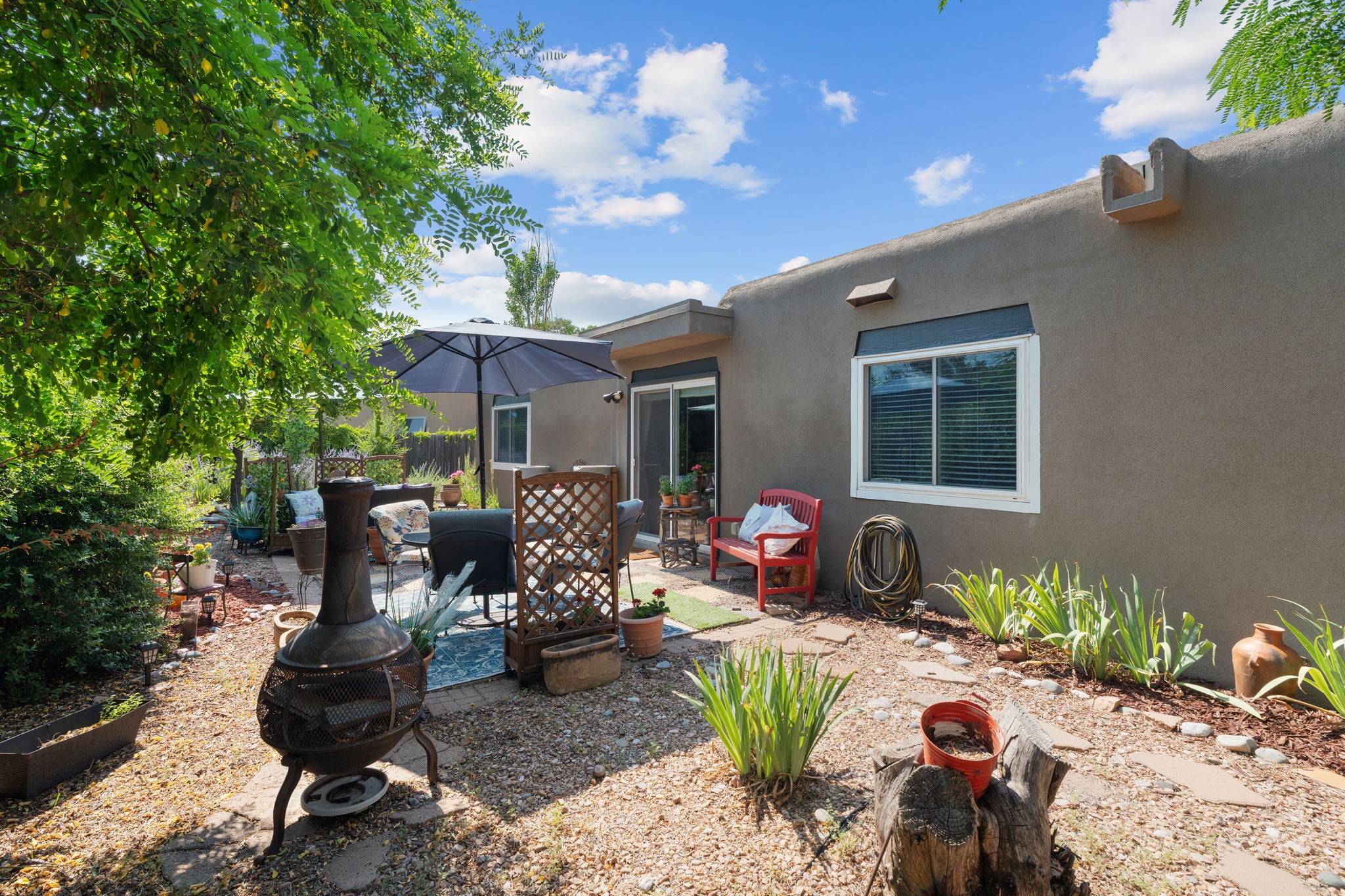 Come see this Southside four bedroom home, conveniently located close to schools, shopping and parks. The cozy entry courtyard sparkles with colorful flowers, and is shaded by large trees. The living room has tall ceilings and is filled with light from 2 large skylights. The updated kitchen has stainless appliances, tile backsplash and quartz counters. There is direct access to the inviting outdoor space, where bright and perennials are mixed in the dappled light of shade trees. The backyard is fenced, and there are two raised vegetable beds for the green of thumb. Saltillo tile is the floor treatment in most of the house, with carpeted bedrooms. There is ample closet space and a ceiling fan in every bedroom. This affordable home is in excellent condition, with updated vinyl windows and gorgeous new stucco.